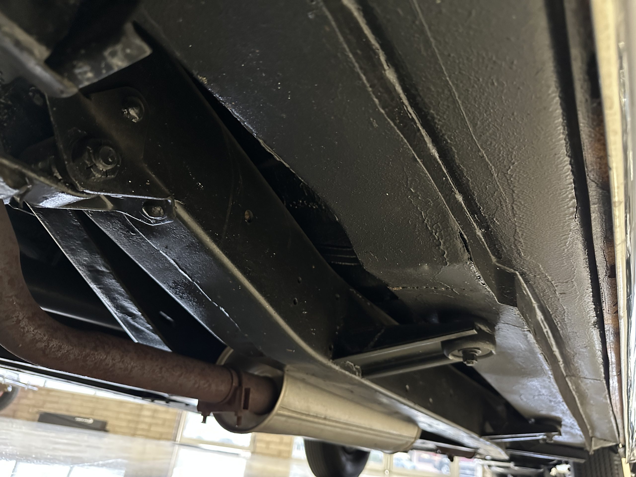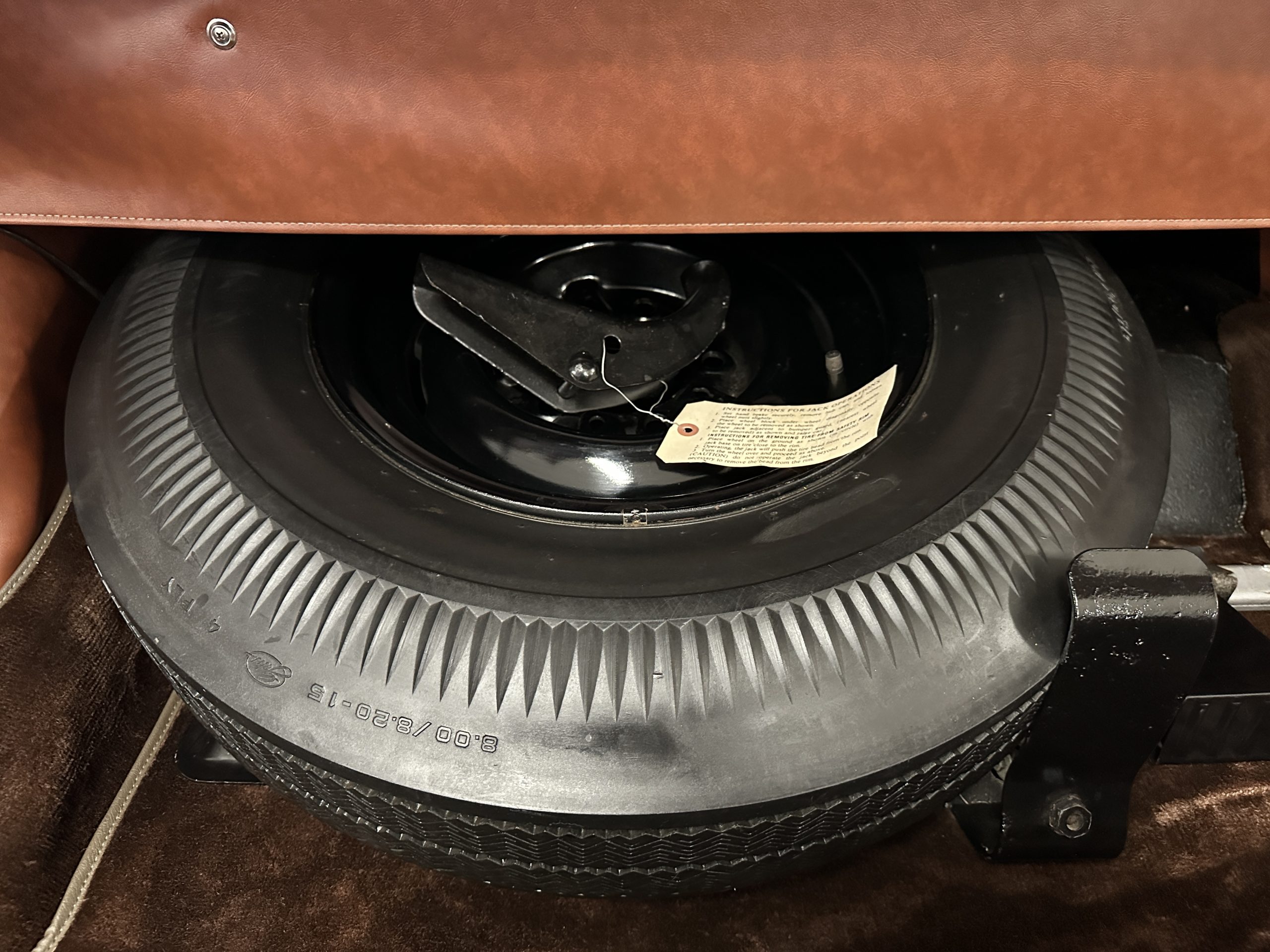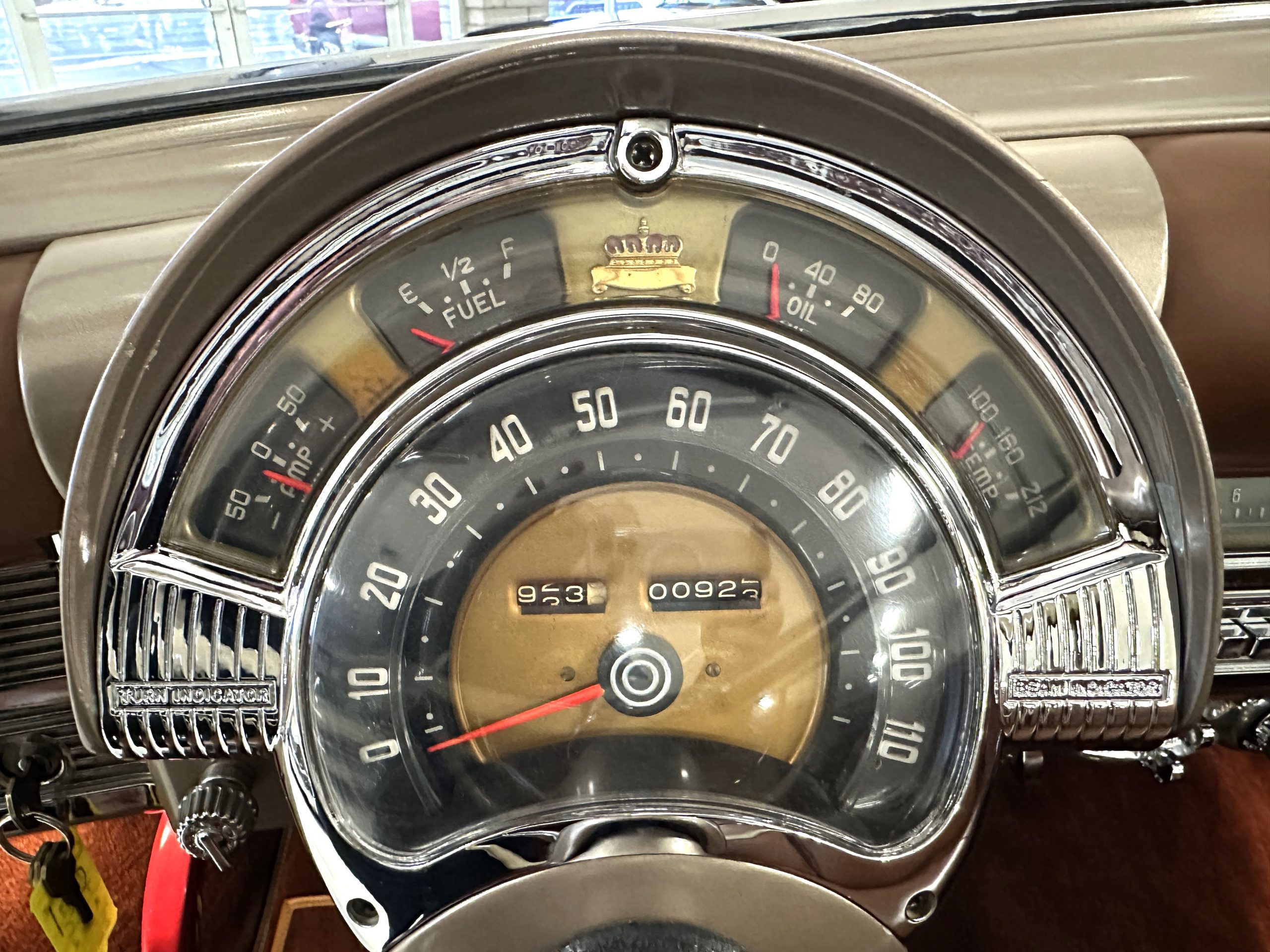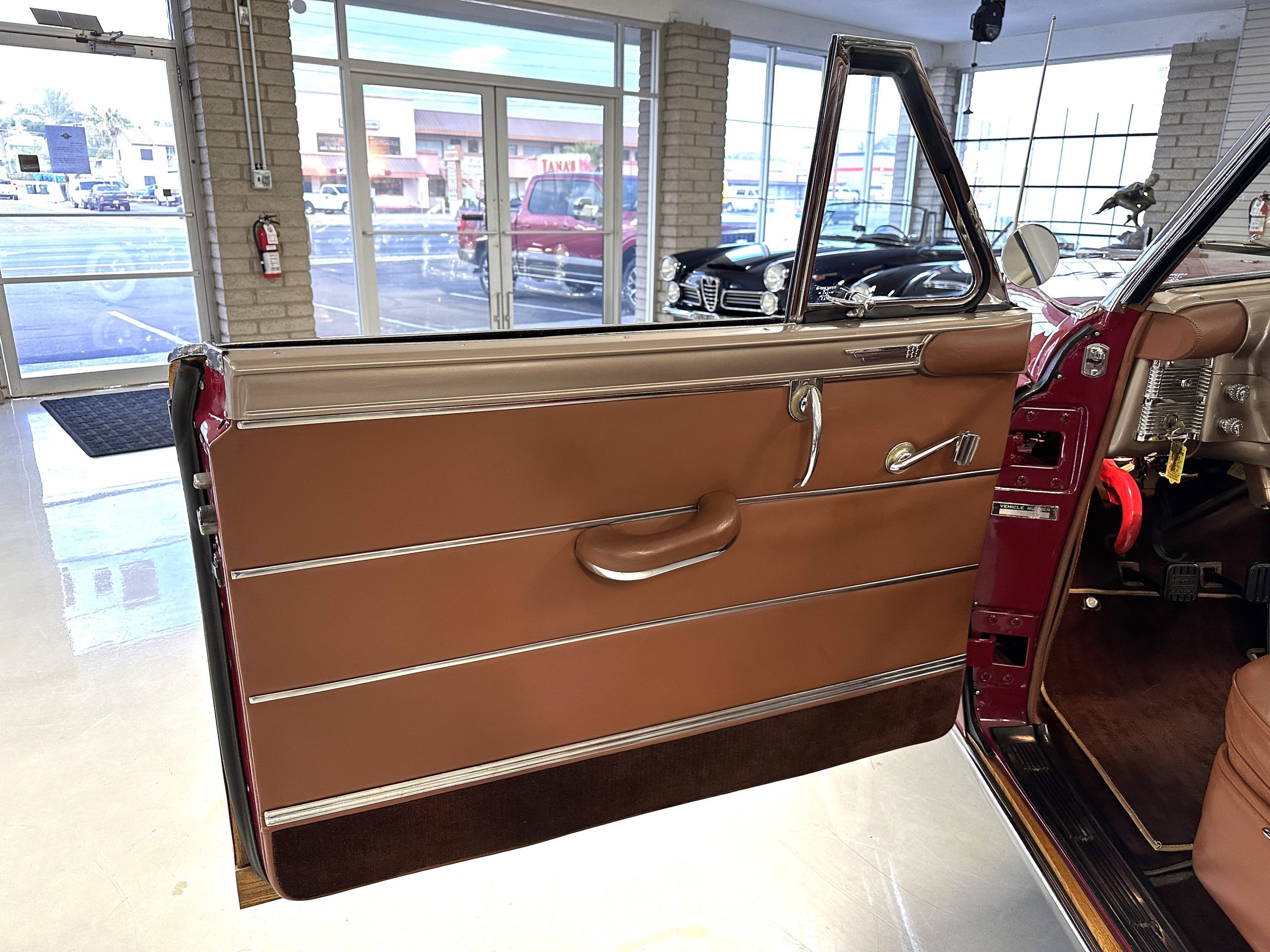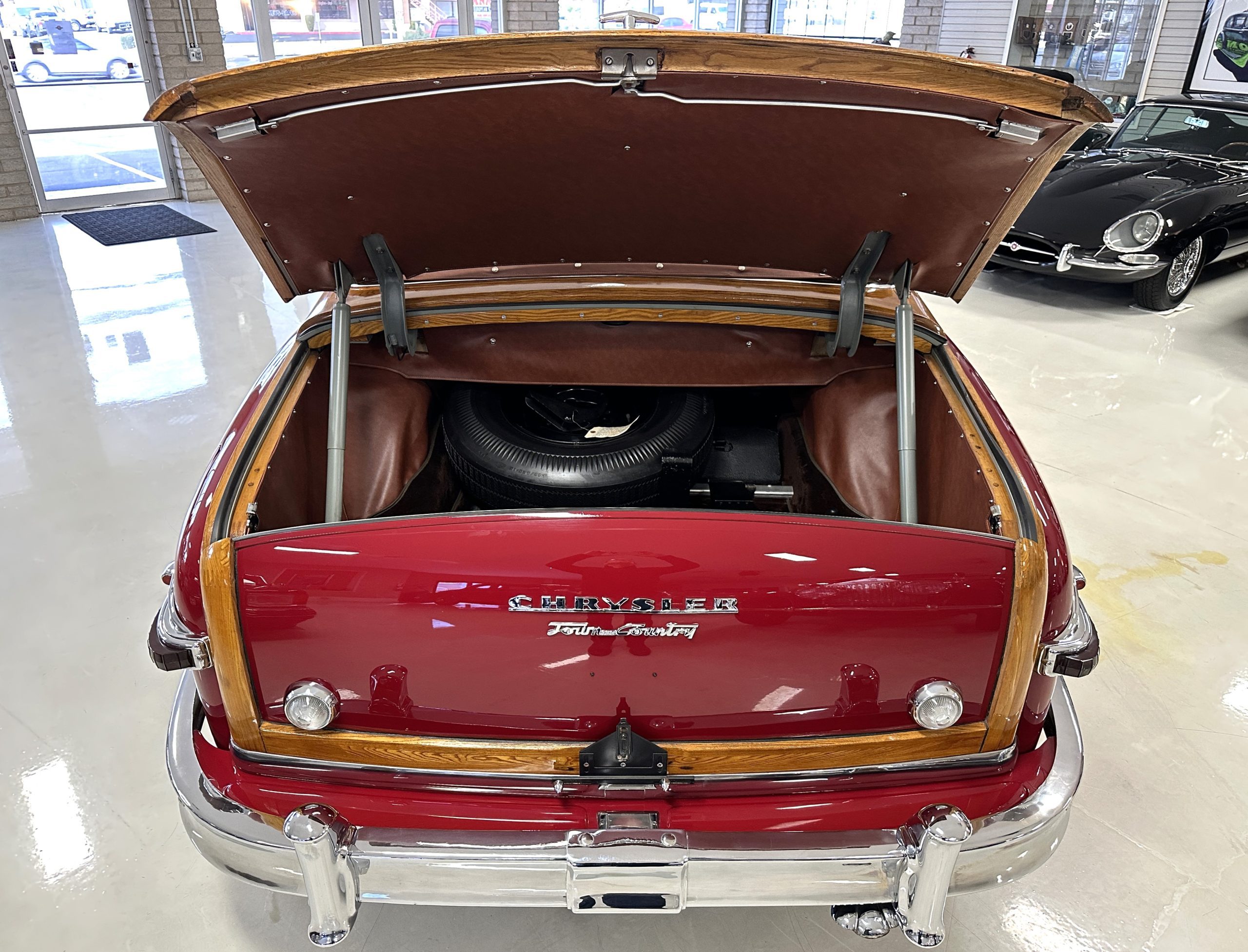 The interior is complete in Cognac Brown Leather and is complimented by beautiful brown carpeting. The leather is soft and supple, and the stunning interior shows near-new overall. The Cognac Brown leather dashboard appears as new. The Town and Country was the first production car to feature a “padded dash”. The steering wheel and gauges are all stunningly designed and in beautiful condition. The speedometer is non-functioning as is the clock, but overall, the interior is in near-new condition. We are hoping to repair the speedometer.