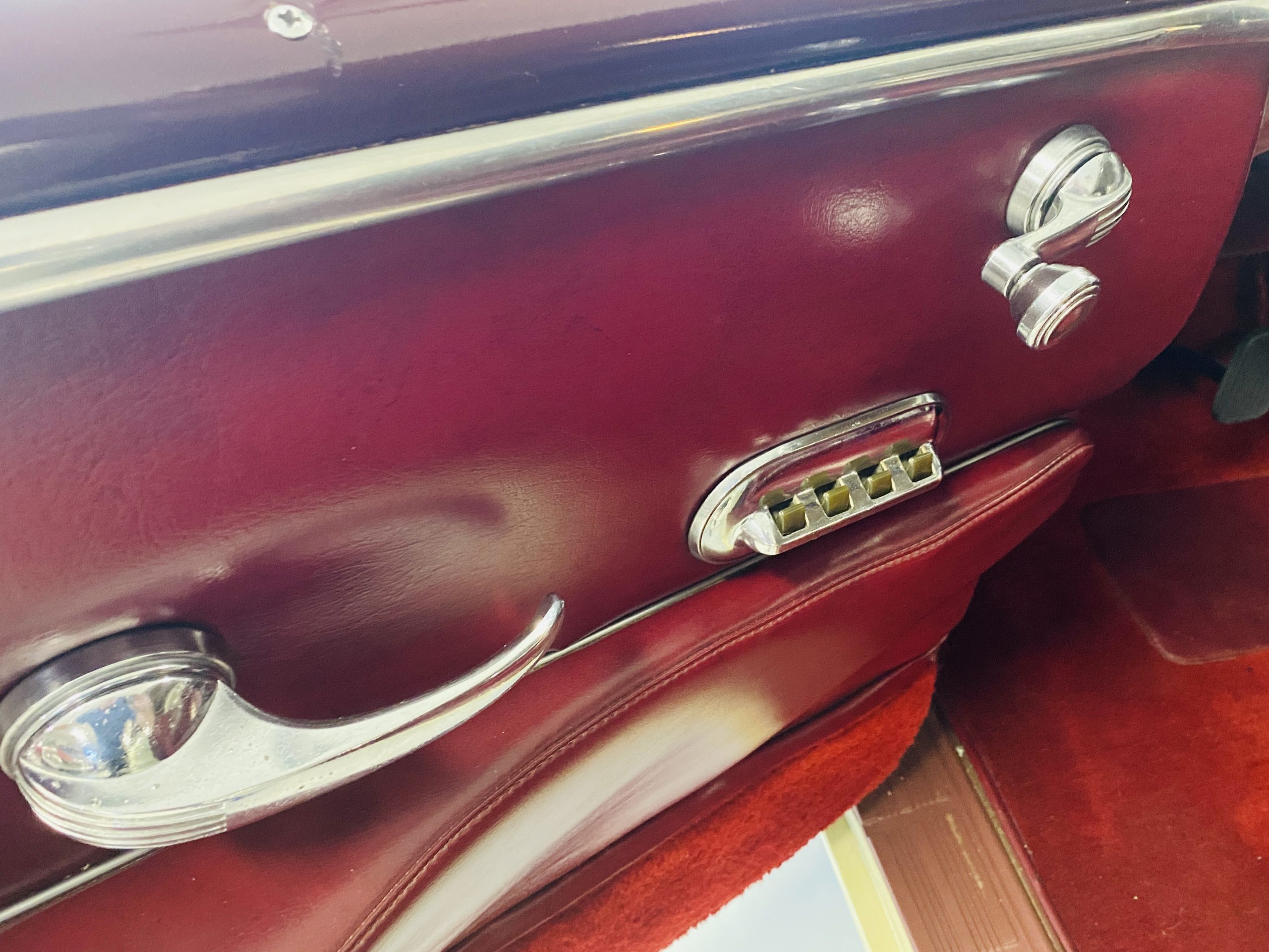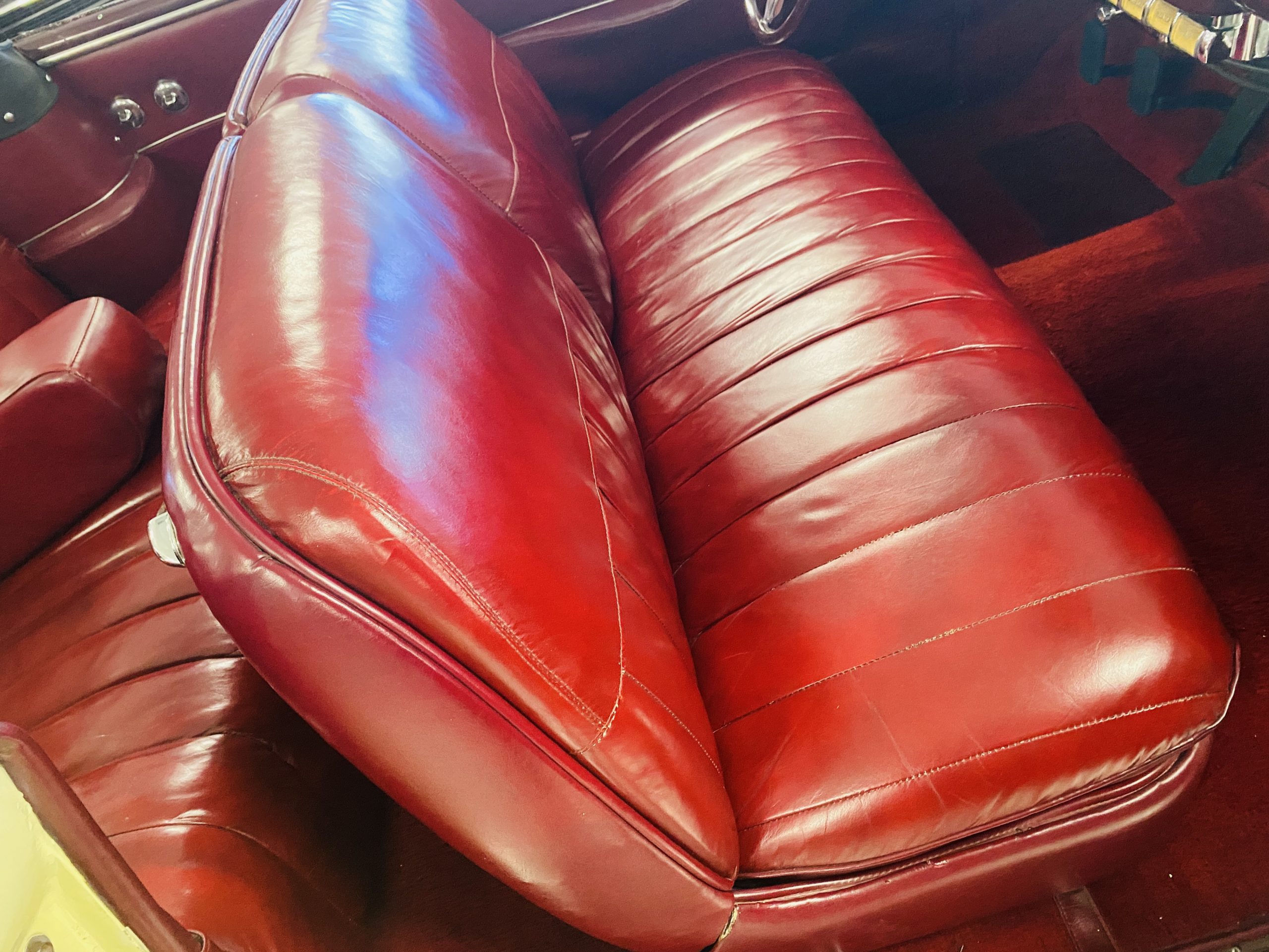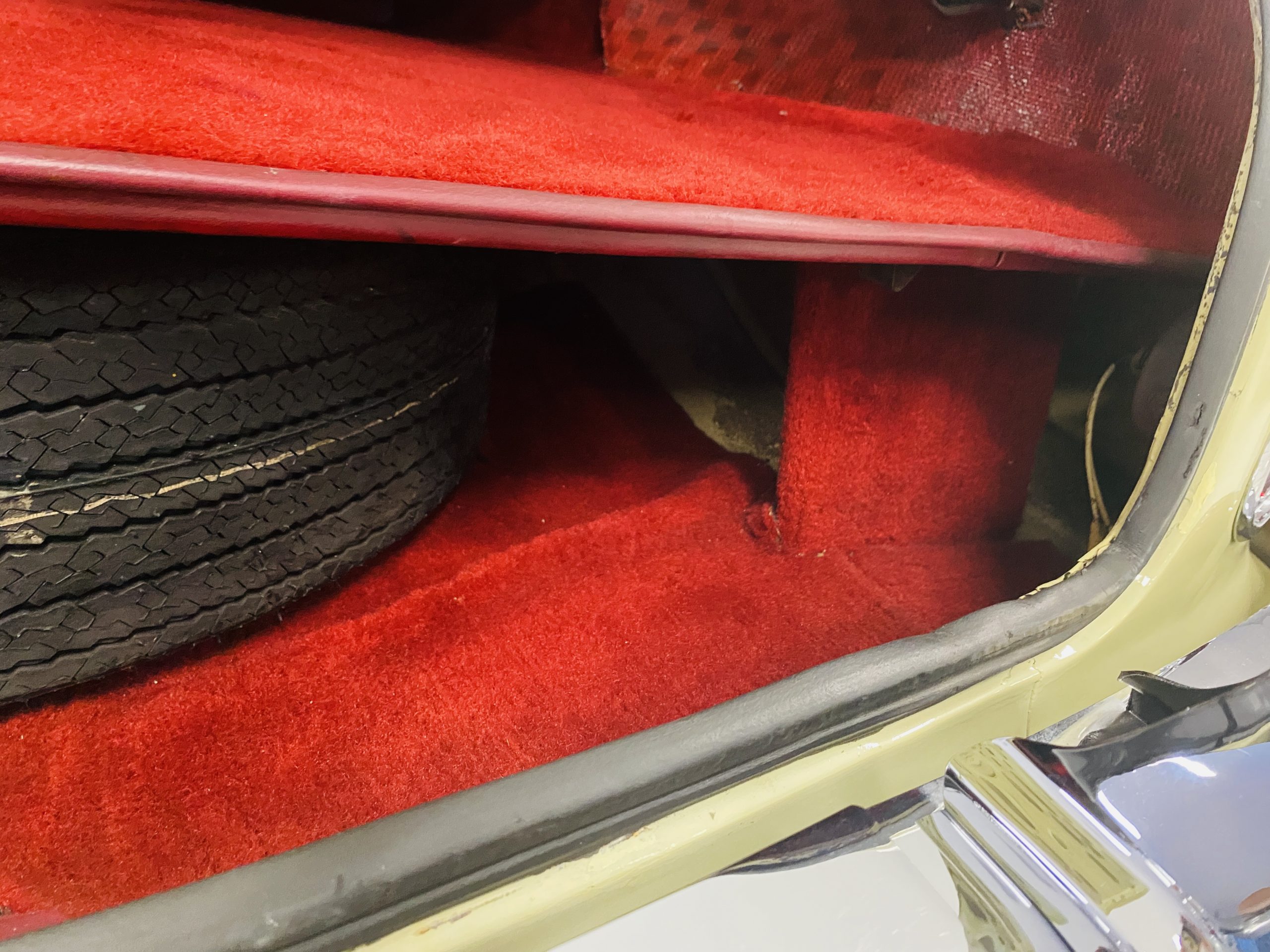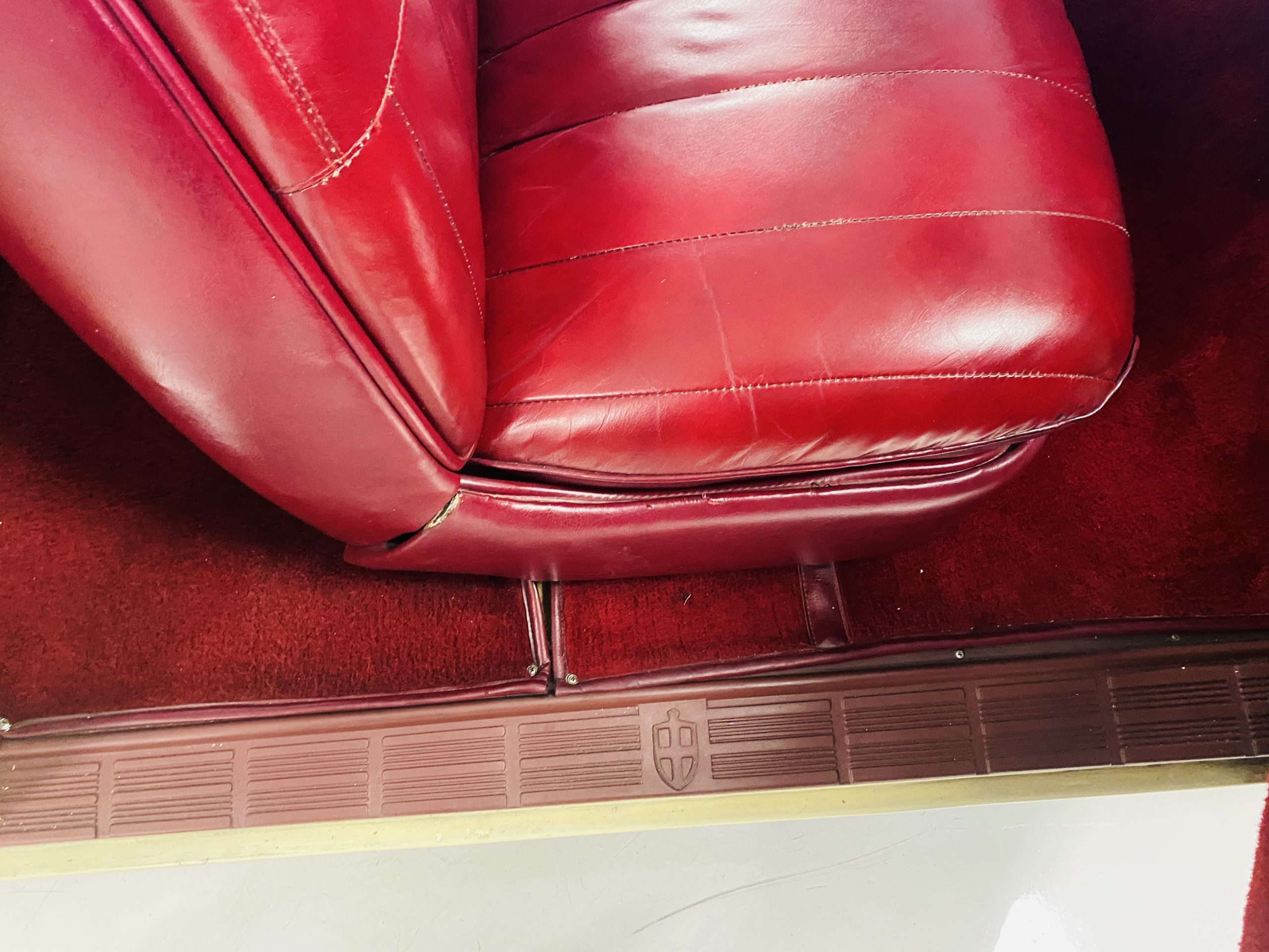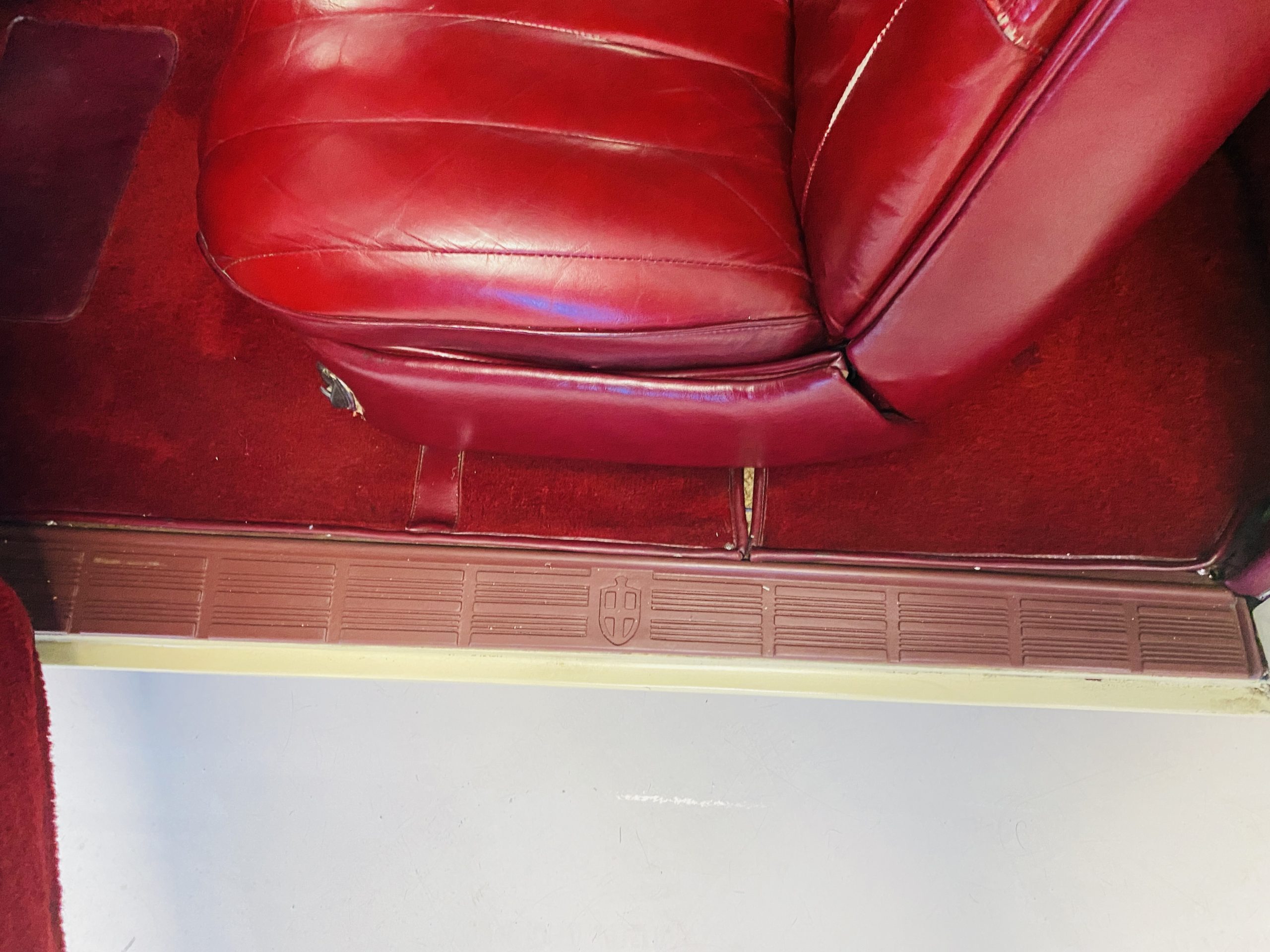 The correct solid maroon leather is in the perfect color to compliment the Calabash Yellow paint. The leather is very soft and supple and is in very nice condition overall, with only minor scratches from use over the years. The novel power operated front seat is functioning. The matching maroon painted dashboard is also in very nice original condition, supporting the low mileage and gentle care that its received over the decades. The exclusive gold hued knobs and buttons are also in very nice condition. The maroon carpeting is in overall good condition.