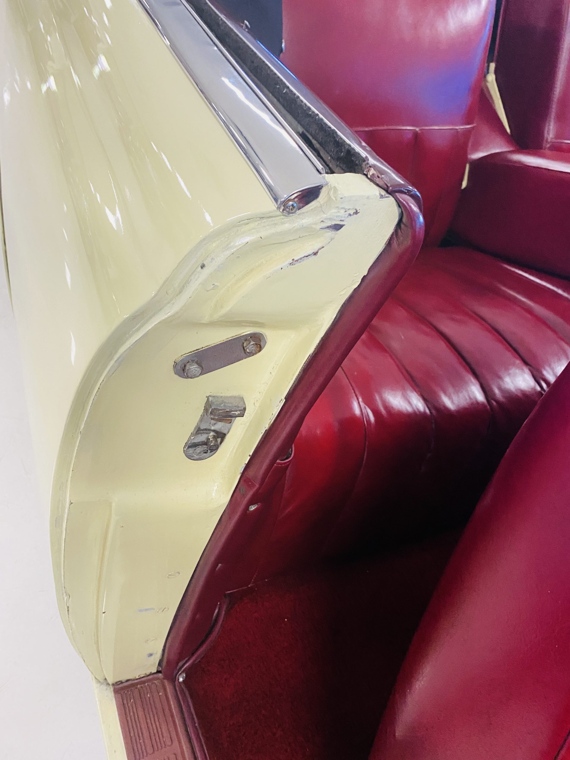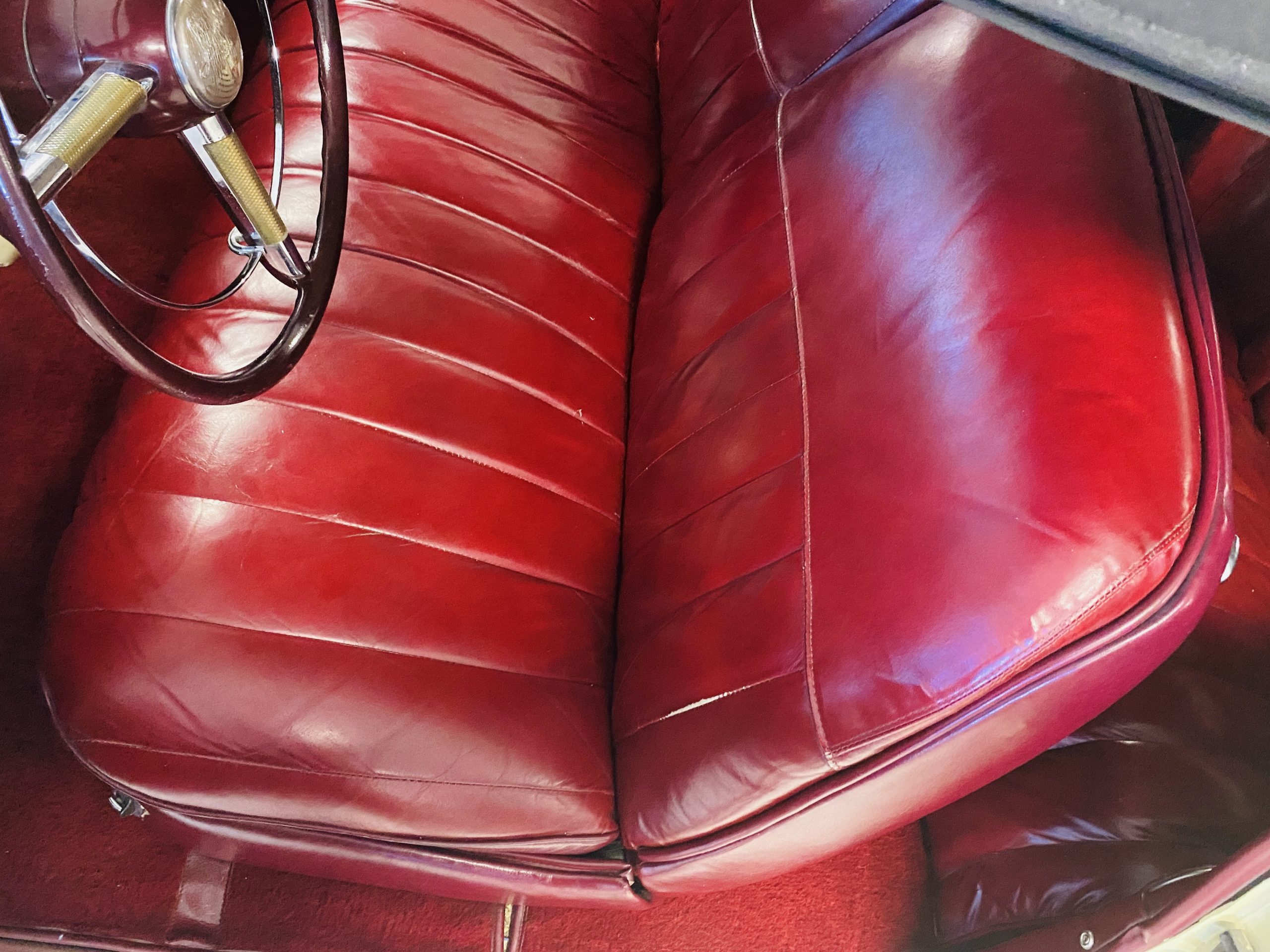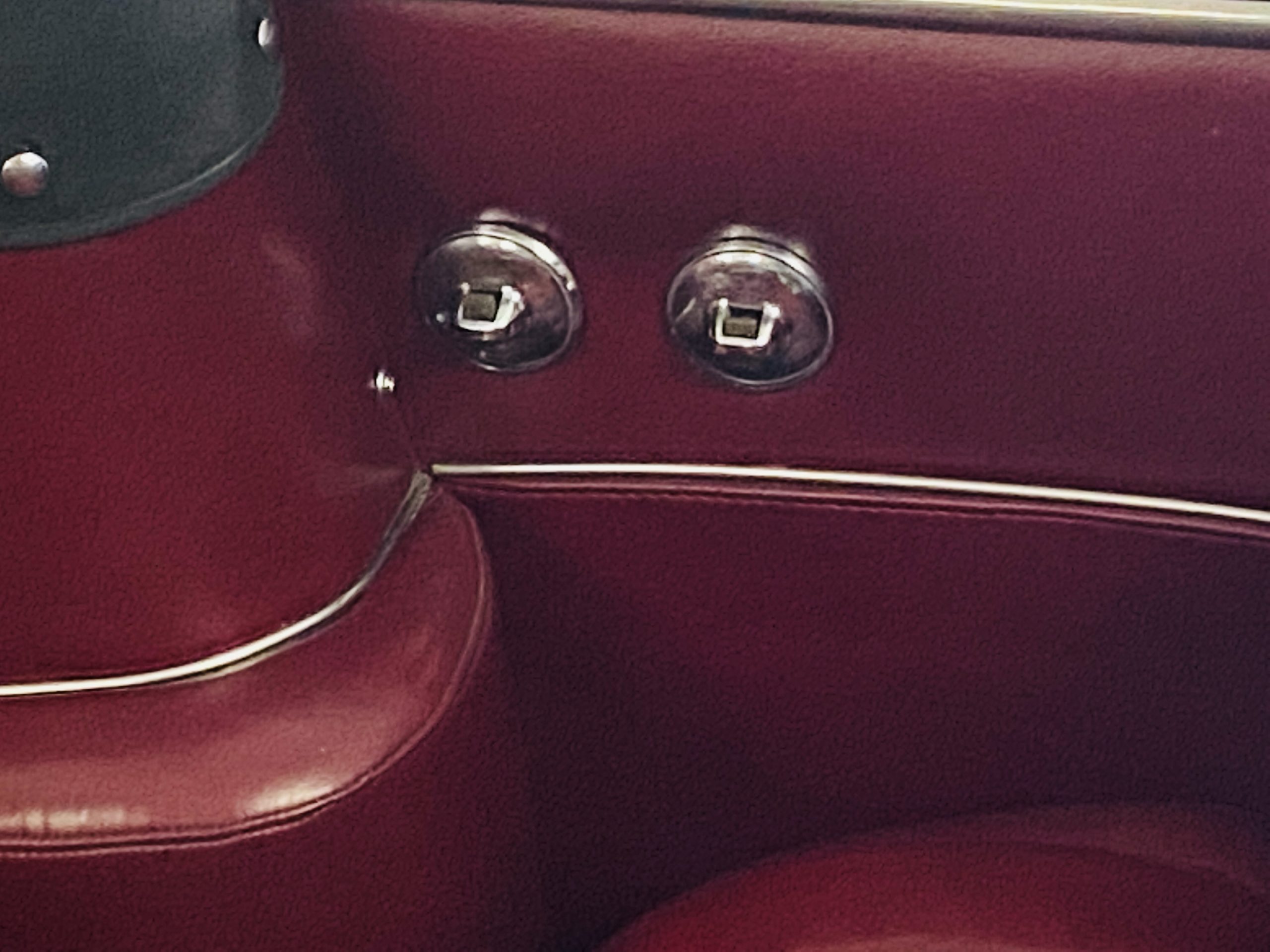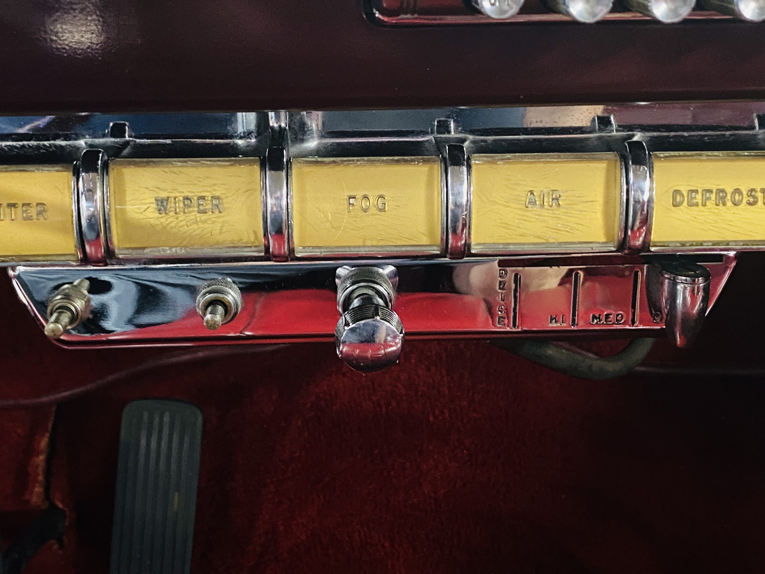 The correct solid maroon leather is in the perfect color to compliment the Calabash Yellow paint. The leather is very soft and supple and is in very nice condition overall, with only minor scratches from use over the years. The novel power operated front seat is functioning. The matching maroon painted dashboard is also in very nice original condition, supporting the low mileage and gentle care that its received over the decades. The exclusive gold hued knobs and buttons are also in very nice condition. The maroon carpeting is in overall good condition.