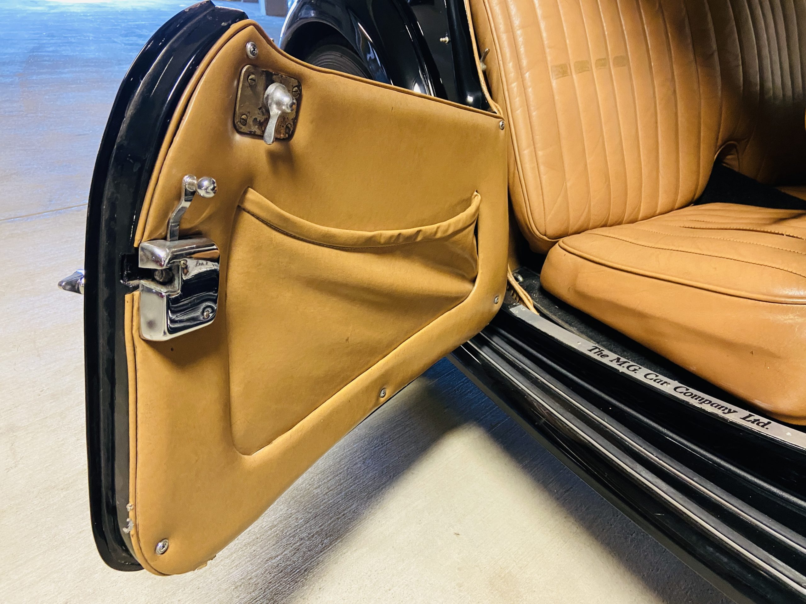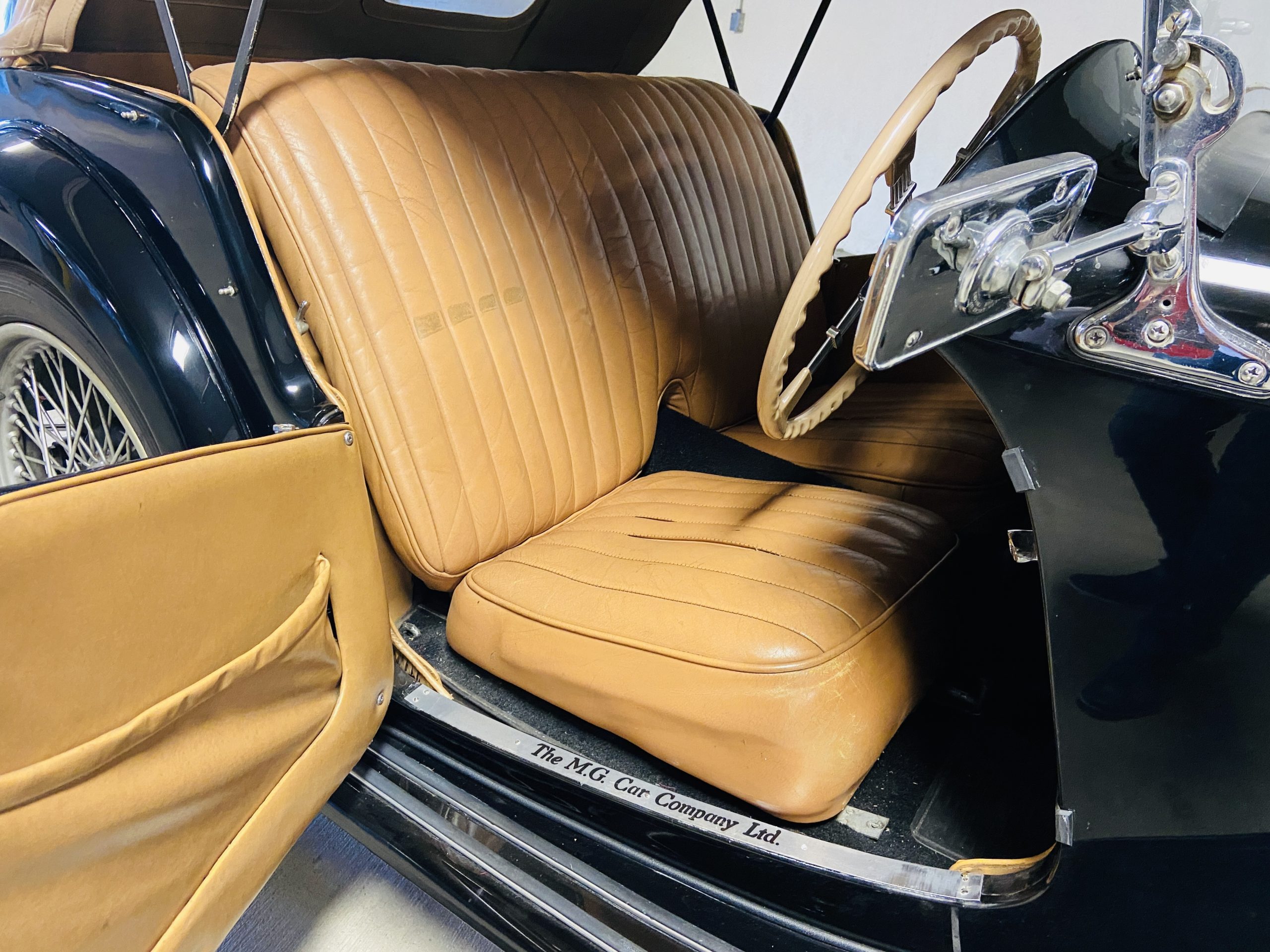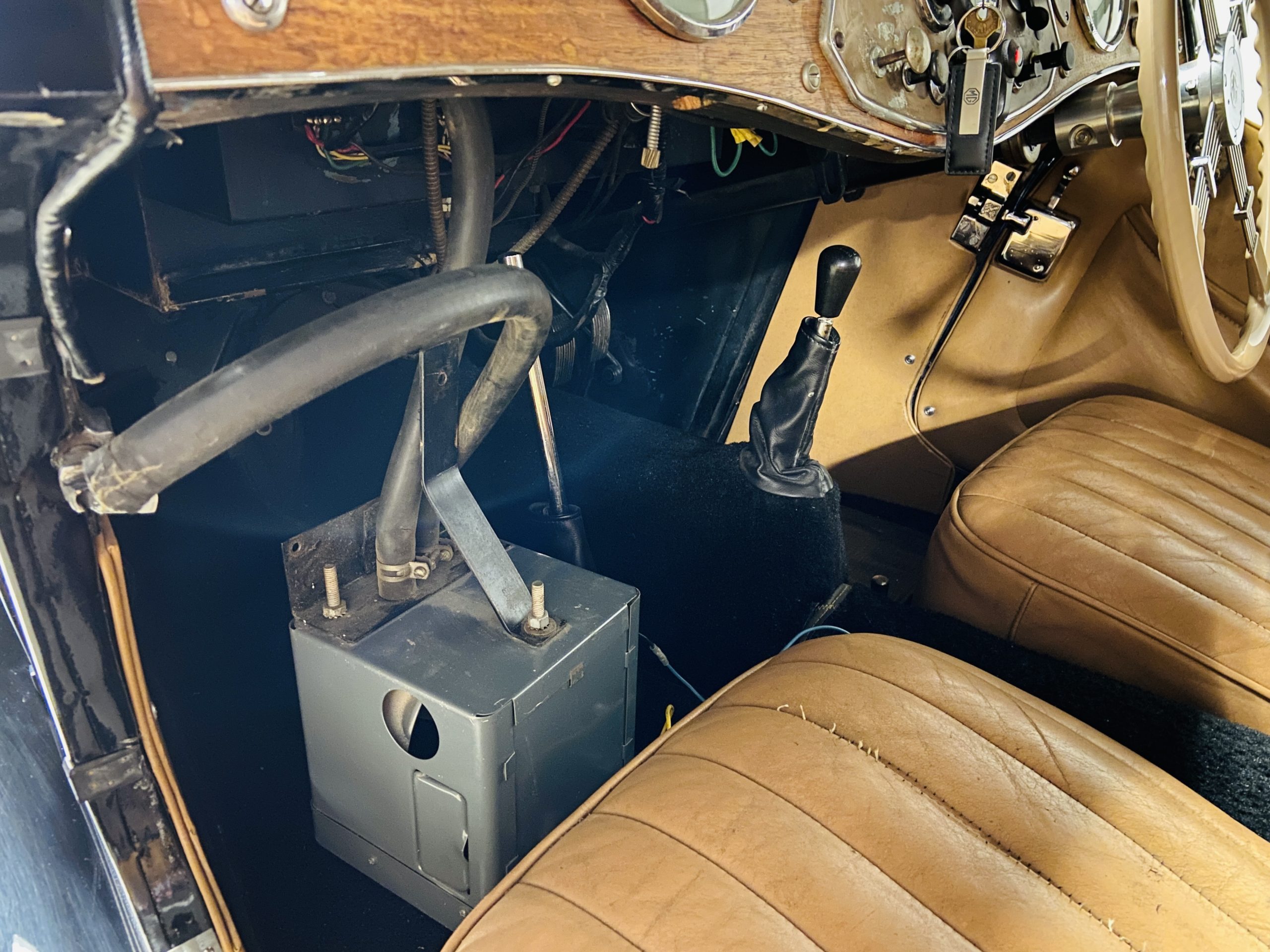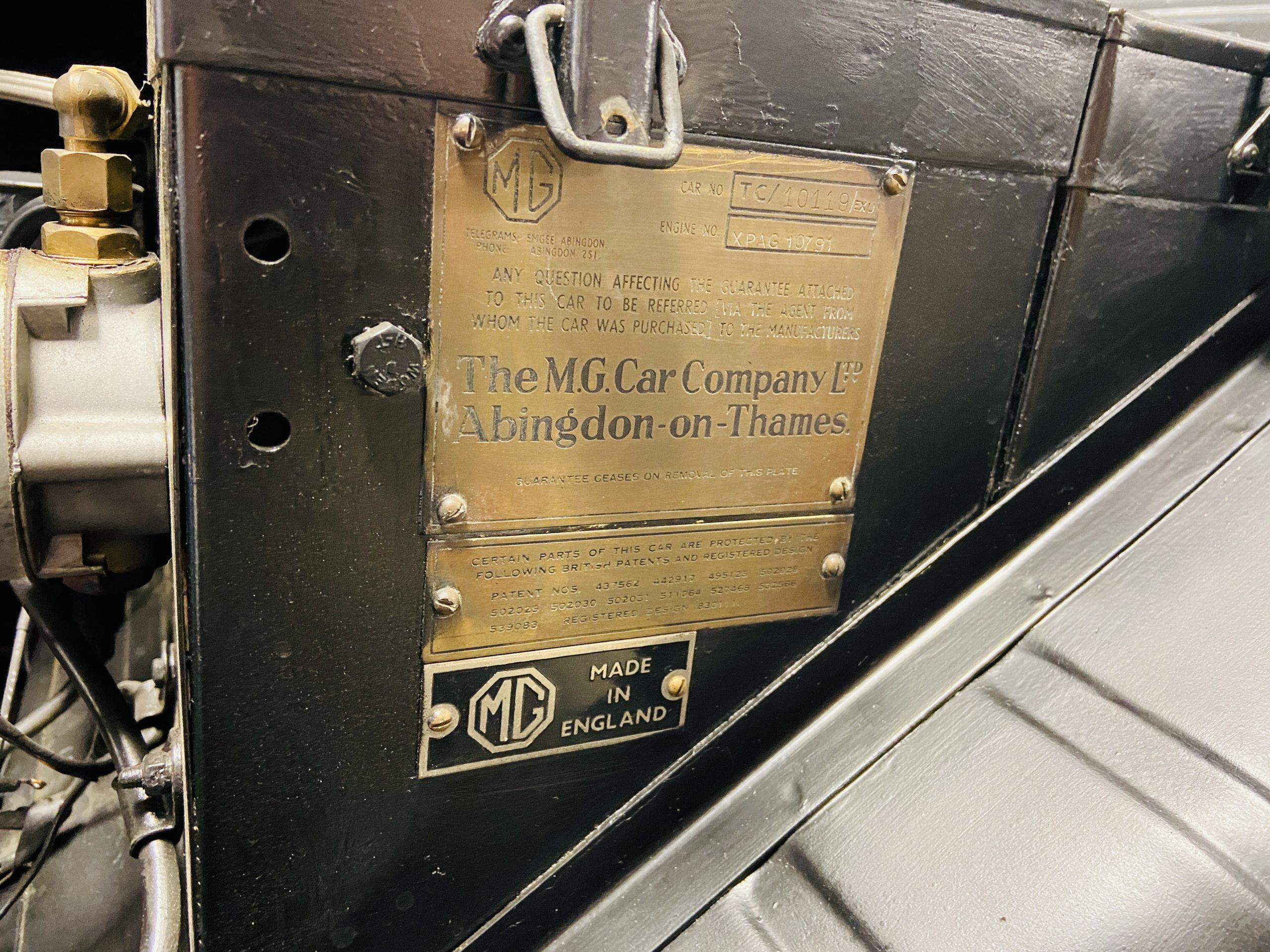 This MG TC has a matching numbers engine and the engine compartment is largely correct and in good order. We would recommend a basic detailing and touching up the engine paint to make it presentable for shows. Nerfine bars were added decades ago as these were popular accessories in the 1950’s. This MG TC comes complete (the lid to the battery box is behind the seats along with additional spare parts).