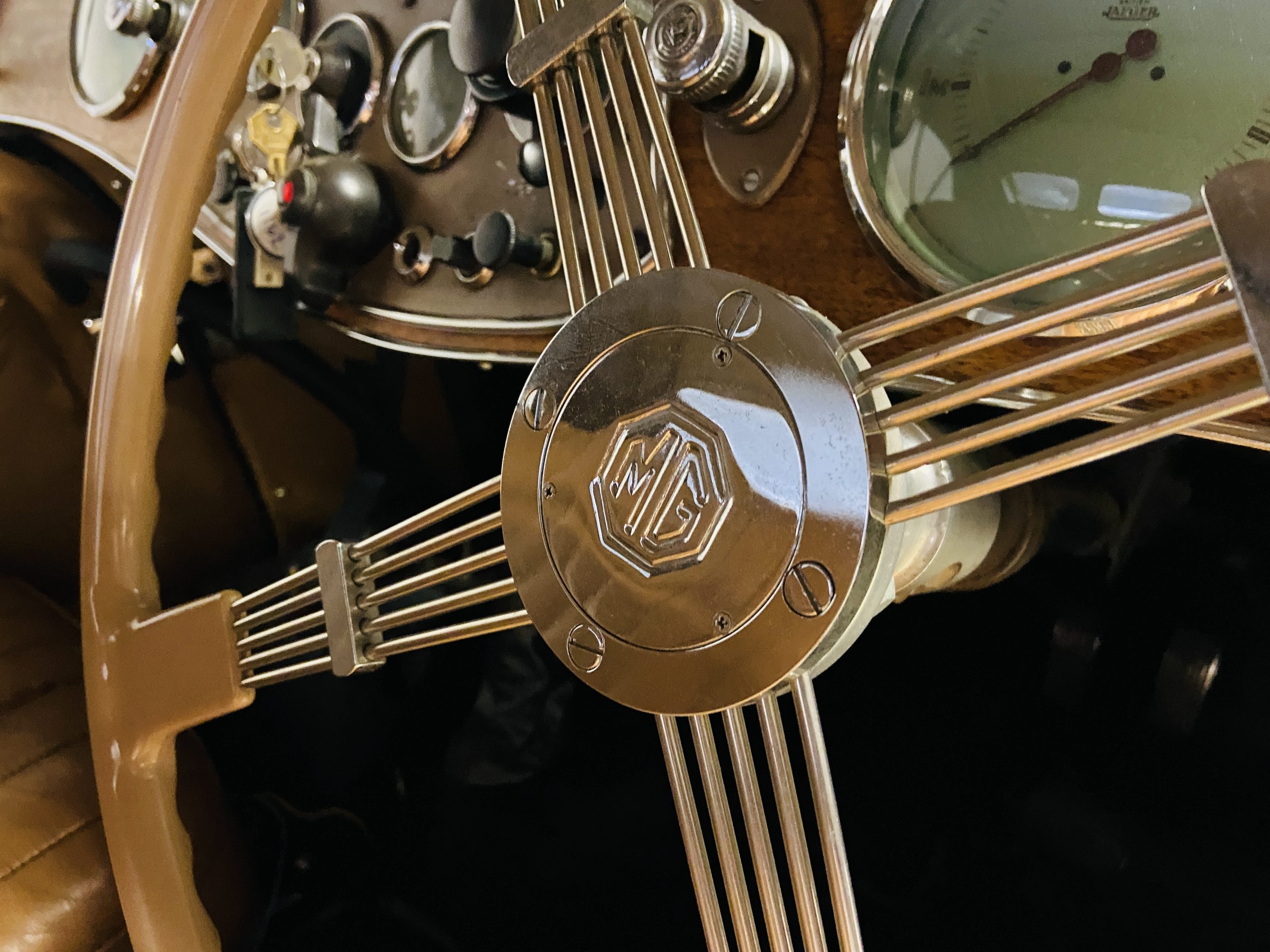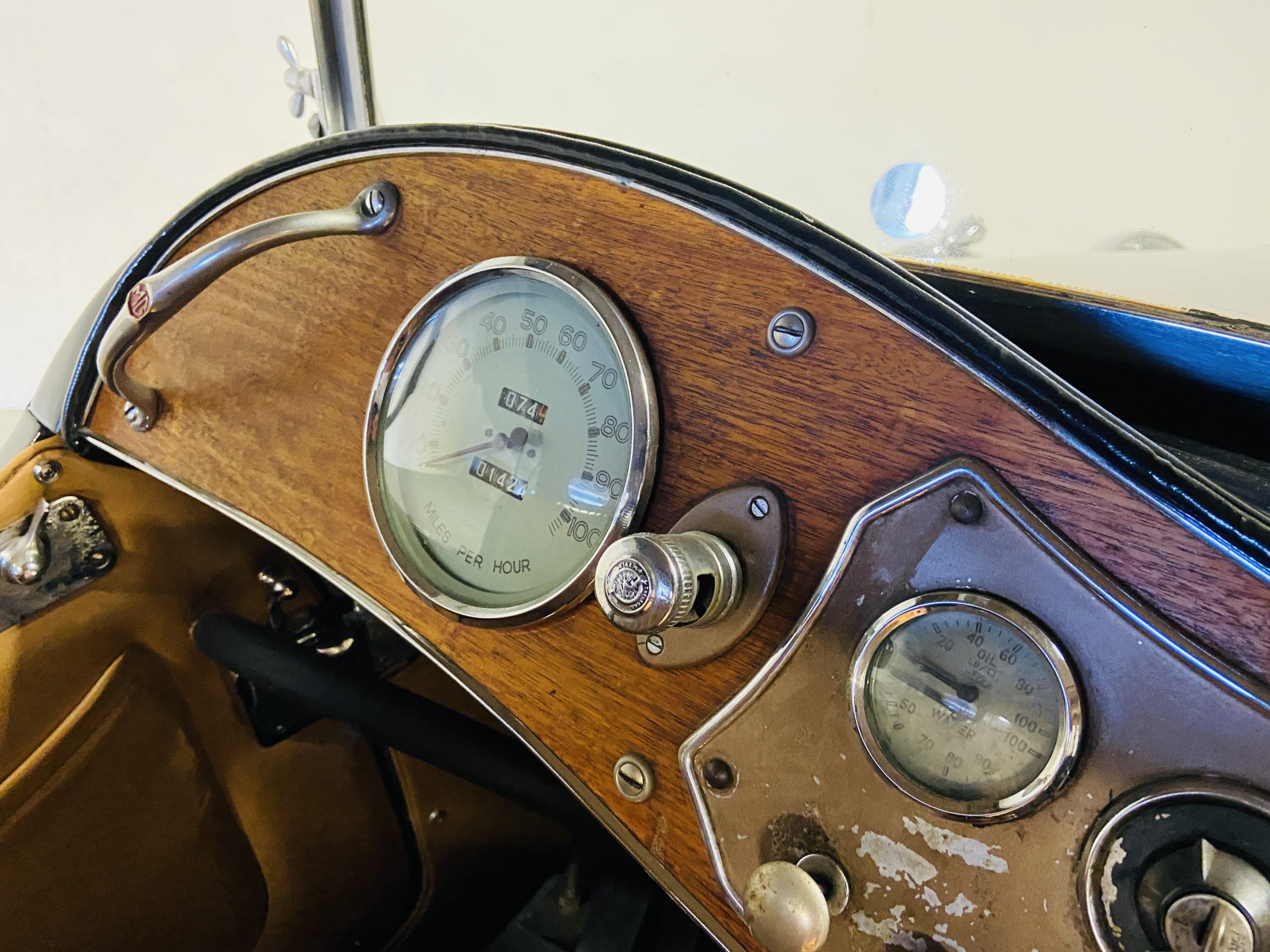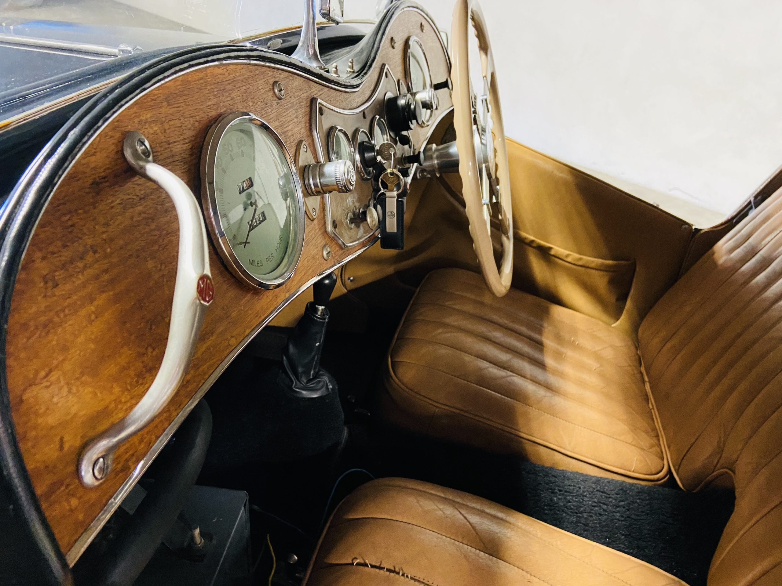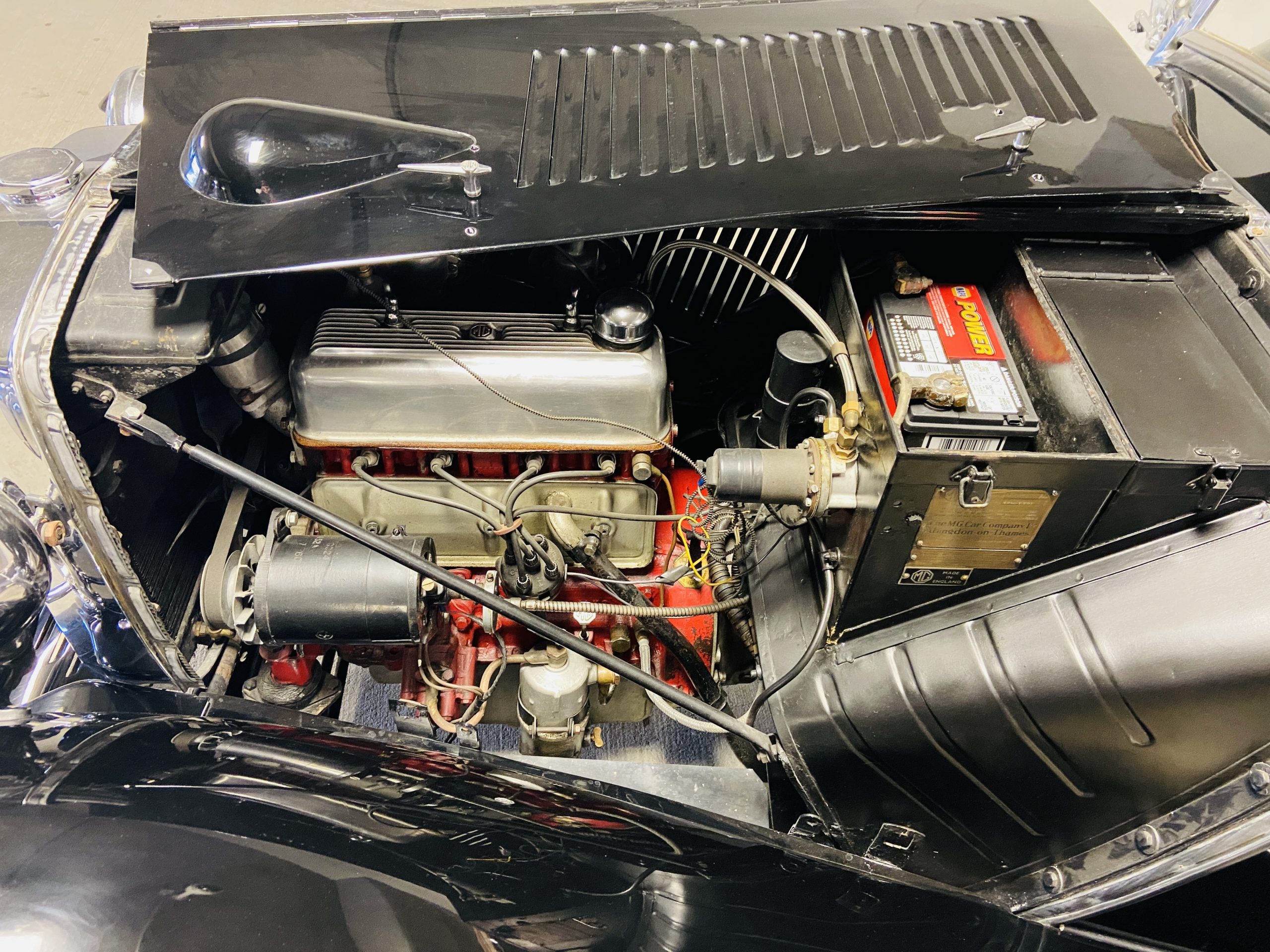 This MG TC has a matching numbers engine and the engine compartment is largely correct and in good order. We would recommend a basic detailing and touching up the engine paint to make it presentable for shows. Nerfine bars were added decades ago as these were popular accessories in the 1950’s. This MG TC comes complete (the lid to the battery box is behind the seats along with additional spare parts).