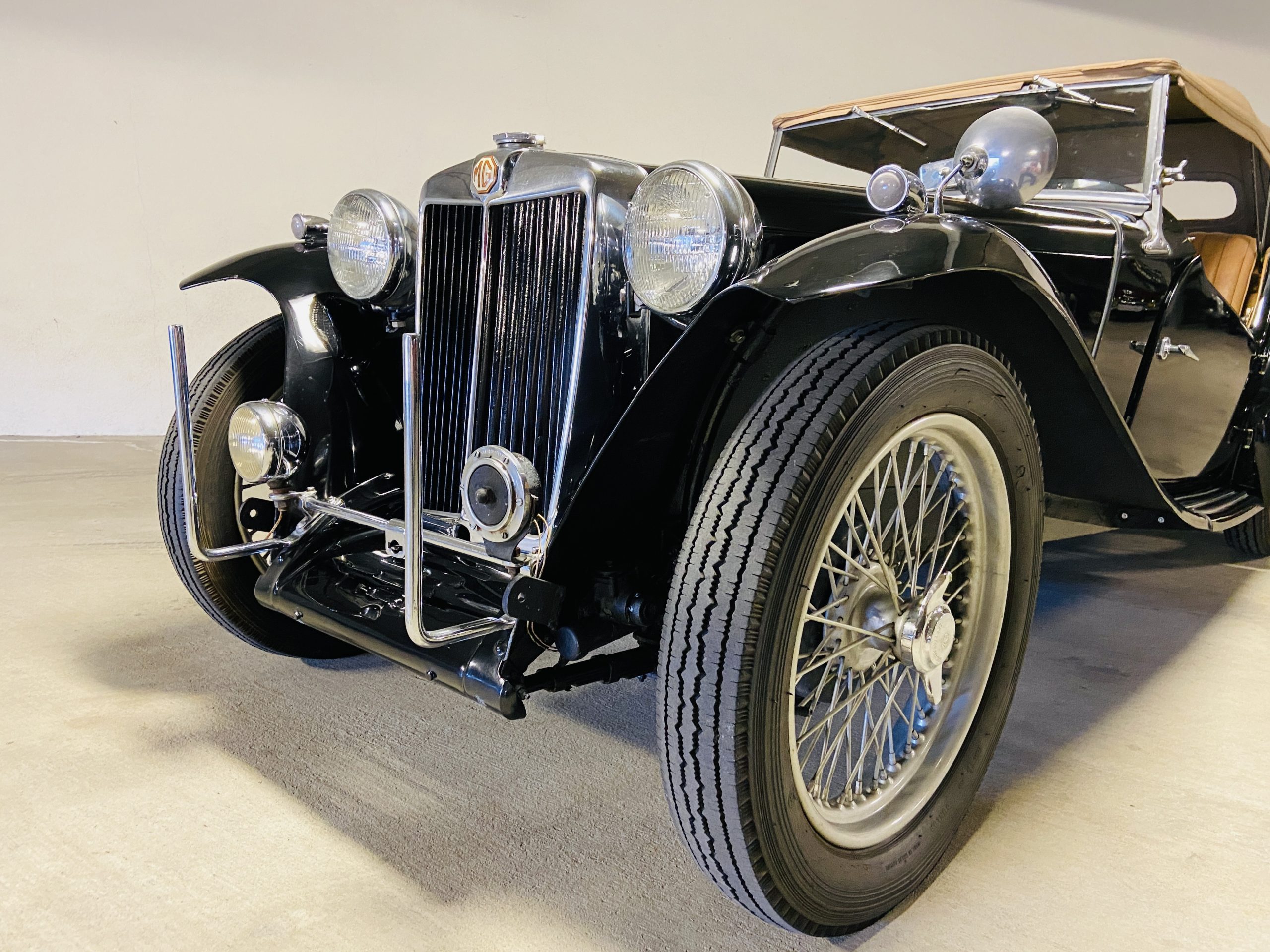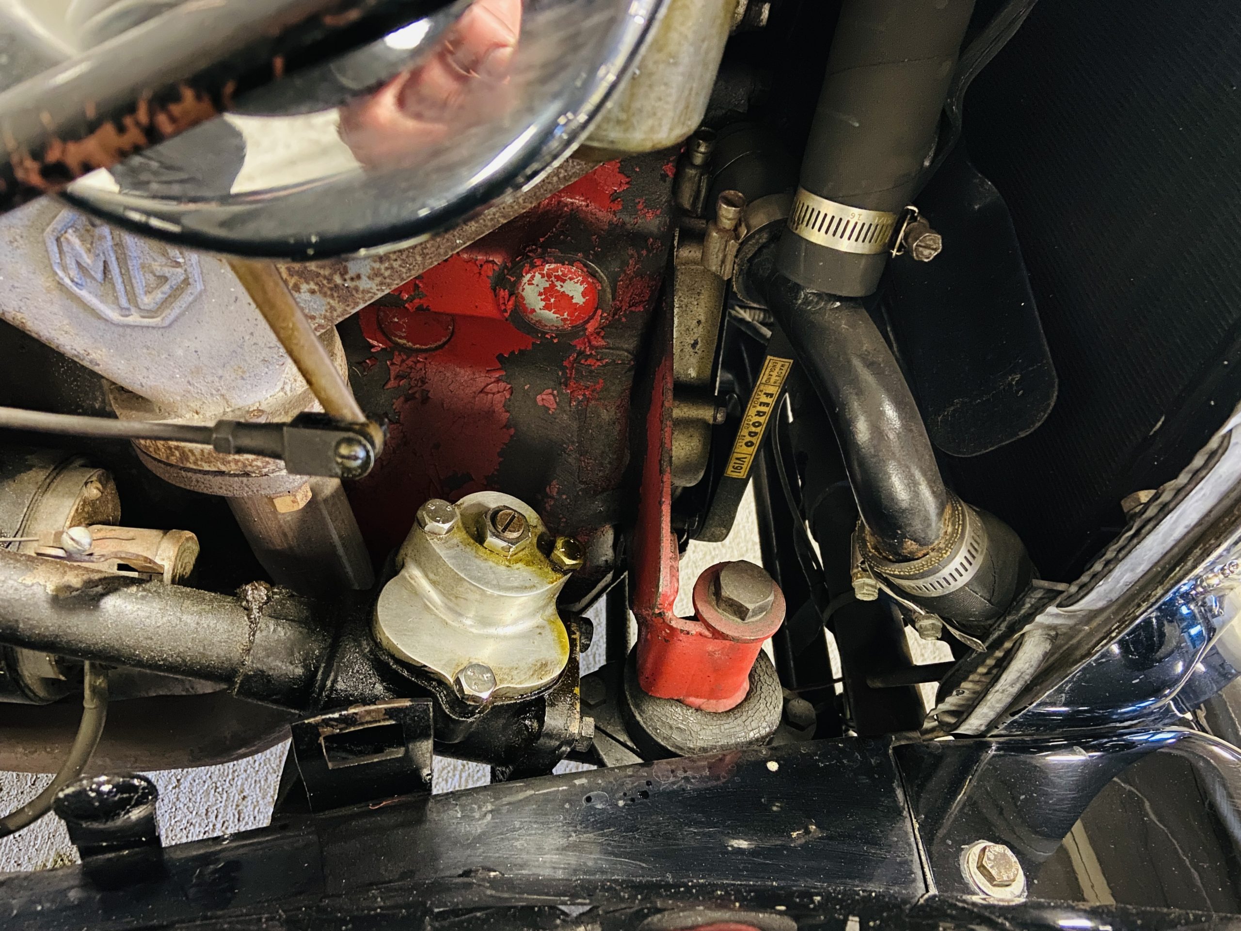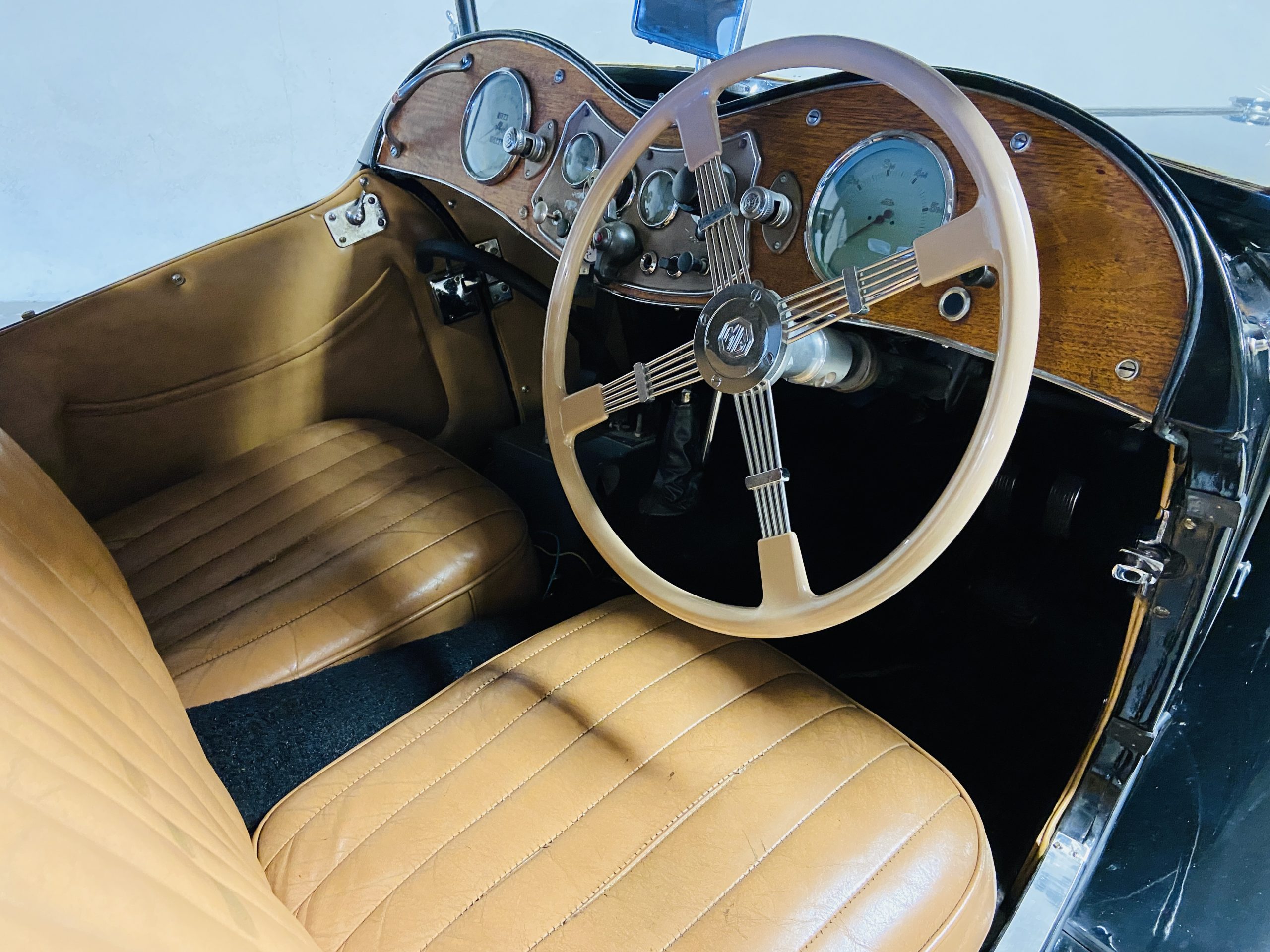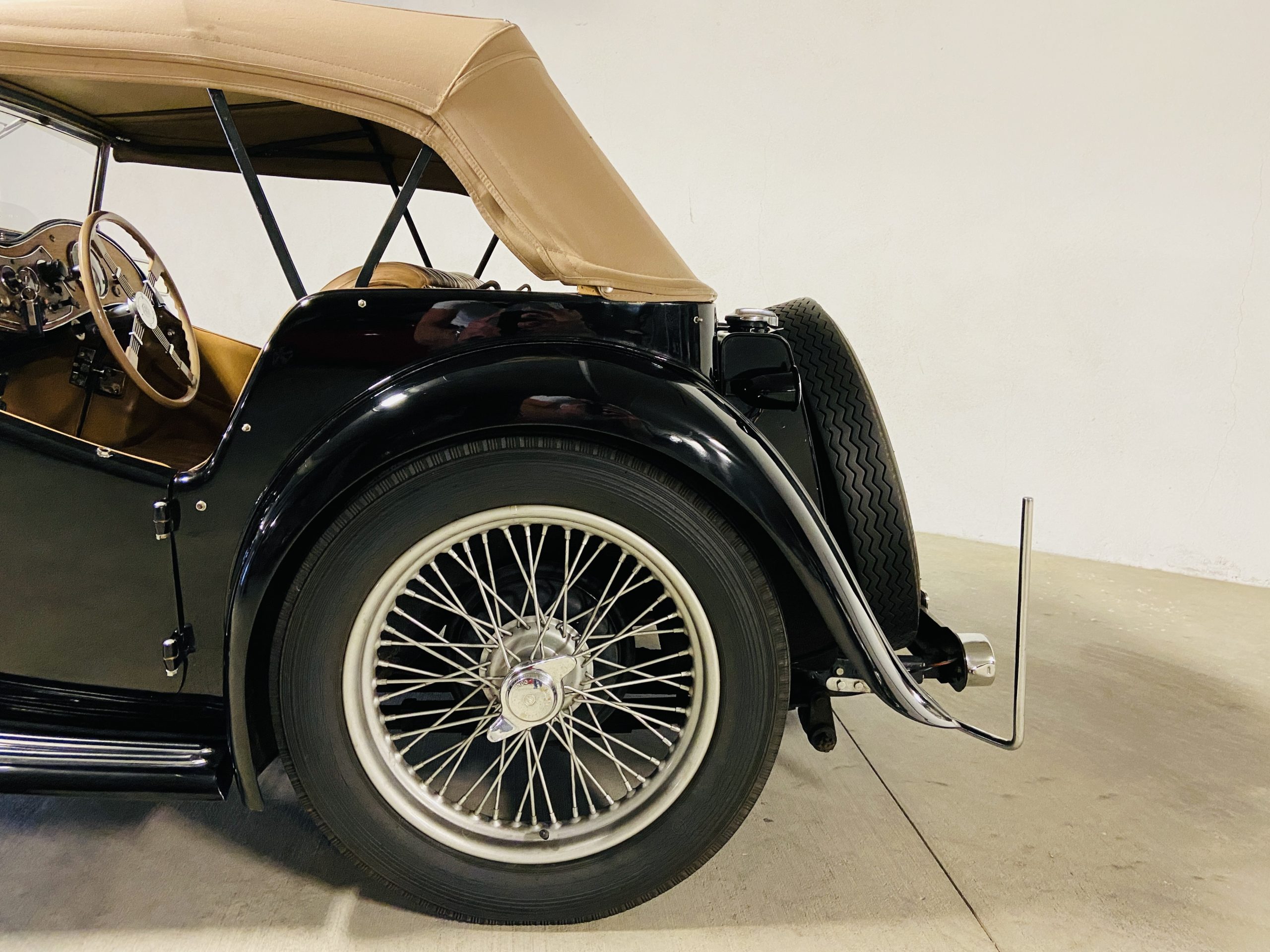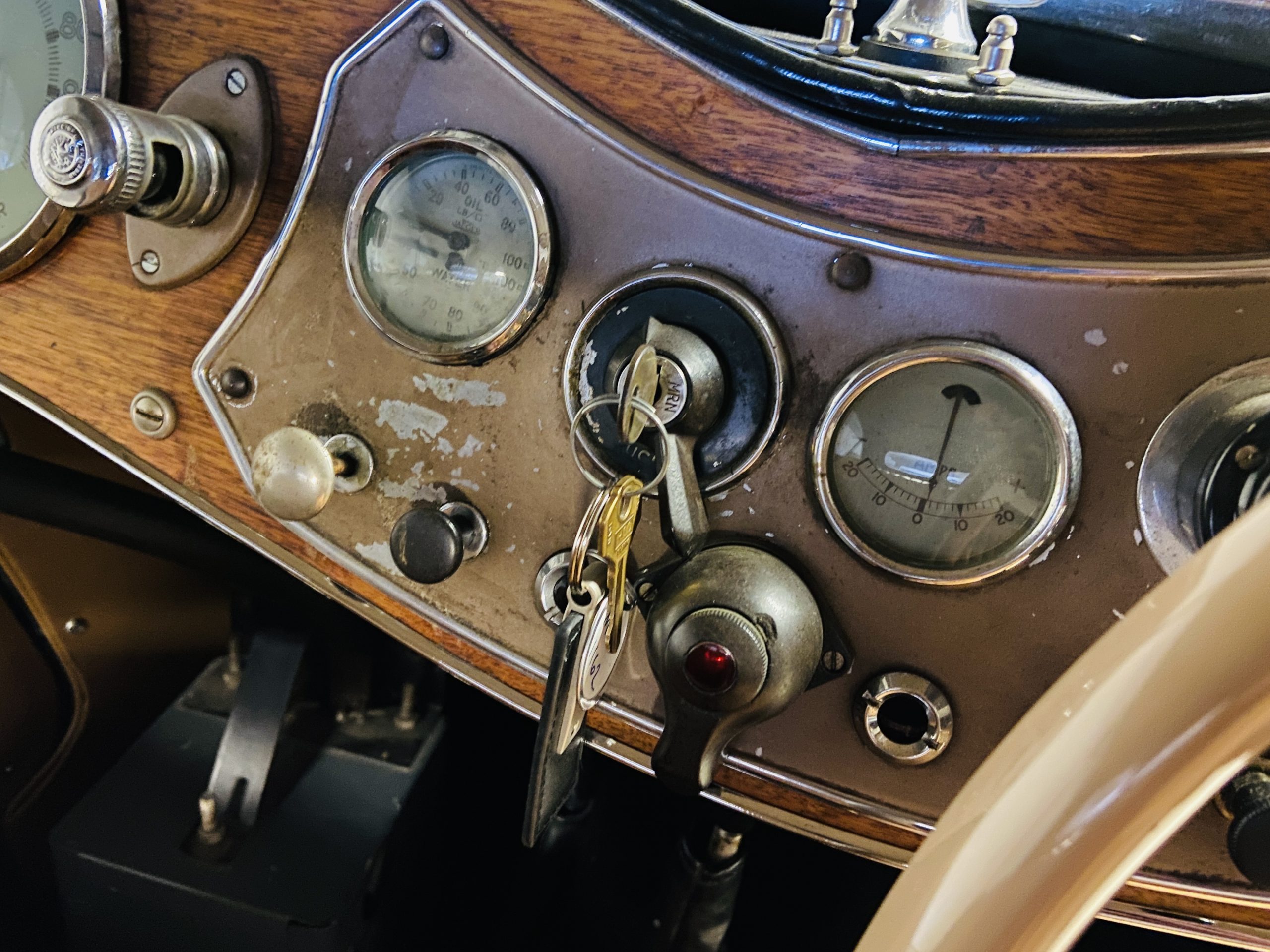 This MG TC has a matching numbers engine and the engine compartment is largely correct and in good order. We would recommend a basic detailing and touching up the engine paint to make it presentable for shows. Nerfine bars were added decades ago as these were popular accessories in the 1950’s. This MG TC comes complete (the lid to the battery box is behind the seats along with additional spare parts).
