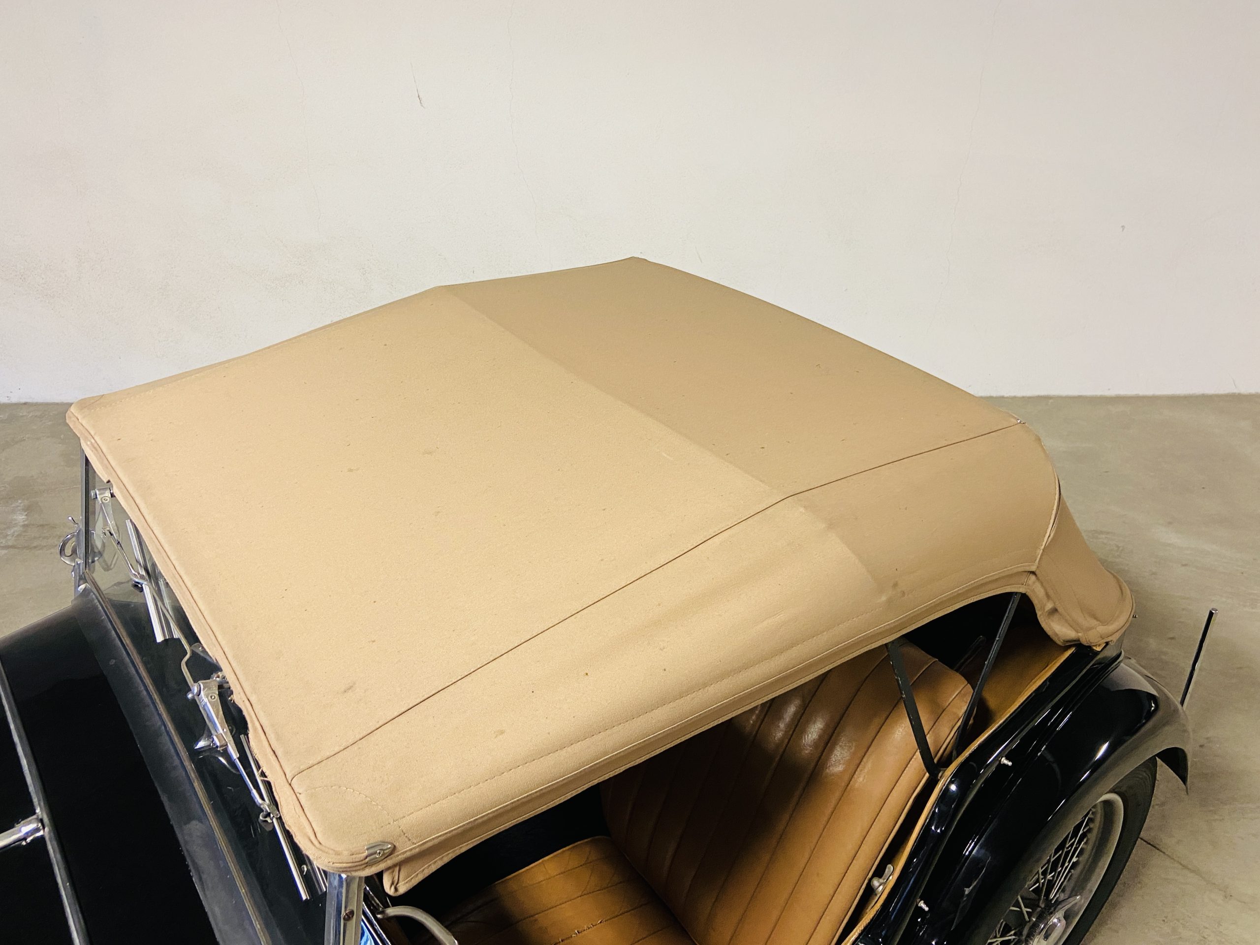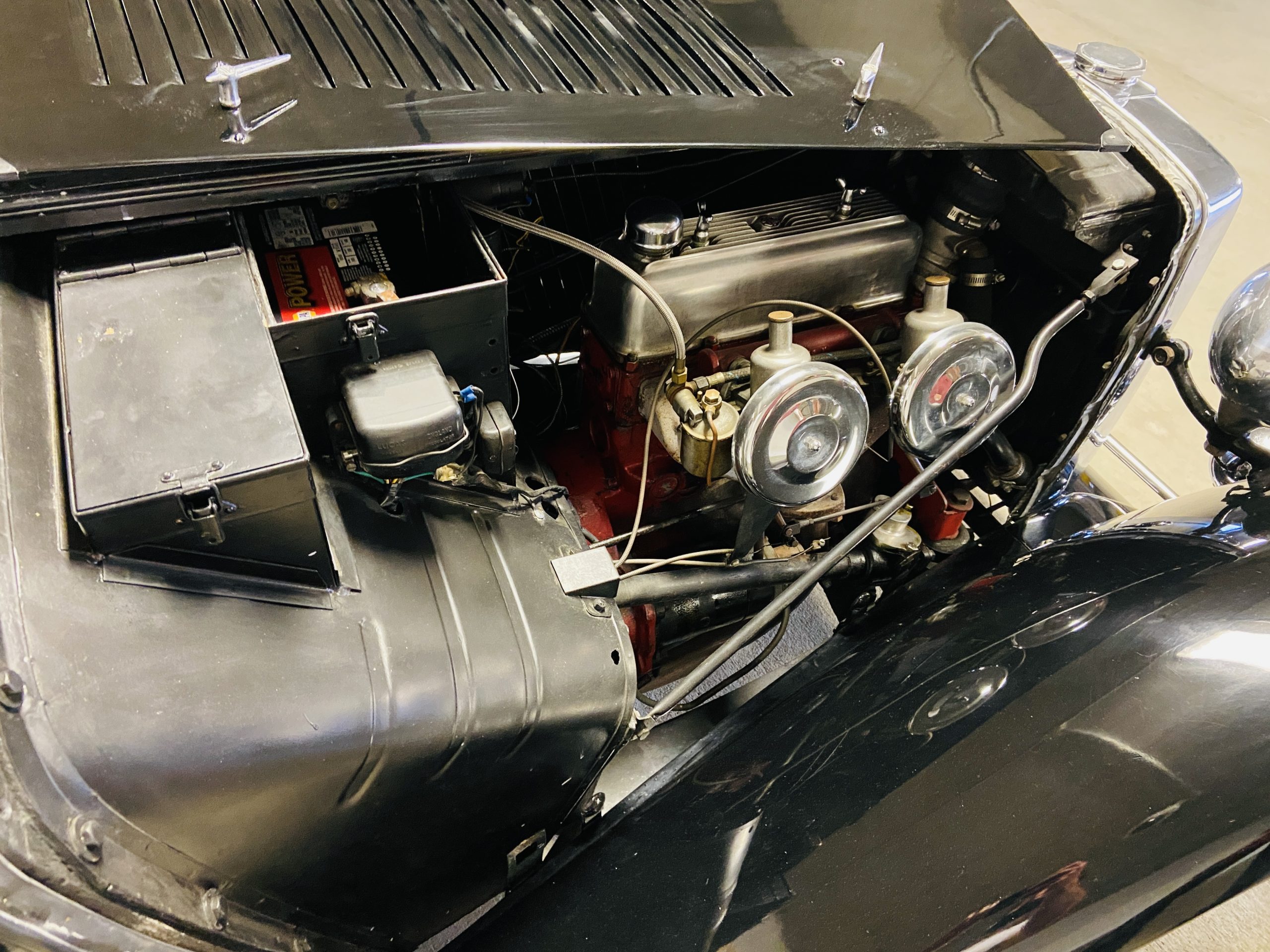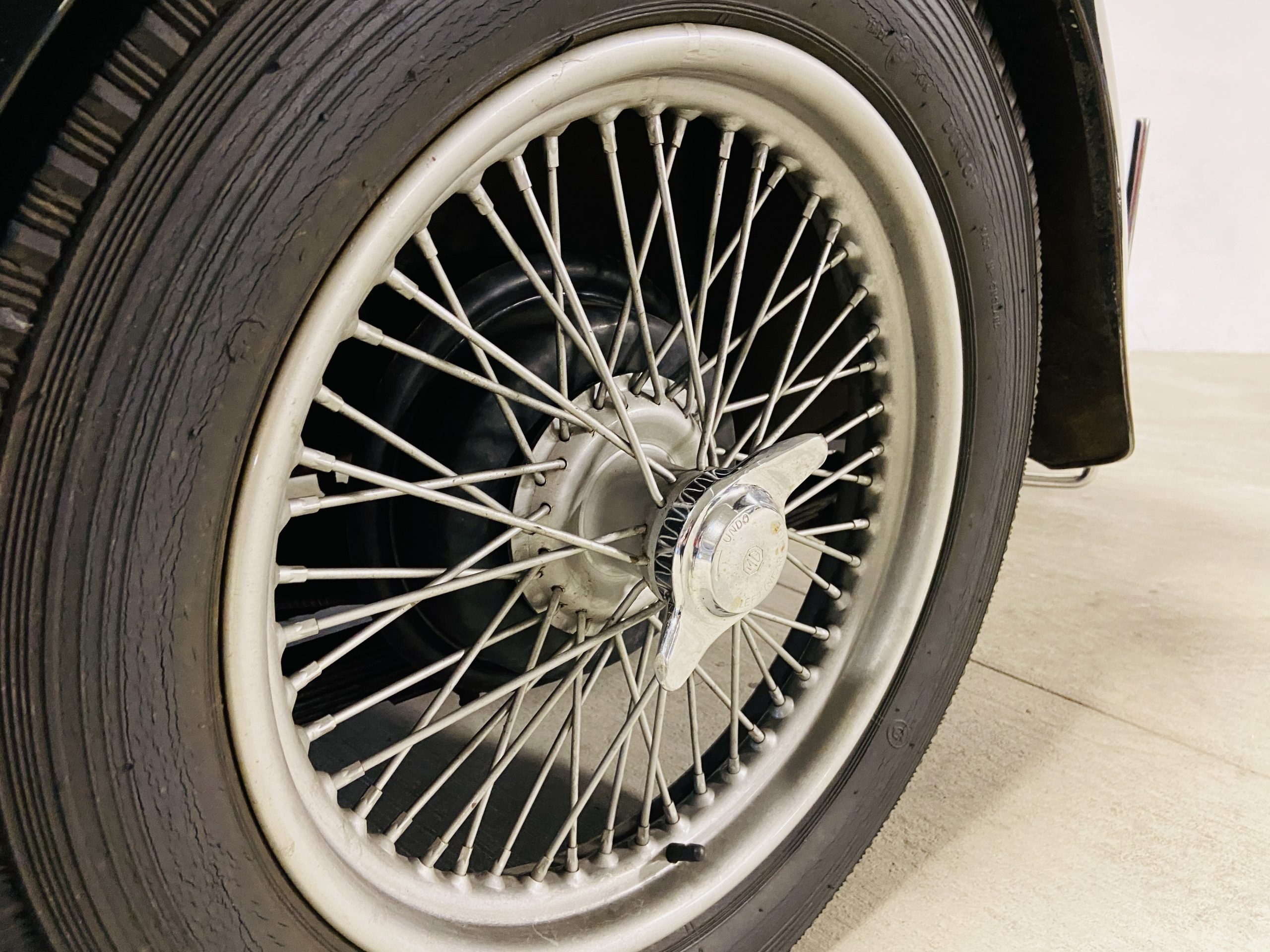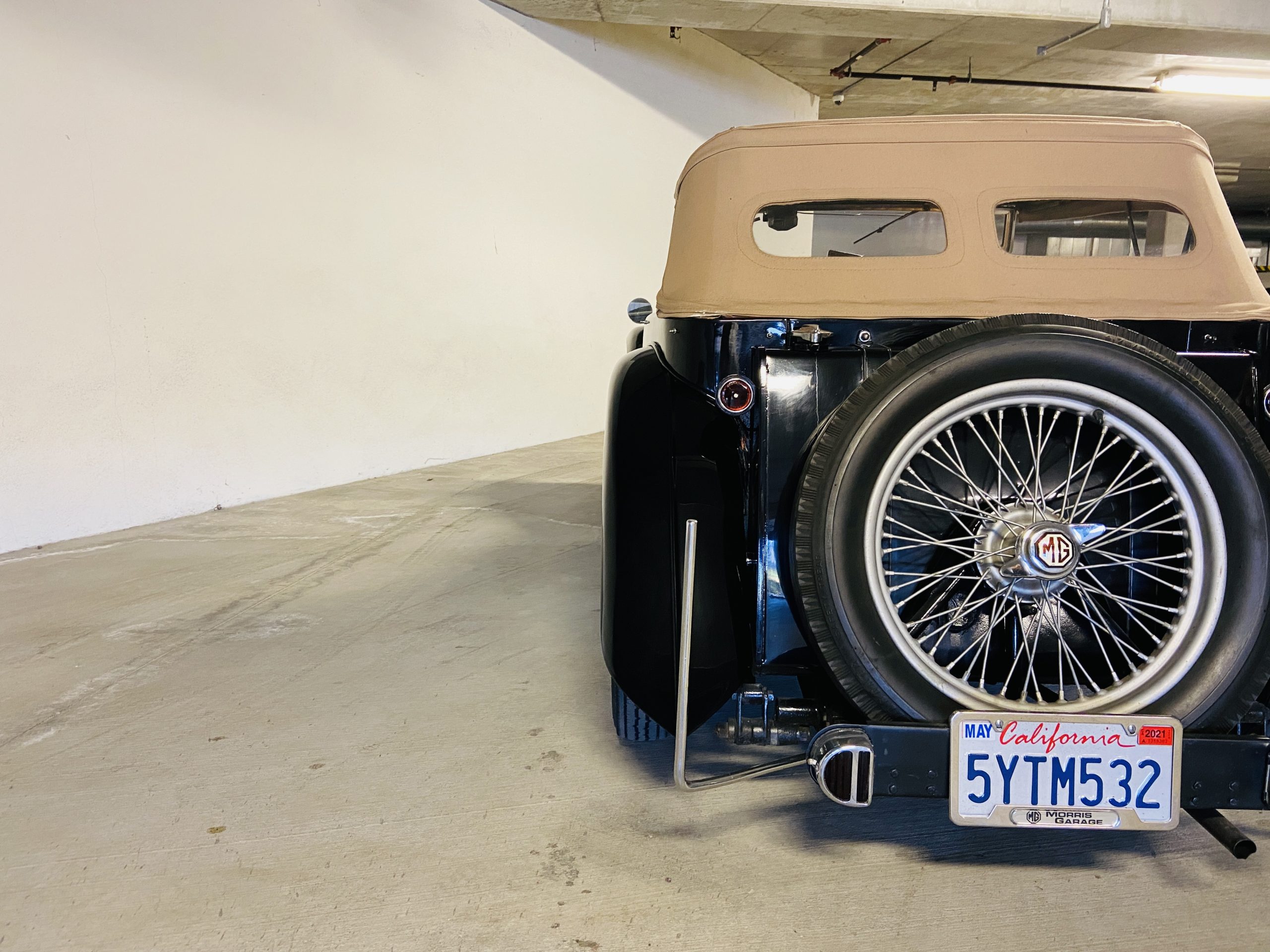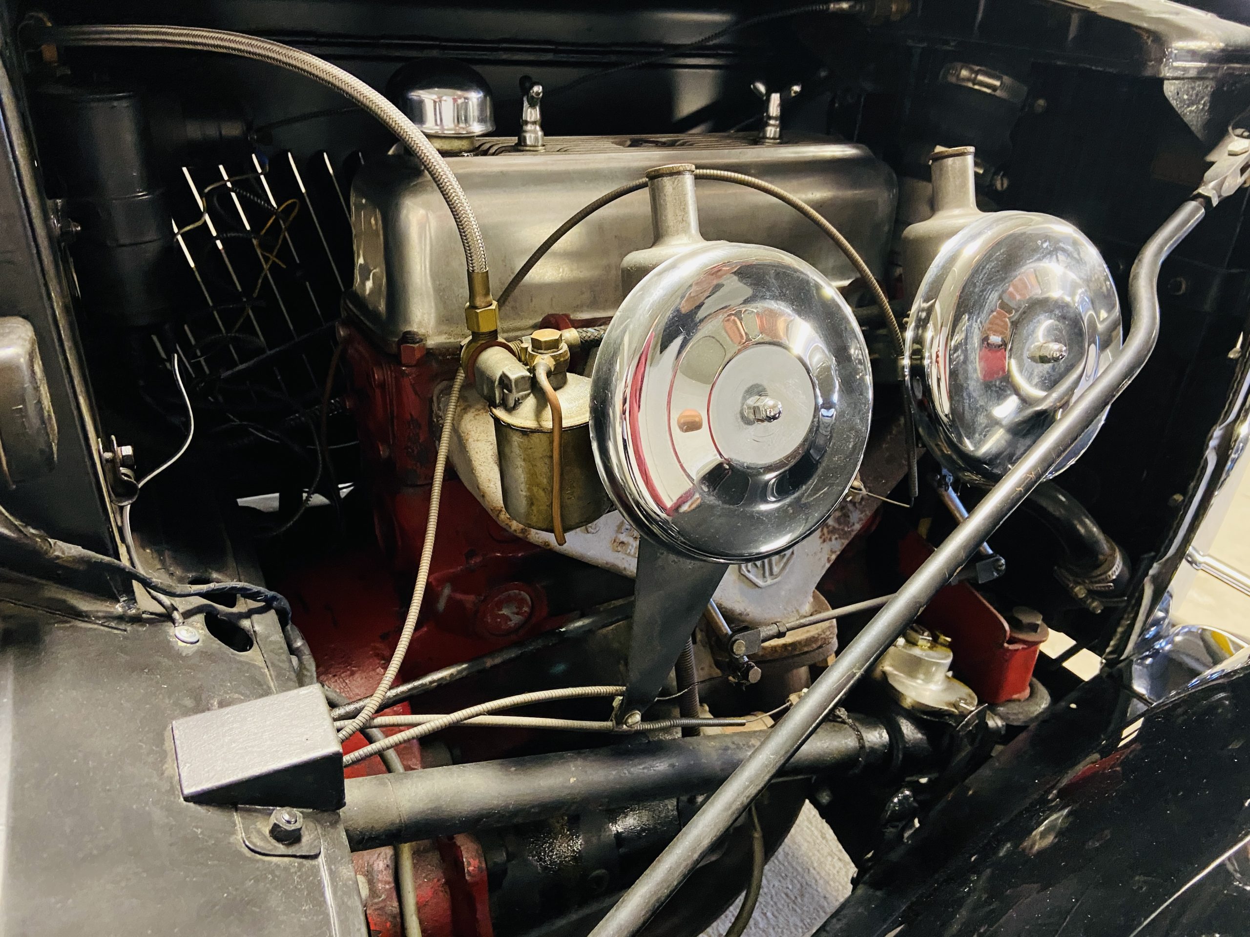 Its black livery is in nice overall driver-quality condition, having been repainted a few years ago. During the repaint the rubber seals and buffers were replaced as well. The tan Haartz cloth canvas top and tonneau cover were also replaced in the past couple years. The chrome and stainless are original and are in driver quality condition. One of the headlights would benefit from being re-chromed as the chrome is peeling. The wire wheels are correctly painted silver and in nice condition. We love the fold-down windshields featured on TCs. This TC does not have its side curtains.
