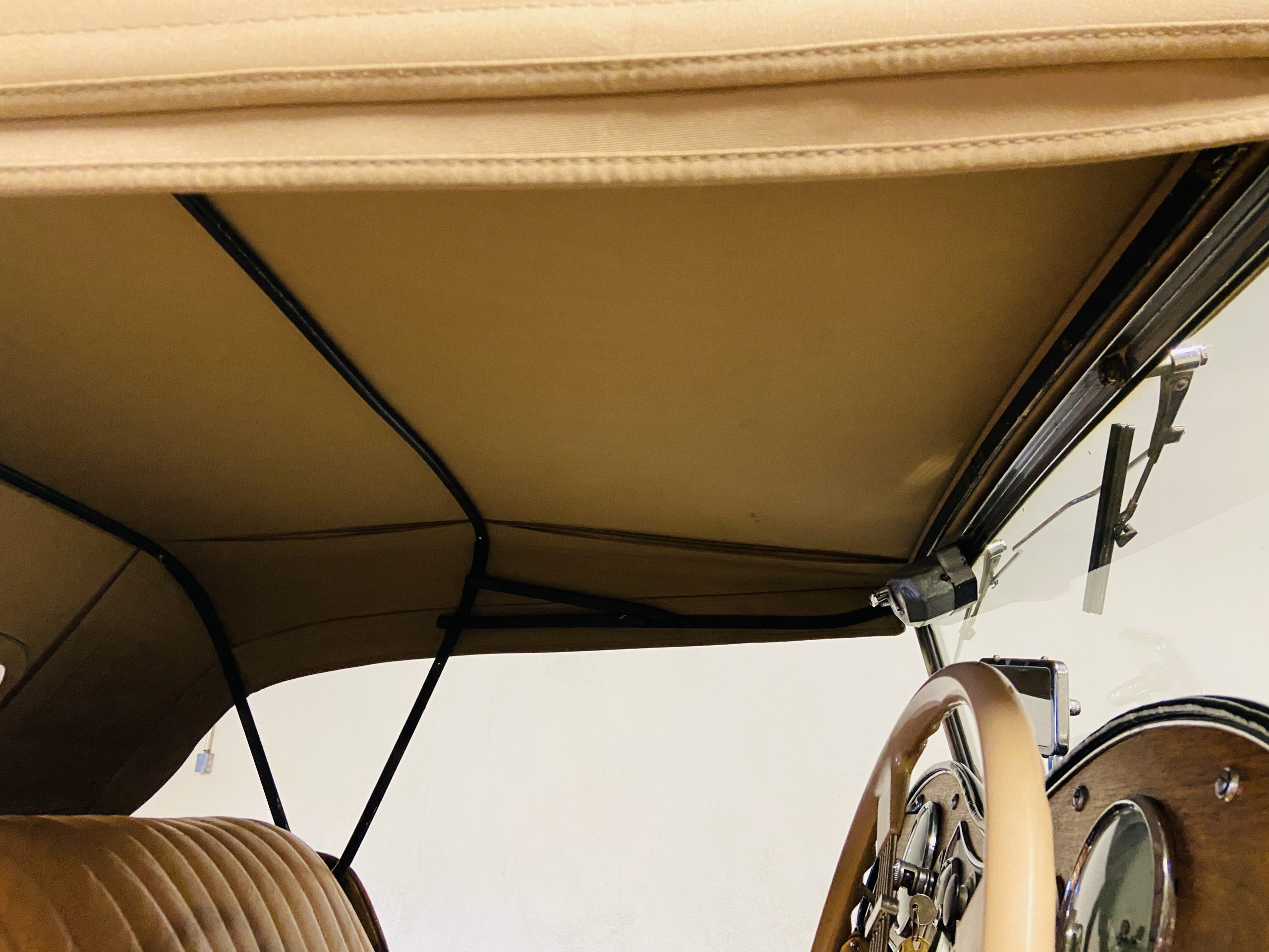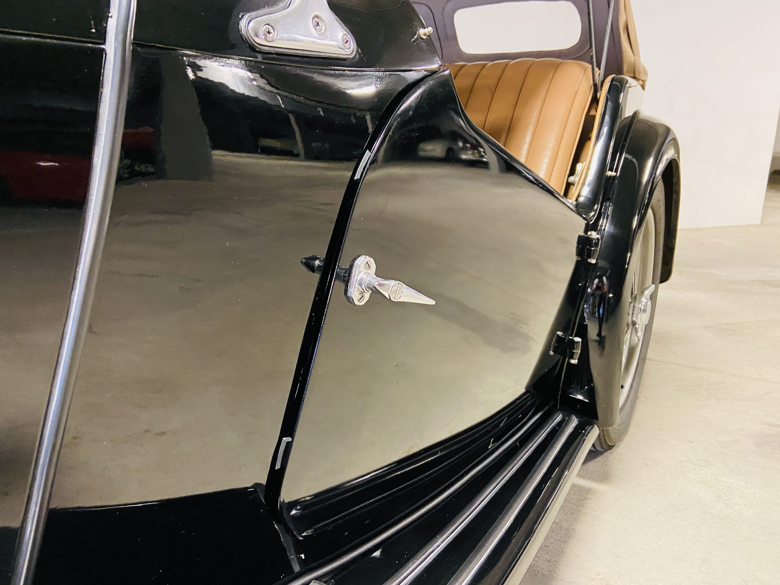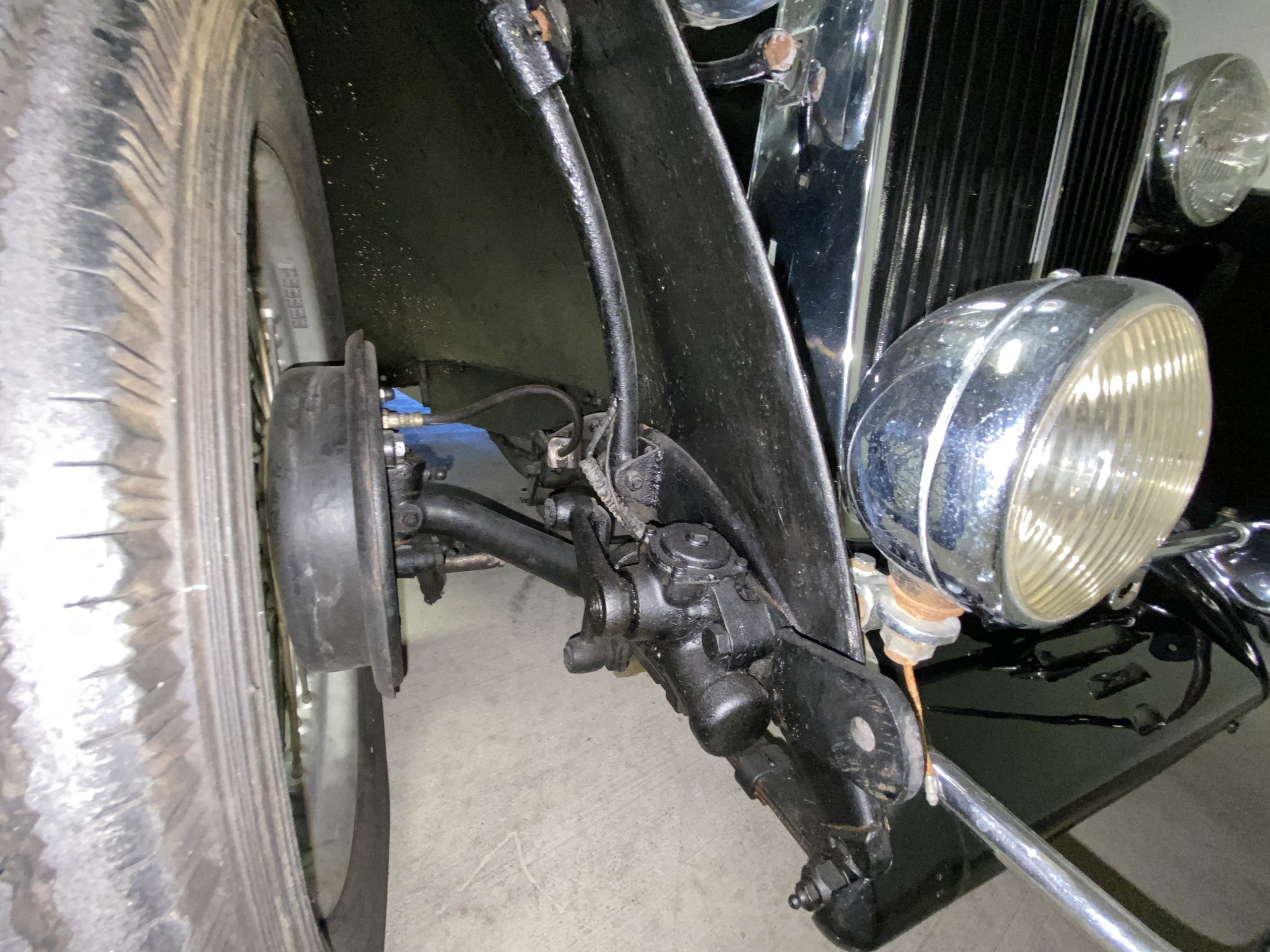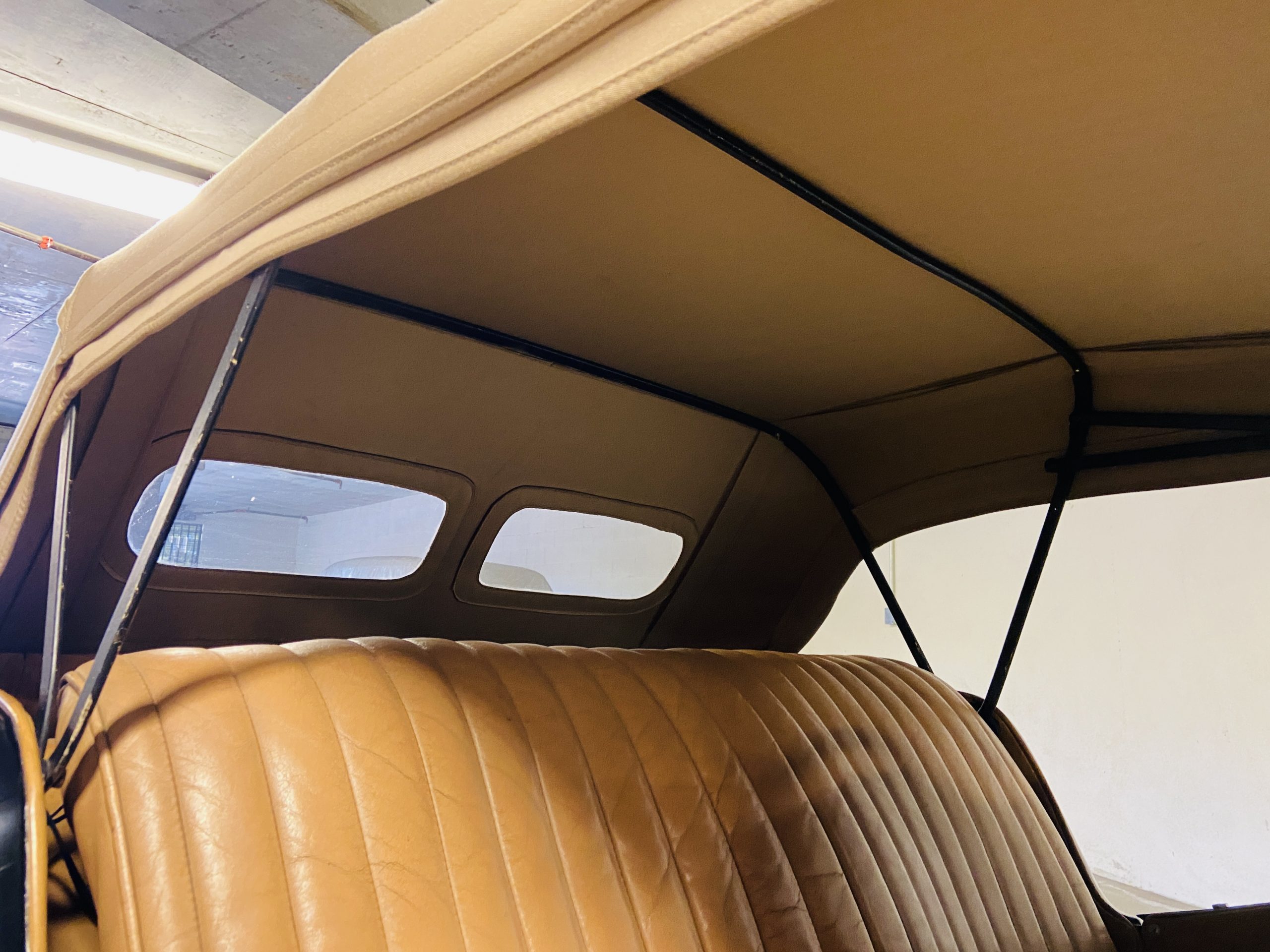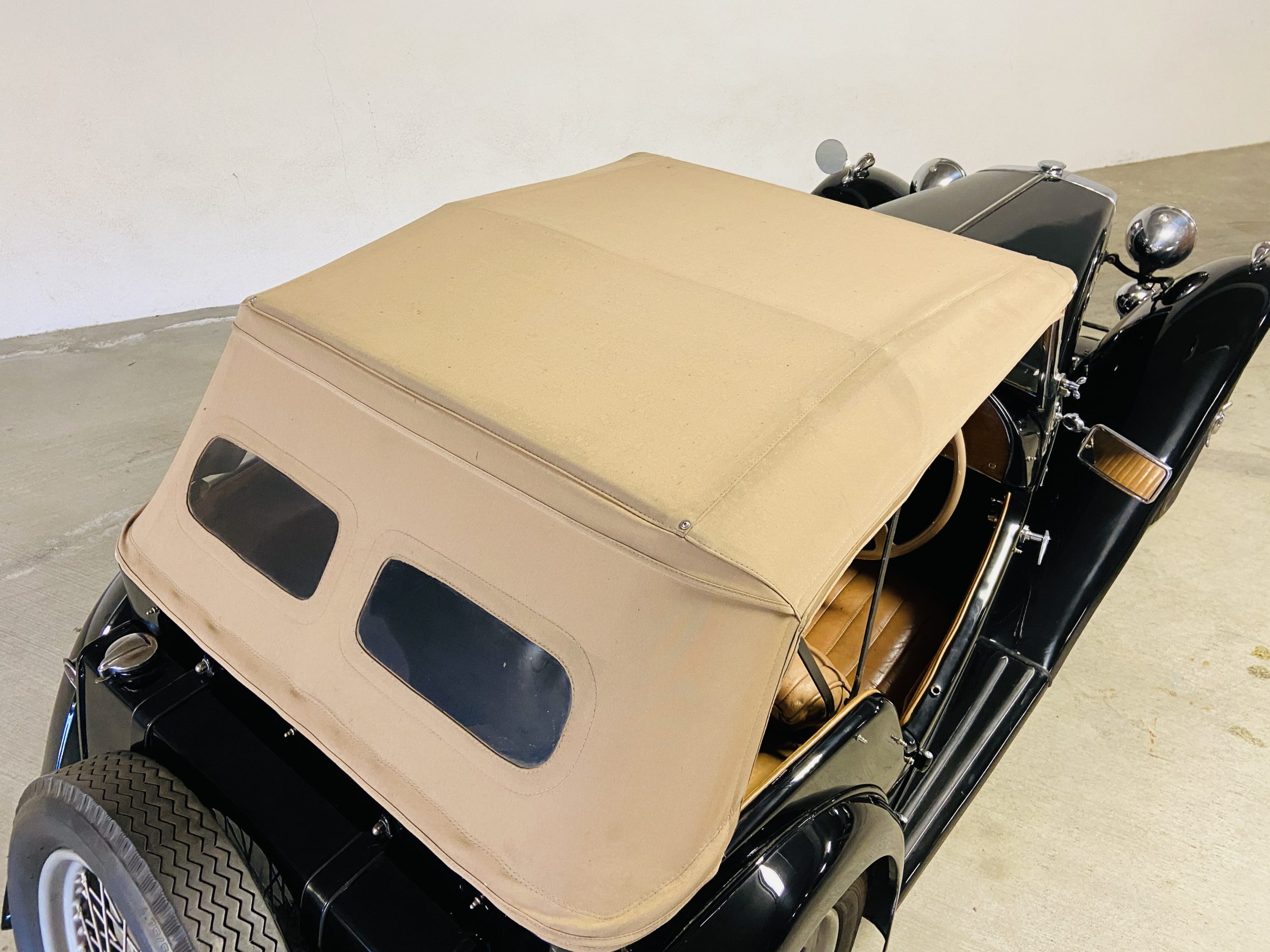 Its black livery is in nice overall driver-quality condition, having been repainted a few years ago. During the repaint the rubber seals and buffers were replaced as well. The tan Haartz cloth canvas top and tonneau cover were also replaced in the past couple years. The chrome and stainless are original and are in driver quality condition. One of the headlights would benefit from being re-chromed as the chrome is peeling. The wire wheels are correctly painted silver and in nice condition. We love the fold-down windshields featured on TCs. This TC does not have its side curtains.