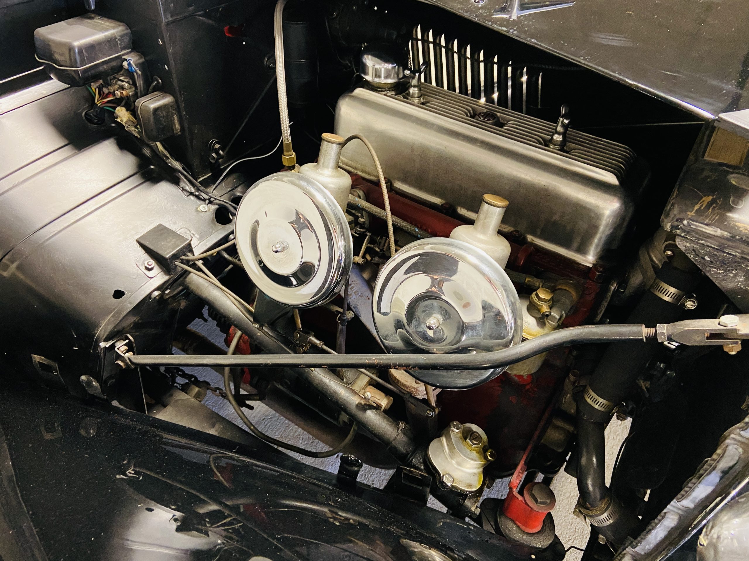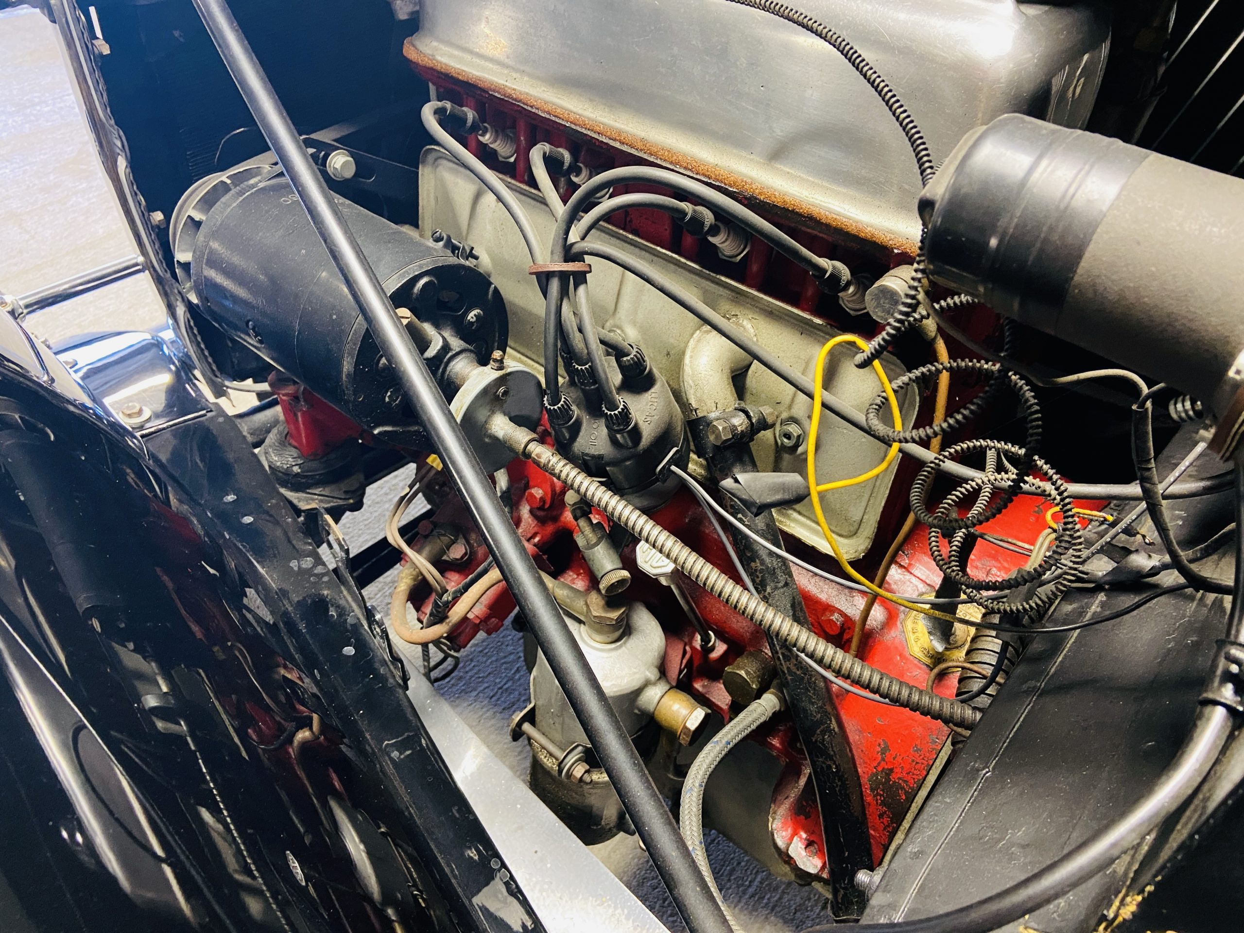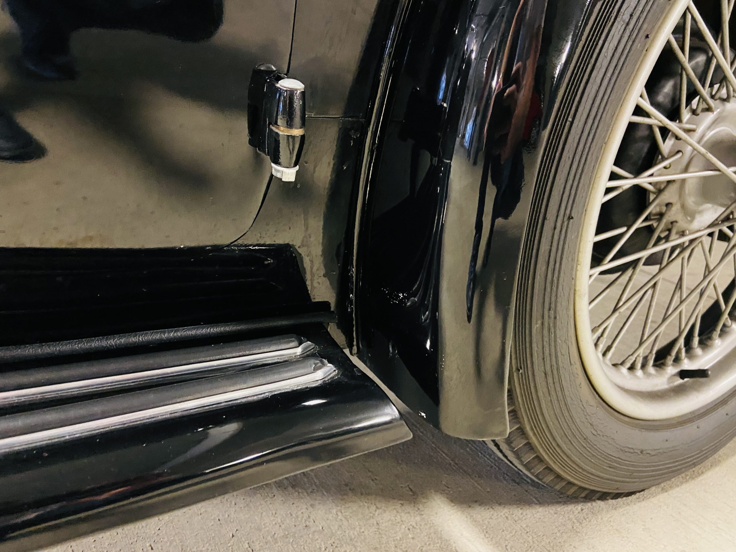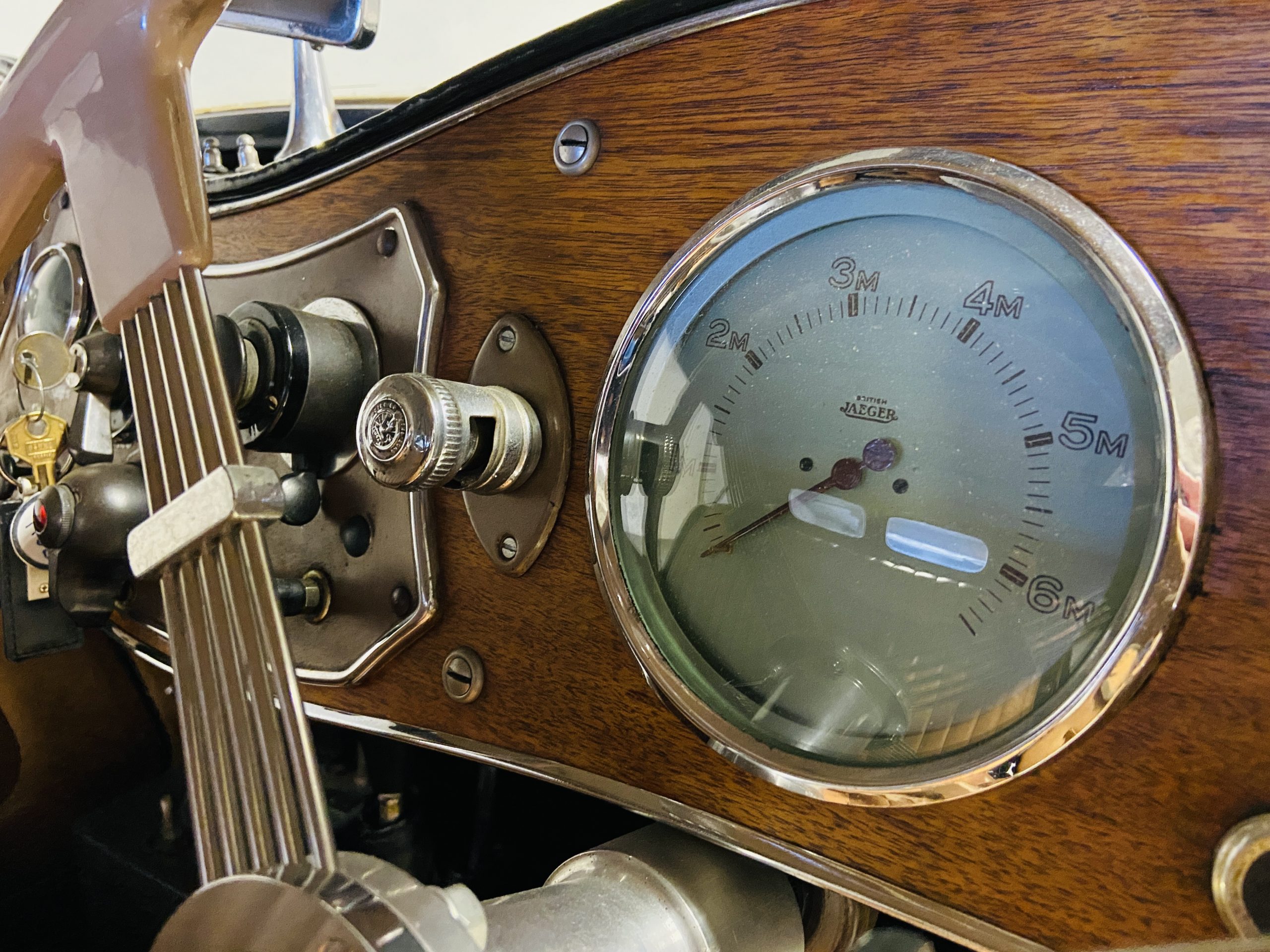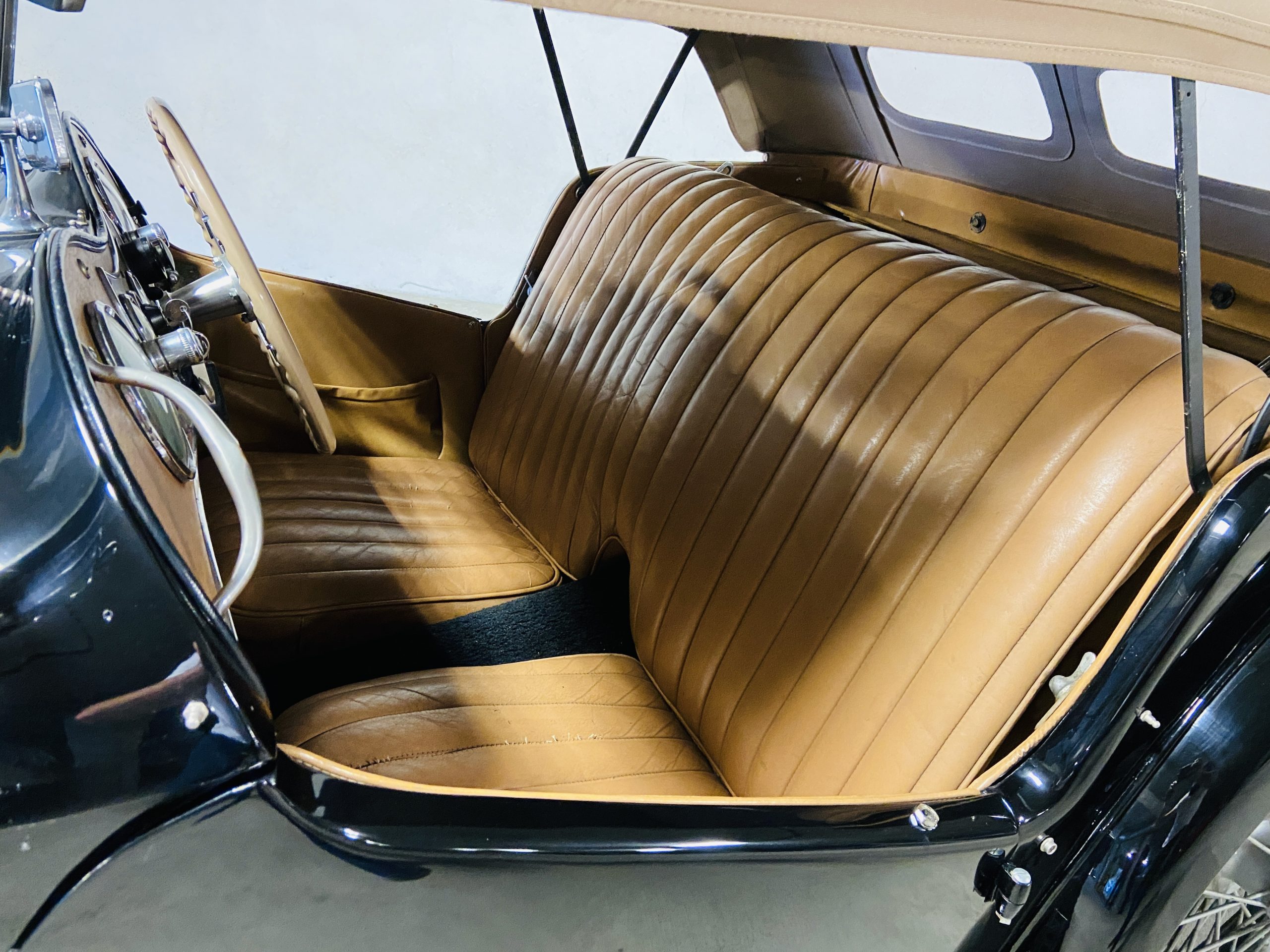 Its black livery is in nice overall driver-quality condition, having been repainted a few years ago. During the repaint the rubber seals and buffers were replaced as well. The tan Haartz cloth canvas top and tonneau cover were also replaced in the past couple years. The chrome and stainless are original and are in driver quality condition. One of the headlights would benefit from being re-chromed as the chrome is peeling. The wire wheels are correctly painted silver and in nice condition. We love the fold-down windshields featured on TCs. This TC does not have its side curtains.