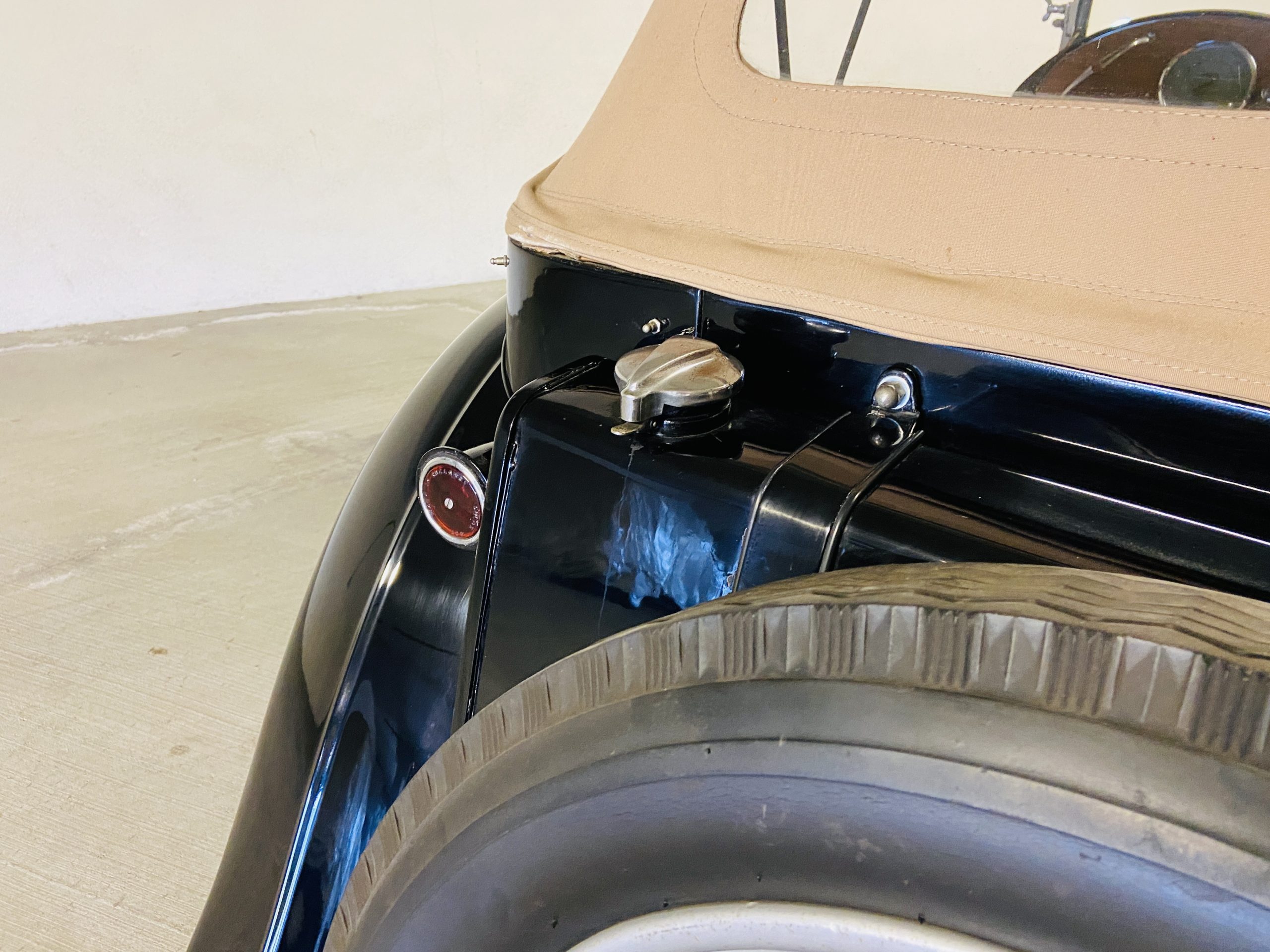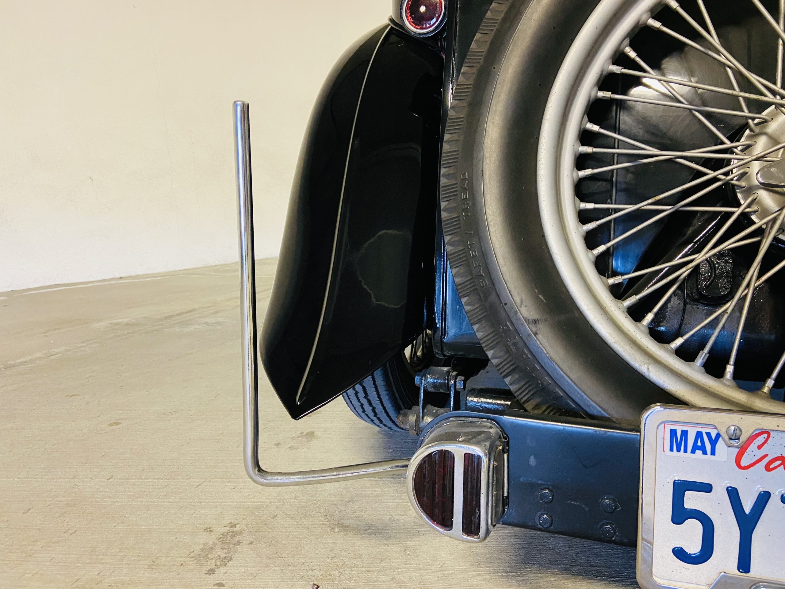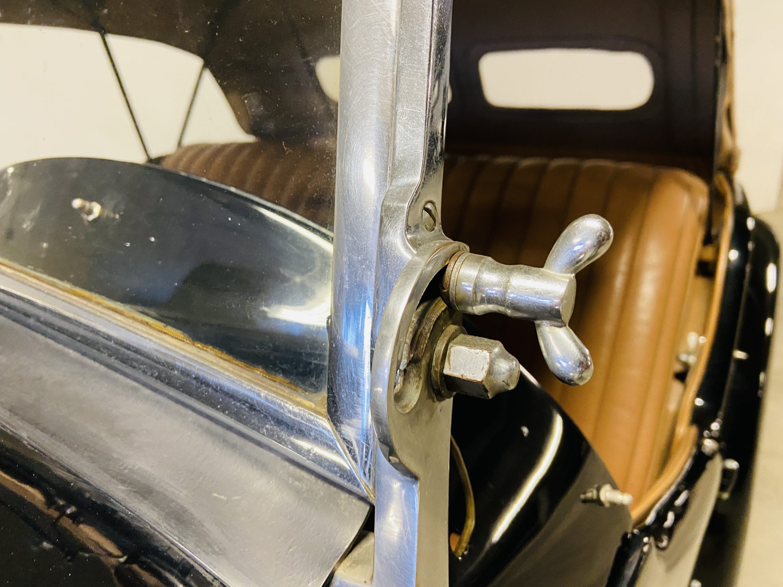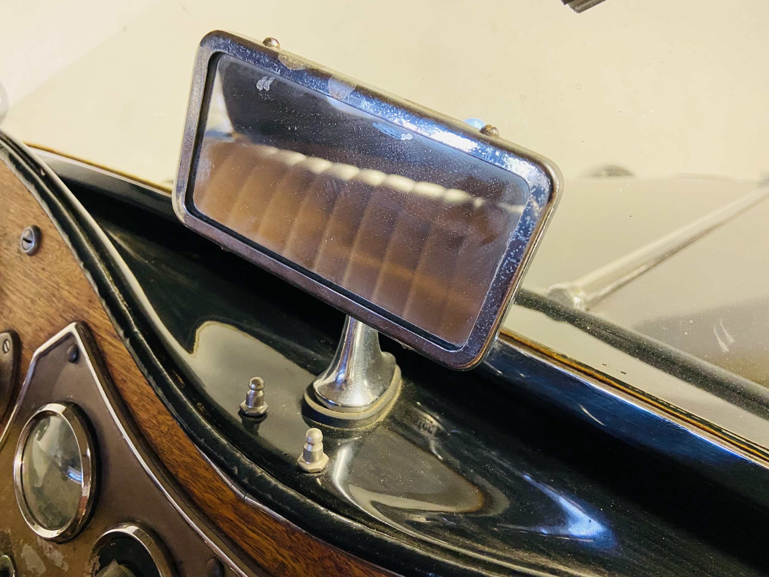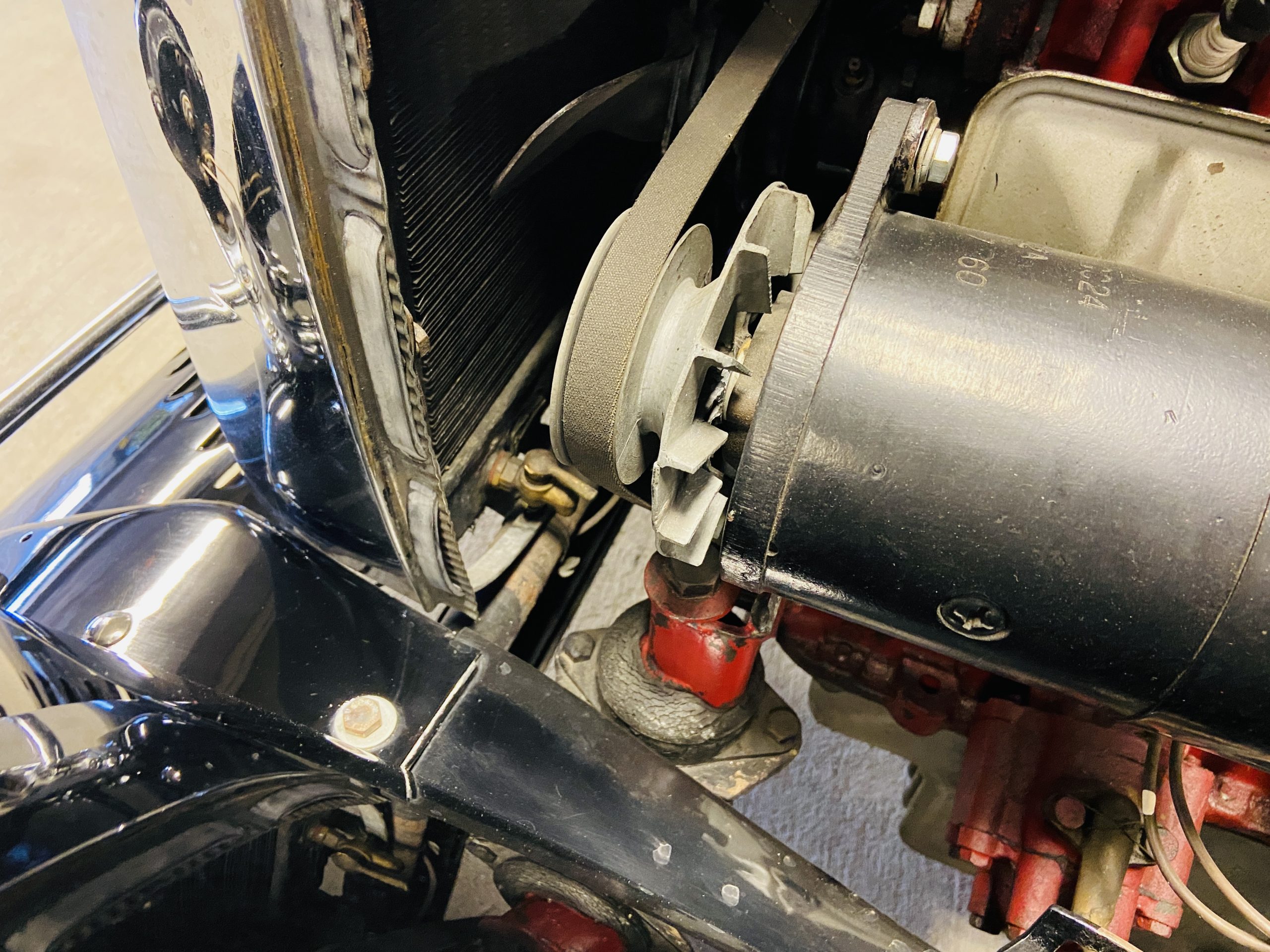 Its black livery is in nice overall driver-quality condition, having been repainted a few years ago. During the repaint the rubber seals and buffers were replaced as well. The tan Haartz cloth canvas top and tonneau cover were also replaced in the past couple years. The chrome and stainless are original and are in driver quality condition. One of the headlights would benefit from being re-chromed as the chrome is peeling. The wire wheels are correctly painted silver and in nice condition. We love the fold-down windshields featured on TCs. This TC does not have its side curtains.