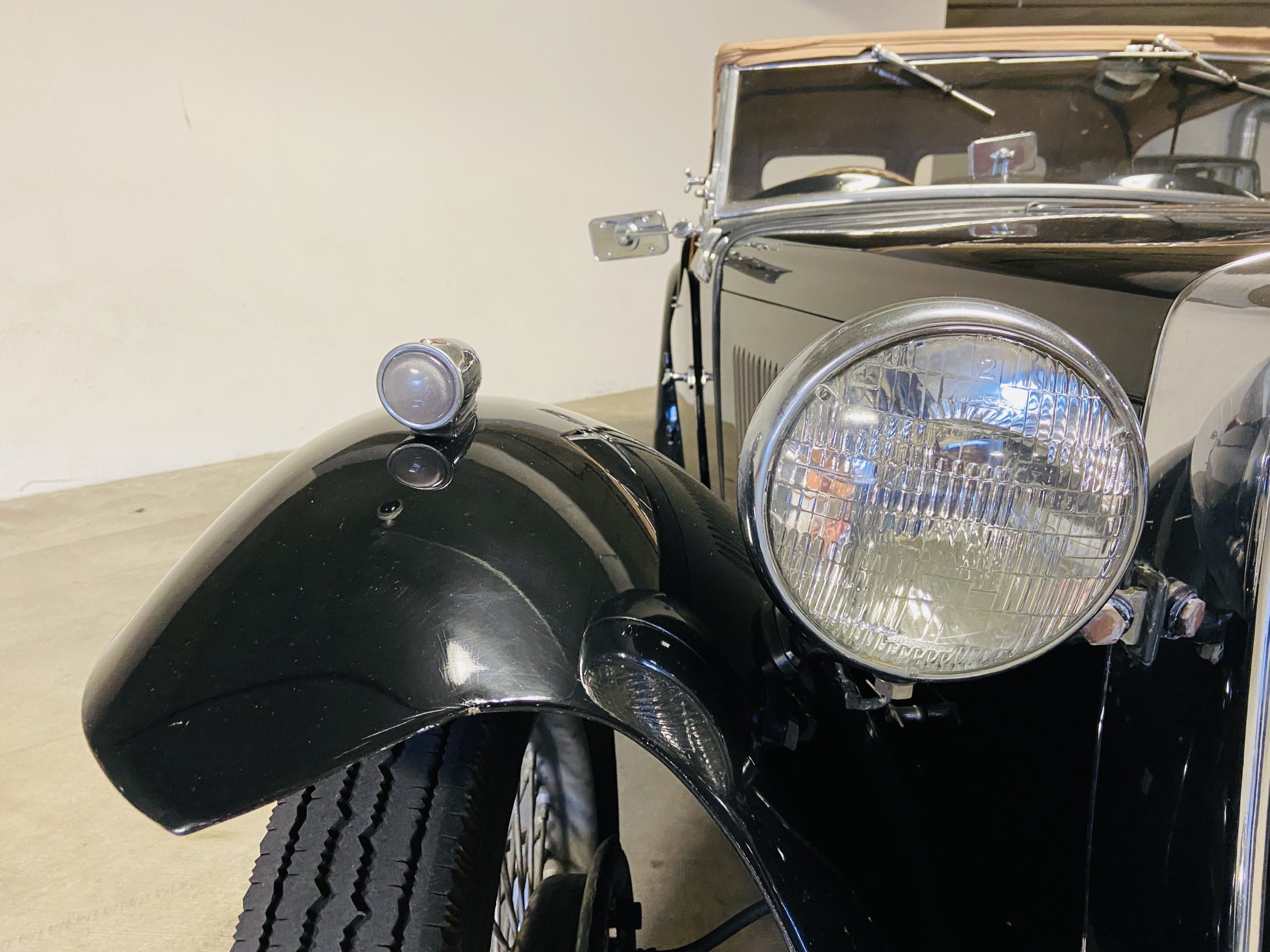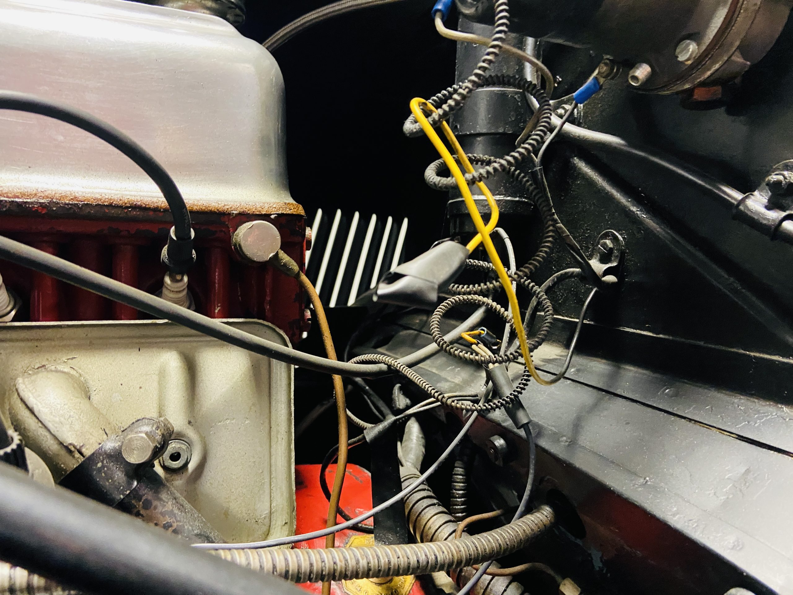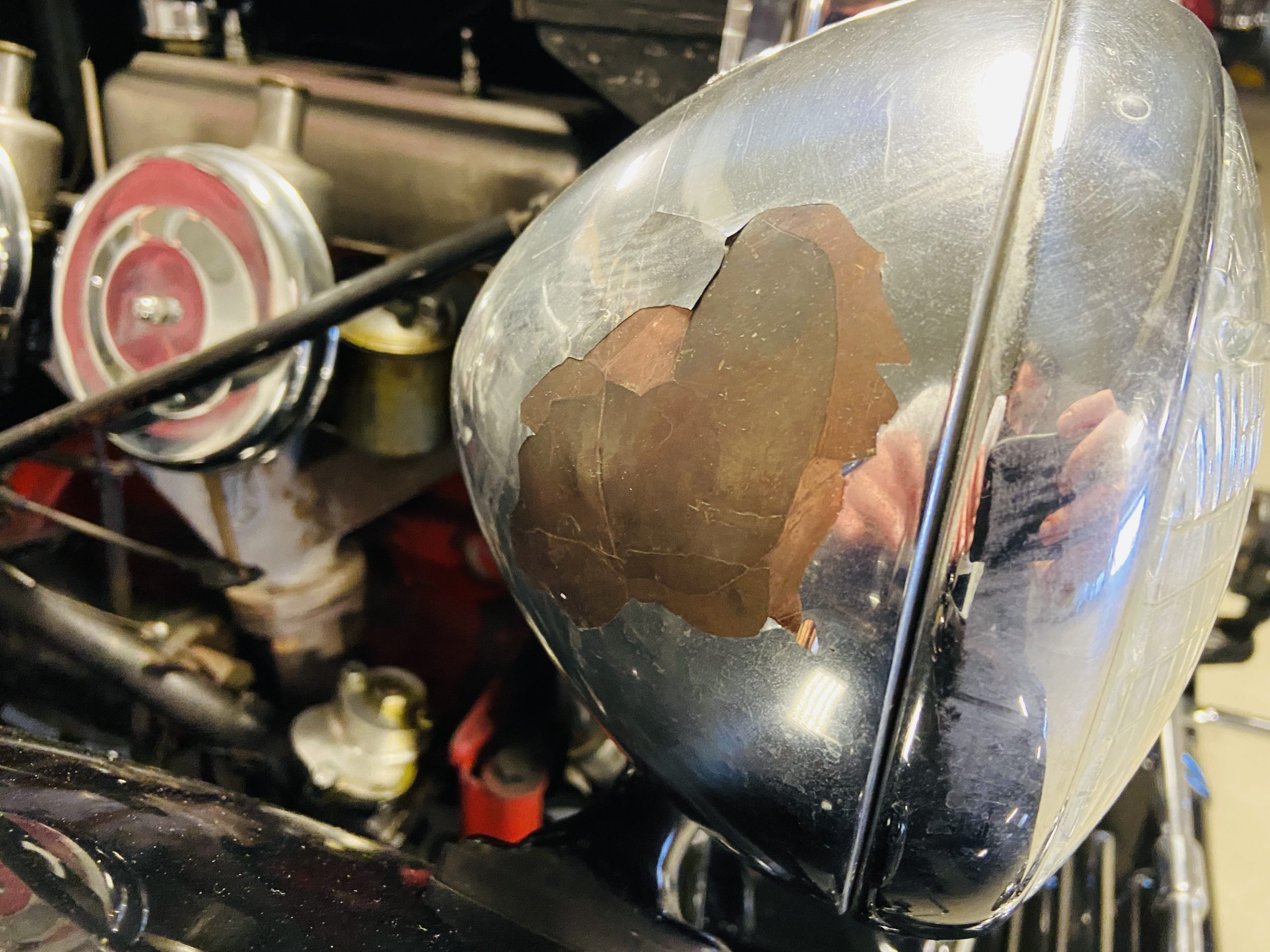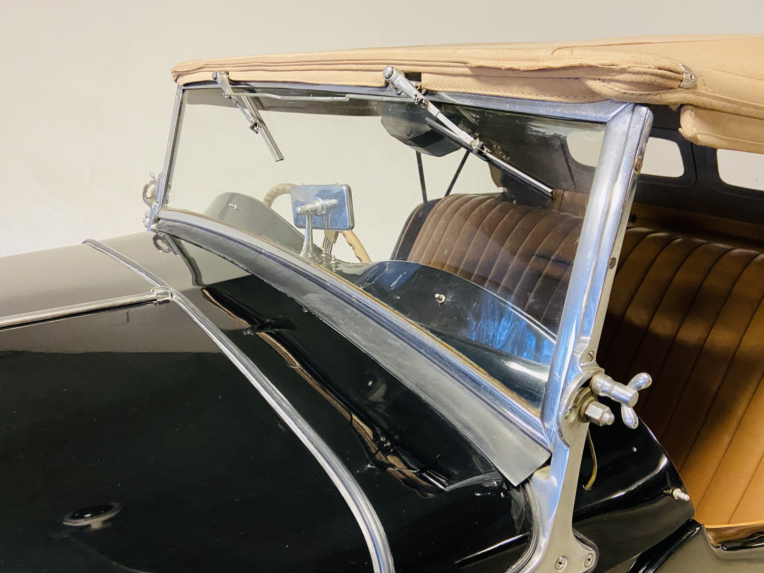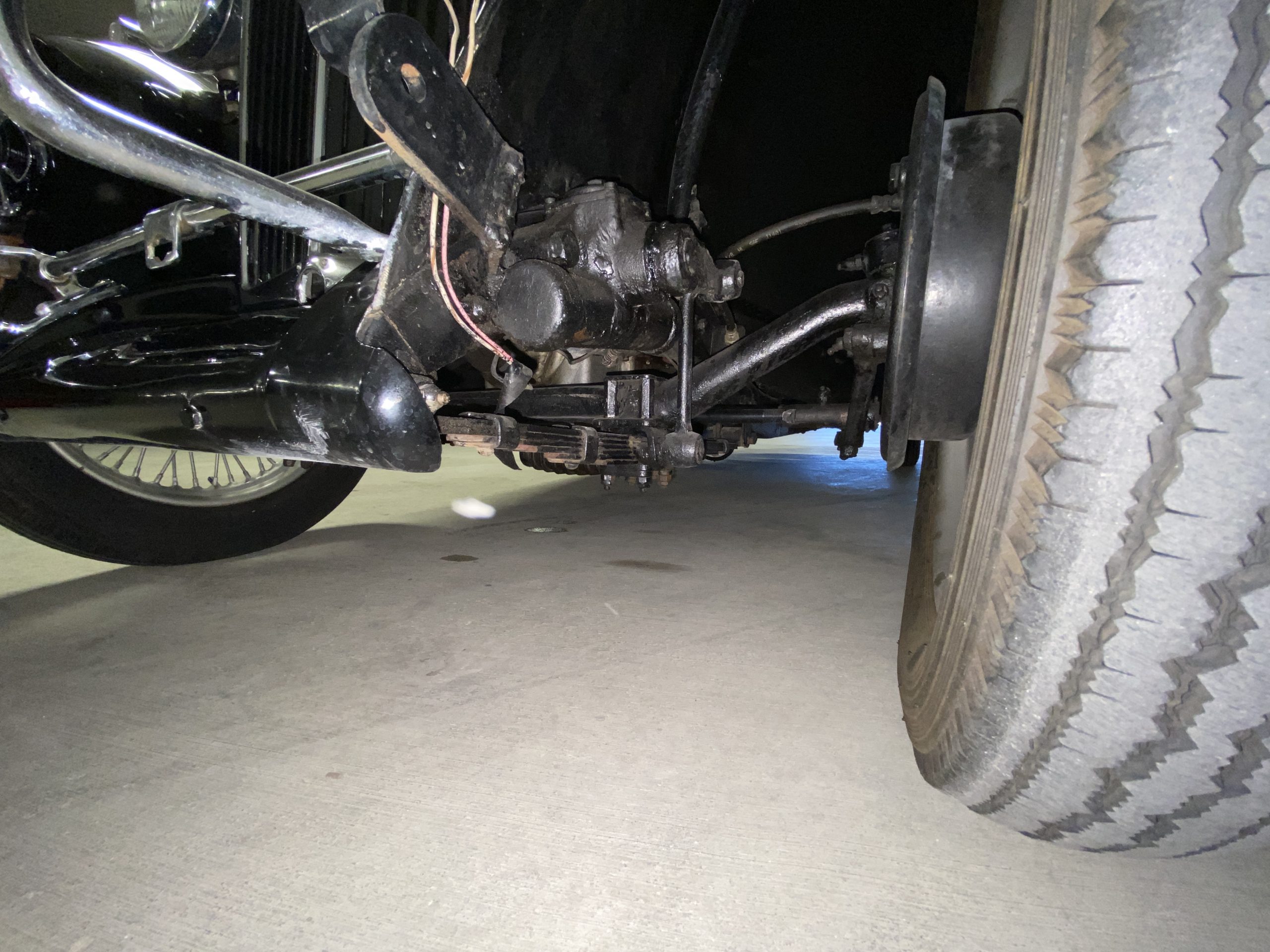 Its black livery is in nice overall driver-quality condition, having been repainted a few years ago. During the repaint the rubber seals and buffers were replaced as well. The tan Haartz cloth canvas top and tonneau cover were also replaced in the past couple years. The chrome and stainless are original and are in driver quality condition. One of the headlights would benefit from being re-chromed as the chrome is peeling. The wire wheels are correctly painted silver and in nice condition. We love the fold-down windshields featured on TCs. This TC does not have its side curtains.