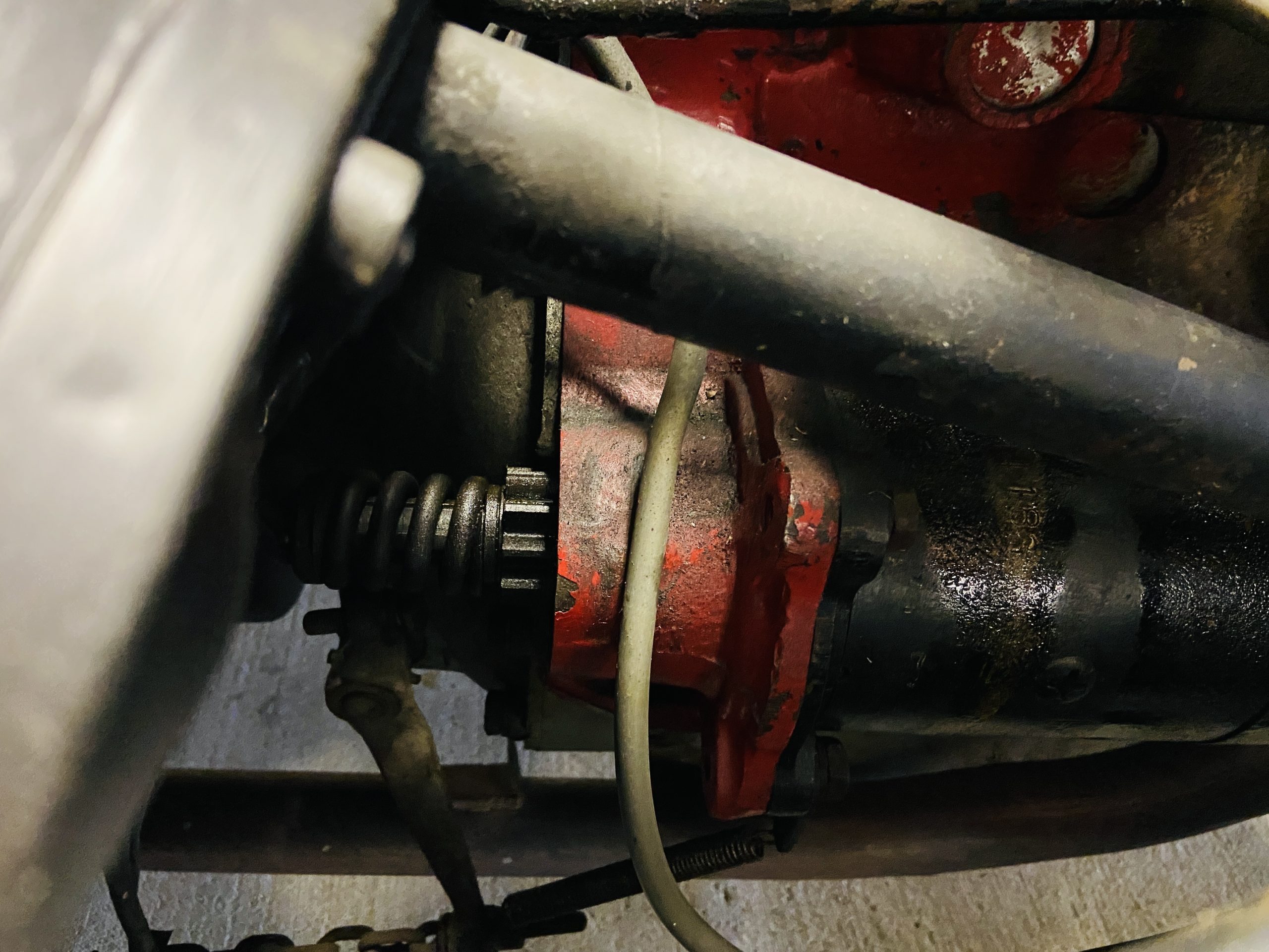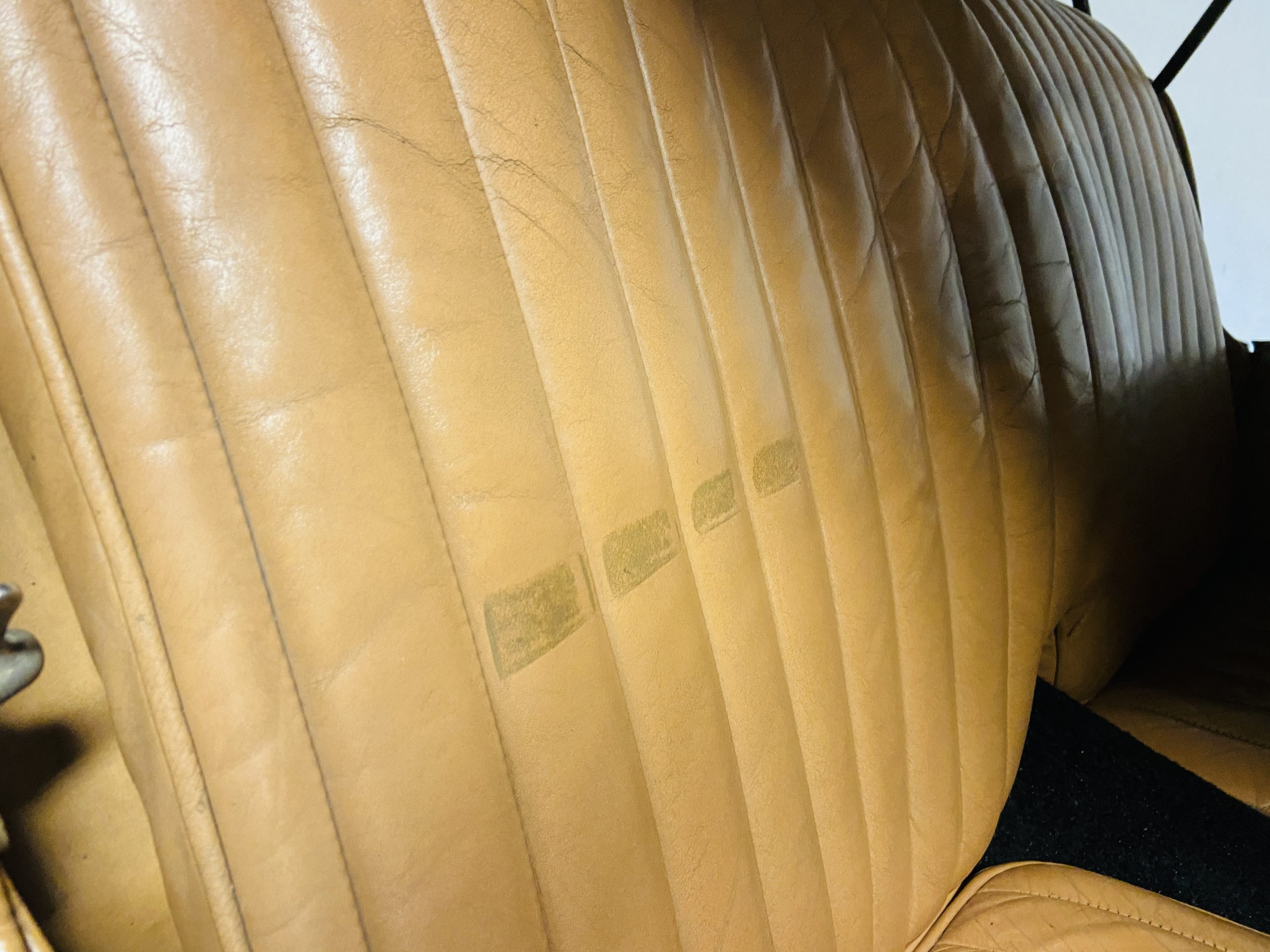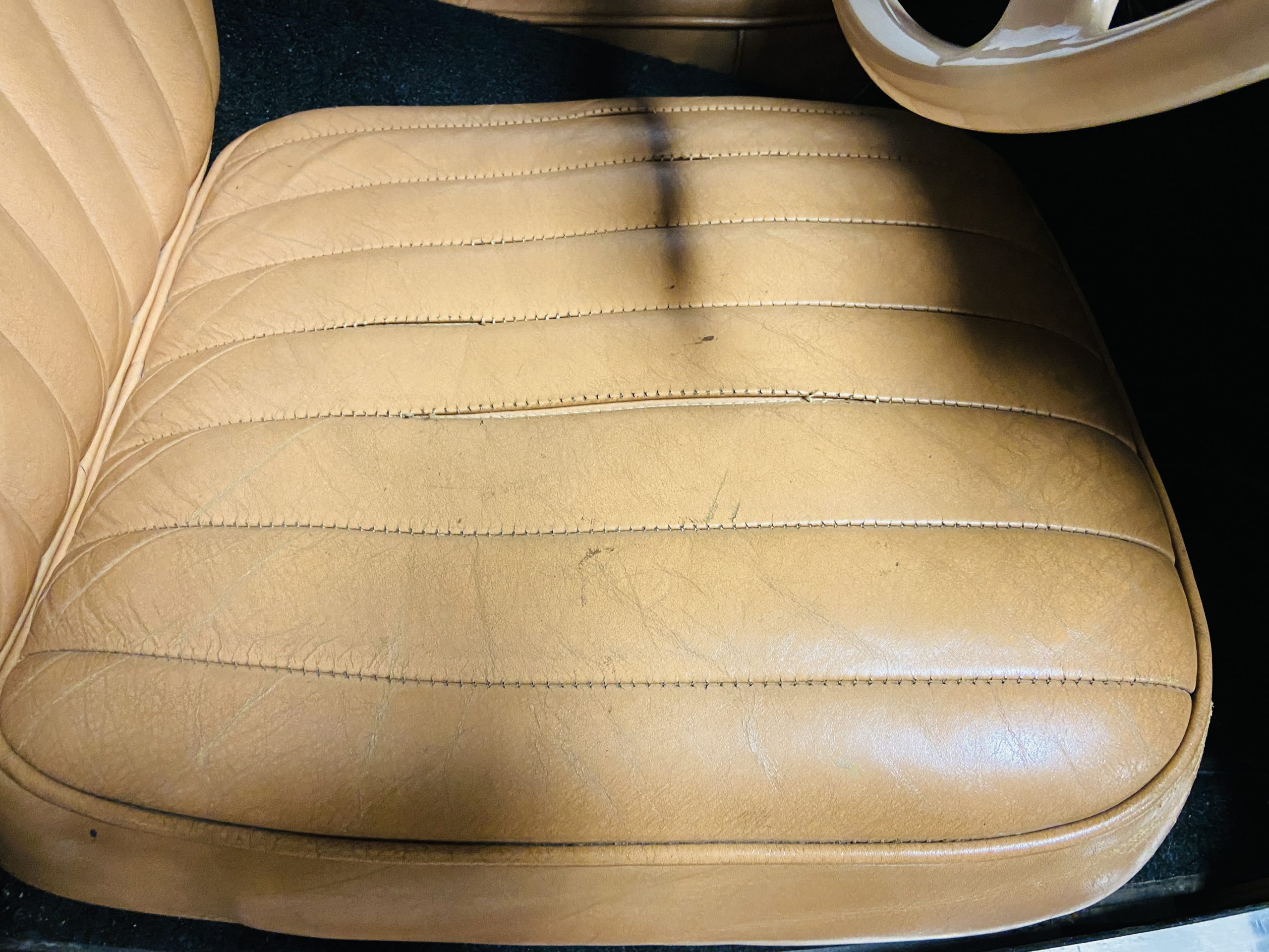 The tan leather interior is either original or was redone decades ago. It is soft and supple but a couple seams have come undone and would need to be repaired. One feature of the EXU TCs is that the turn signals were prominently located.