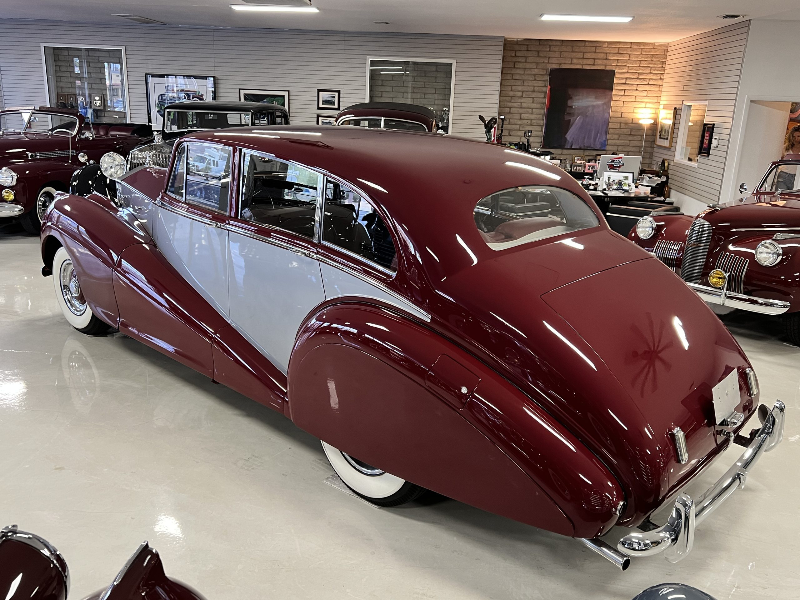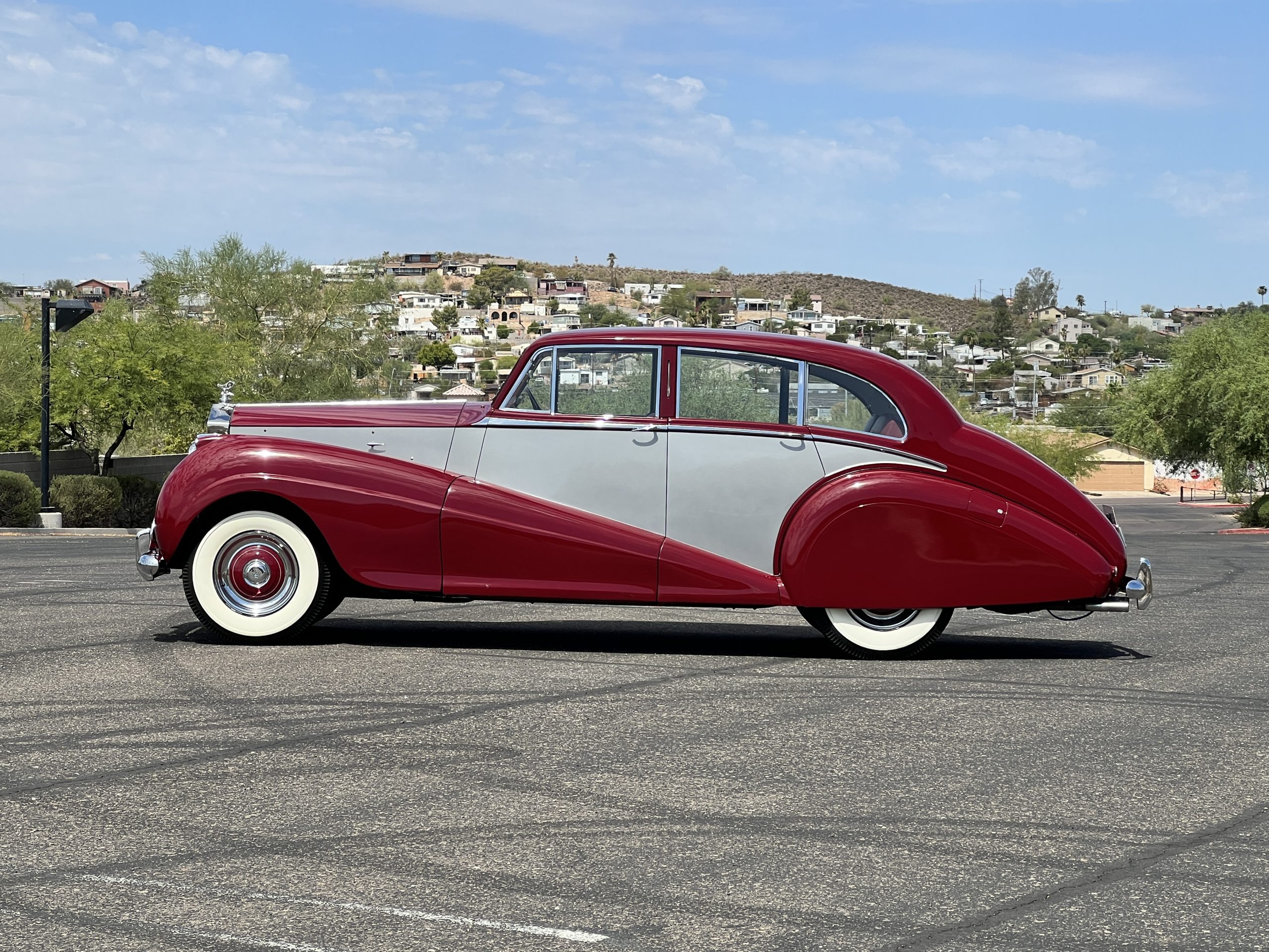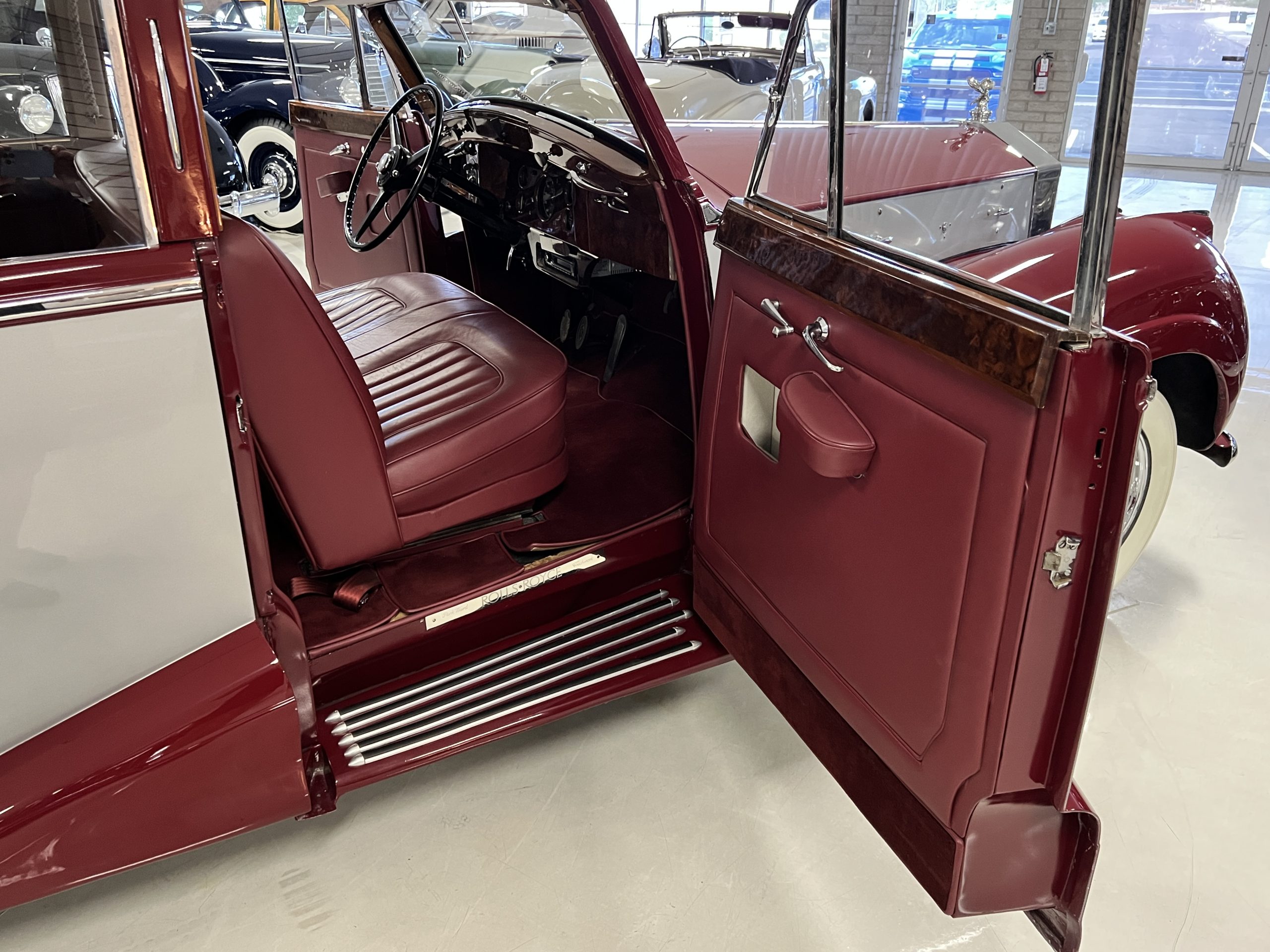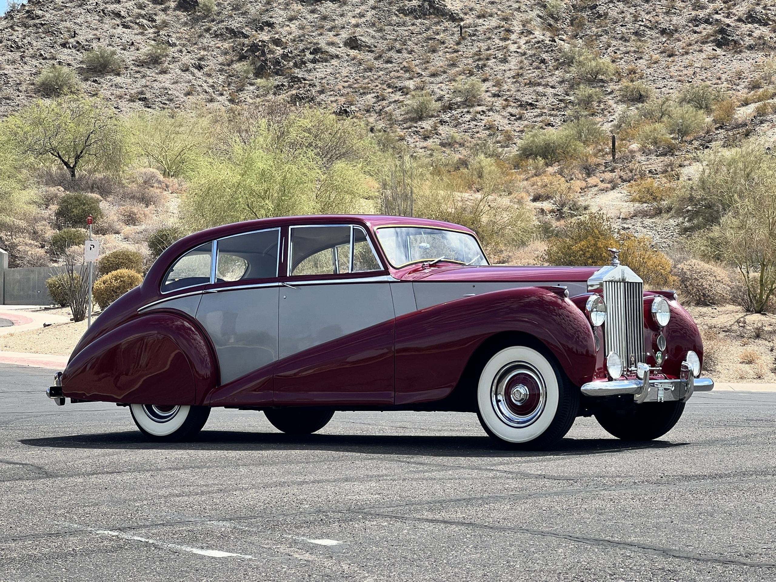 The livery is stunning in Bordeaux and Georgian Silver two-tone, which complement its sweeping lines. The paint is in concours condition today with only a few small touched up areas that are not visible without close scrutiny. The panels are beautifully smooth, and the paint has a glass finish that is ready for show. The chrome and stainless steel are in very good to excellent condition throughout. The iconic Rolls-Royce radiator shell was professionally polished and looks great today. The wide white walled tires look perfect for a LHD Rolls in the US. We love the curvaceous style!