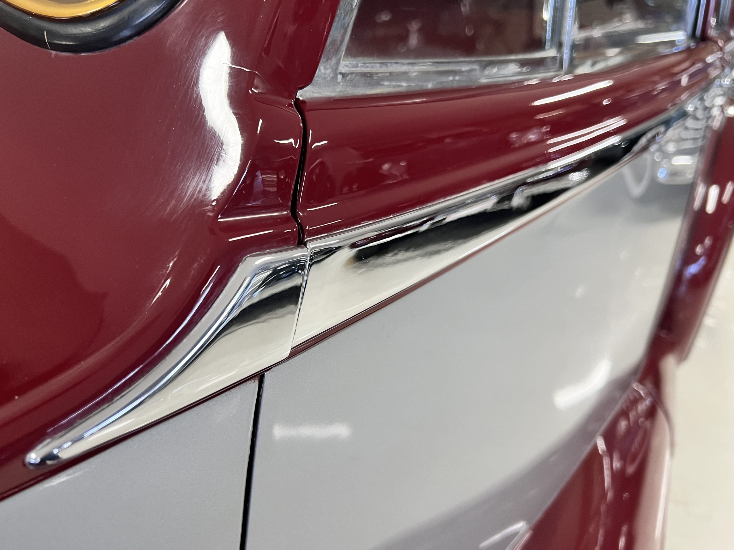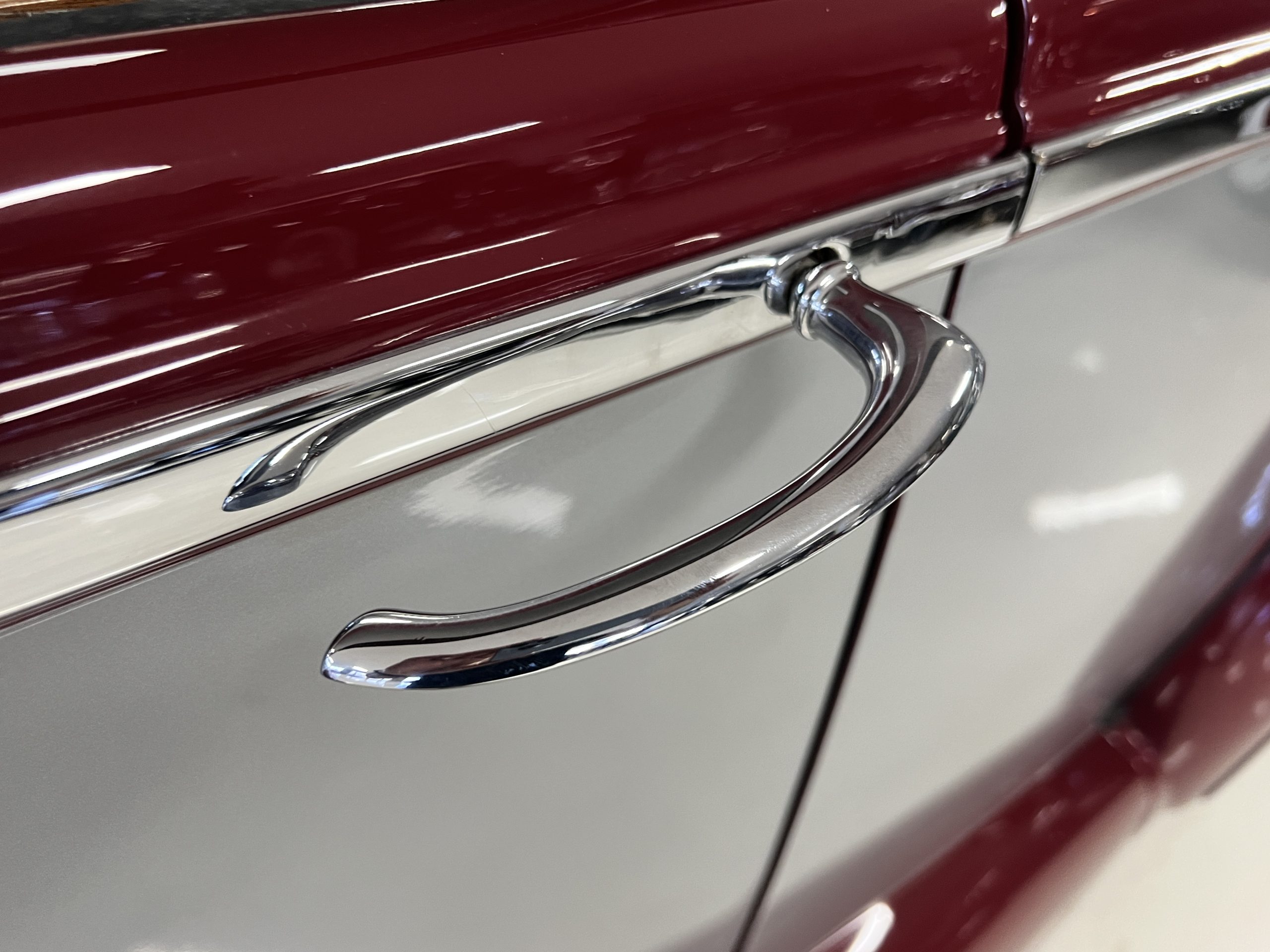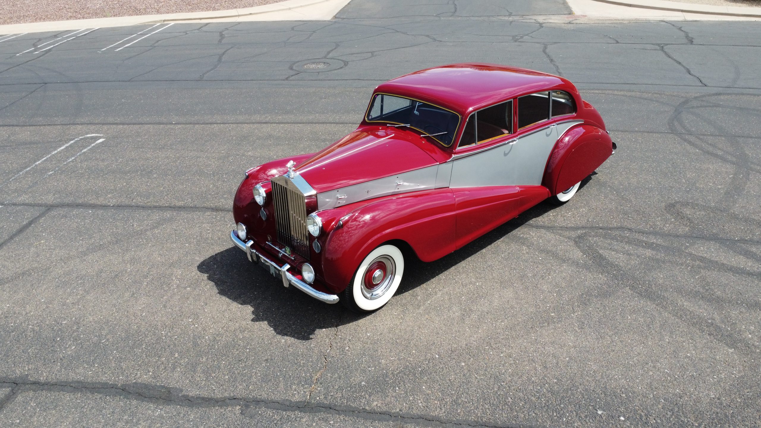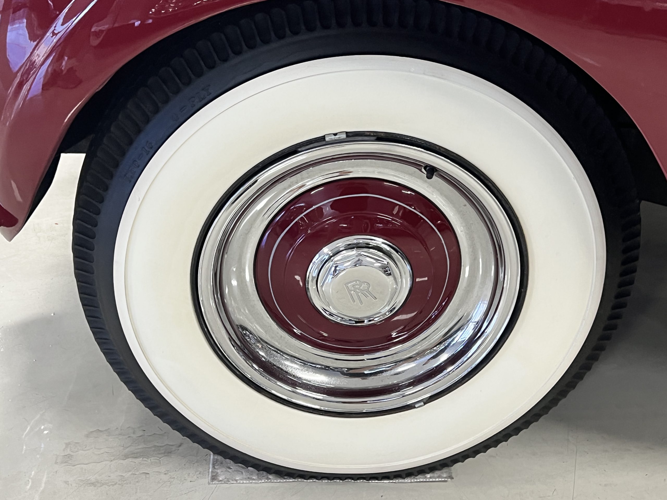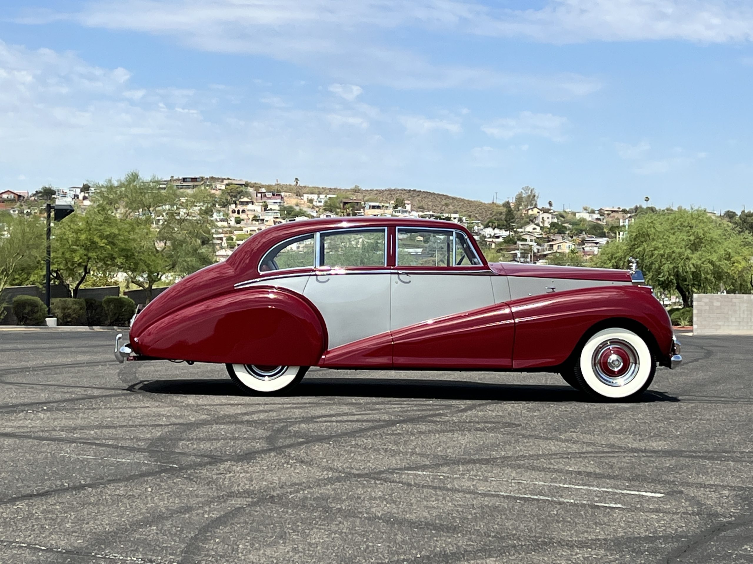 The livery is stunning in Bordeaux and Georgian Silver two-tone, which complement its sweeping lines. The paint is in concours condition today with only a few small touched up areas that are not visible without close scrutiny. The panels are beautifully smooth, and the paint has a glass finish that is ready for show. The chrome and stainless steel are in very good to excellent condition throughout. The iconic Rolls-Royce radiator shell was professionally polished and looks great today. The wide white walled tires look perfect for a LHD Rolls in the US. We love the curvaceous style!
