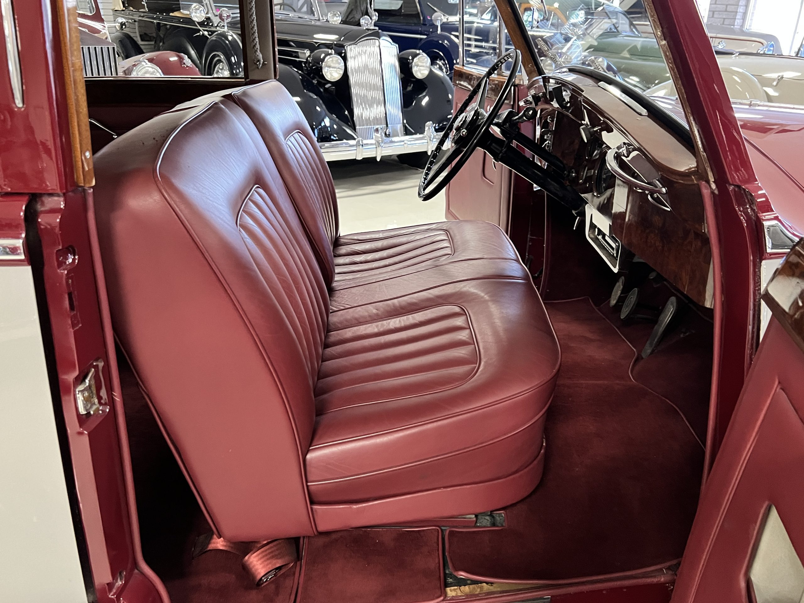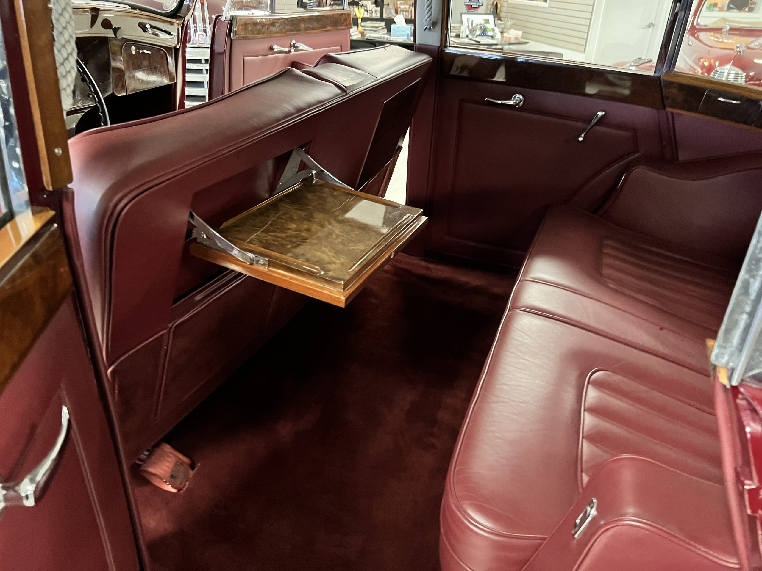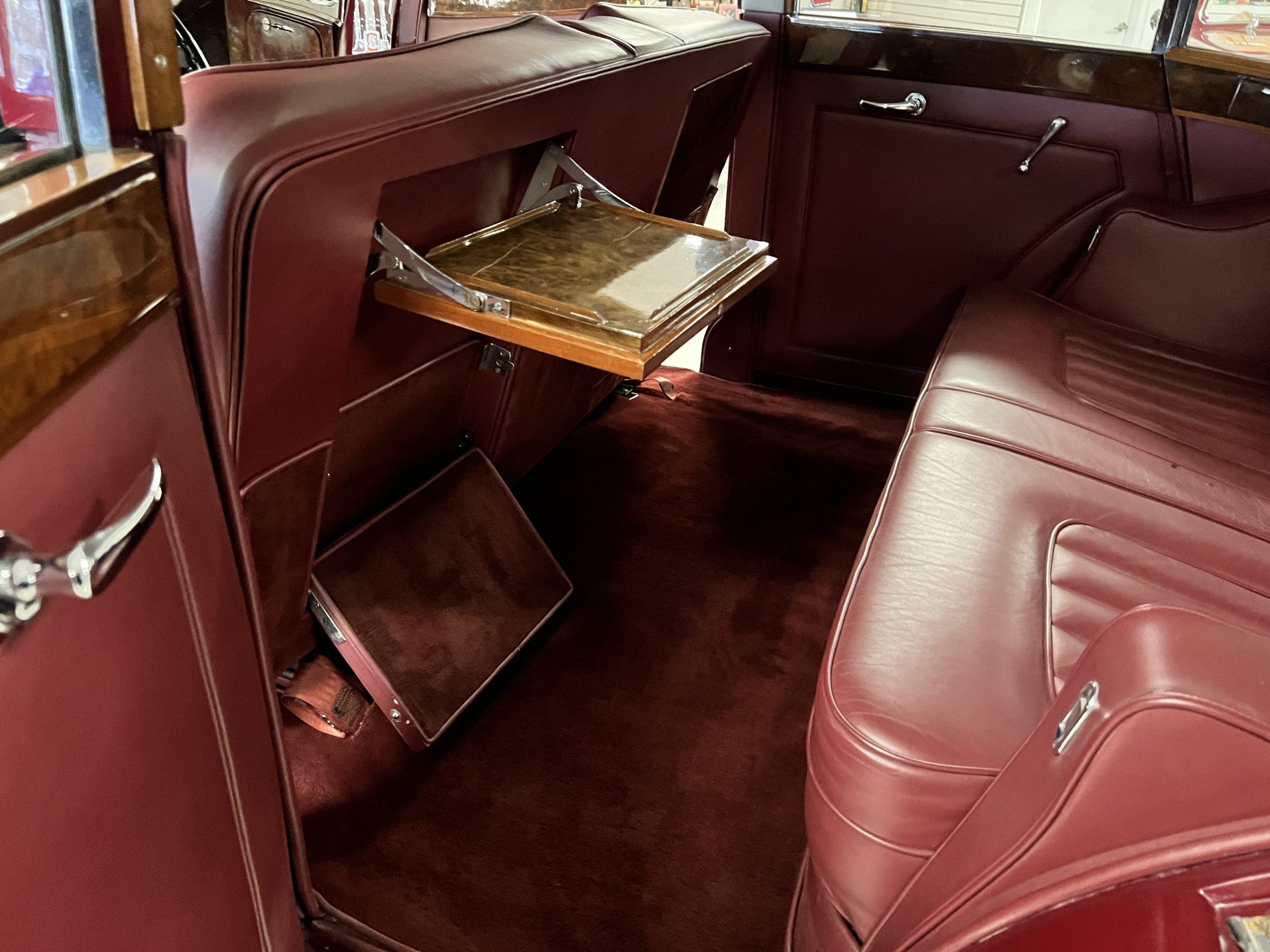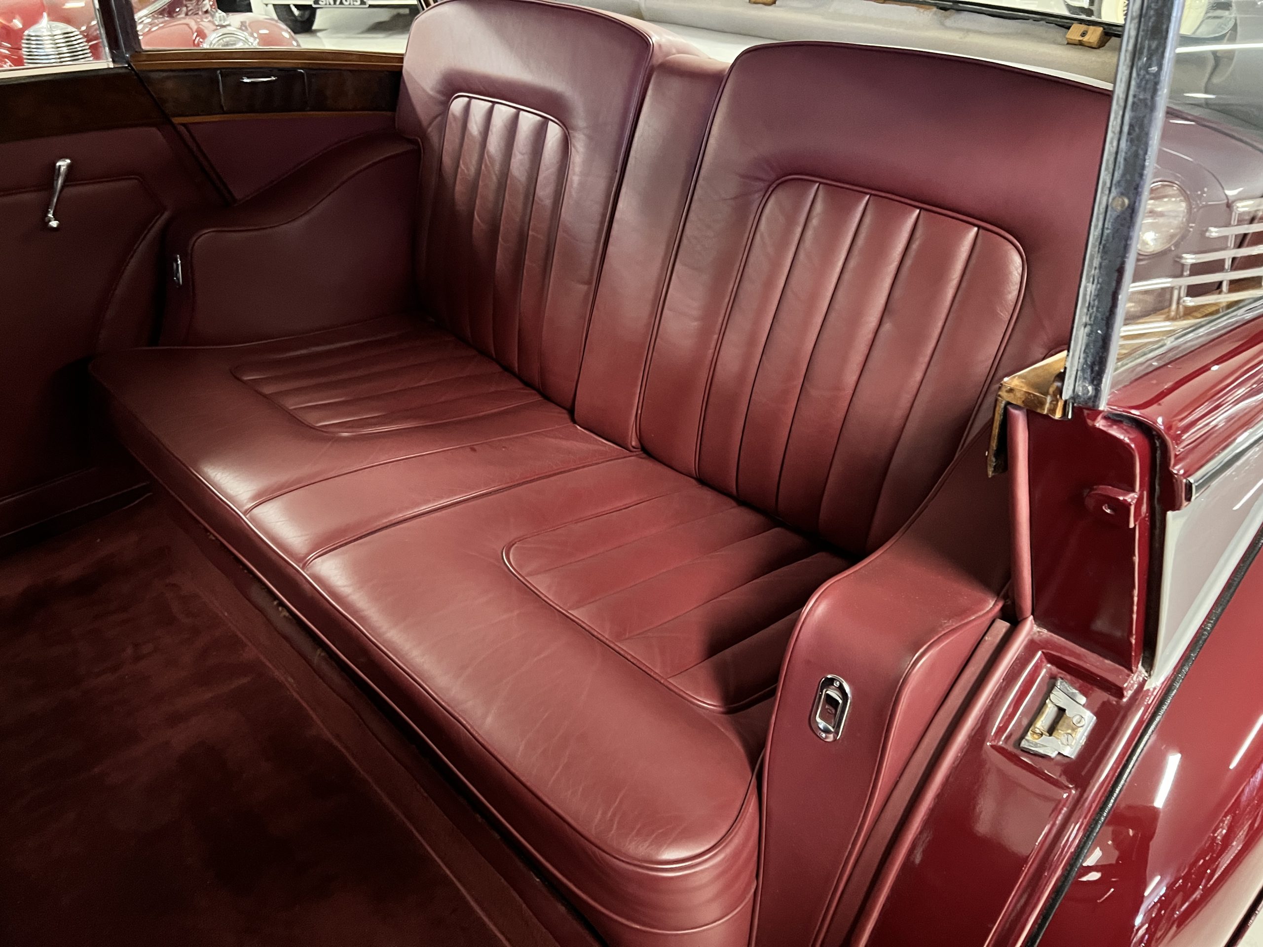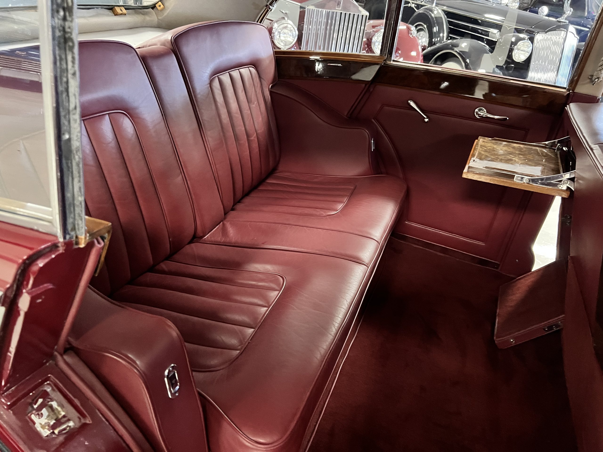 The interior is a matching Burgundy leather and Wilton wool that looks perfect with the paint colors. The gray wool broadcloth headliner is the perfect complement to the burgundy leather. The interior was done by Mike Ambrose who has prepared many concours classics for Pebble Beach. The wood has all been refinished and is in good to very good condition. This Wraith was ordered with an electric driver’s door window. An area for improvement is the missing inside rear window surround.