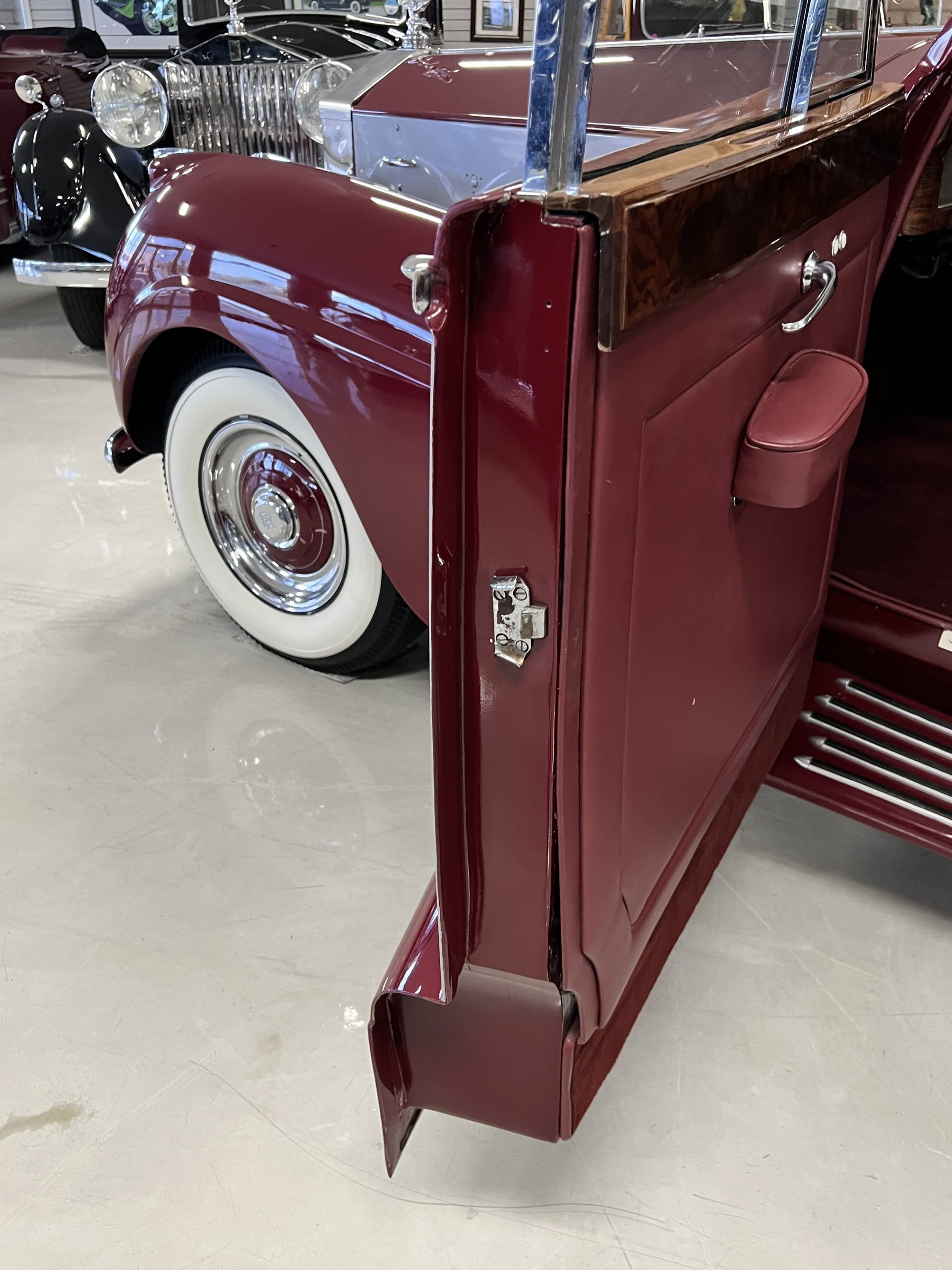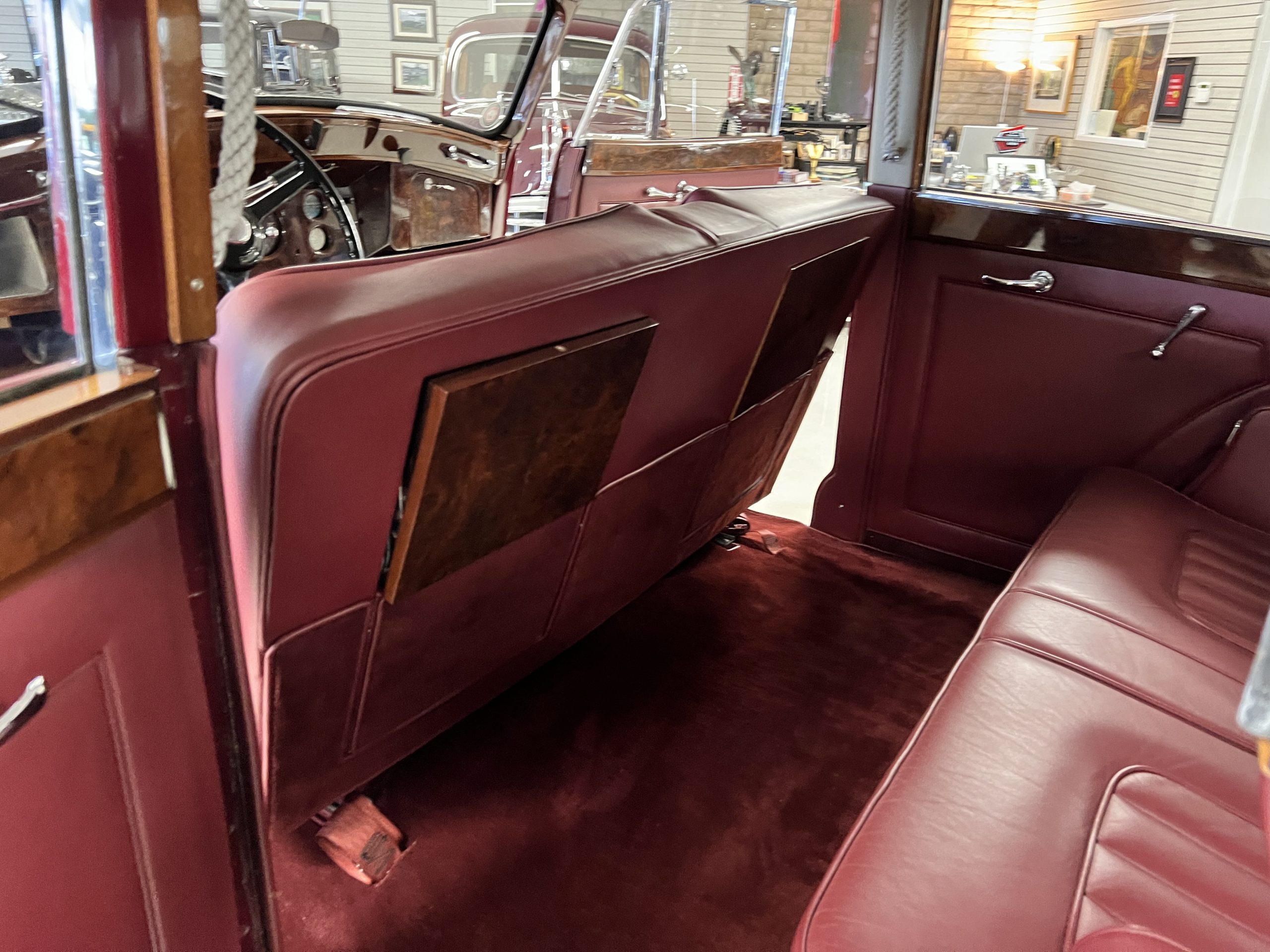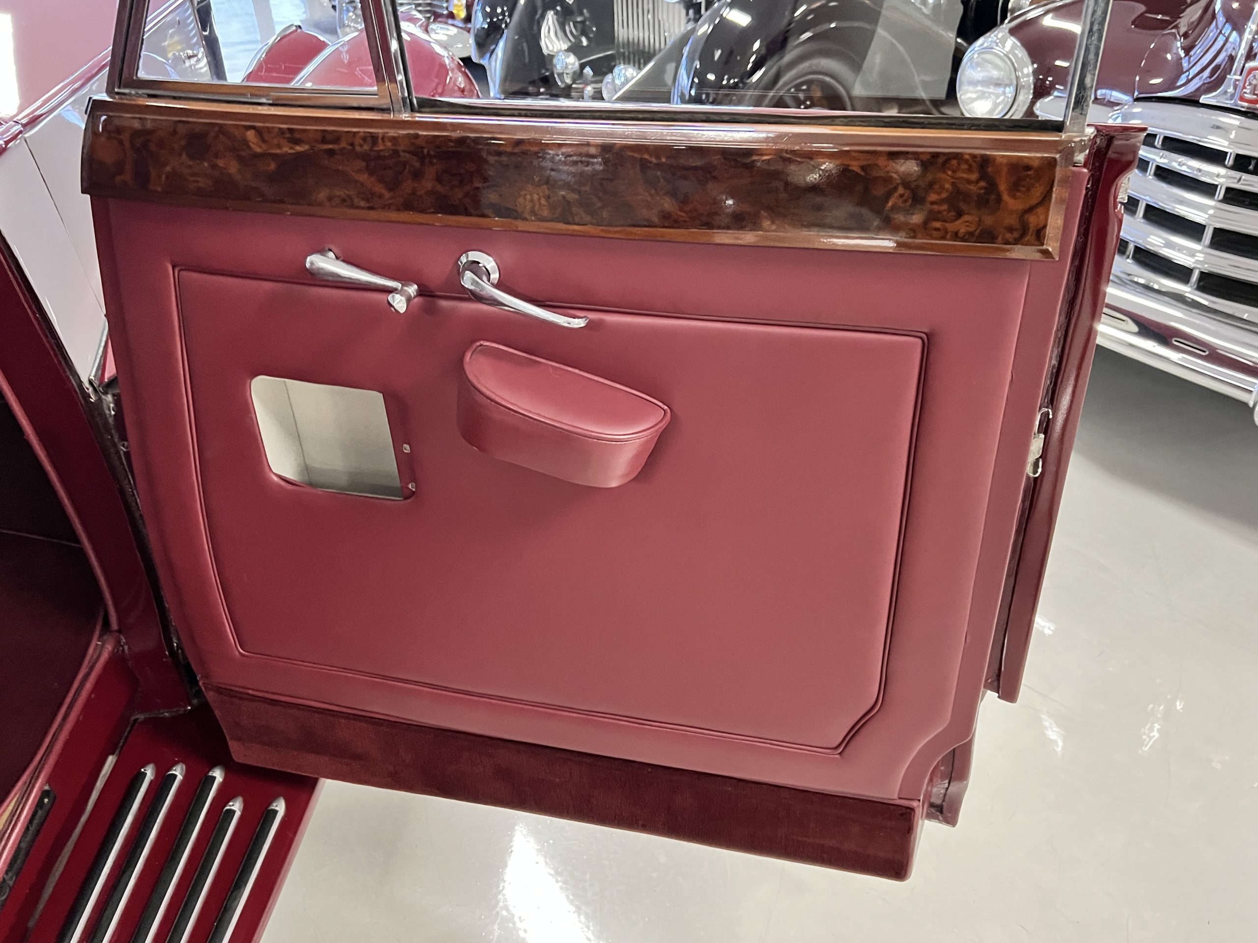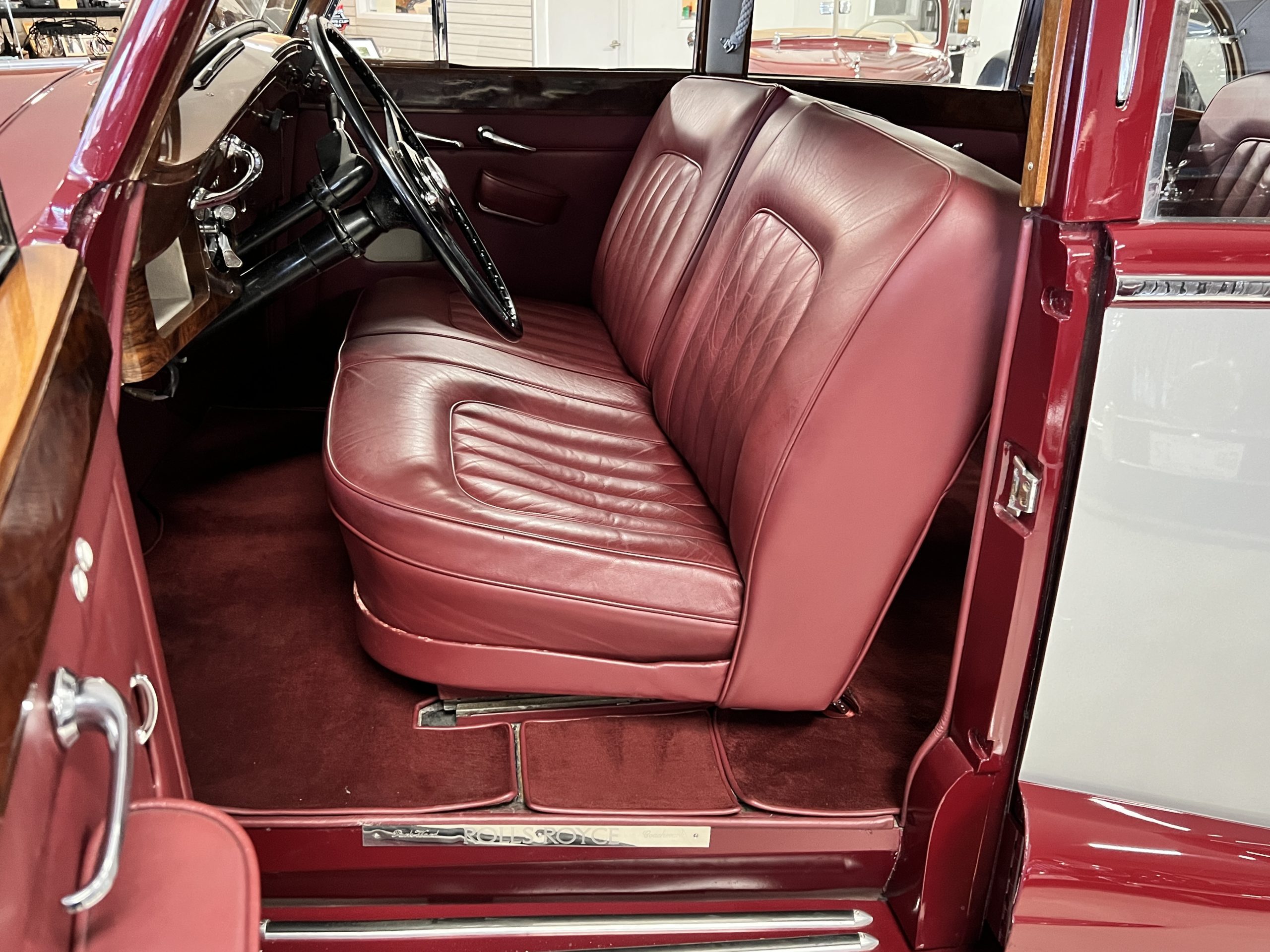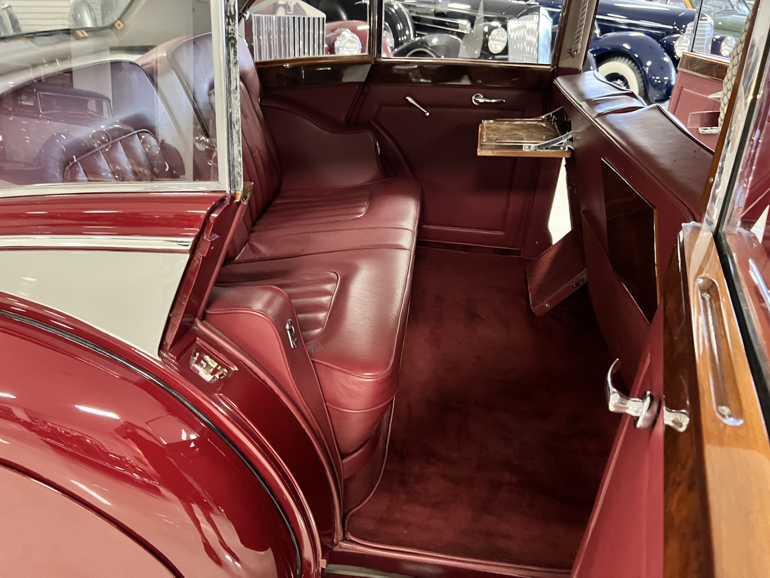 The interior is a matching Burgundy leather and Wilton wool that looks perfect with the paint colors. The gray wool broadcloth headliner is the perfect complement to the burgundy leather. The interior was done by Mike Ambrose who has prepared many concours classics for Pebble Beach. The wood has all been refinished and is in good to very good condition. This Wraith was ordered with an electric driver’s door window. An area for improvement is the missing inside rear window surround.