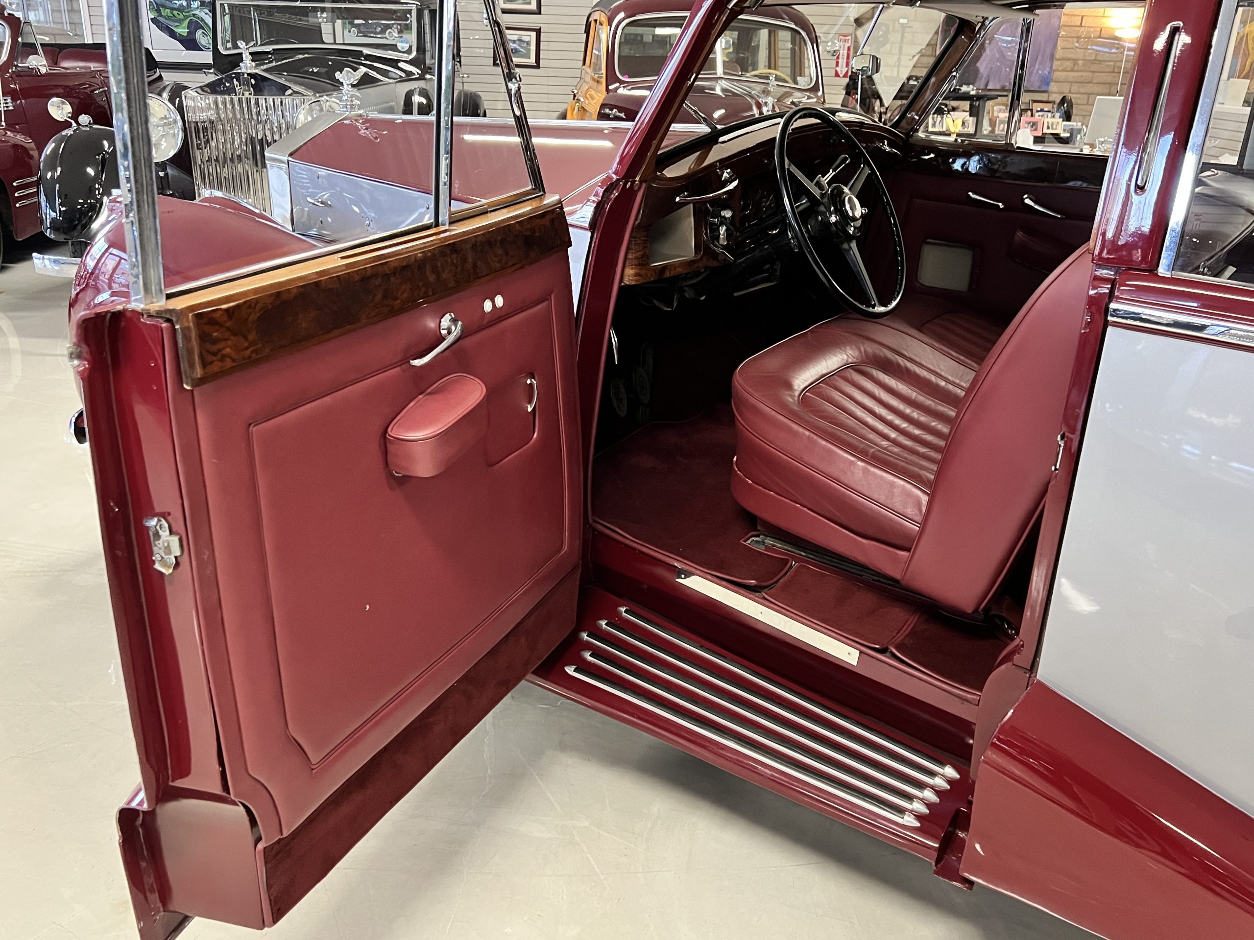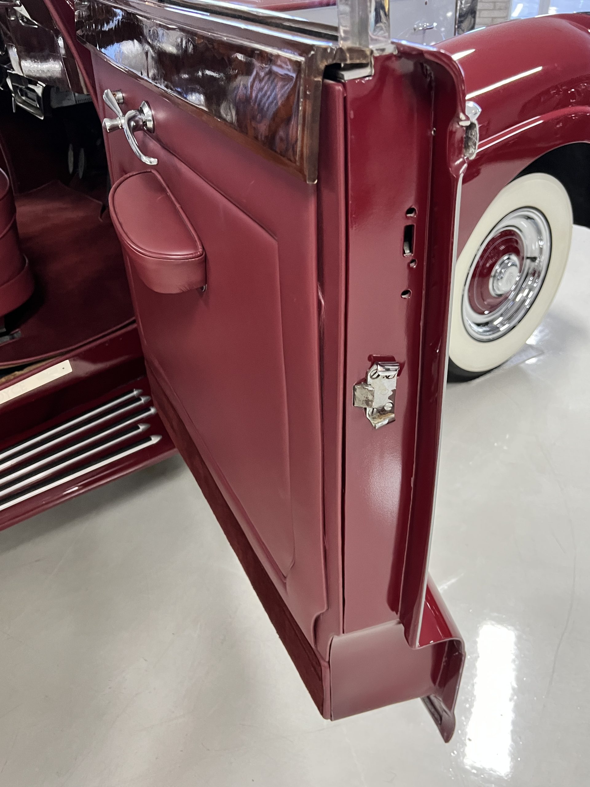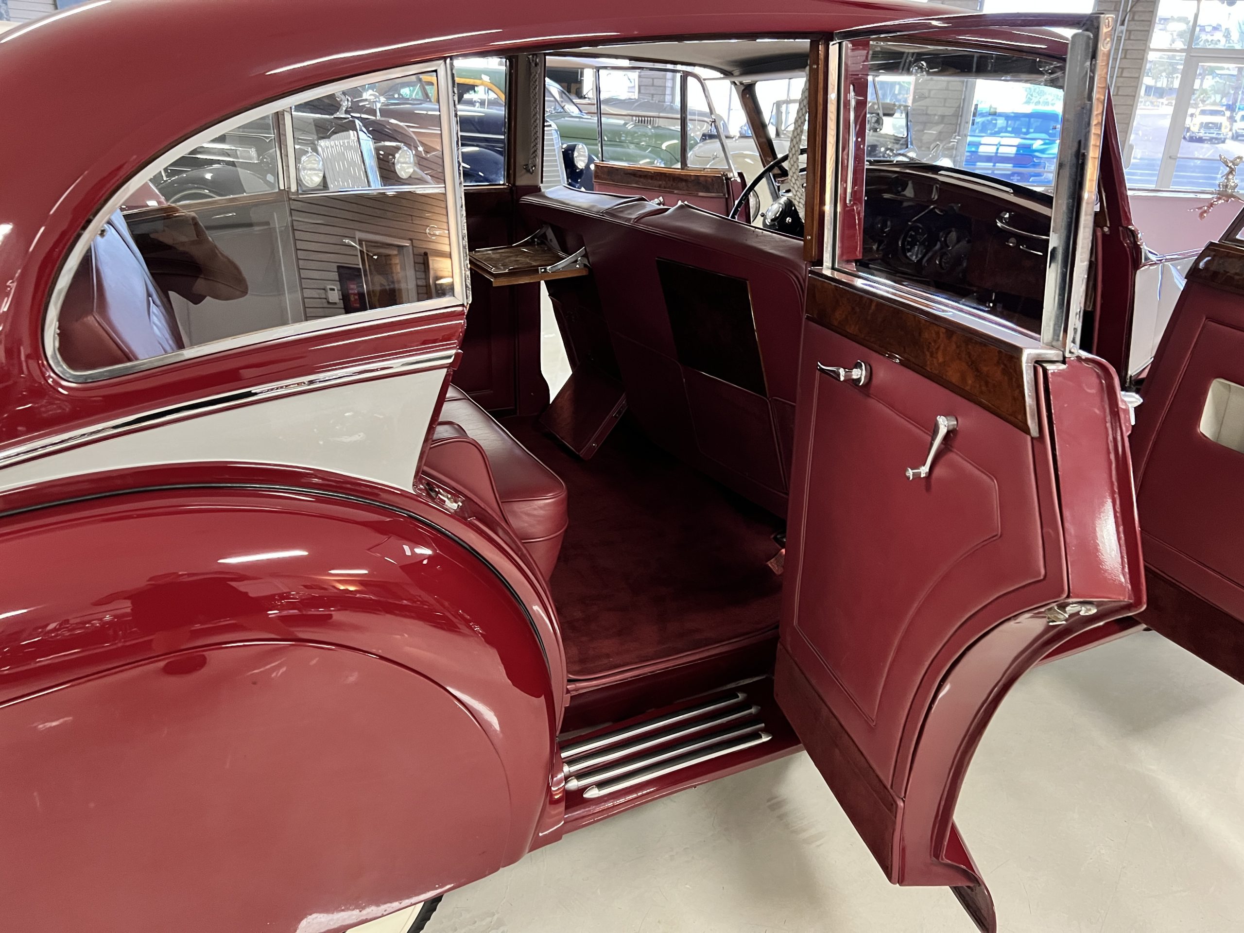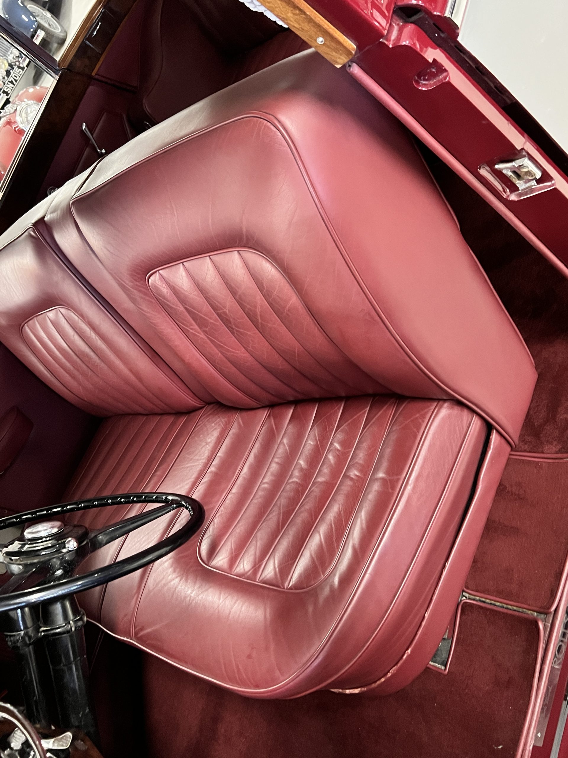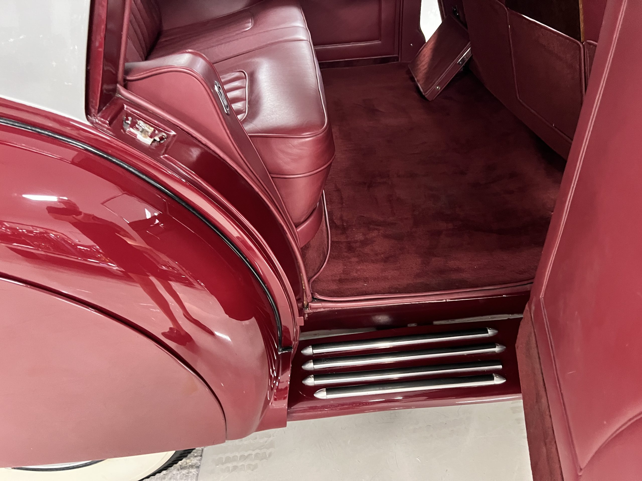 The interior is a matching Burgundy leather and Wilton wool that looks perfect with the paint colors. The gray wool broadcloth headliner is the perfect complement to the burgundy leather. The interior was done by Mike Ambrose who has prepared many concours classics for Pebble Beach. The wood has all been refinished and is in good to very good condition. This Wraith was ordered with an electric driver’s door window. An area for improvement is the missing inside rear window surround.