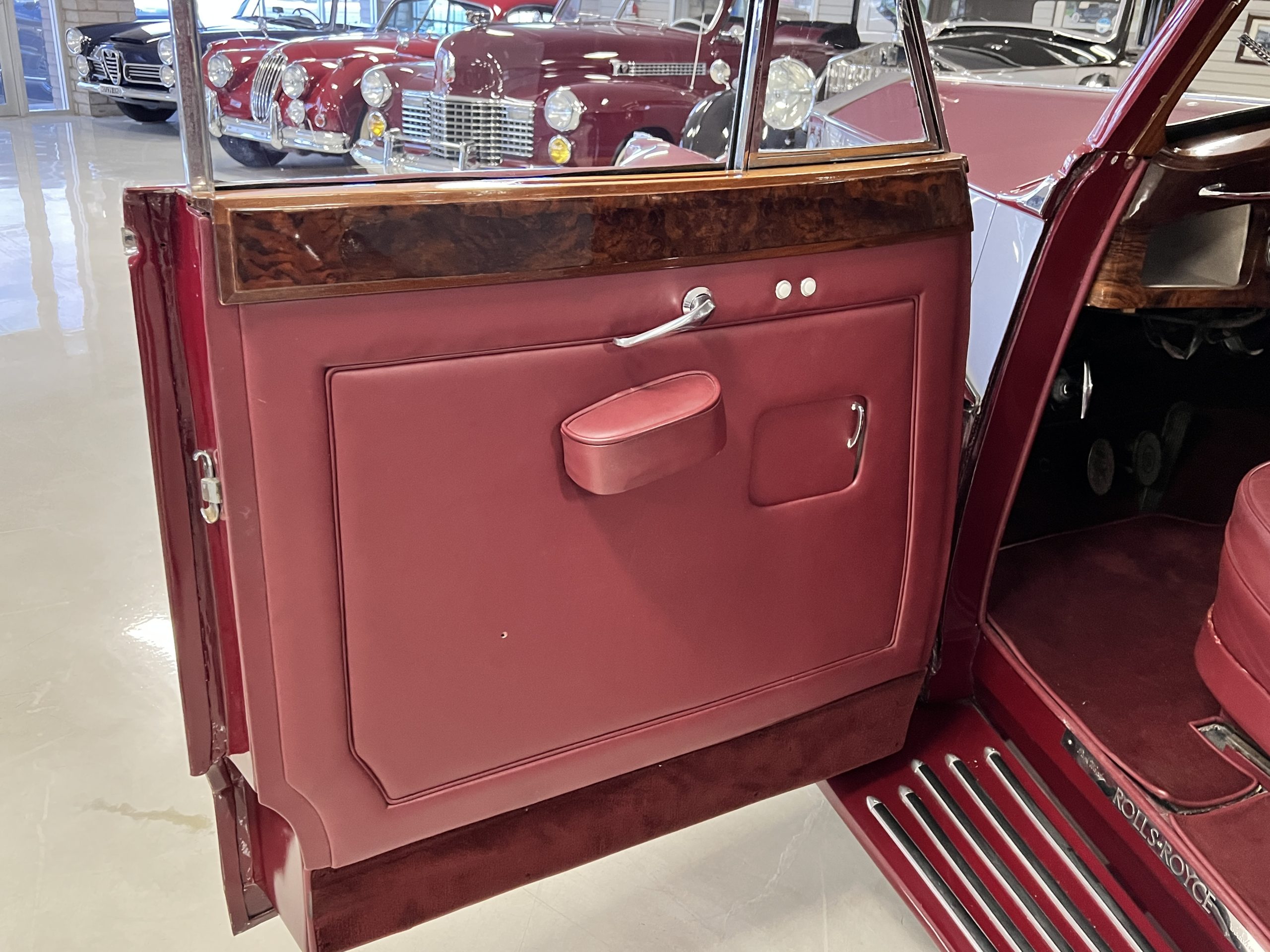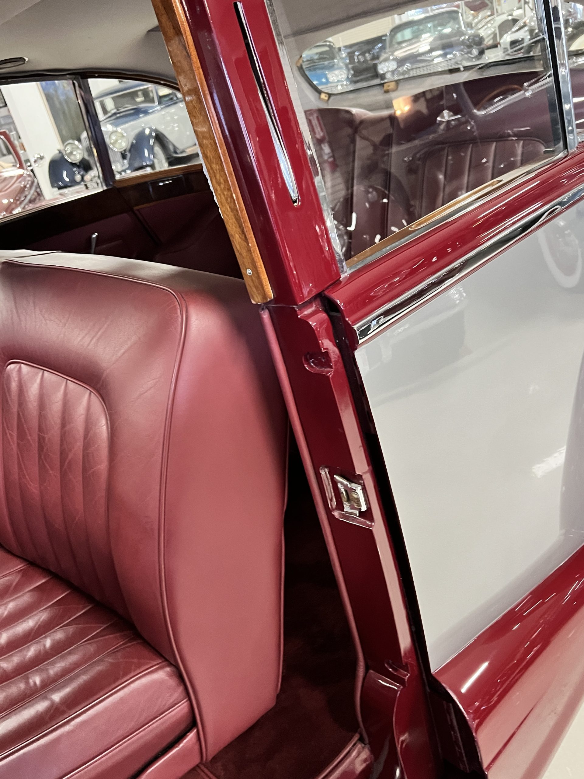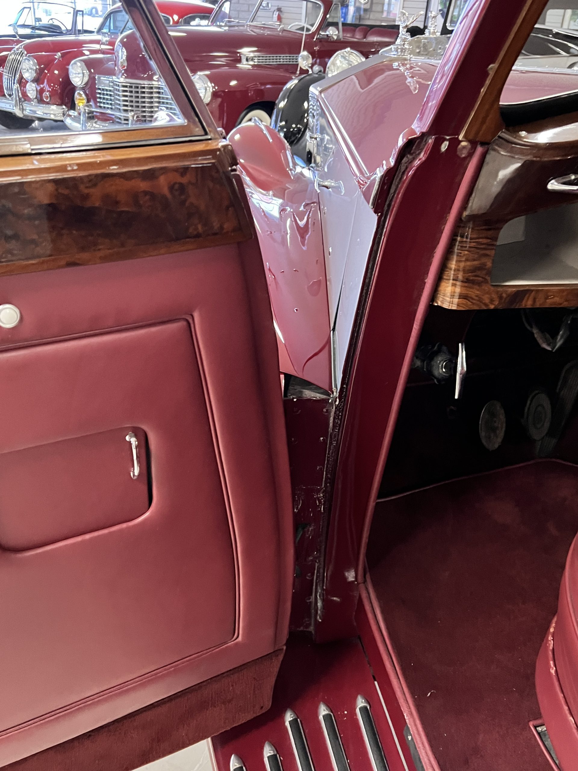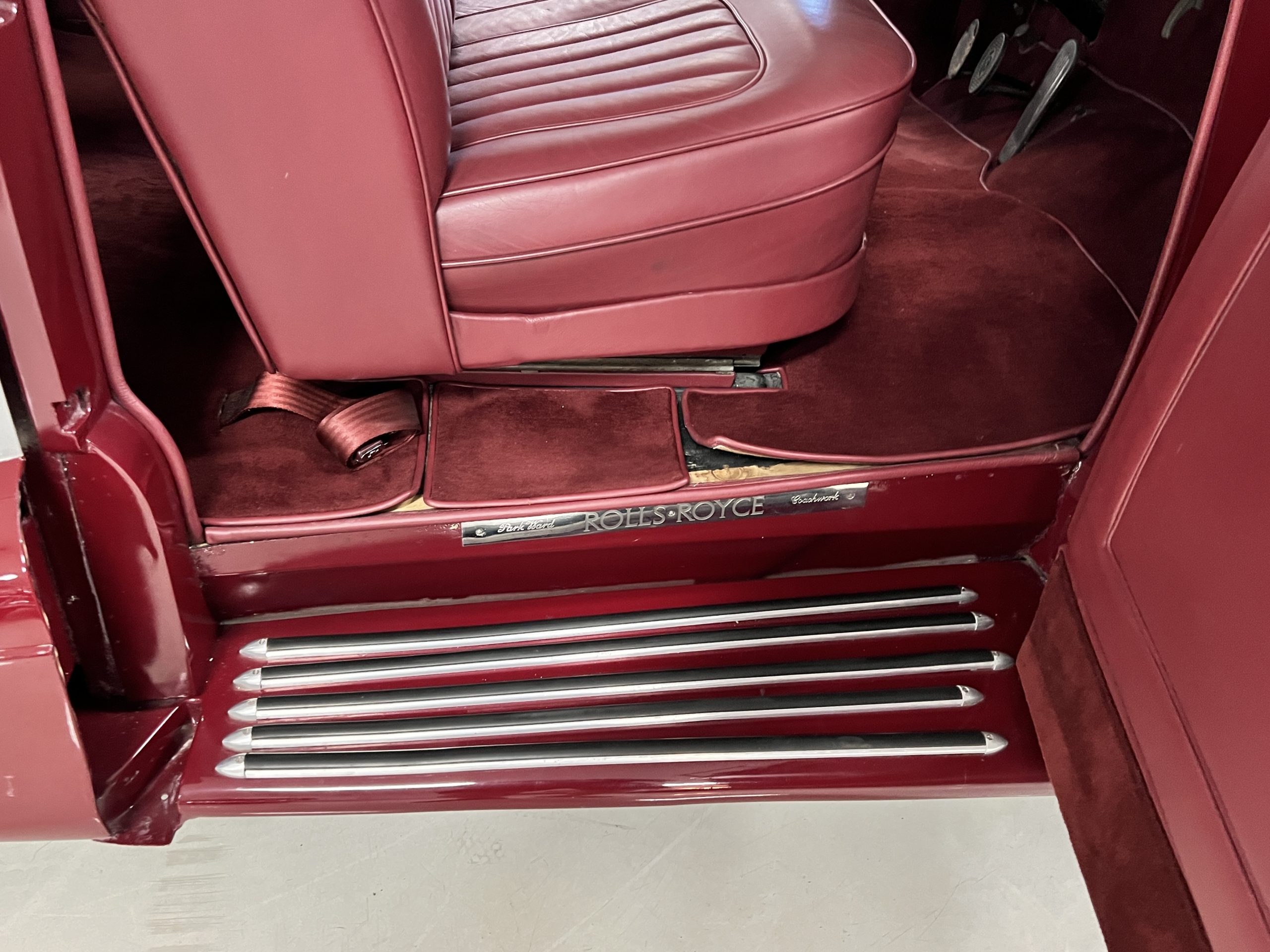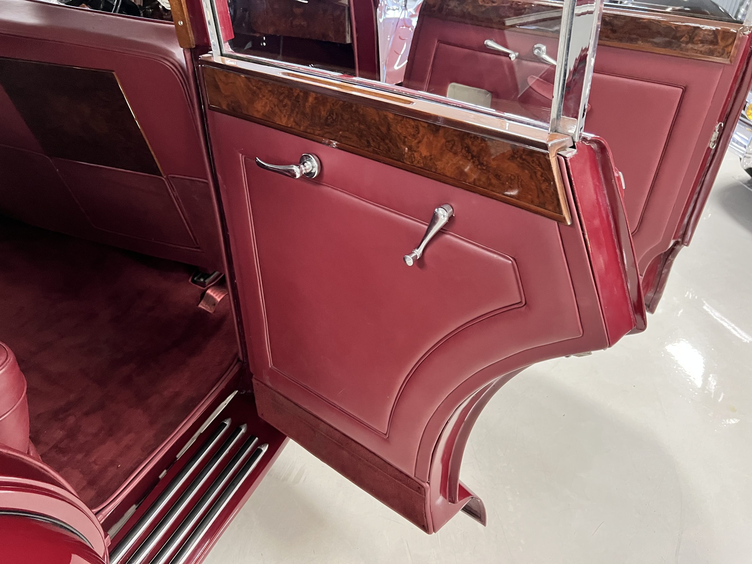 The interior is a matching Burgundy leather and Wilton wool that looks perfect with the paint colors. The gray wool broadcloth headliner is the perfect complement to the burgundy leather. The interior was done by Mike Ambrose who has prepared many concours classics for Pebble Beach. The wood has all been refinished and is in good to very good condition. This Wraith was ordered with an electric driver’s door window. An area for improvement is the missing inside rear window surround.