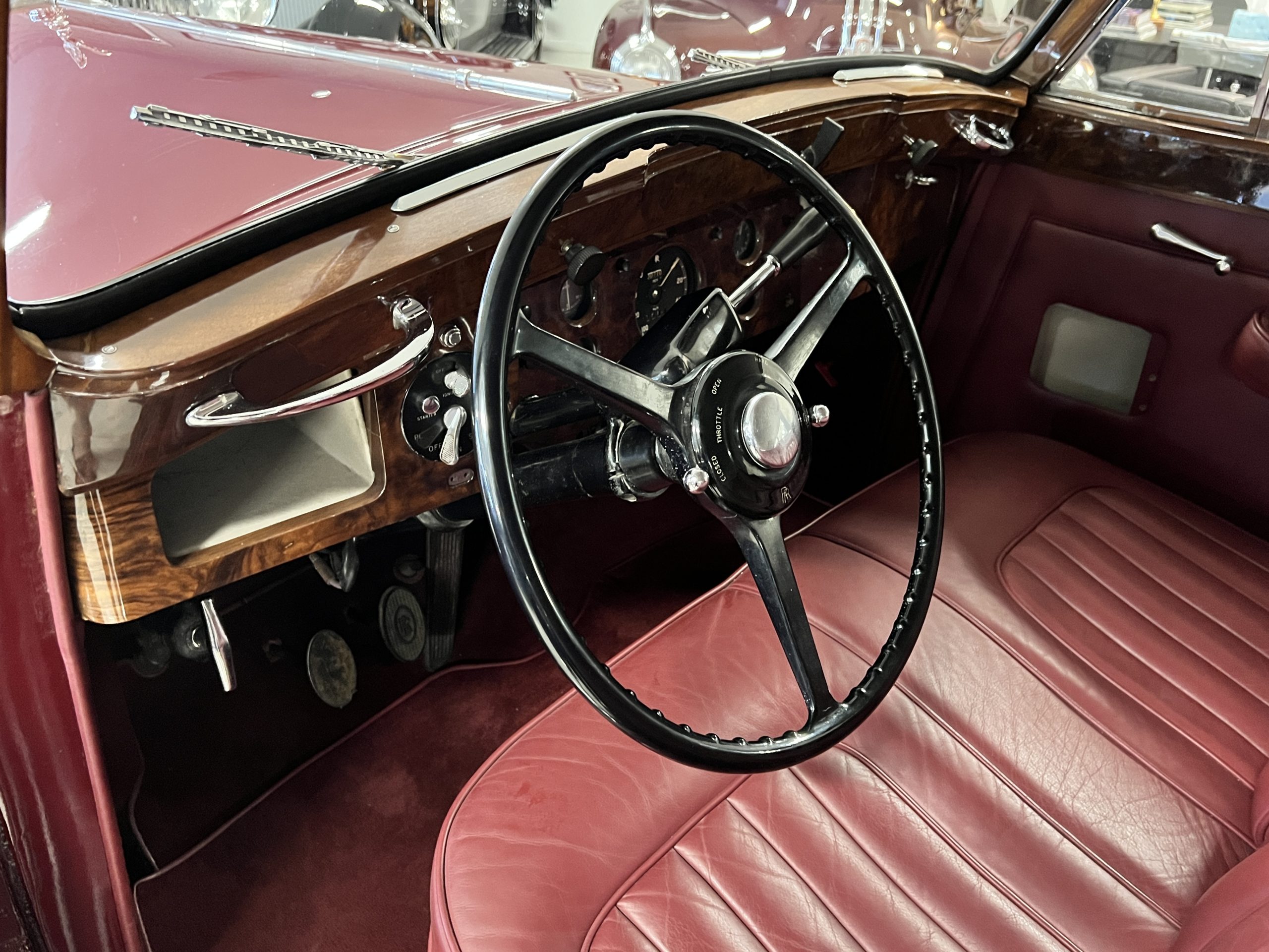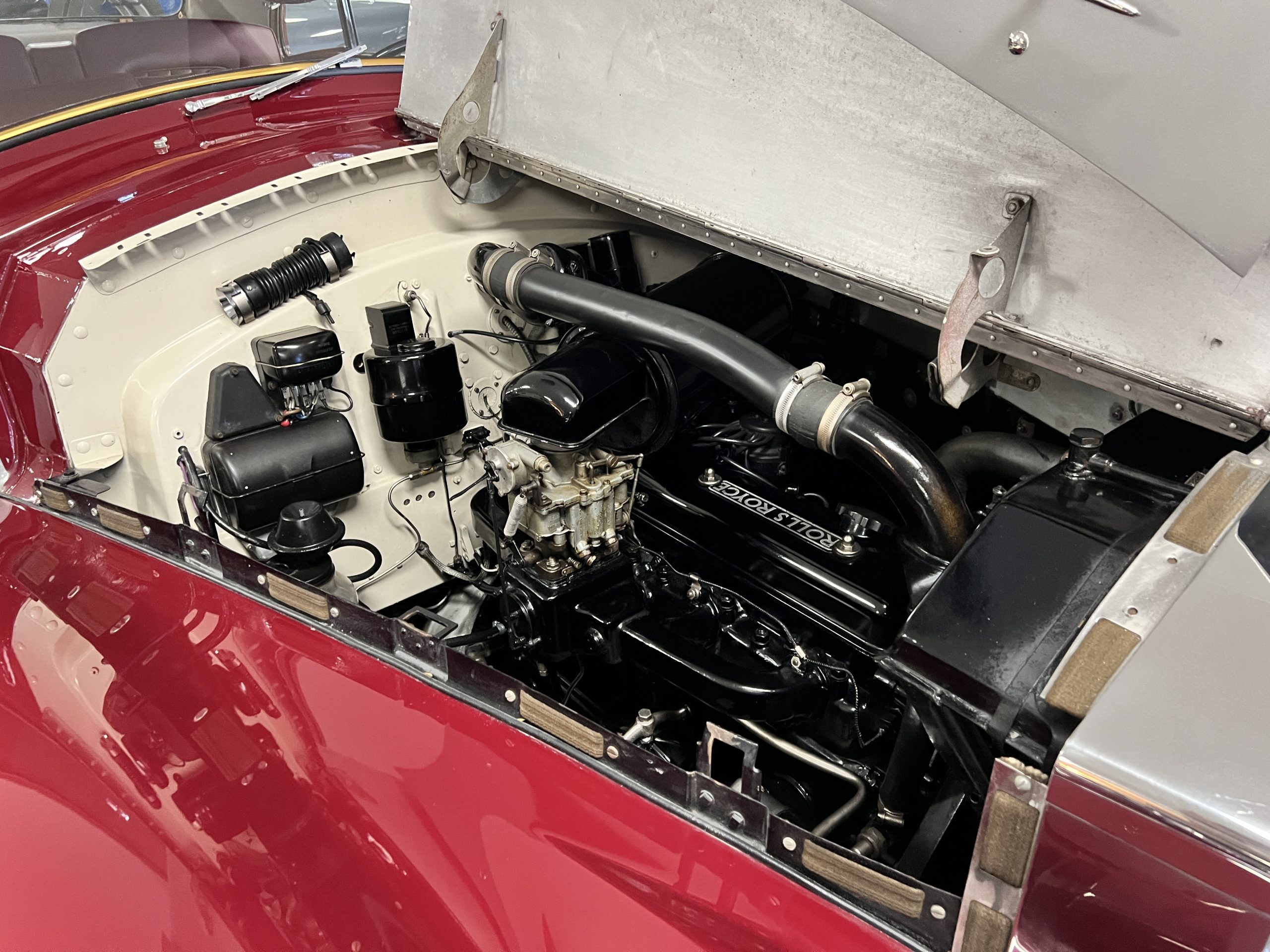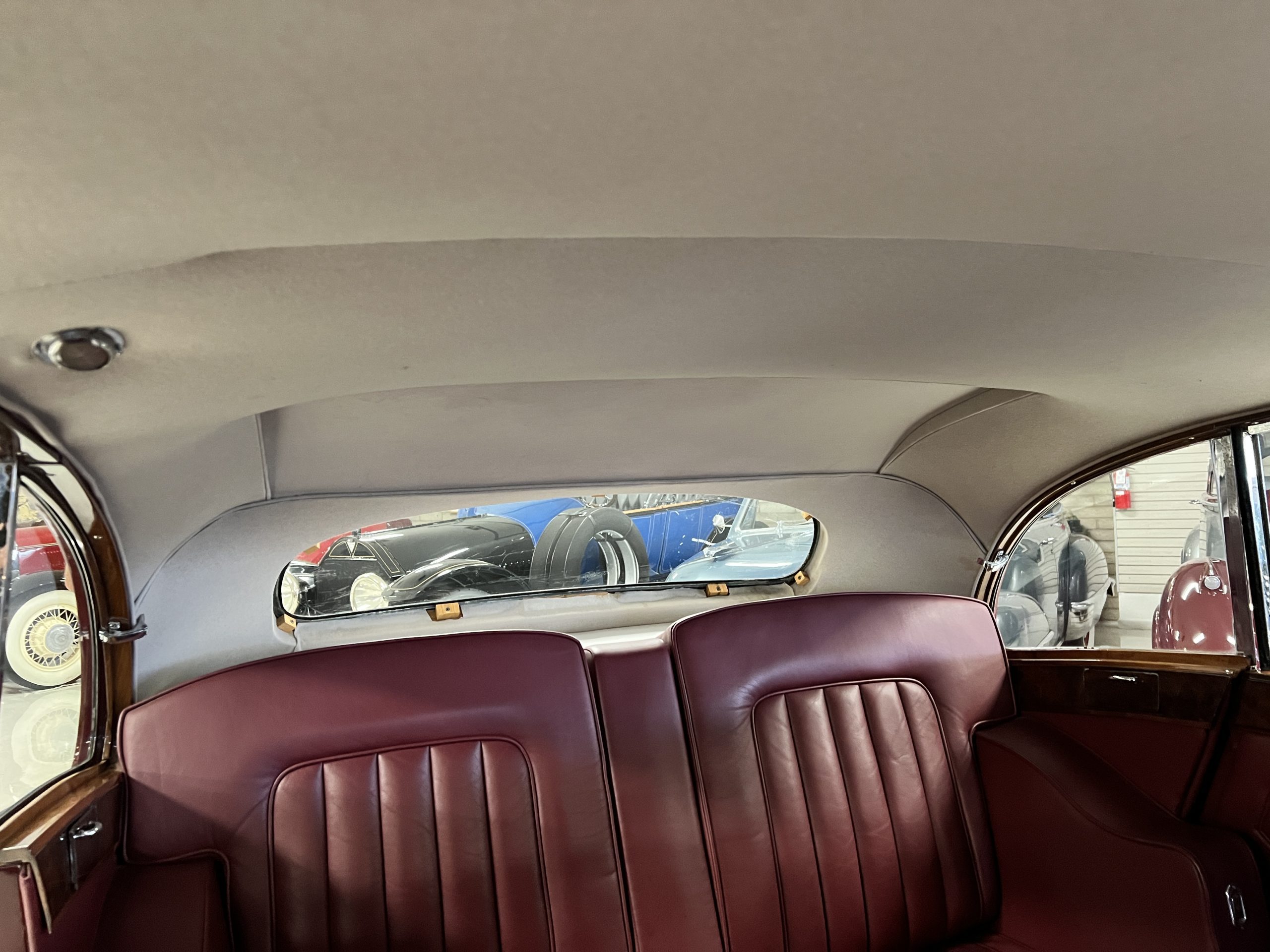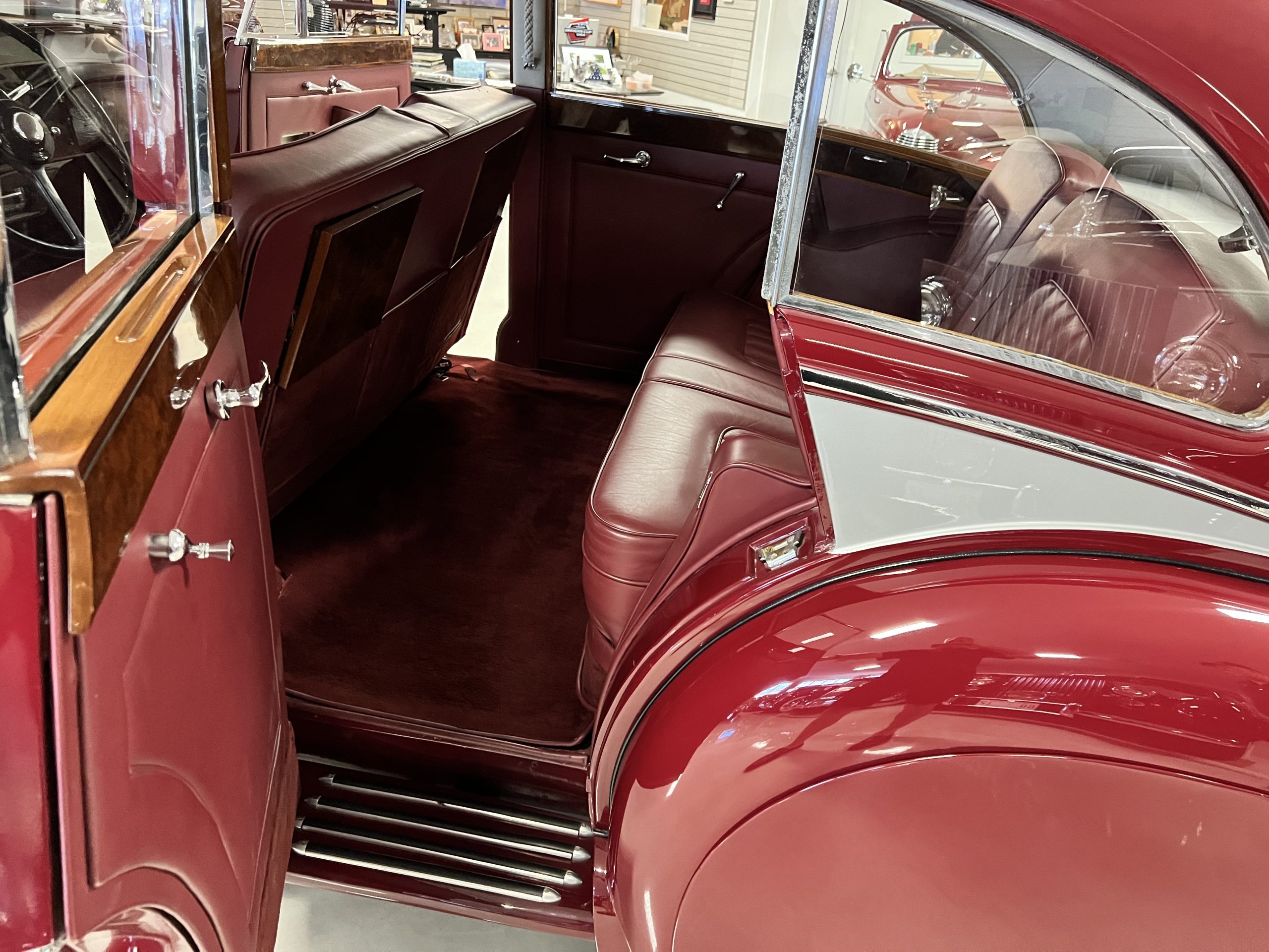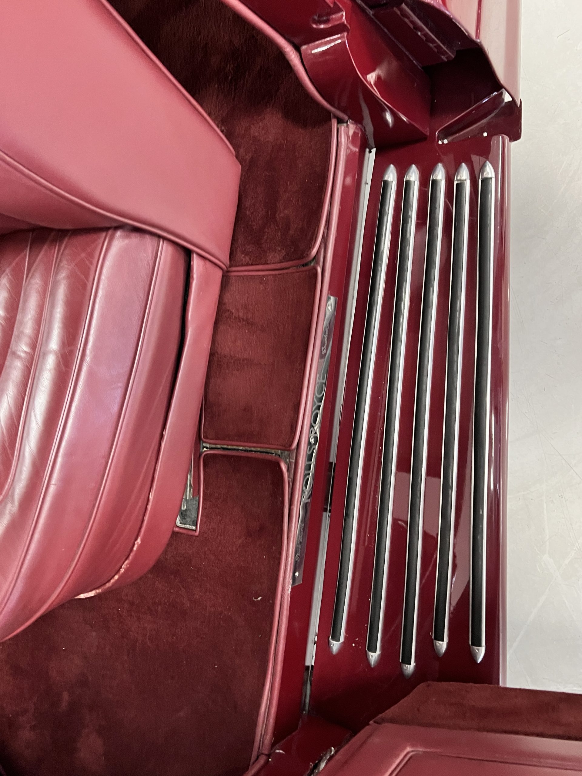 The interior is a matching Burgundy leather and Wilton wool that looks perfect with the paint colors. The gray wool broadcloth headliner is the perfect complement to the burgundy leather. The interior was done by Mike Ambrose who has prepared many concours classics for Pebble Beach. The wood has all been refinished and is in good to very good condition. This Wraith was ordered with an electric driver’s door window. An area for improvement is the missing inside rear window surround.