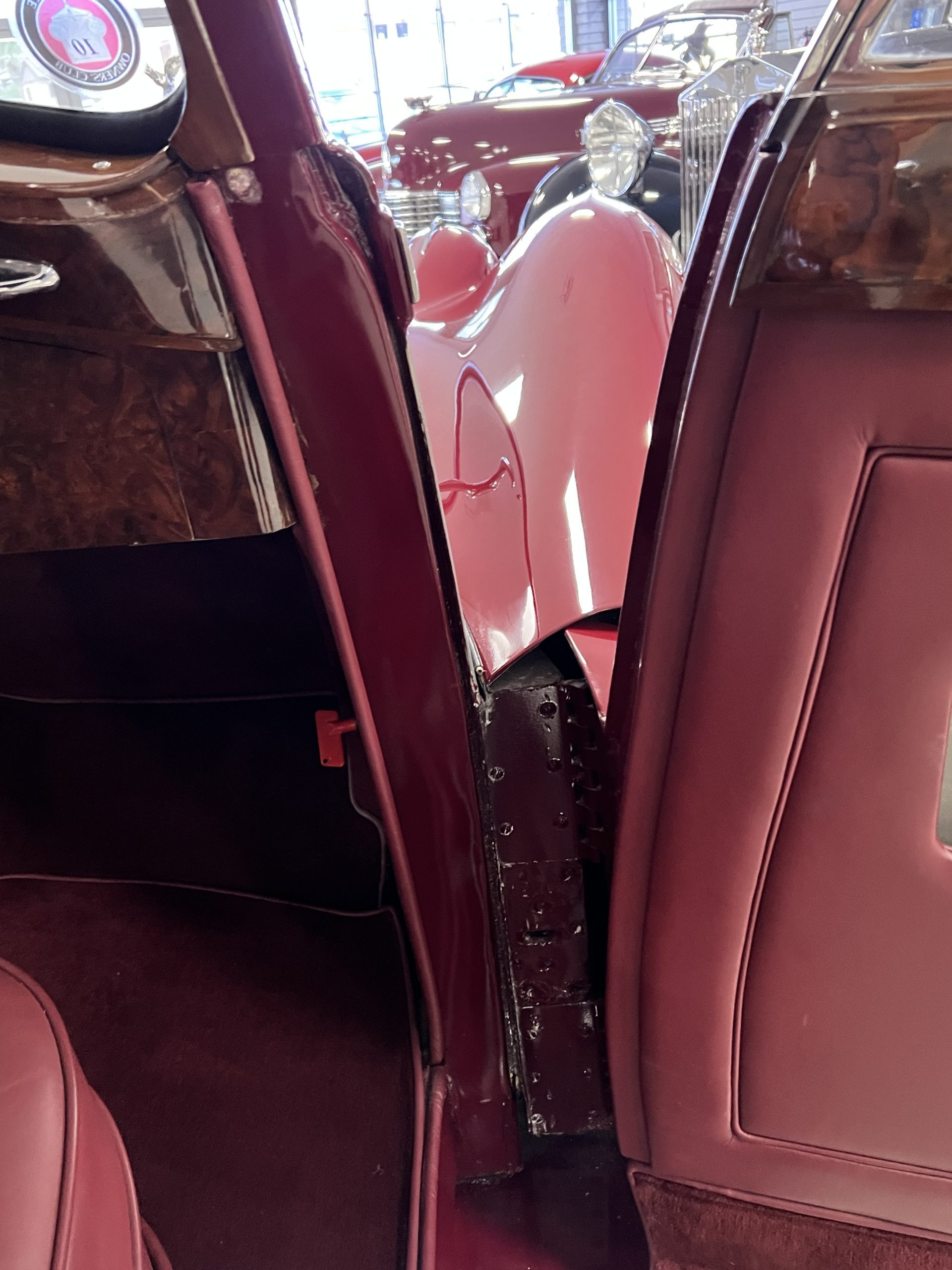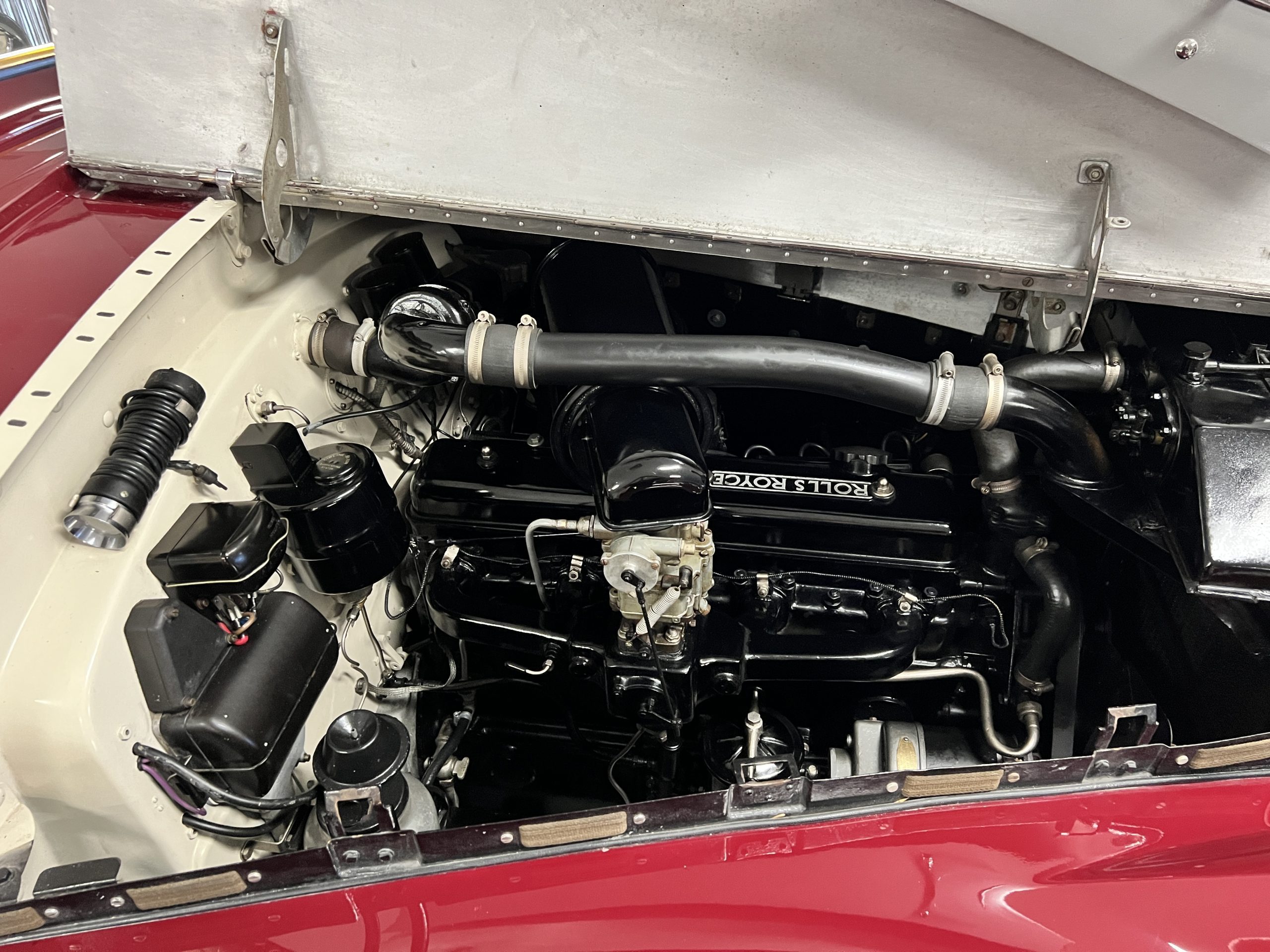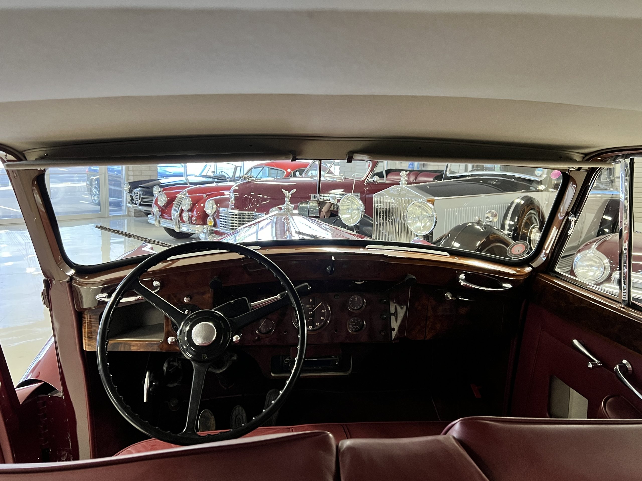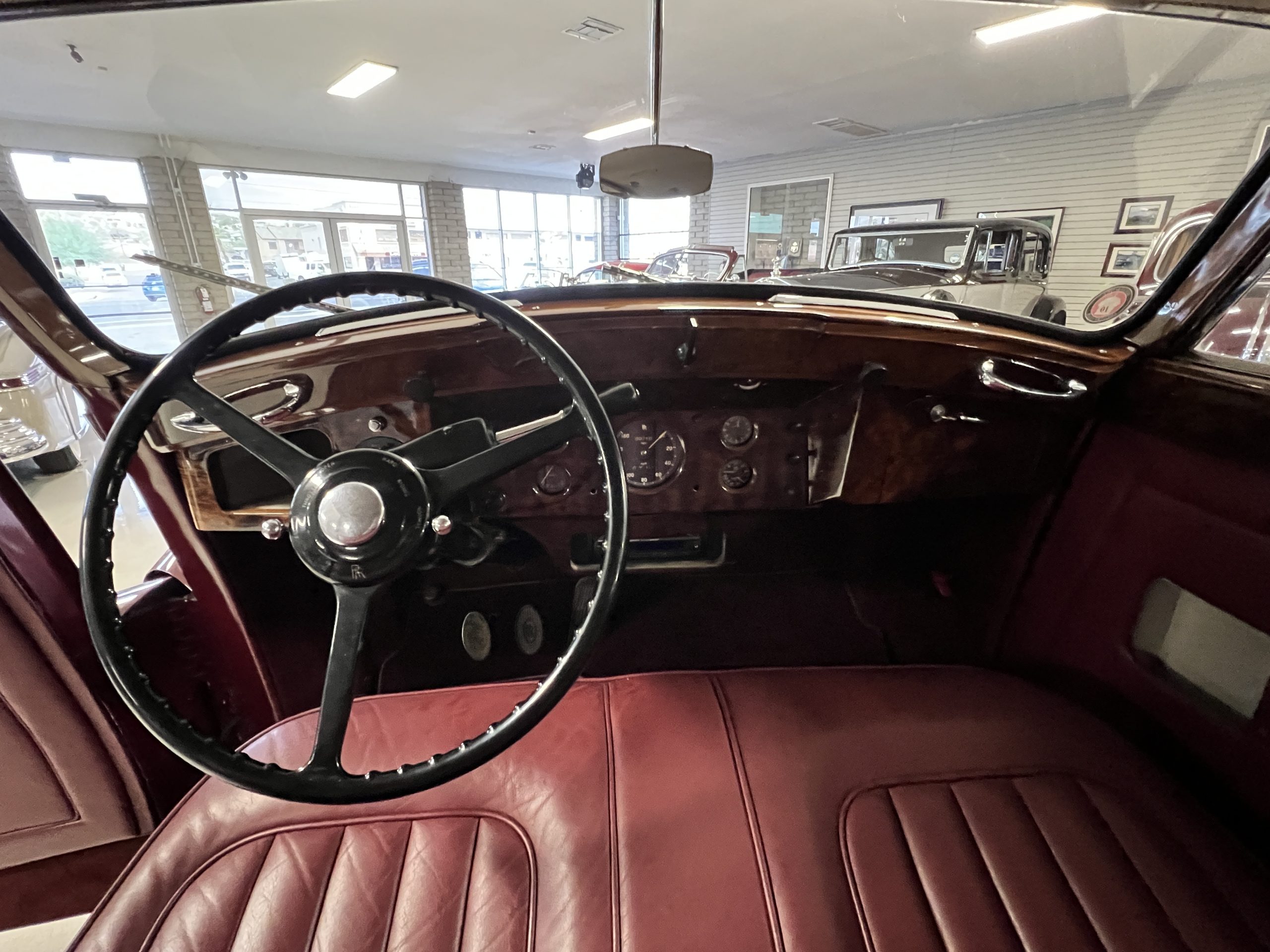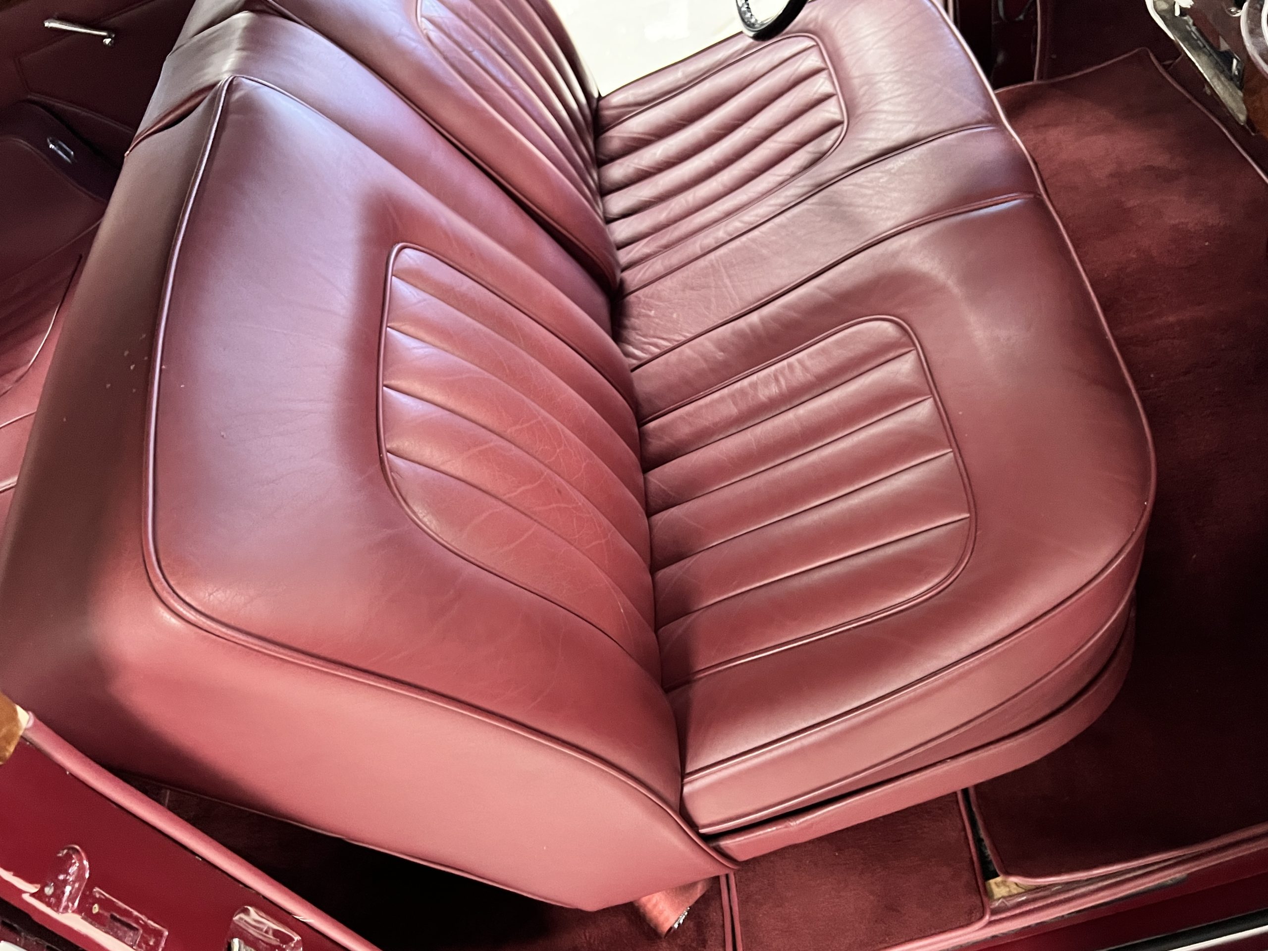 The interior is a matching Burgundy leather and Wilton wool that looks perfect with the paint colors. The gray wool broadcloth headliner is the perfect complement to the burgundy leather. The interior was done by Mike Ambrose who has prepared many concours classics for Pebble Beach. The wood has all been refinished and is in good to very good condition. This Wraith was ordered with an electric driver’s door window. An area for improvement is the missing inside rear window surround.