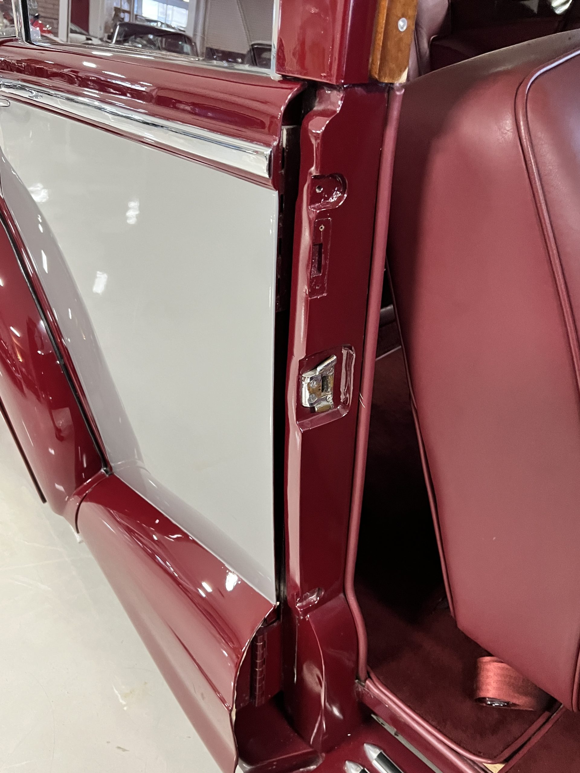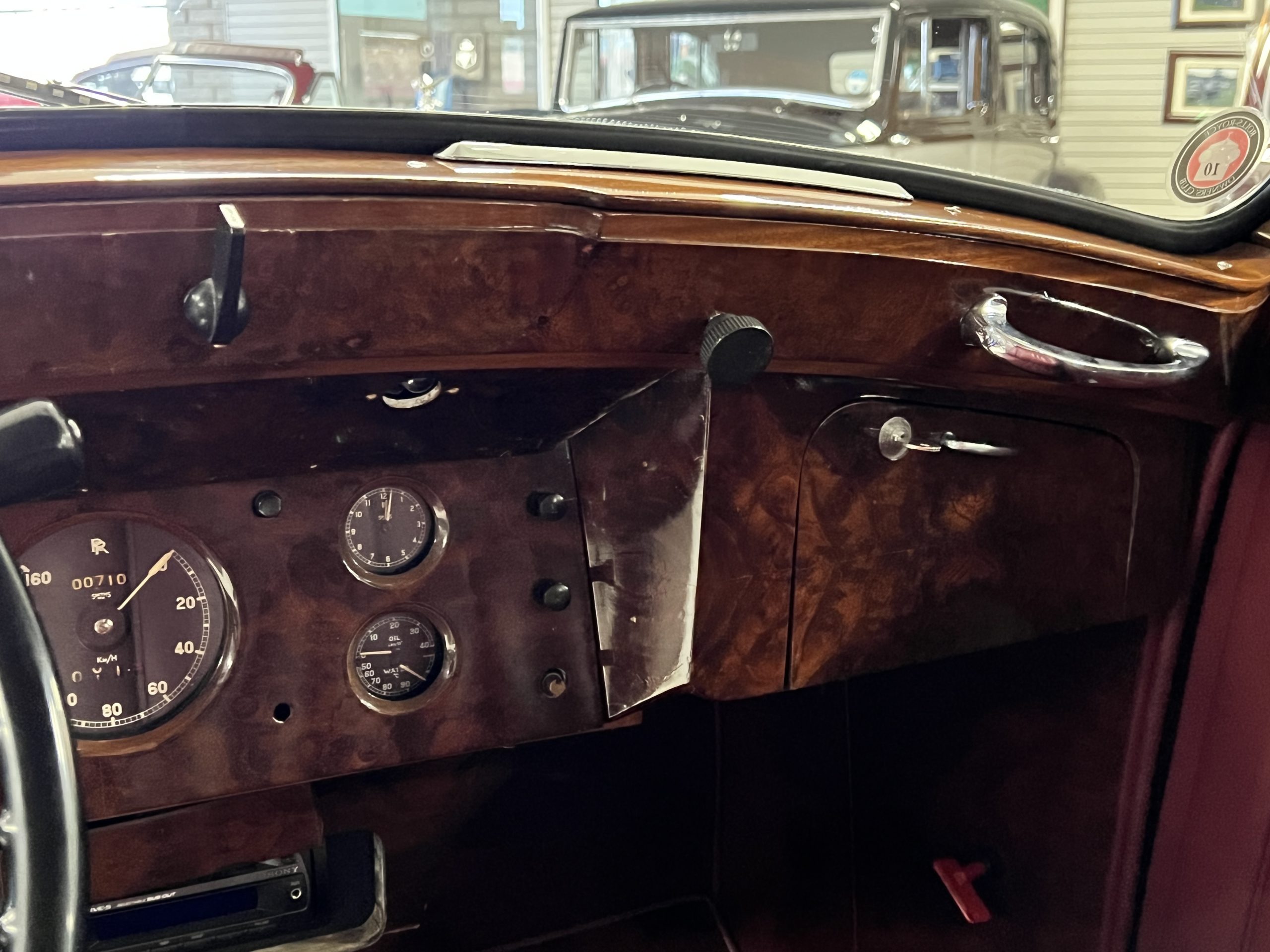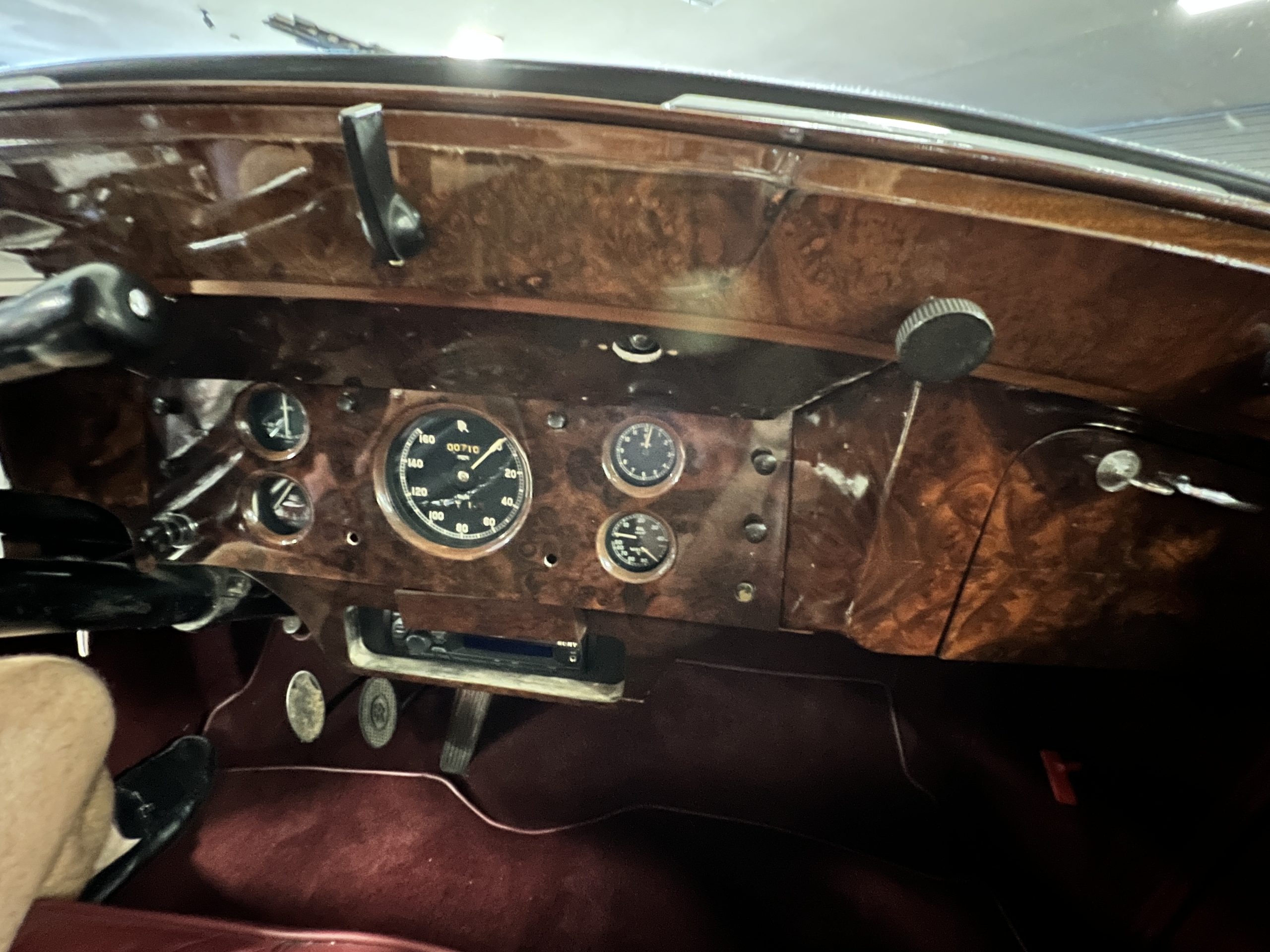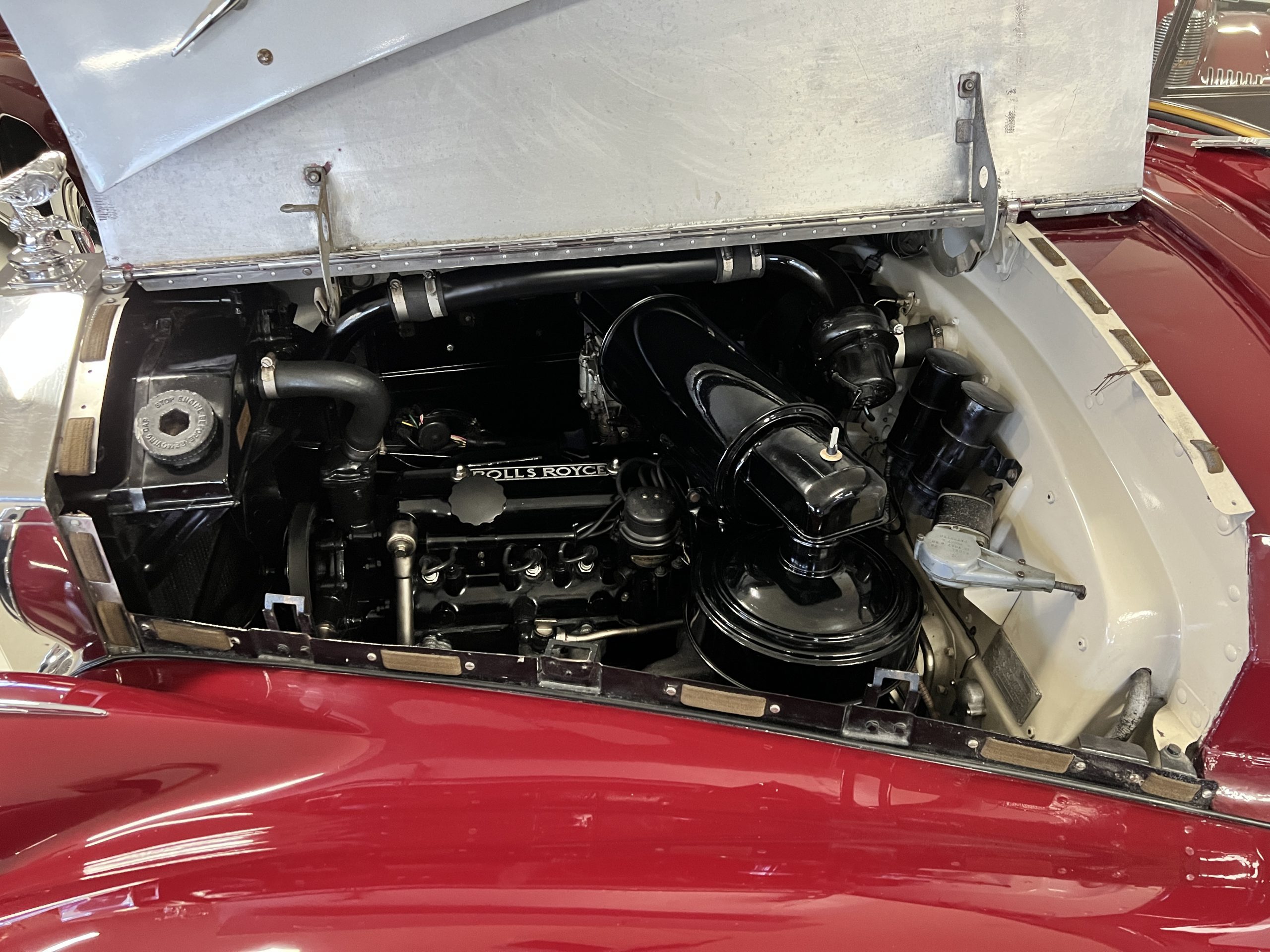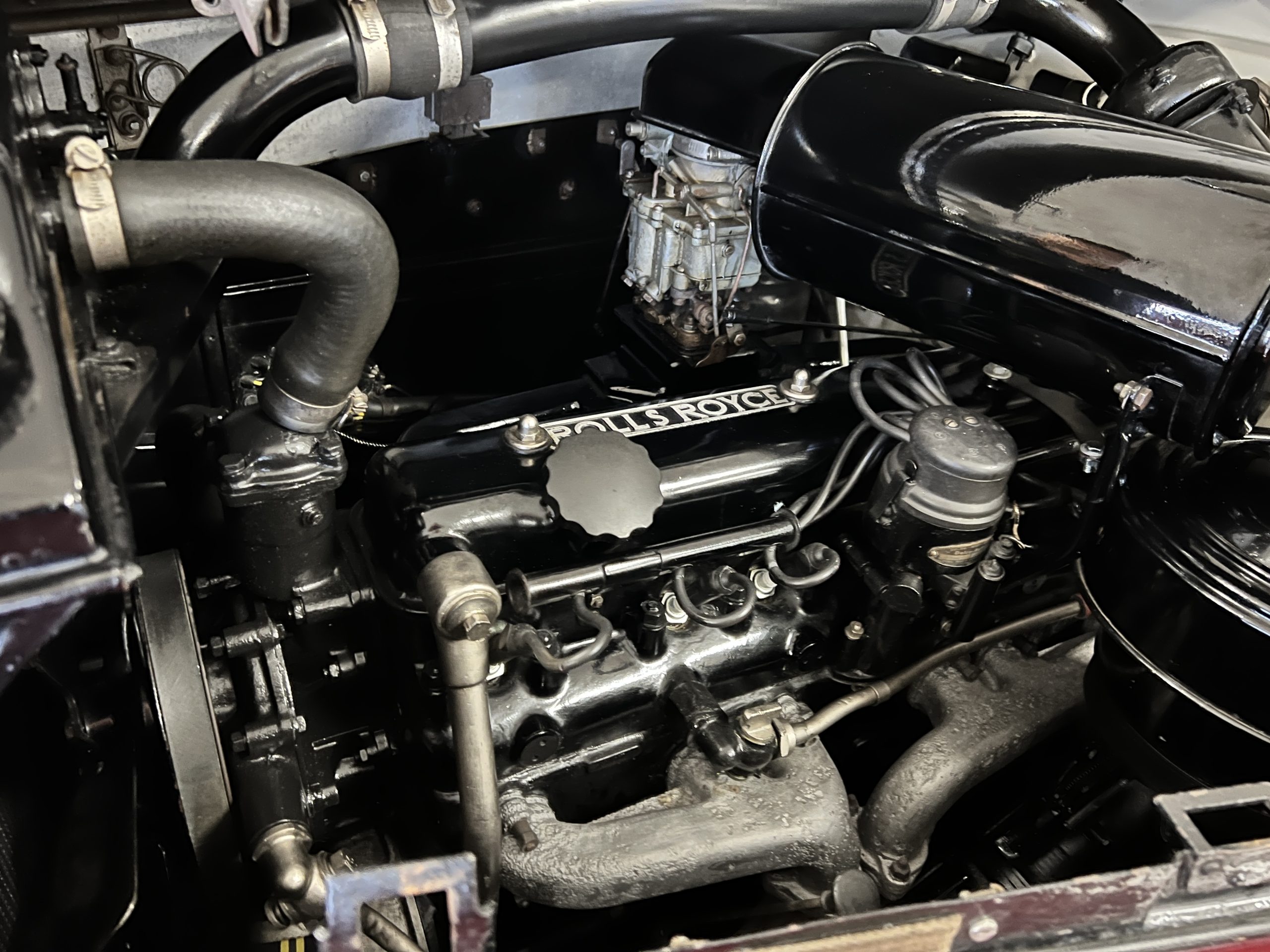 The interior is a matching Burgundy leather and Wilton wool that looks perfect with the paint colors. The gray wool broadcloth headliner is the perfect complement to the burgundy leather. The interior was done by Mike Ambrose who has prepared many concours classics for Pebble Beach. The wood has all been refinished and is in good to very good condition. This Wraith was ordered with an electric driver’s door window. An area for improvement is the missing inside rear window surround.