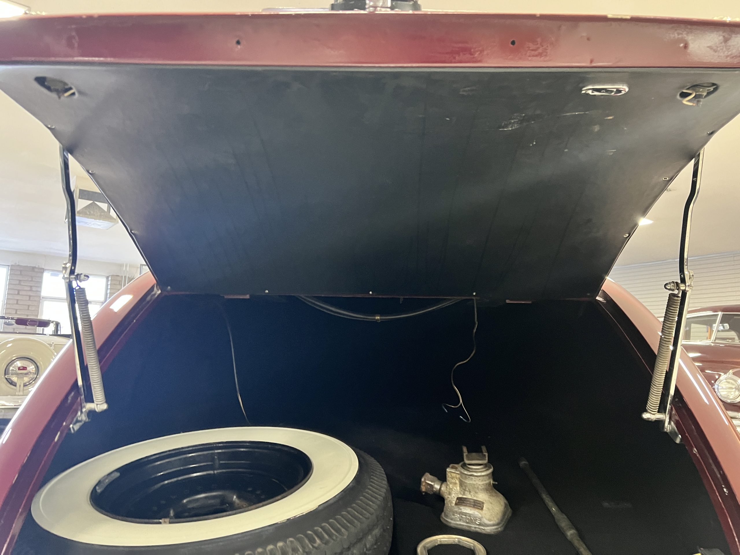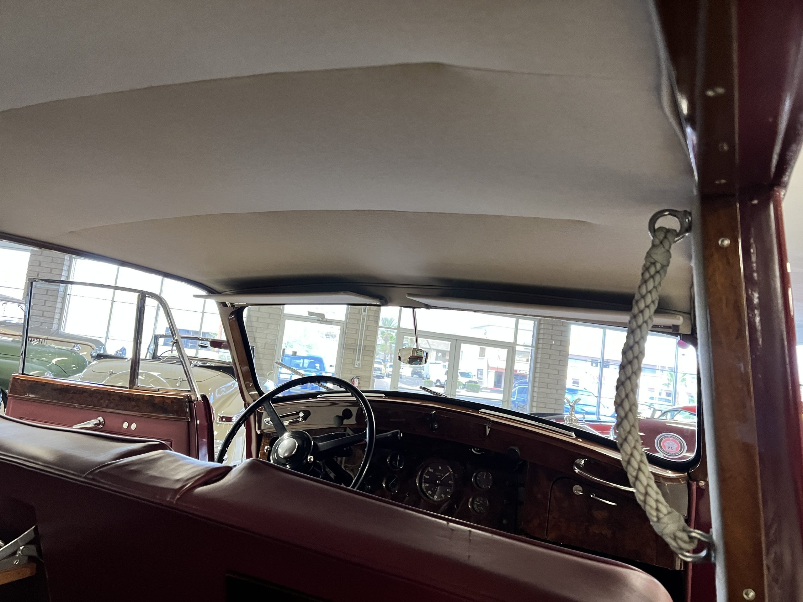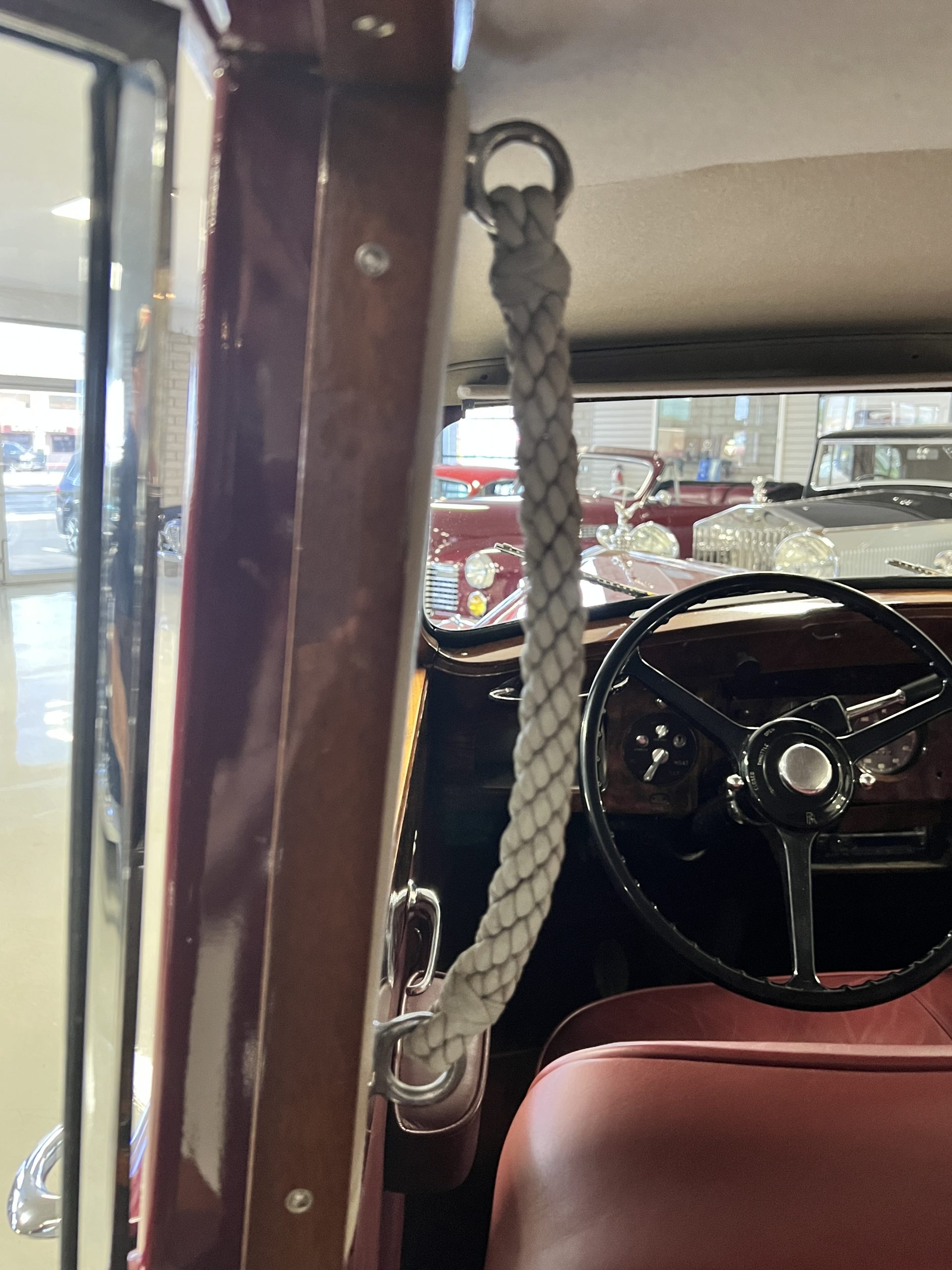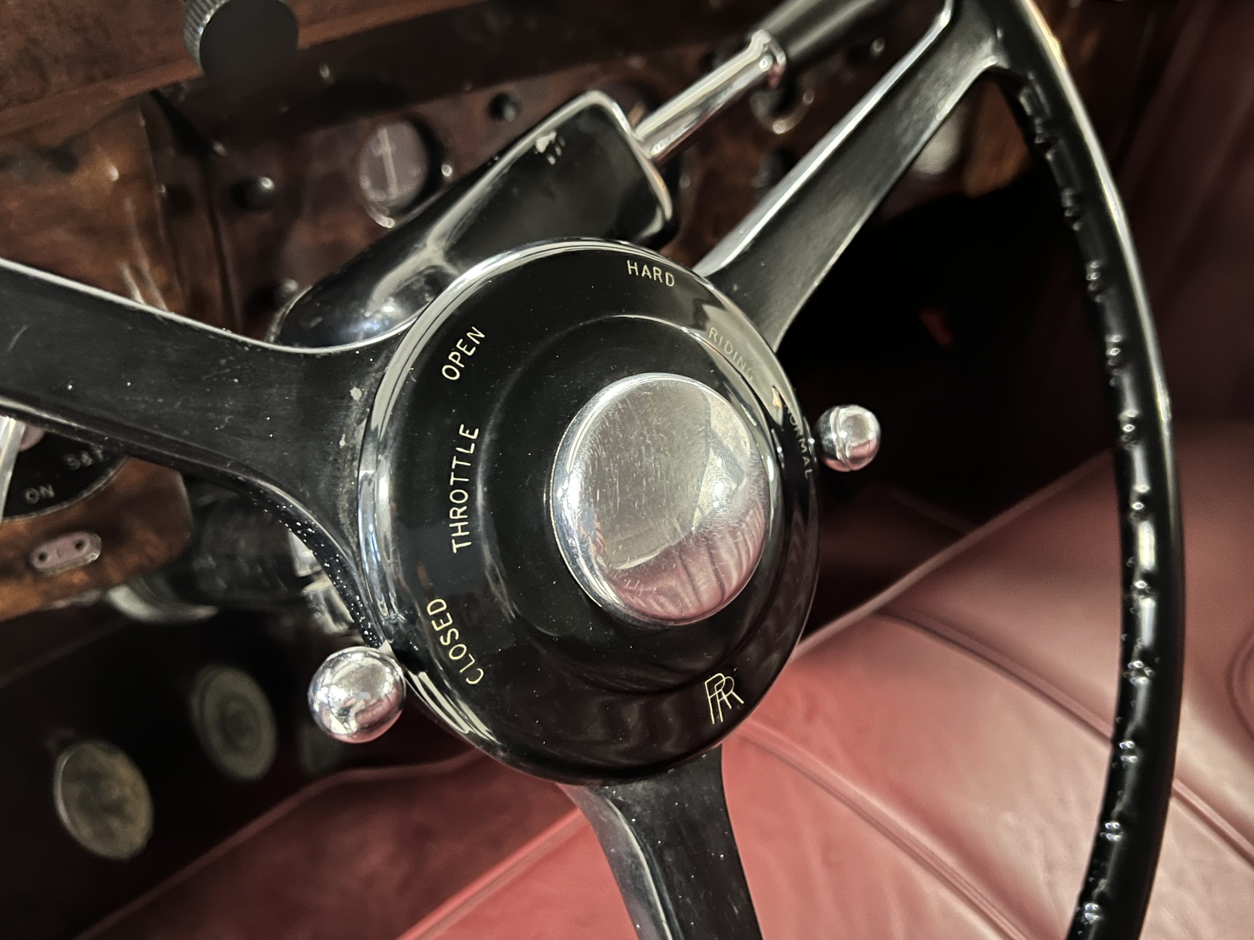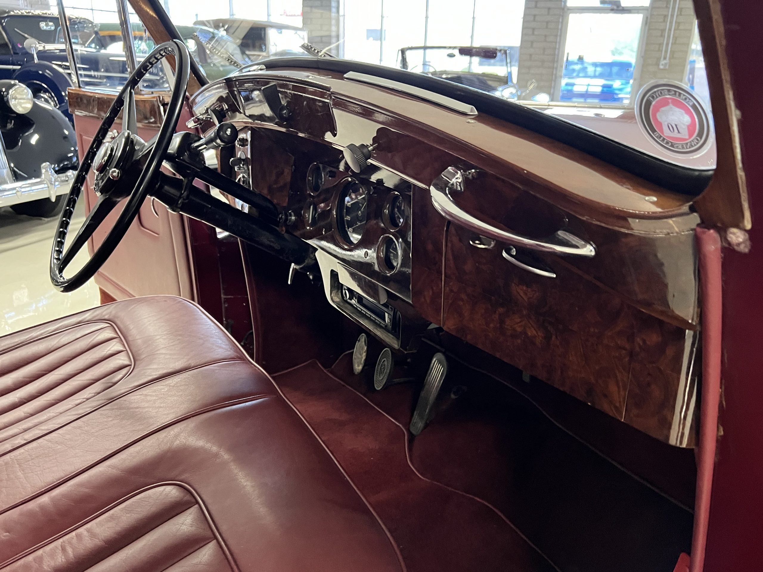 The interior is a matching Burgundy leather and Wilton wool that looks perfect with the paint colors. The gray wool broadcloth headliner is the perfect complement to the burgundy leather. The interior was done by Mike Ambrose who has prepared many concours classics for Pebble Beach. The wood has all been refinished and is in good to very good condition. This Wraith was ordered with an electric driver’s door window. An area for improvement is the missing inside rear window surround.