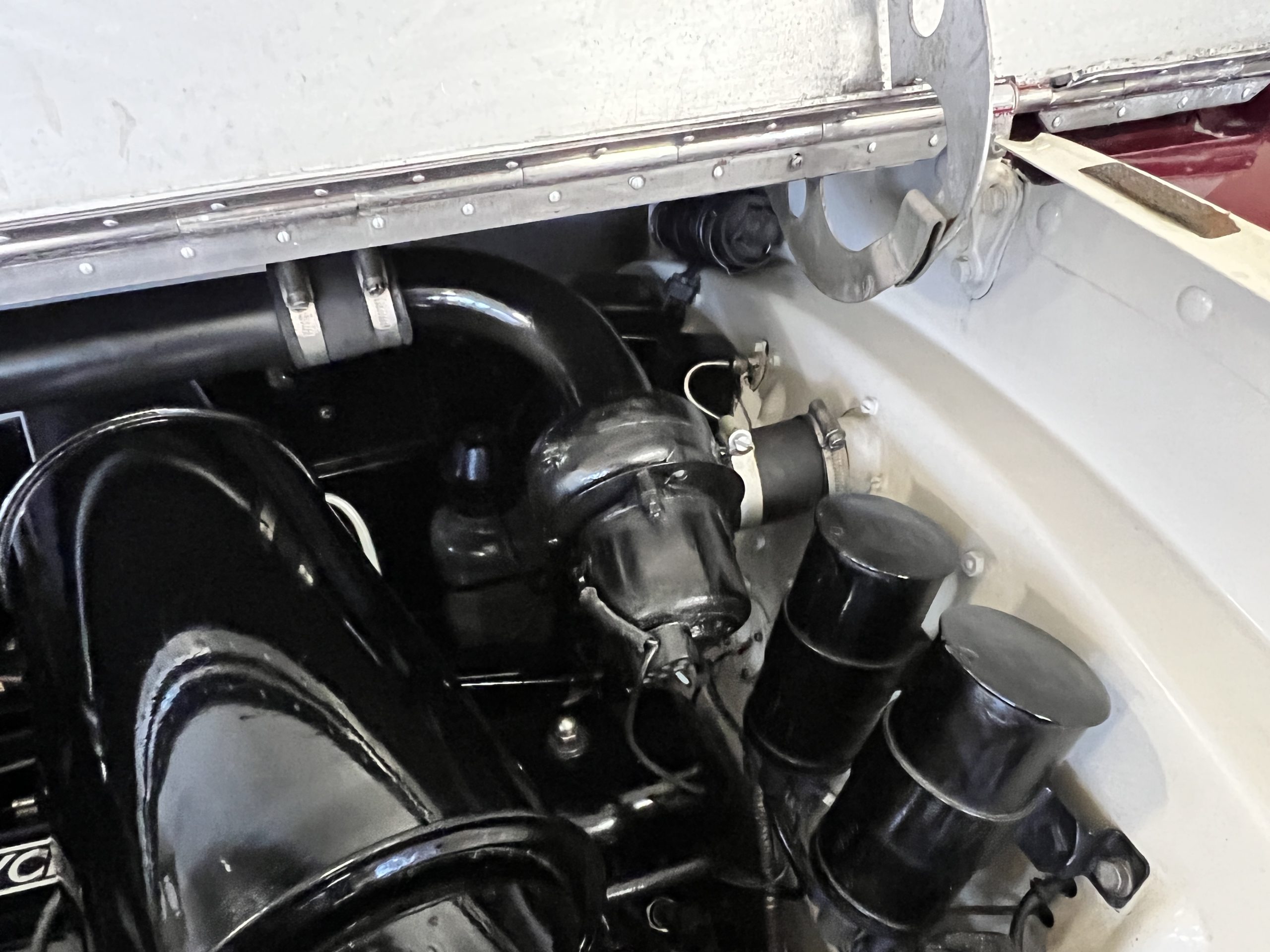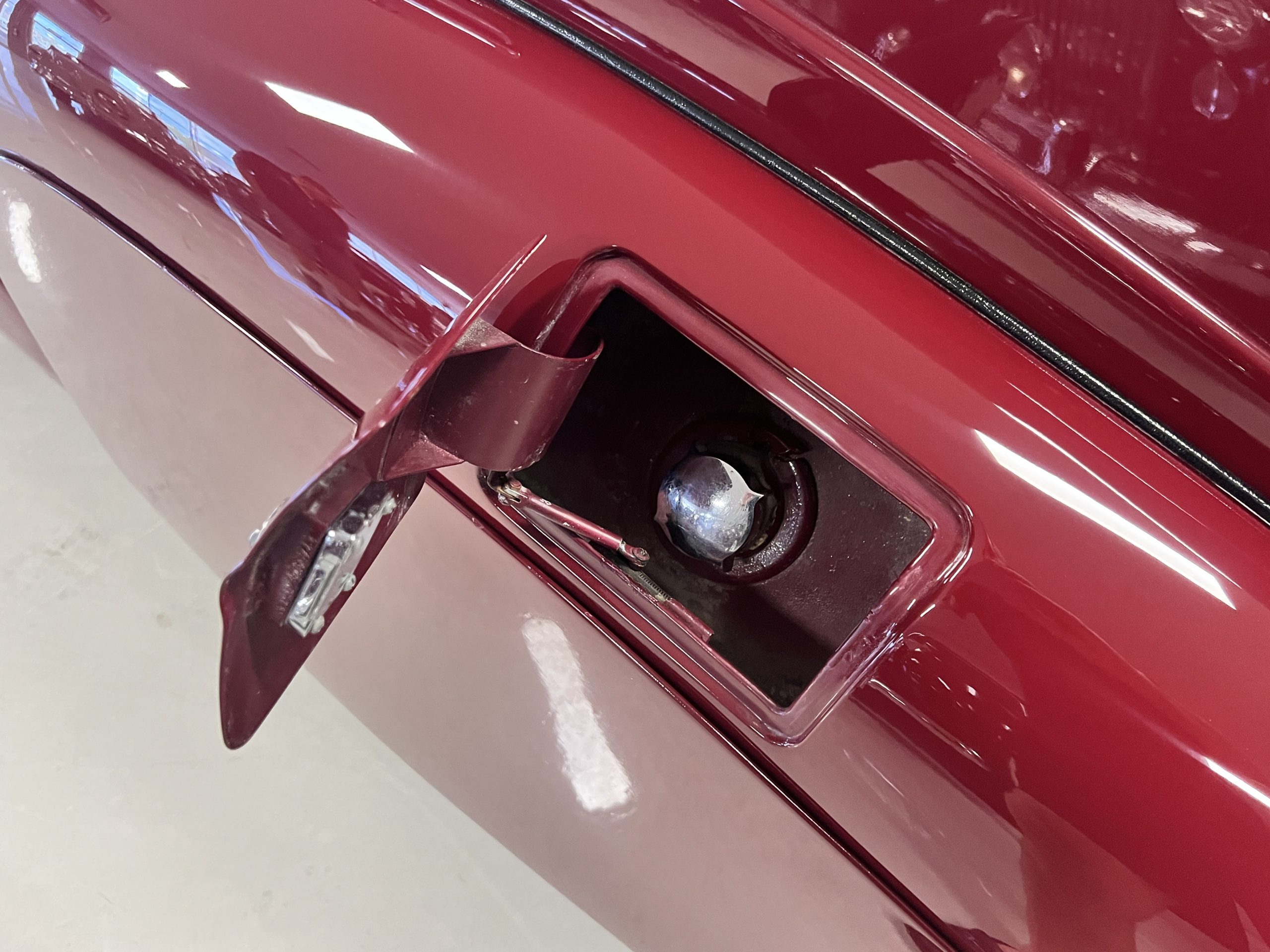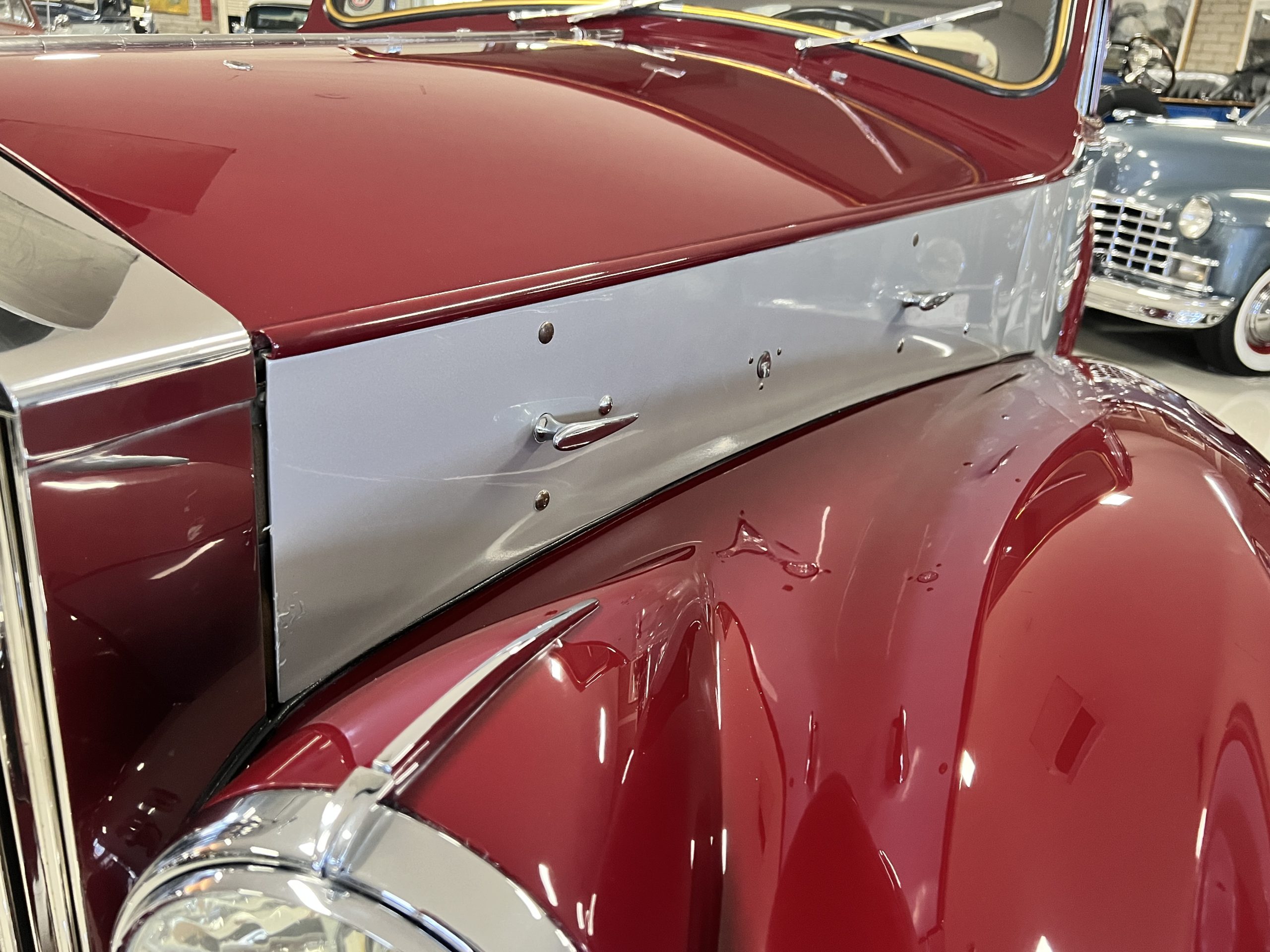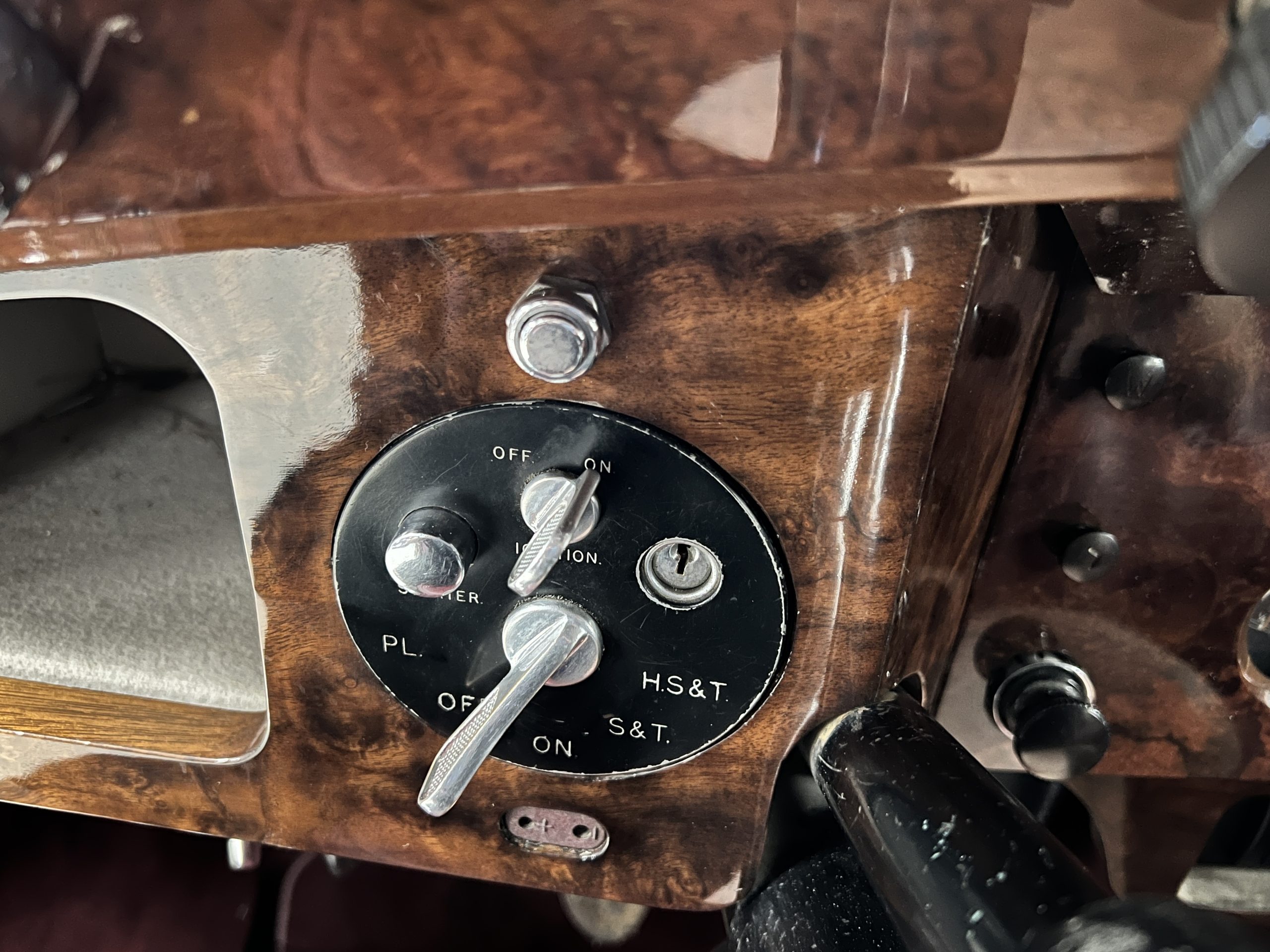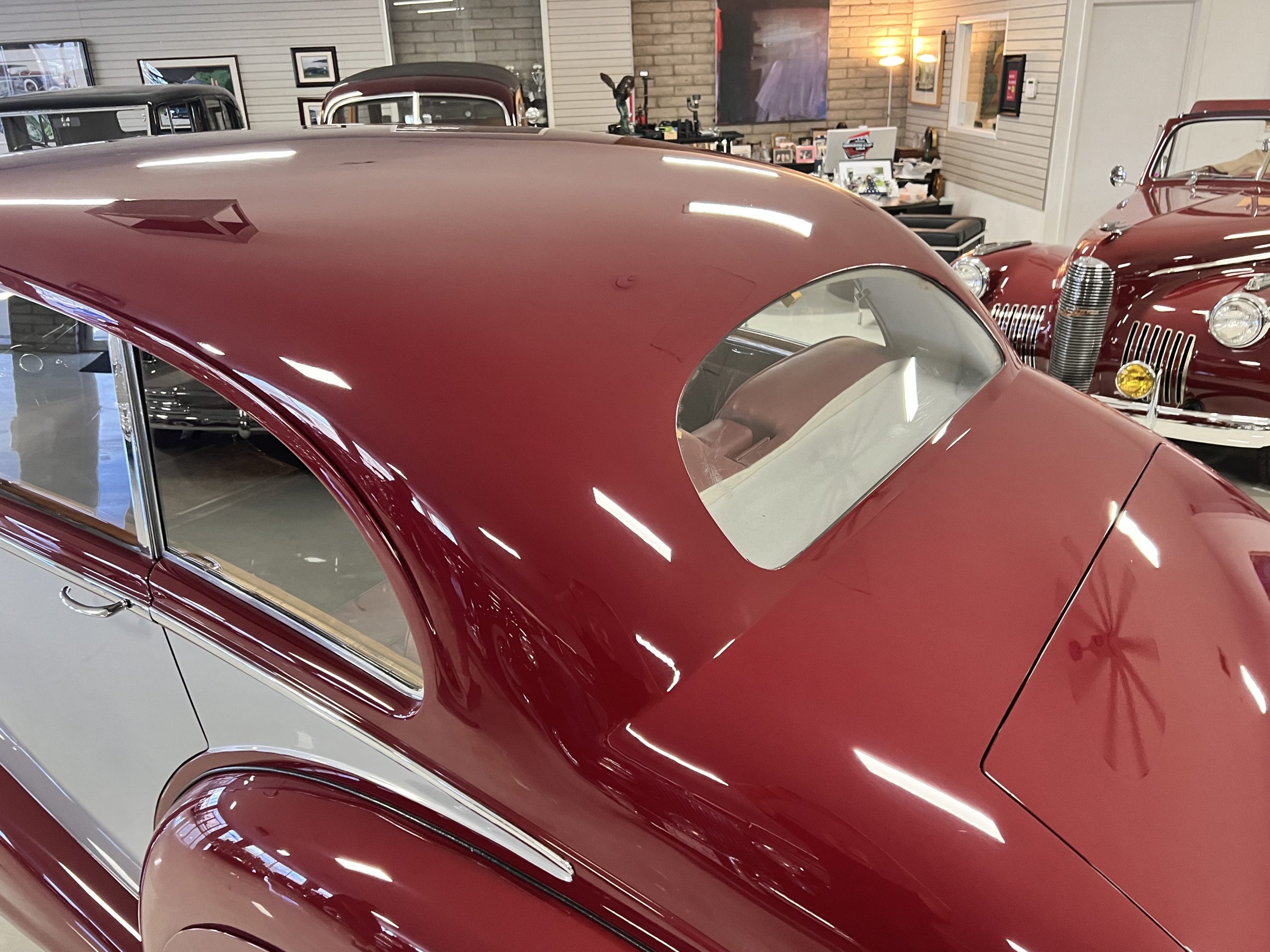 The interior is a matching Burgundy leather and Wilton wool that looks perfect with the paint colors. The gray wool broadcloth headliner is the perfect complement to the burgundy leather. The interior was done by Mike Ambrose who has prepared many concours classics for Pebble Beach. The wood has all been refinished and is in good to very good condition. This Wraith was ordered with an electric driver’s door window. An area for improvement is the missing inside rear window surround.