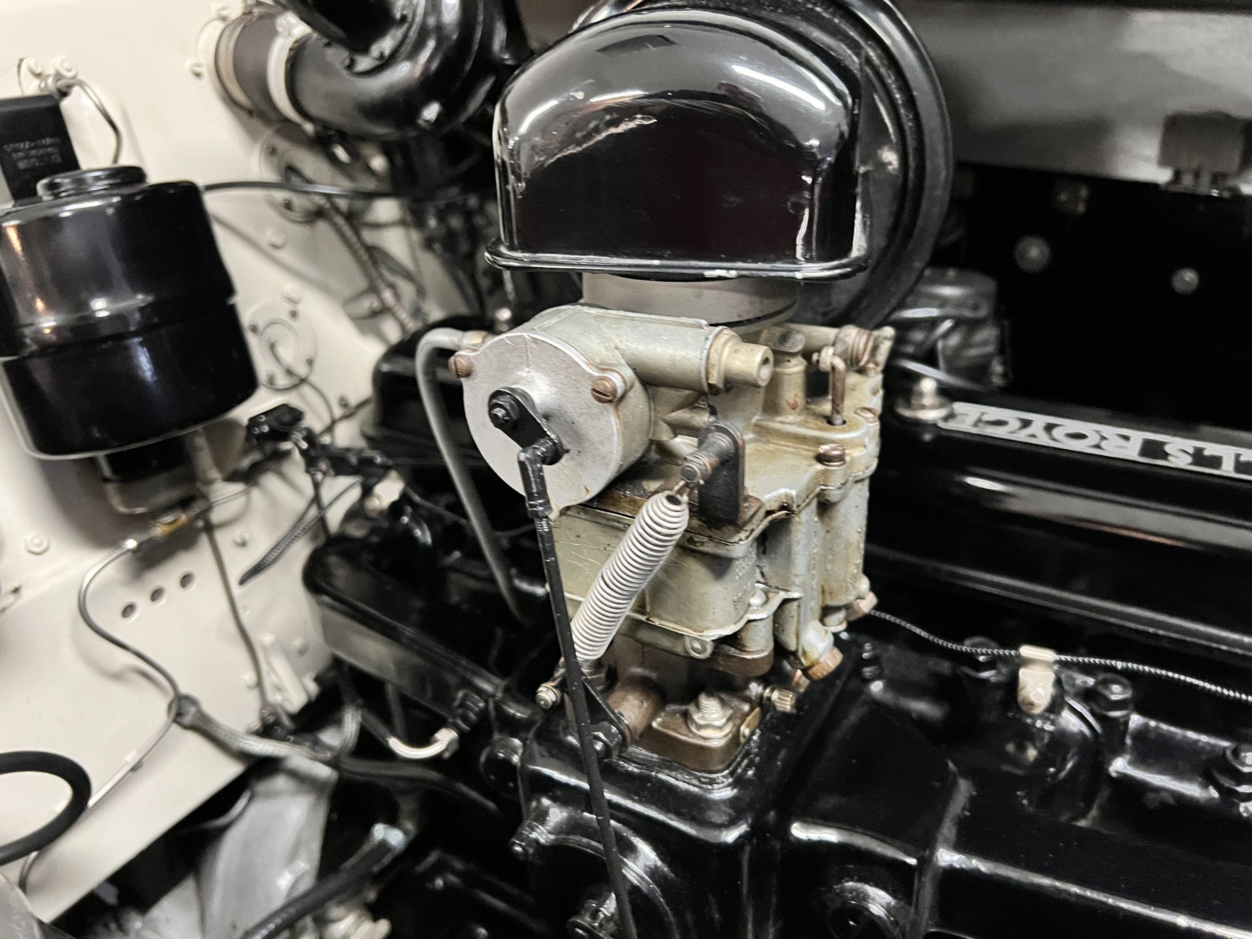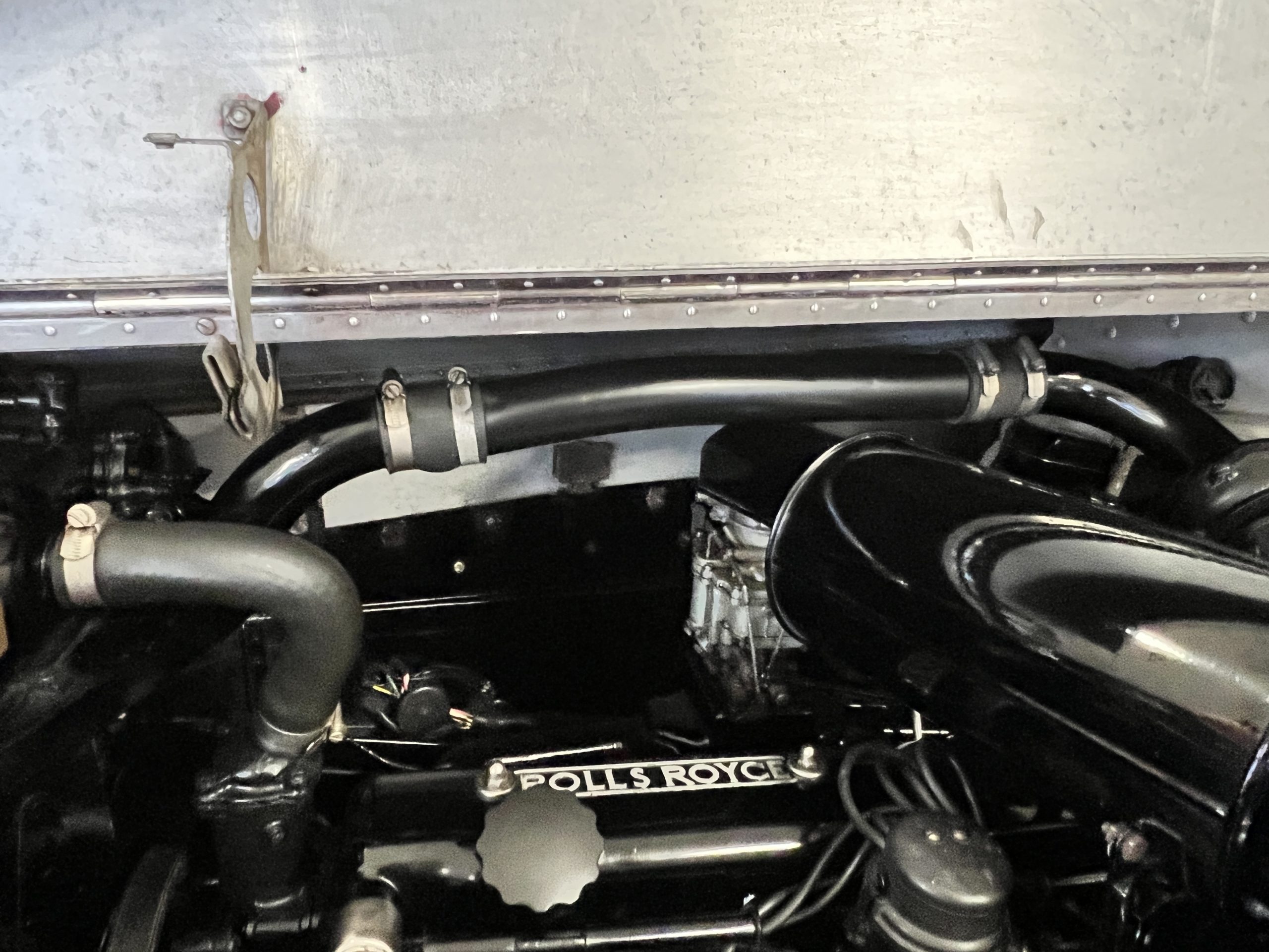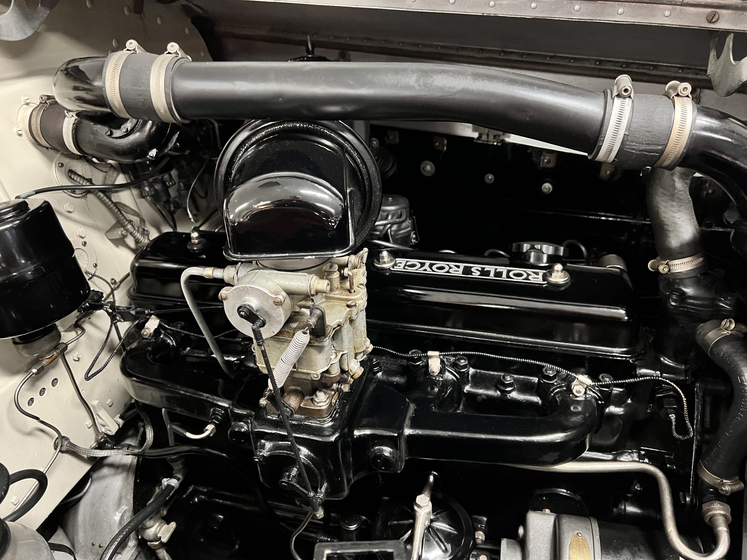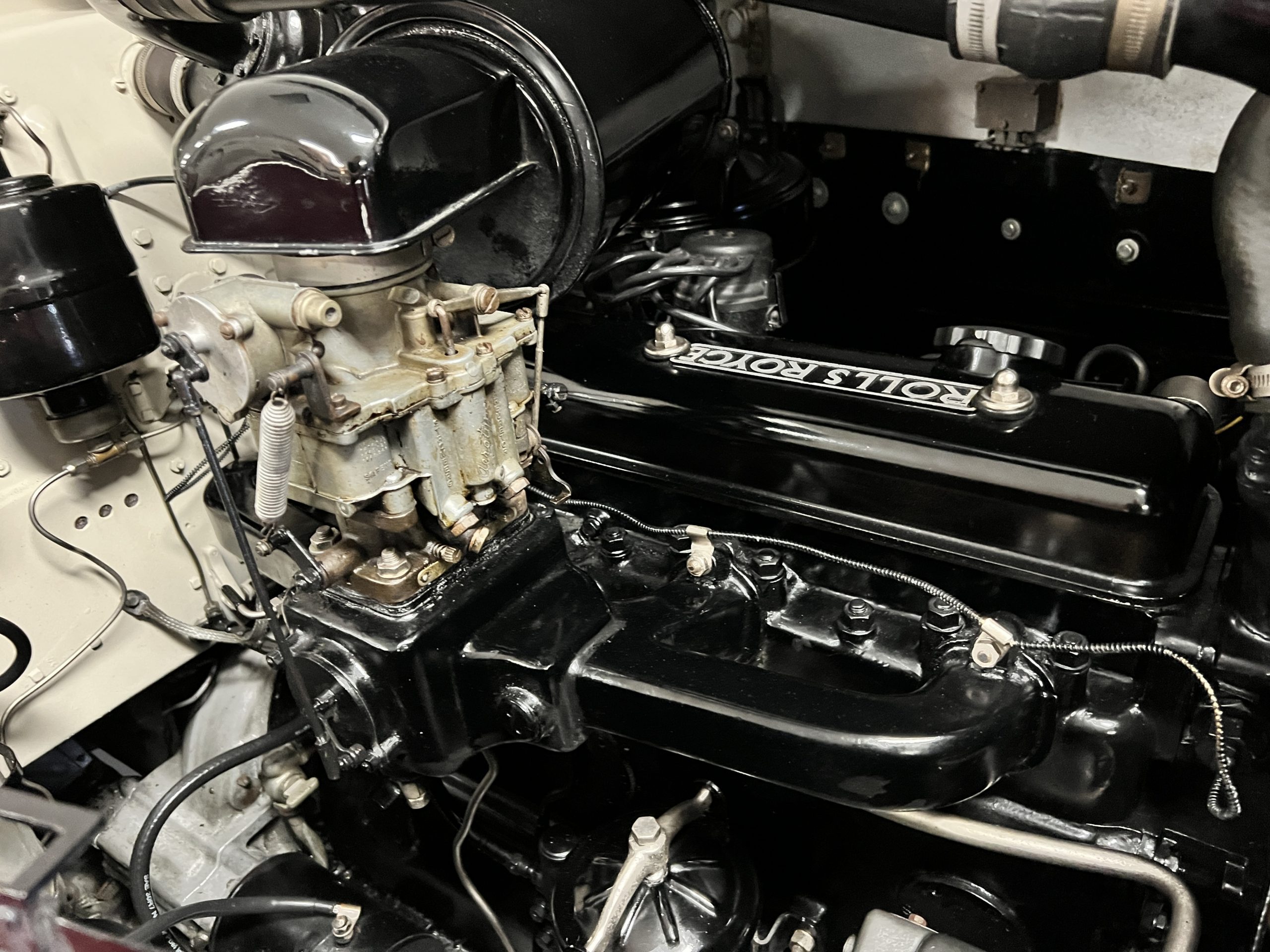 The engine compartment is detailed for show and is in wonderful condition today. The Silver Wraith performs well and ran cool even in 110-degree F weather here in Phoenix. Its venerable 4.3 liter straight six cylinder is quiet and smooth with excellent power. The four-speed manual column shift is easy to use and shifts with confidence. The chassis has been cleaned and painted and is very presentable today. The wiring has been replaced with a new wiring harness.