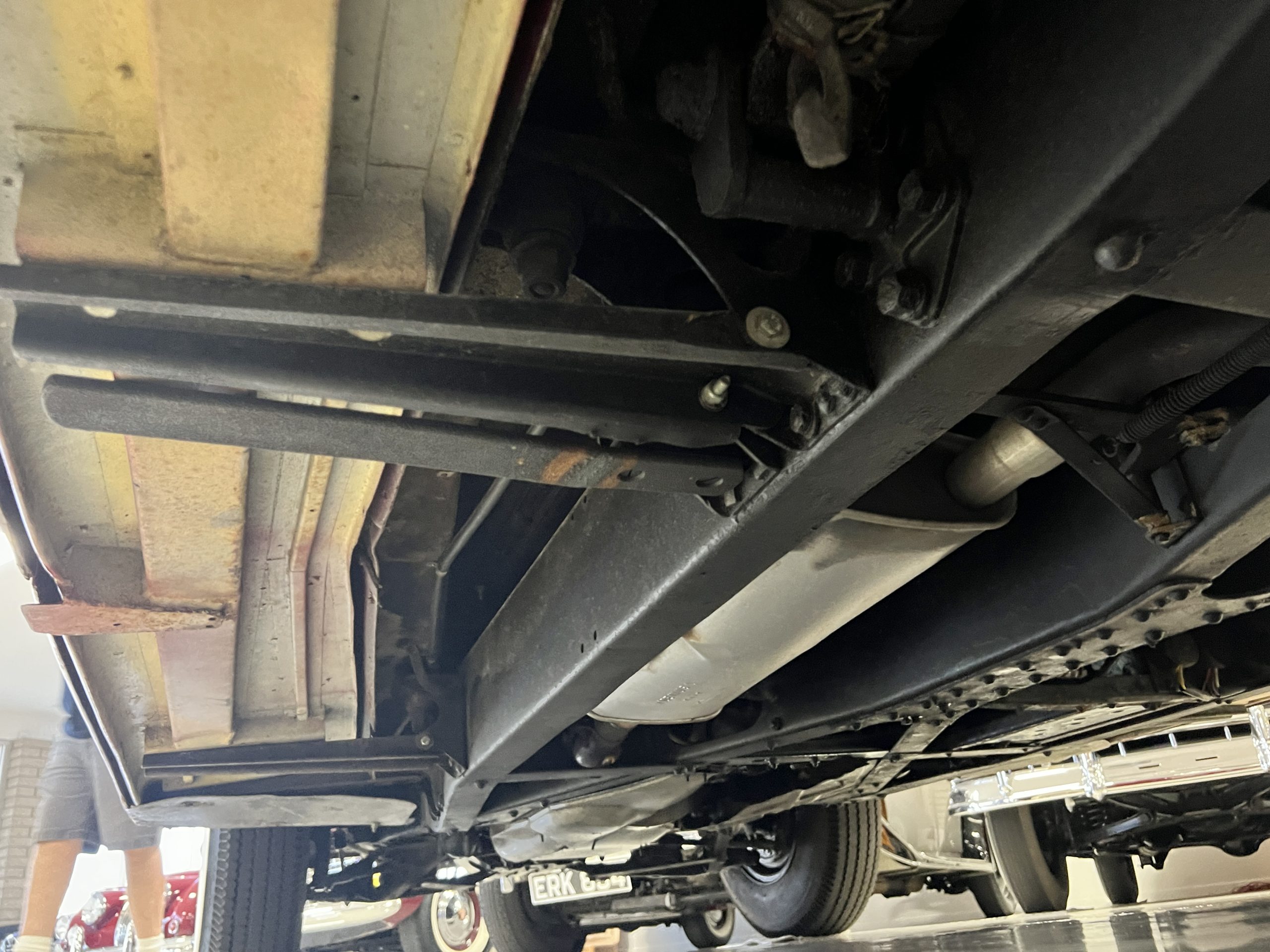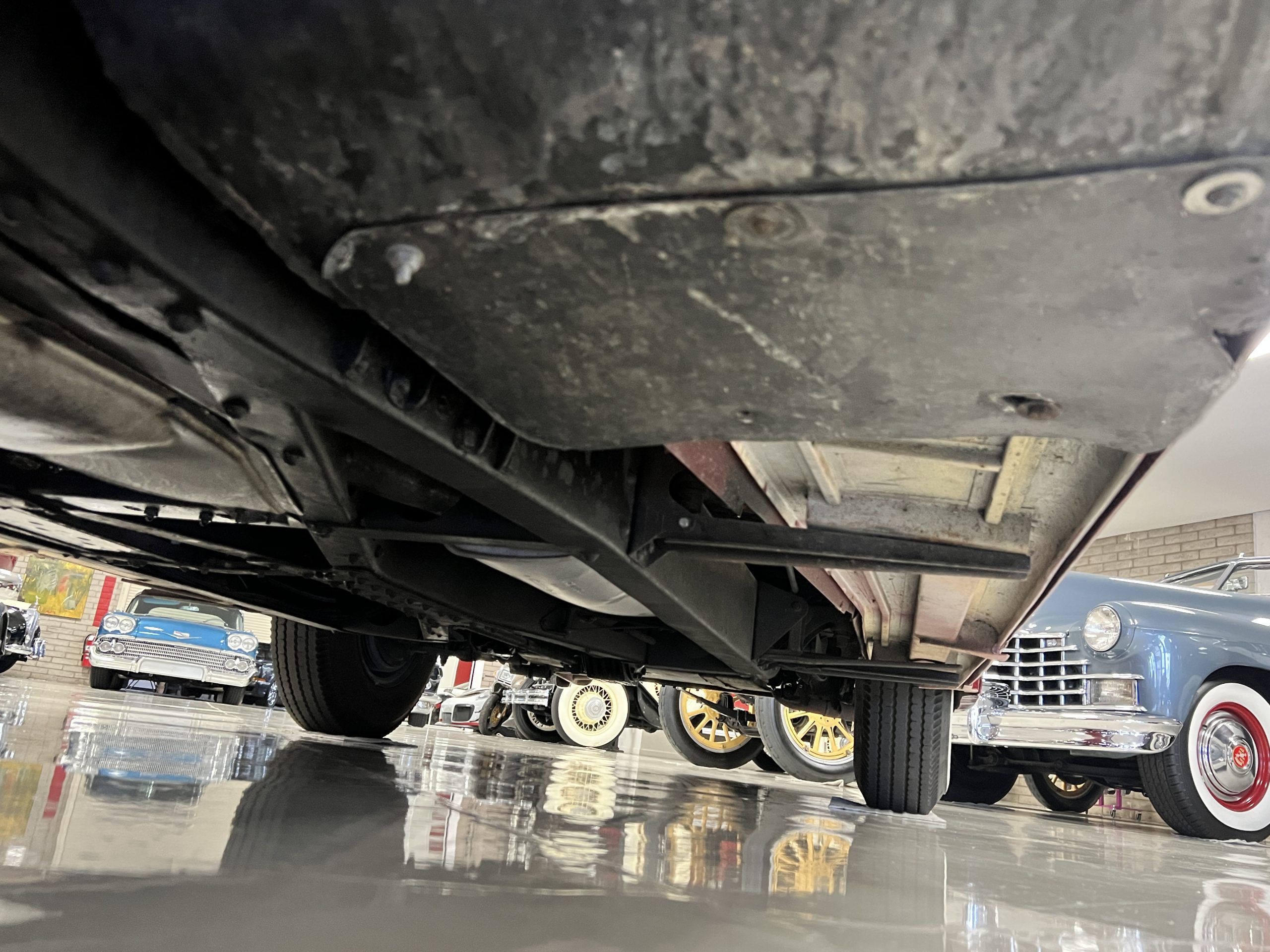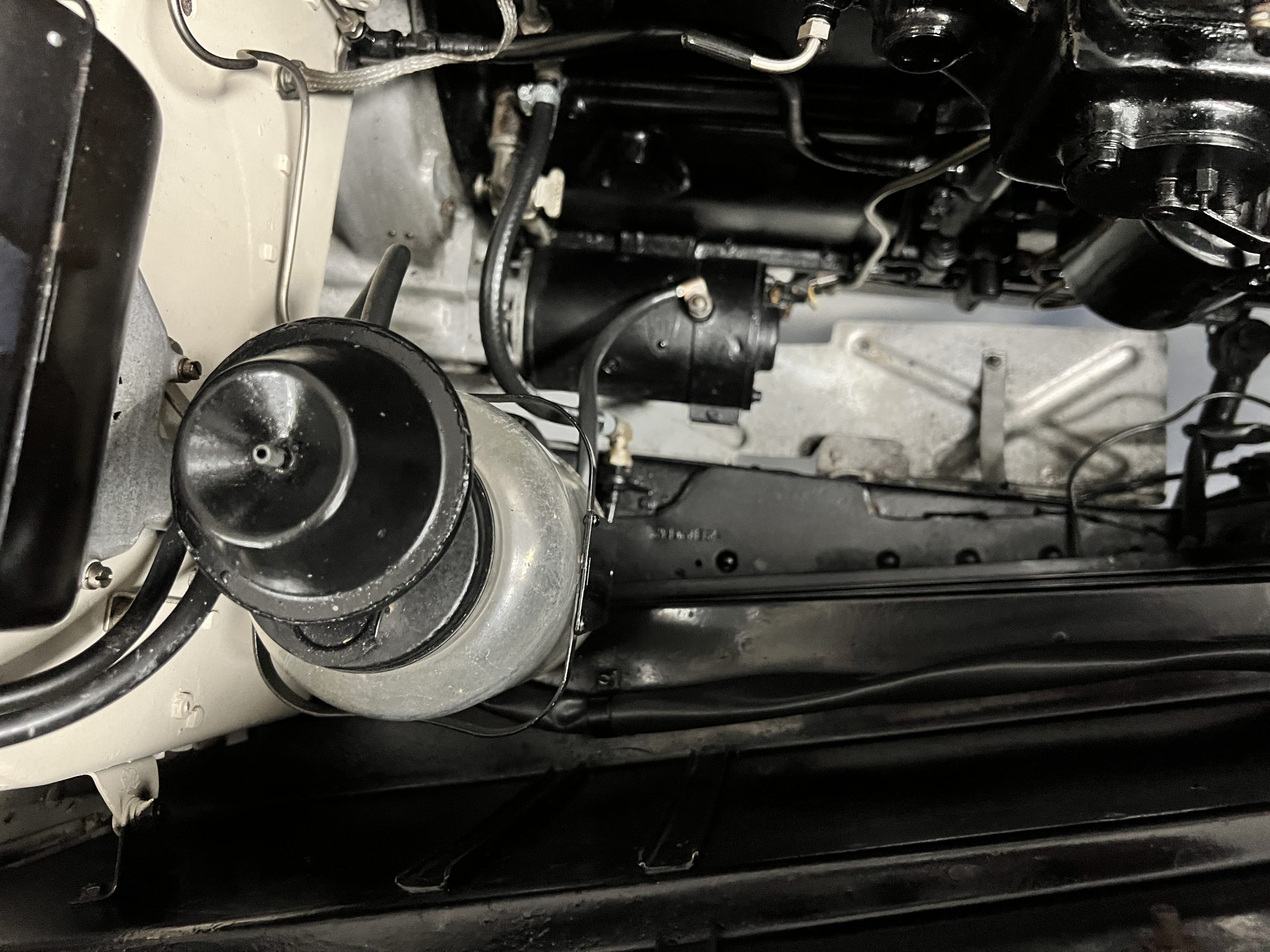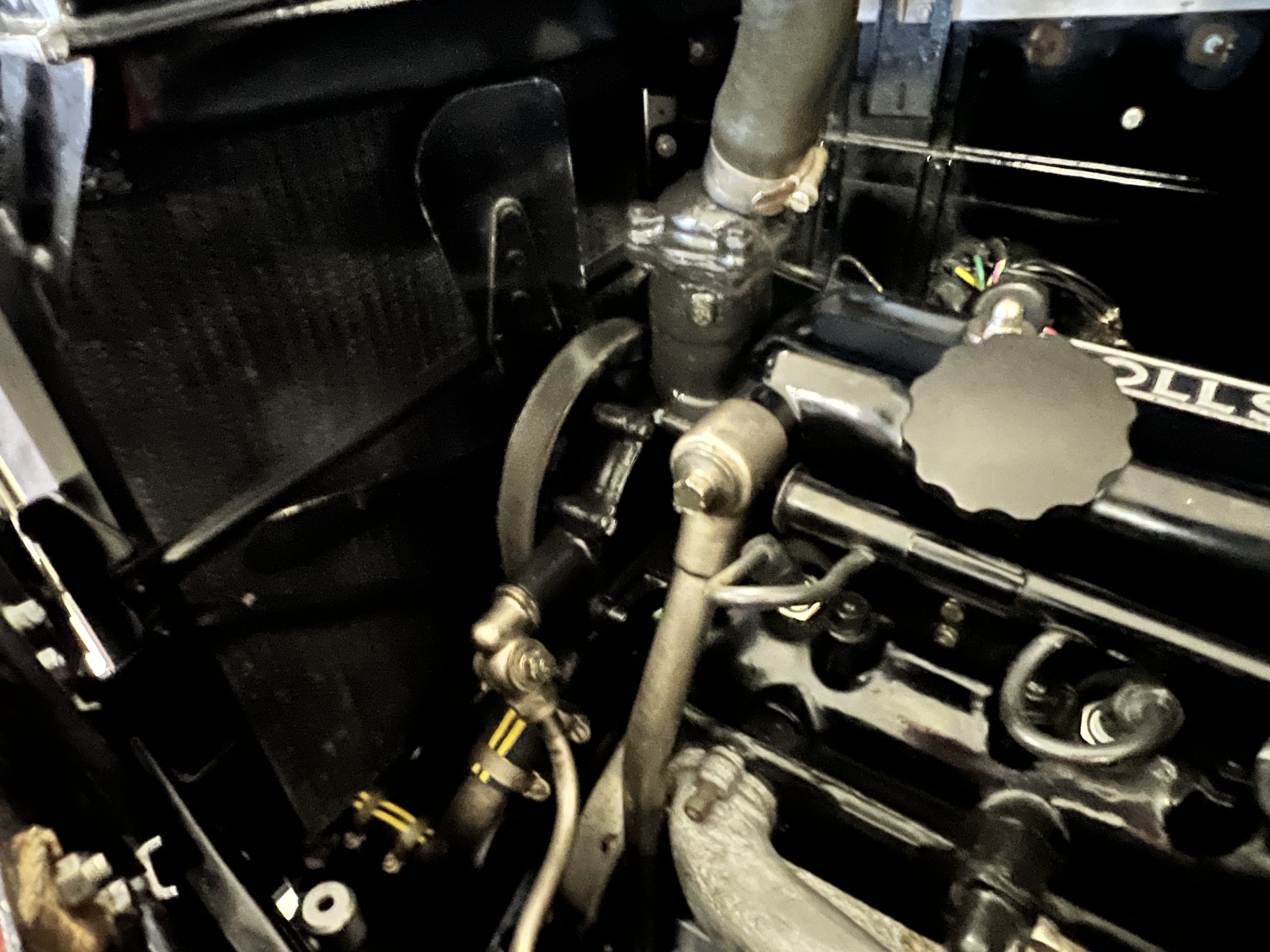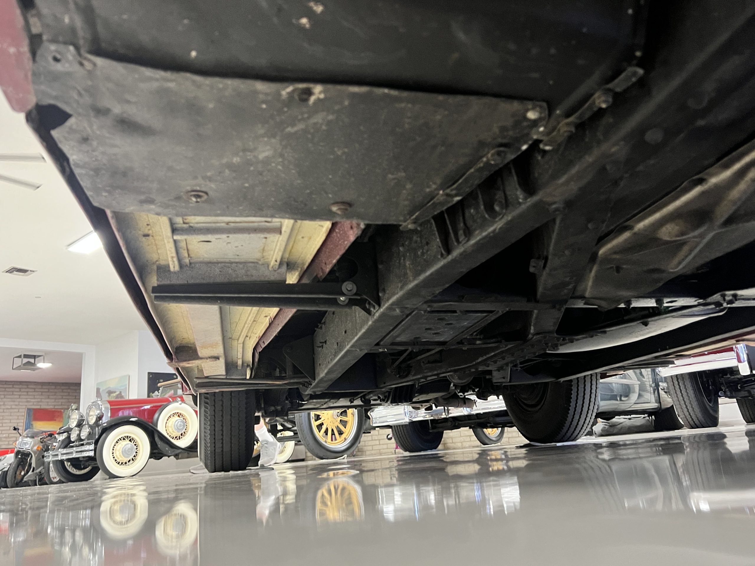 The engine compartment is detailed for show and is in wonderful condition today. The Silver Wraith performs well and ran cool even in 110-degree F weather here in Phoenix. Its venerable 4.3 liter straight six cylinder is quiet and smooth with excellent power. The four-speed manual column shift is easy to use and shifts with confidence. The chassis has been cleaned and painted and is very presentable today. The wiring has been replaced with a new wiring harness.