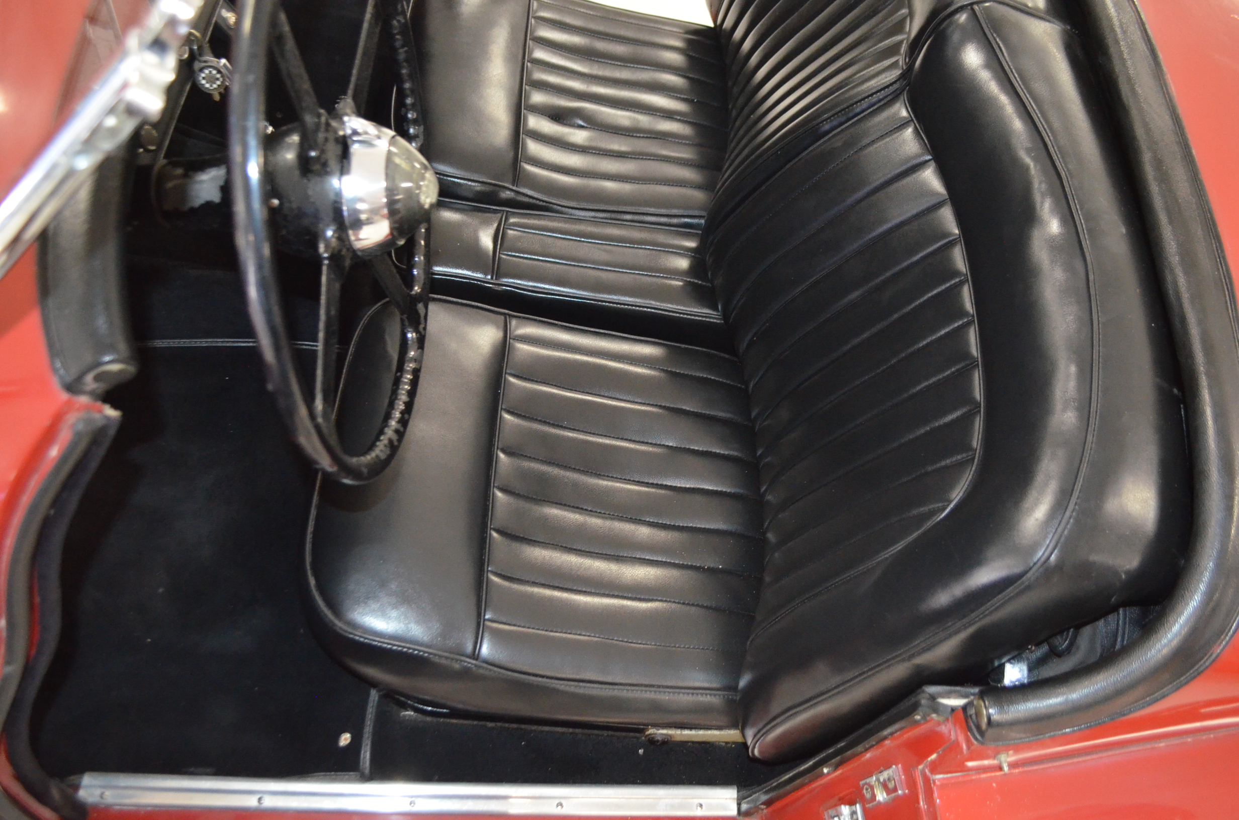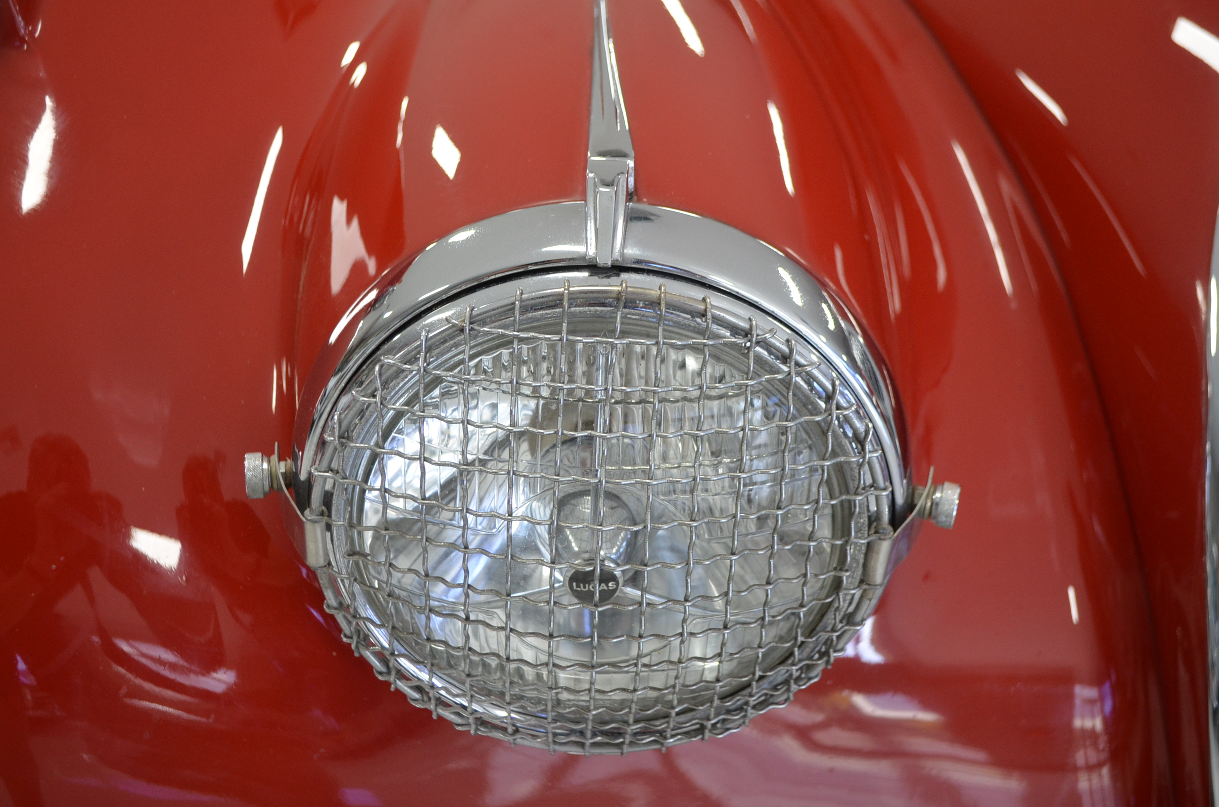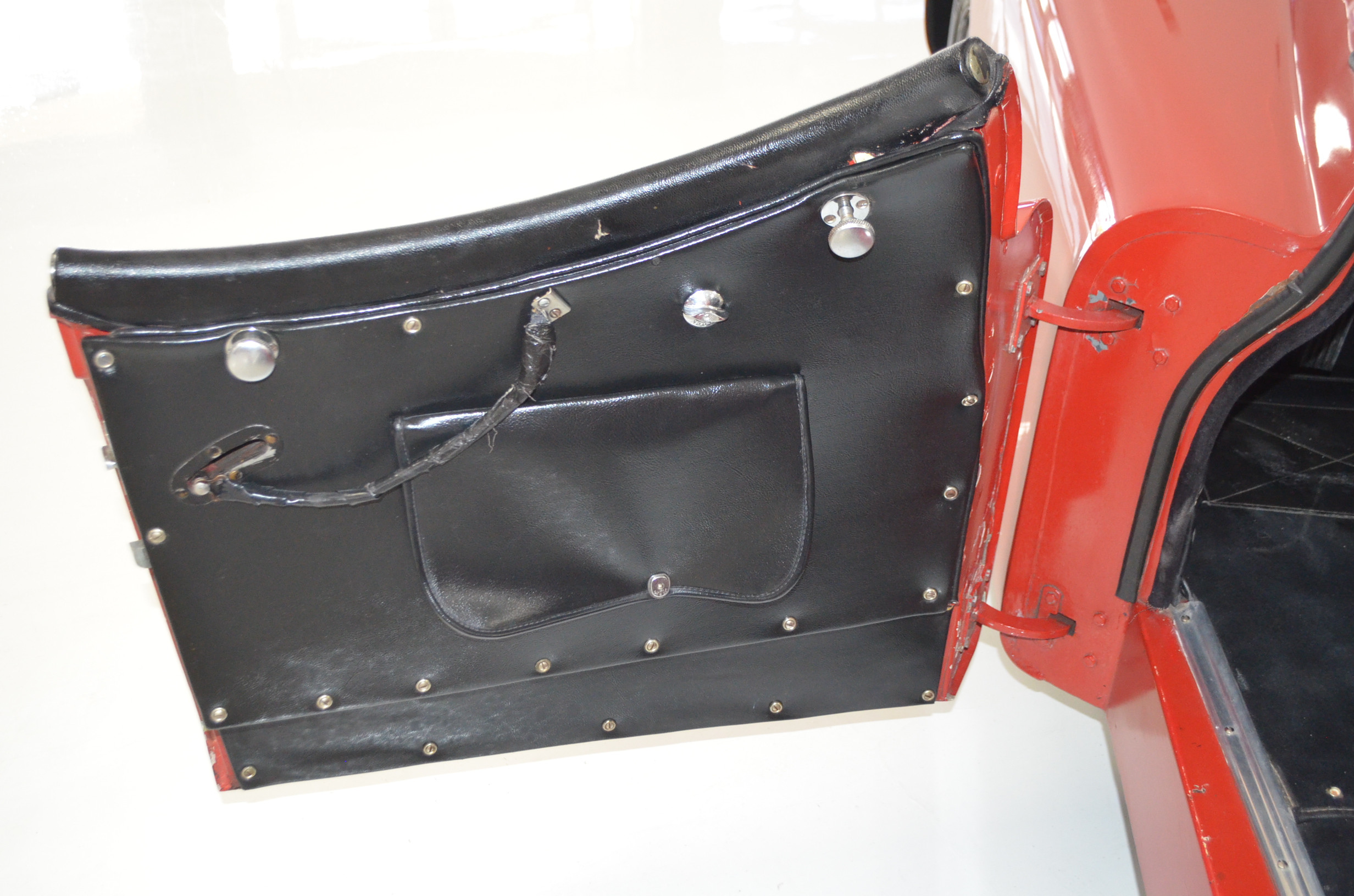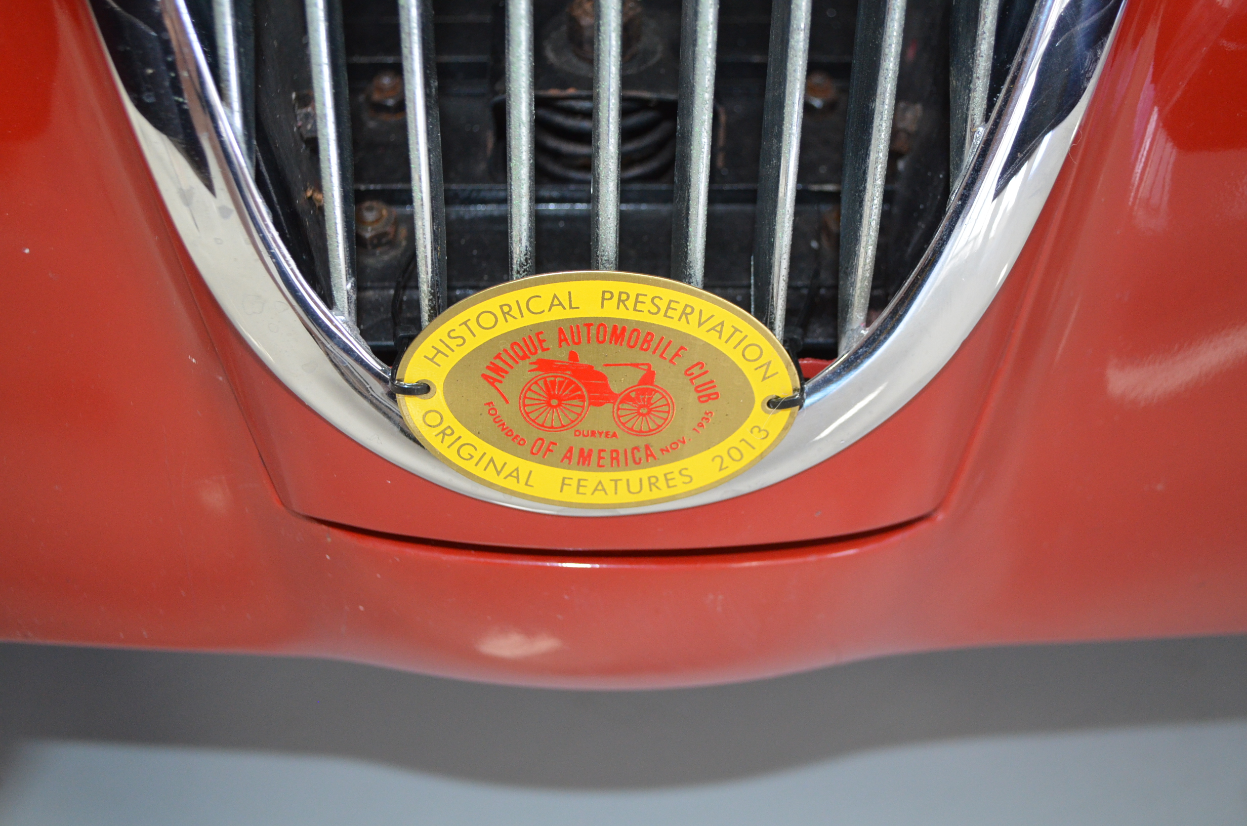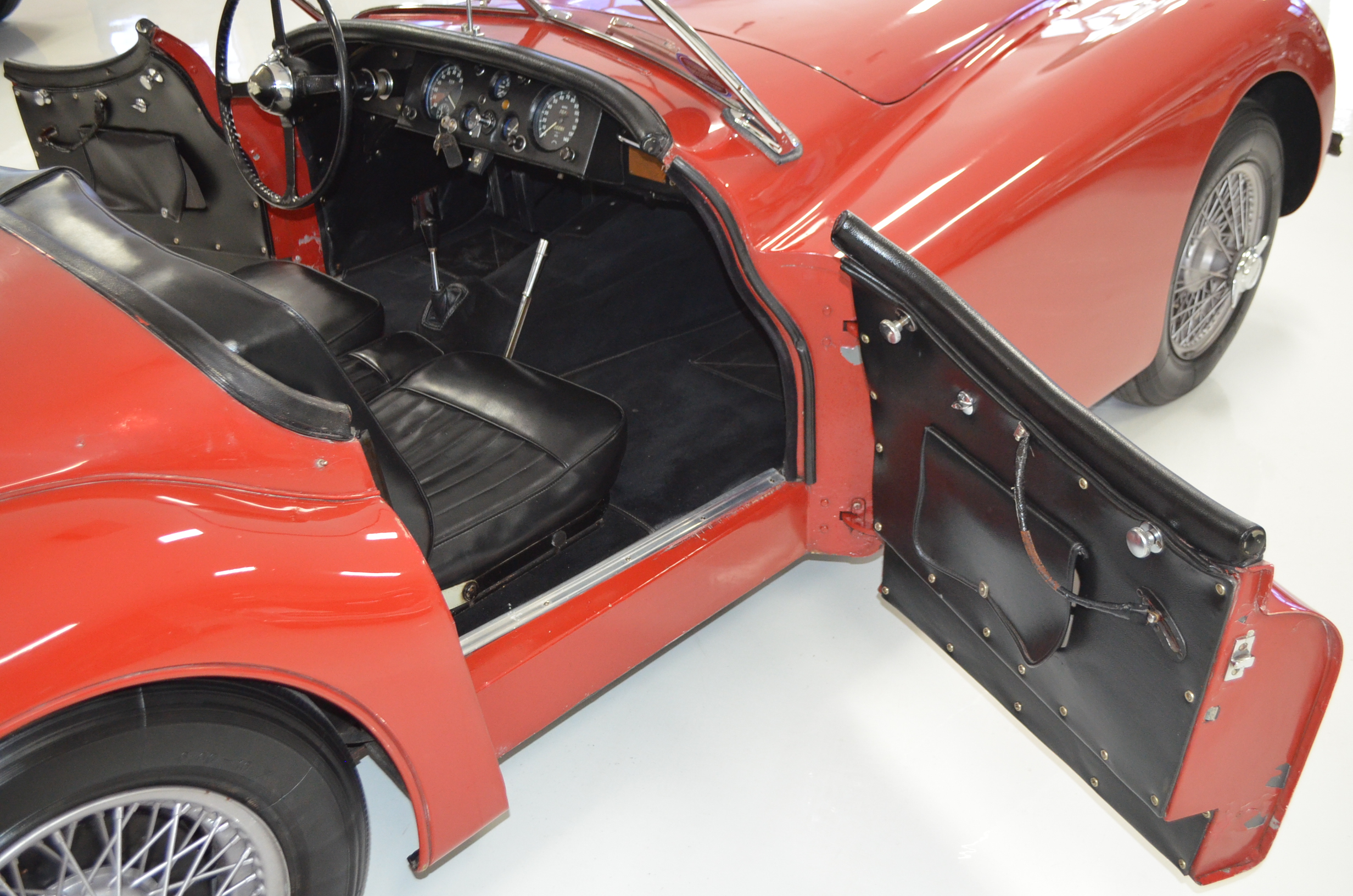 This car has been enjoyed in good weather most of its life, because it is free of rust. It had been repainted in the original red paint decades ago and remains in touring quality condition today. Since under our stewardship, we’ve rubbed out the paint and had many of the small dents removed, mainly from the aluminum. The doors, trunk (boot) and hood (bonnet) are all crafted from aluminum. The paint overall looks very nice for touring, but up close there are several areas where there is some cracking and other blemishes. But it looks sharp!