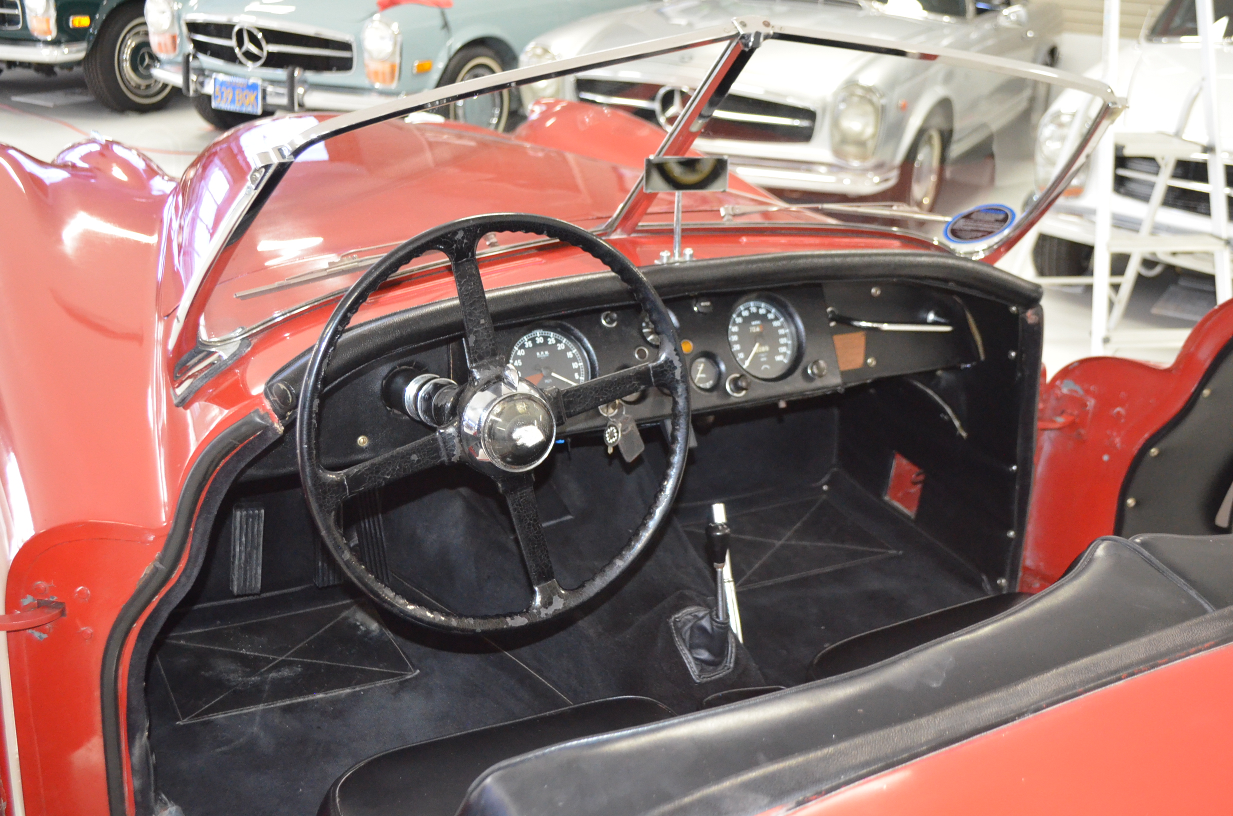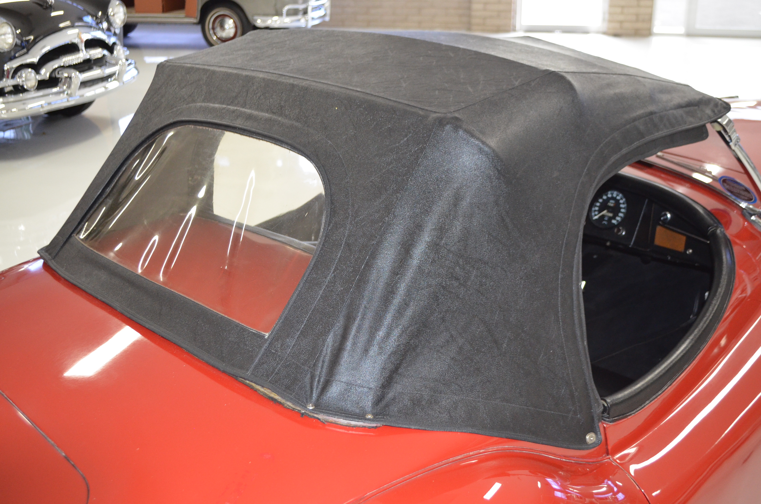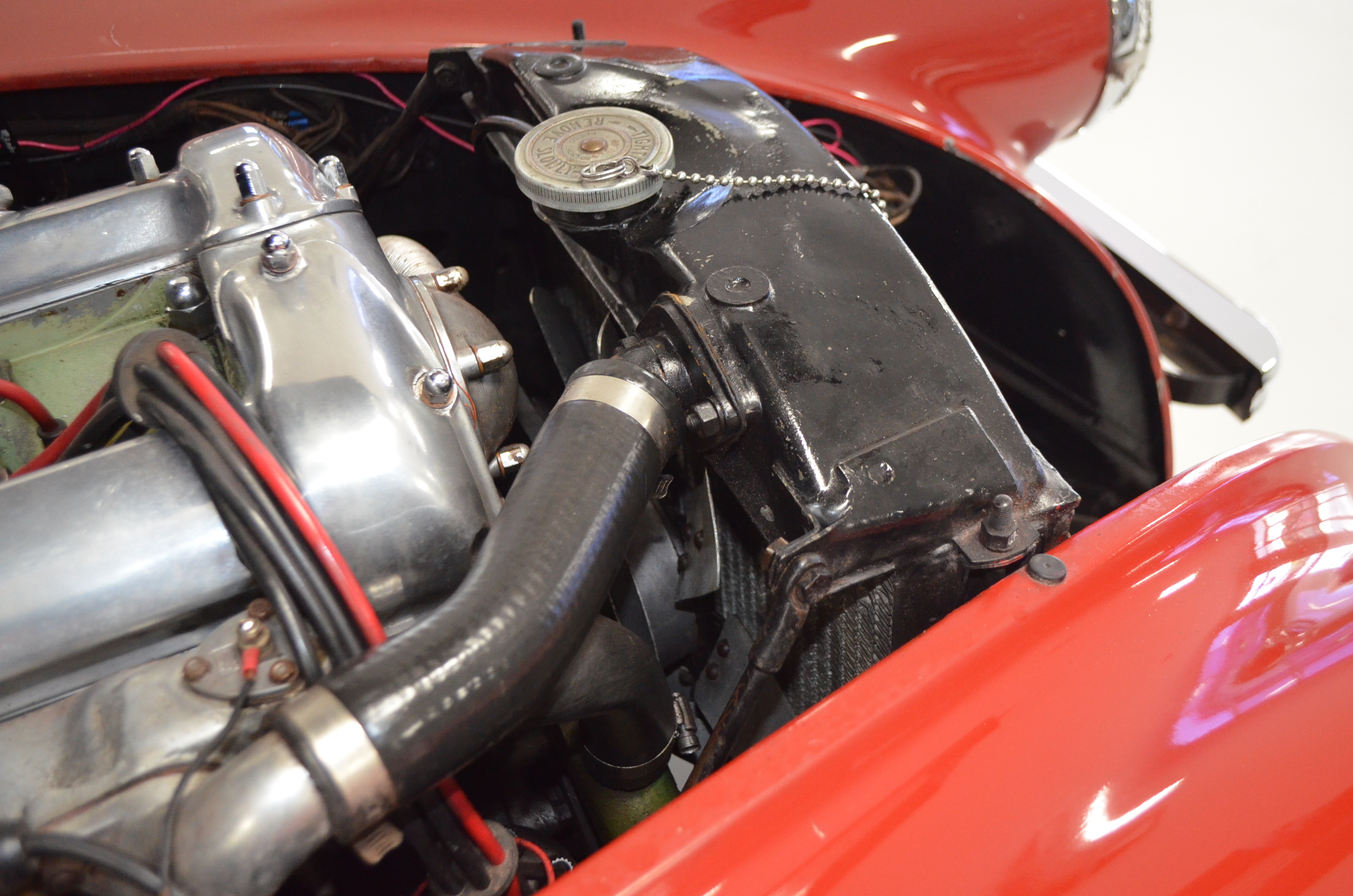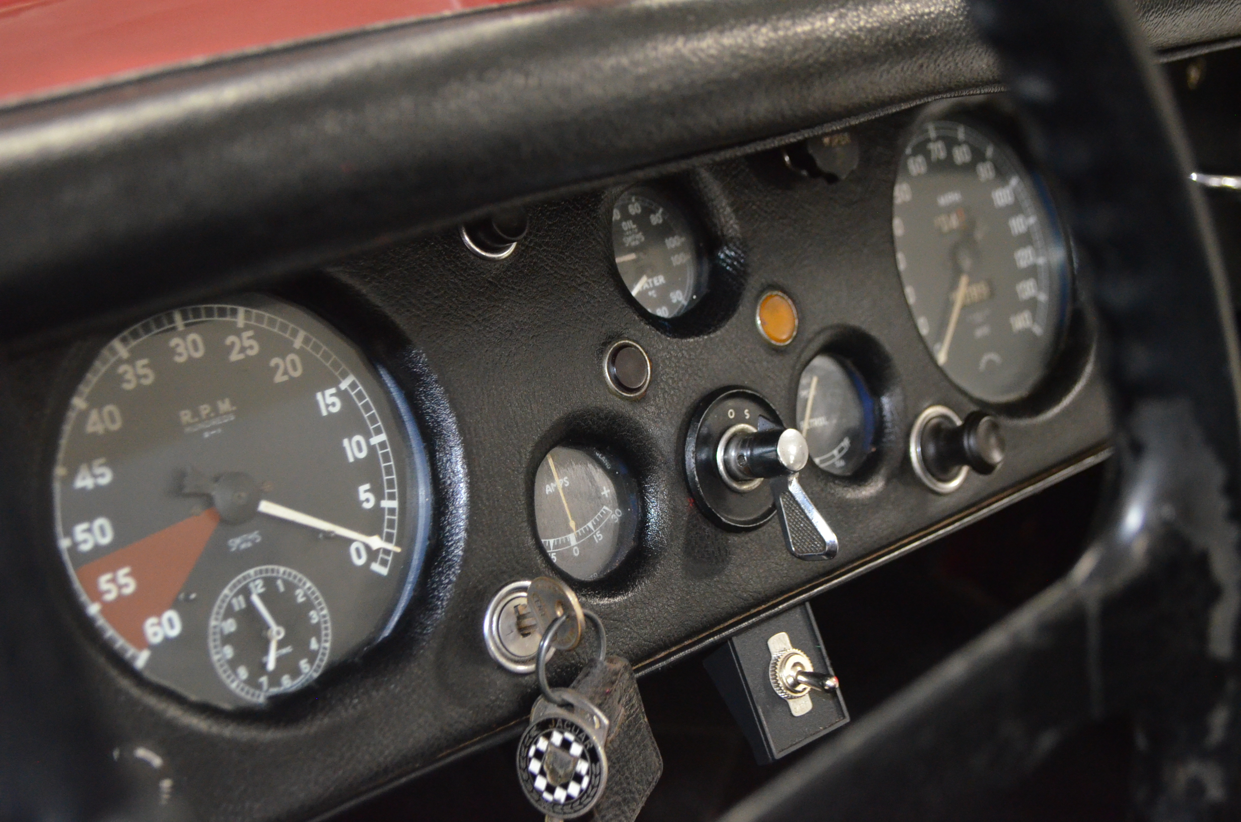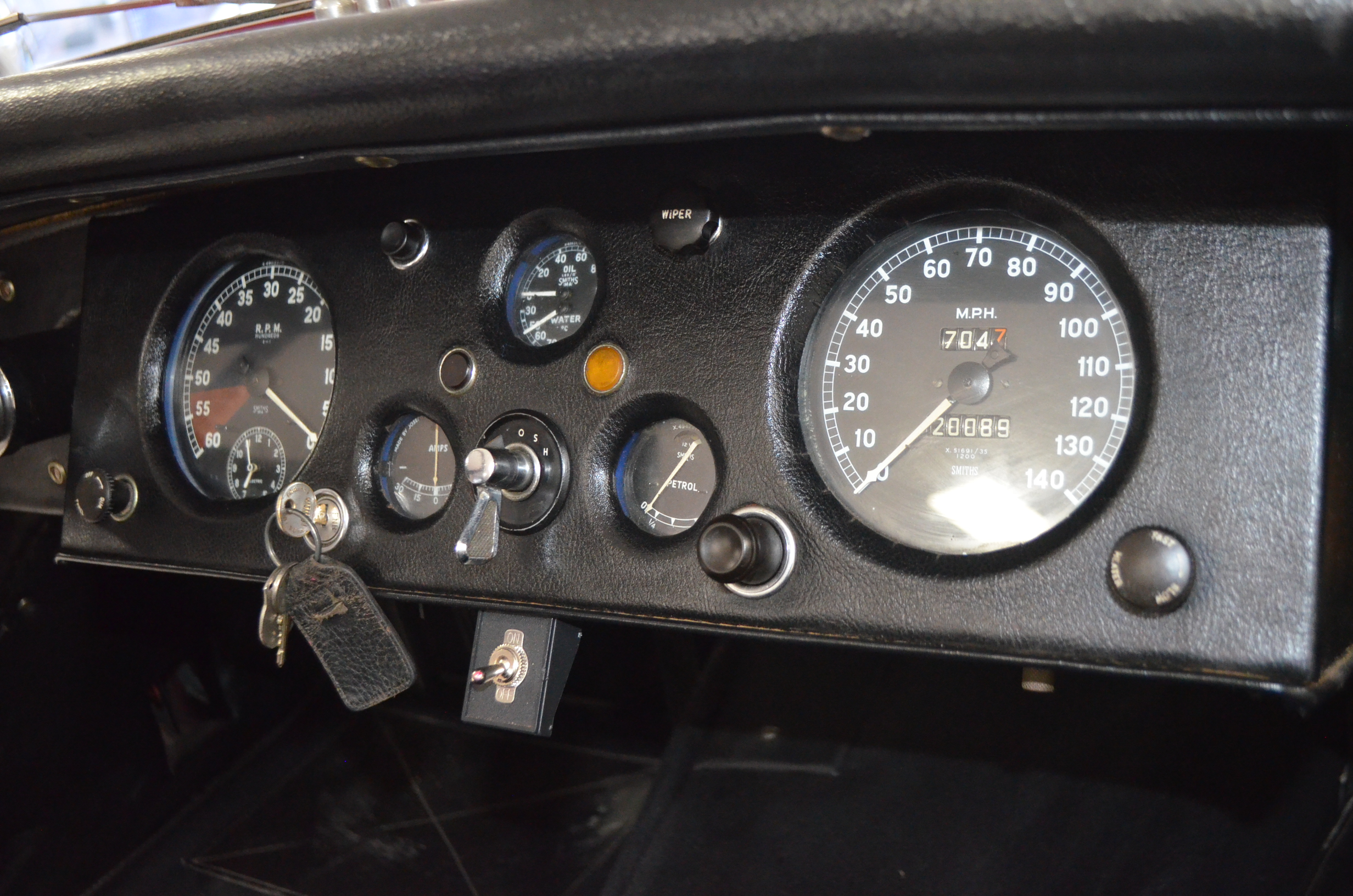 This car has been enjoyed in good weather most of its life, because it is free of rust. It had been repainted in the original red paint decades ago and remains in touring quality condition today. Since under our stewardship, we’ve rubbed out the paint and had many of the small dents removed, mainly from the aluminum. The doors, trunk (boot) and hood (bonnet) are all crafted from aluminum. The paint overall looks very nice for touring, but up close there are several areas where there is some cracking and other blemishes. But it looks sharp!