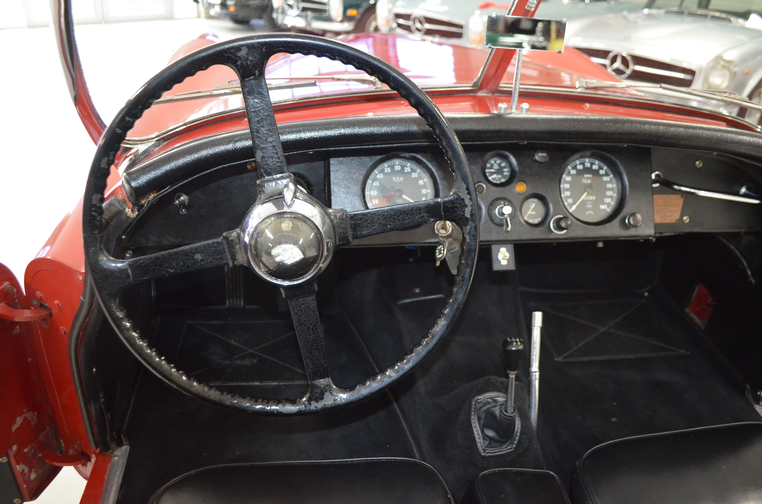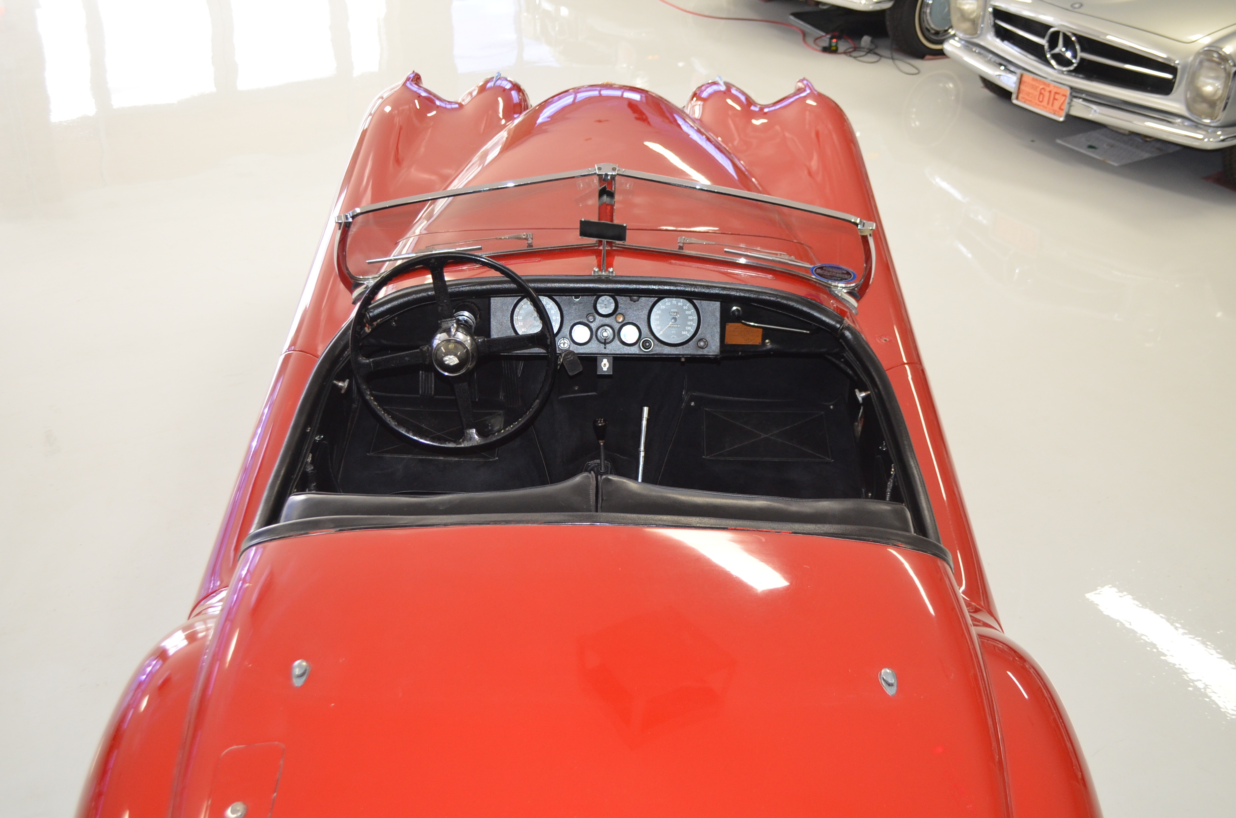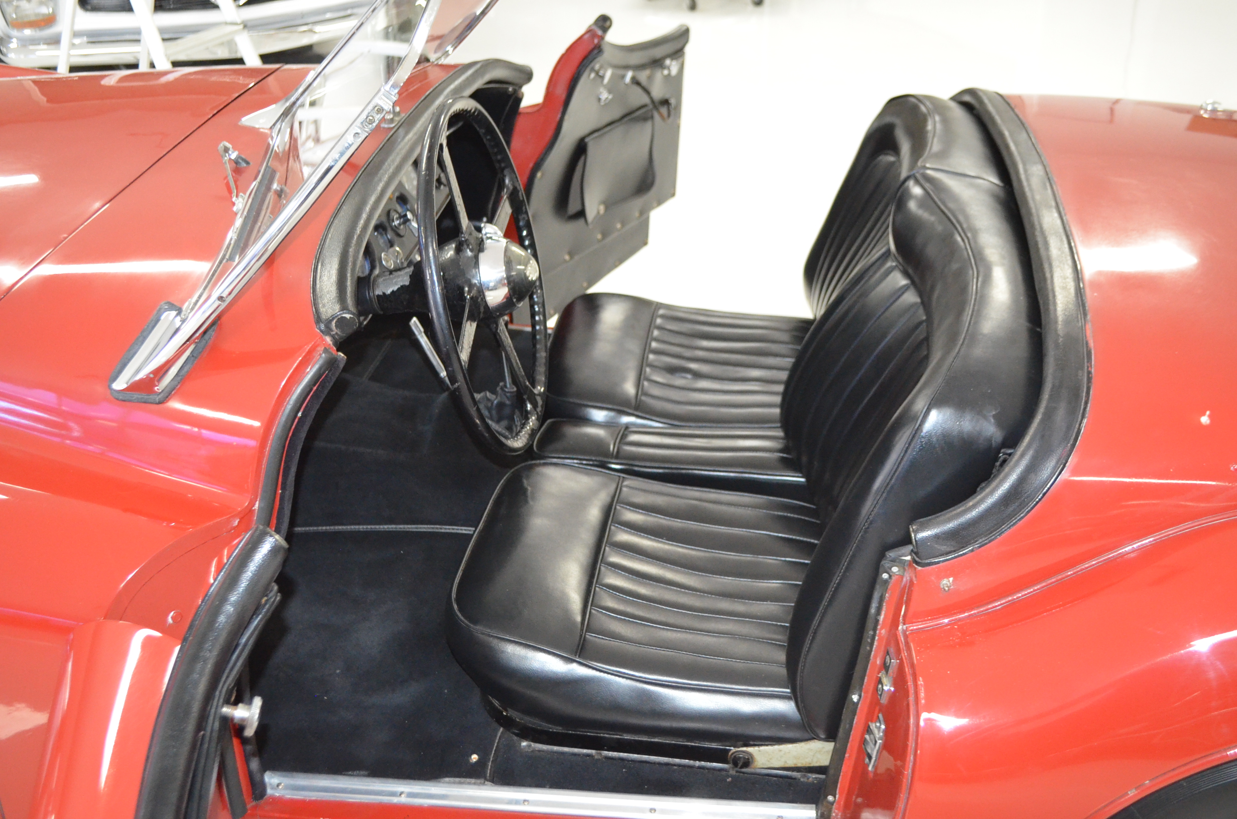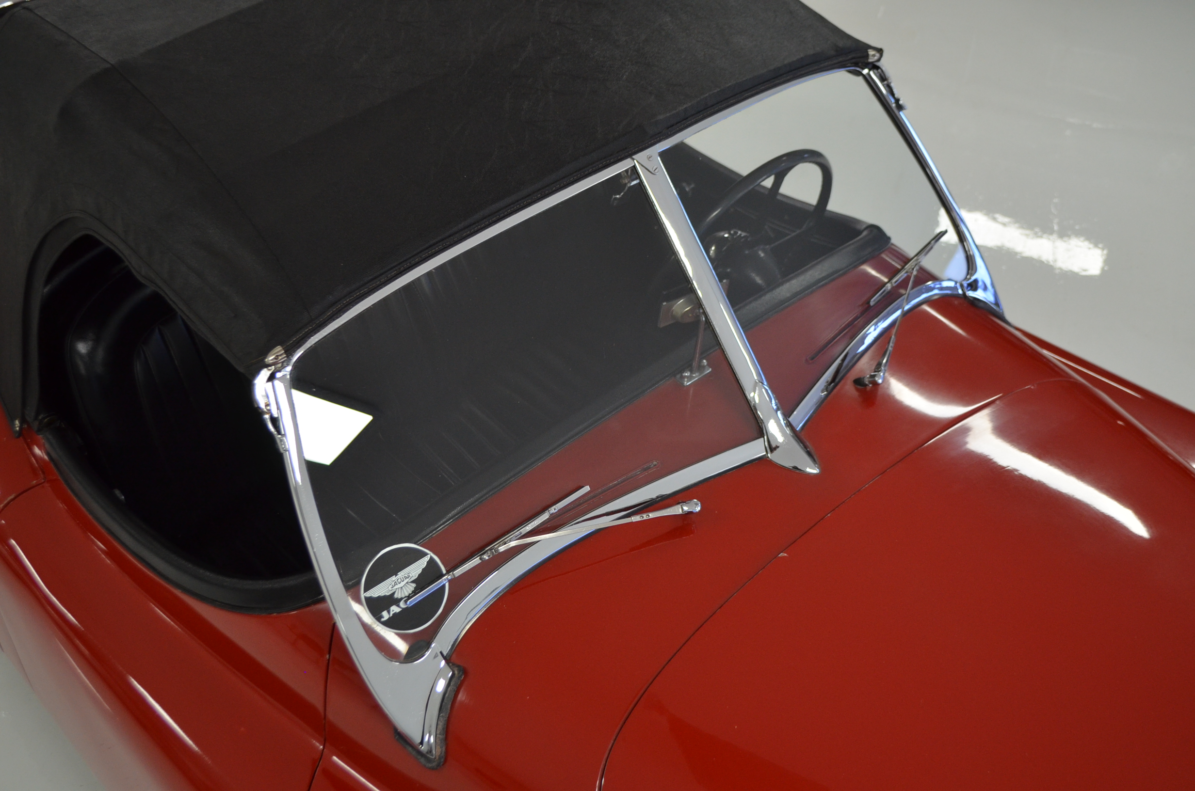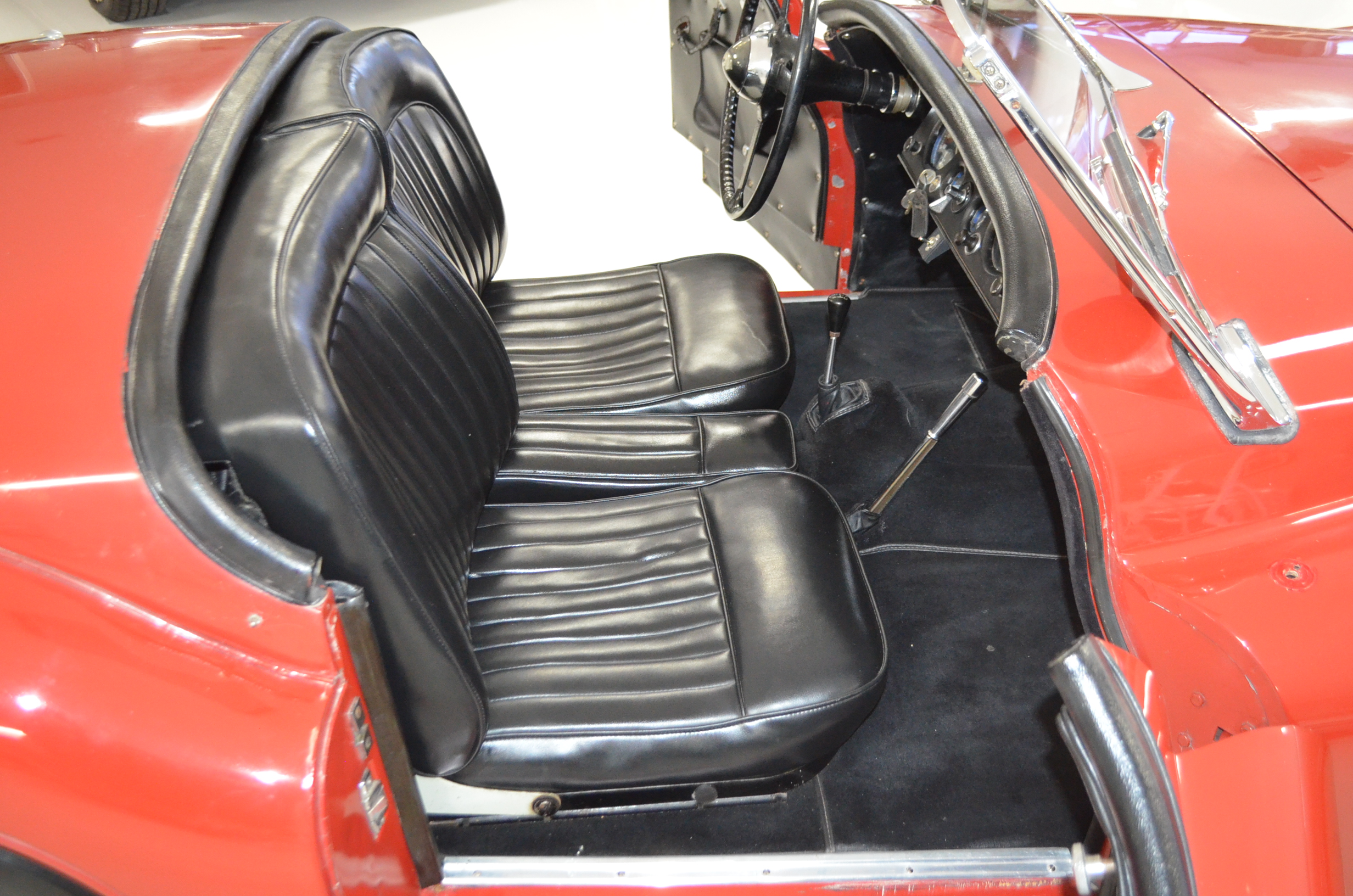 This car has been enjoyed in good weather most of its life, because it is free of rust. It had been repainted in the original red paint decades ago and remains in touring quality condition today. Since under our stewardship, we’ve rubbed out the paint and had many of the small dents removed, mainly from the aluminum. The doors, trunk (boot) and hood (bonnet) are all crafted from aluminum. The paint overall looks very nice for touring, but up close there are several areas where there is some cracking and other blemishes. But it looks sharp!
