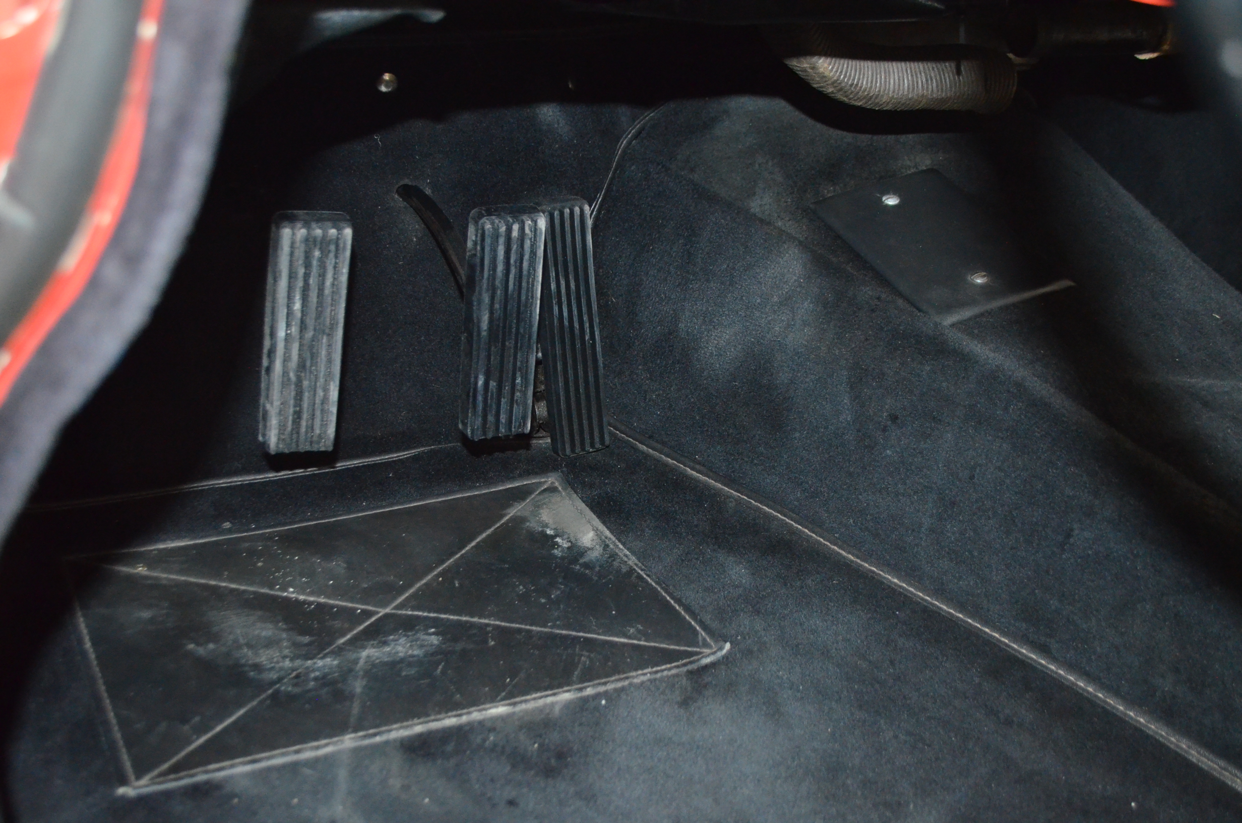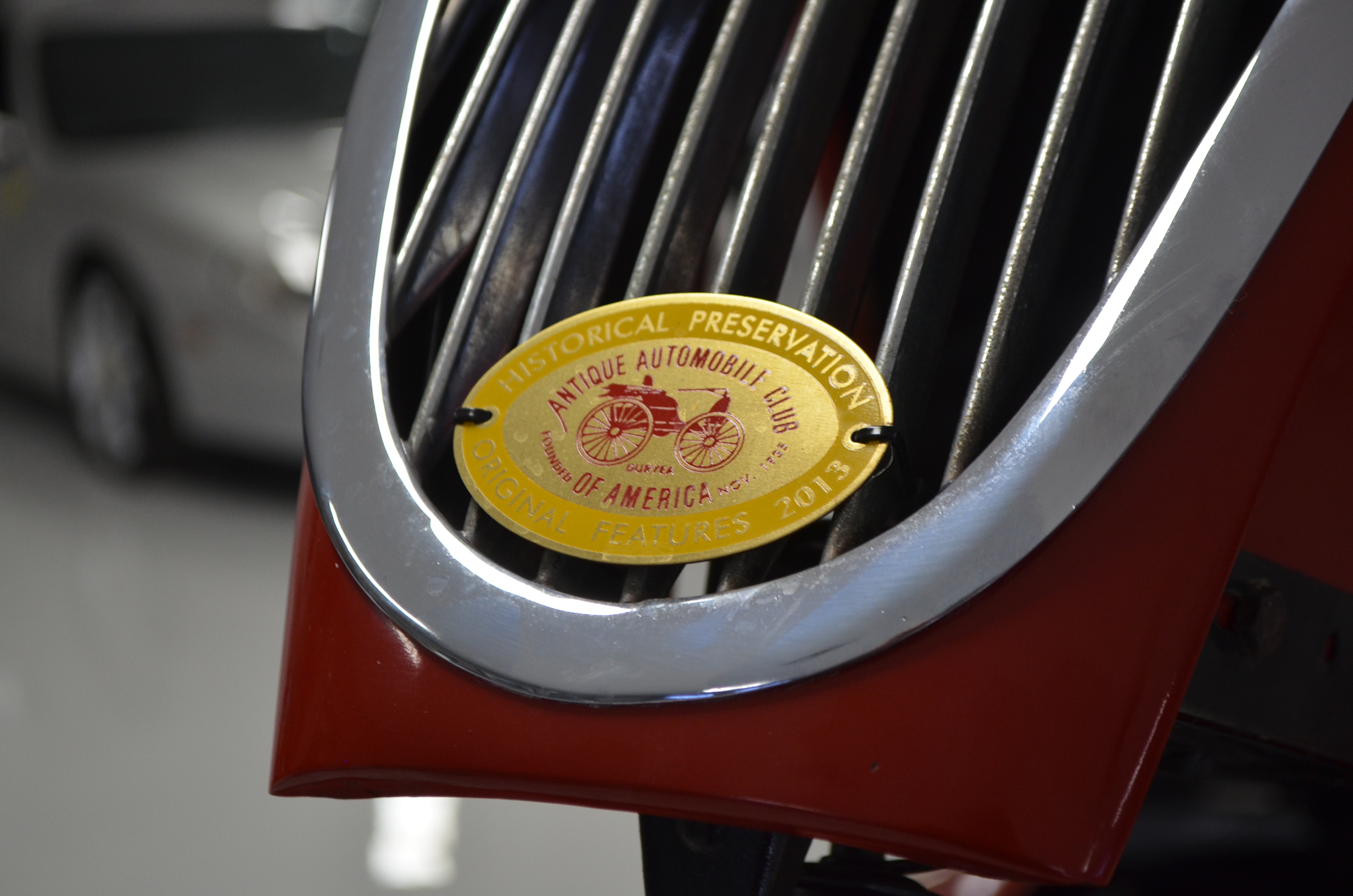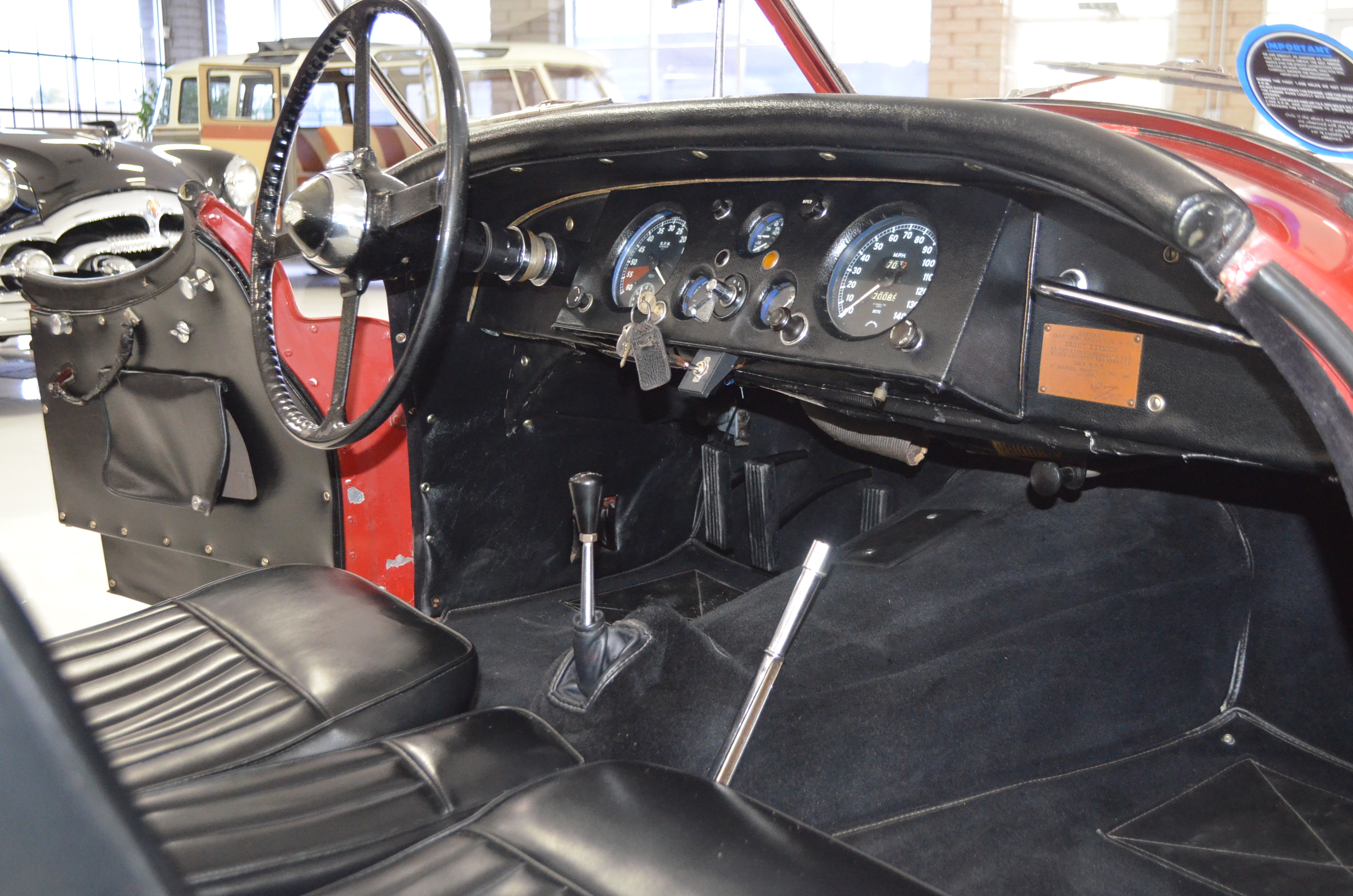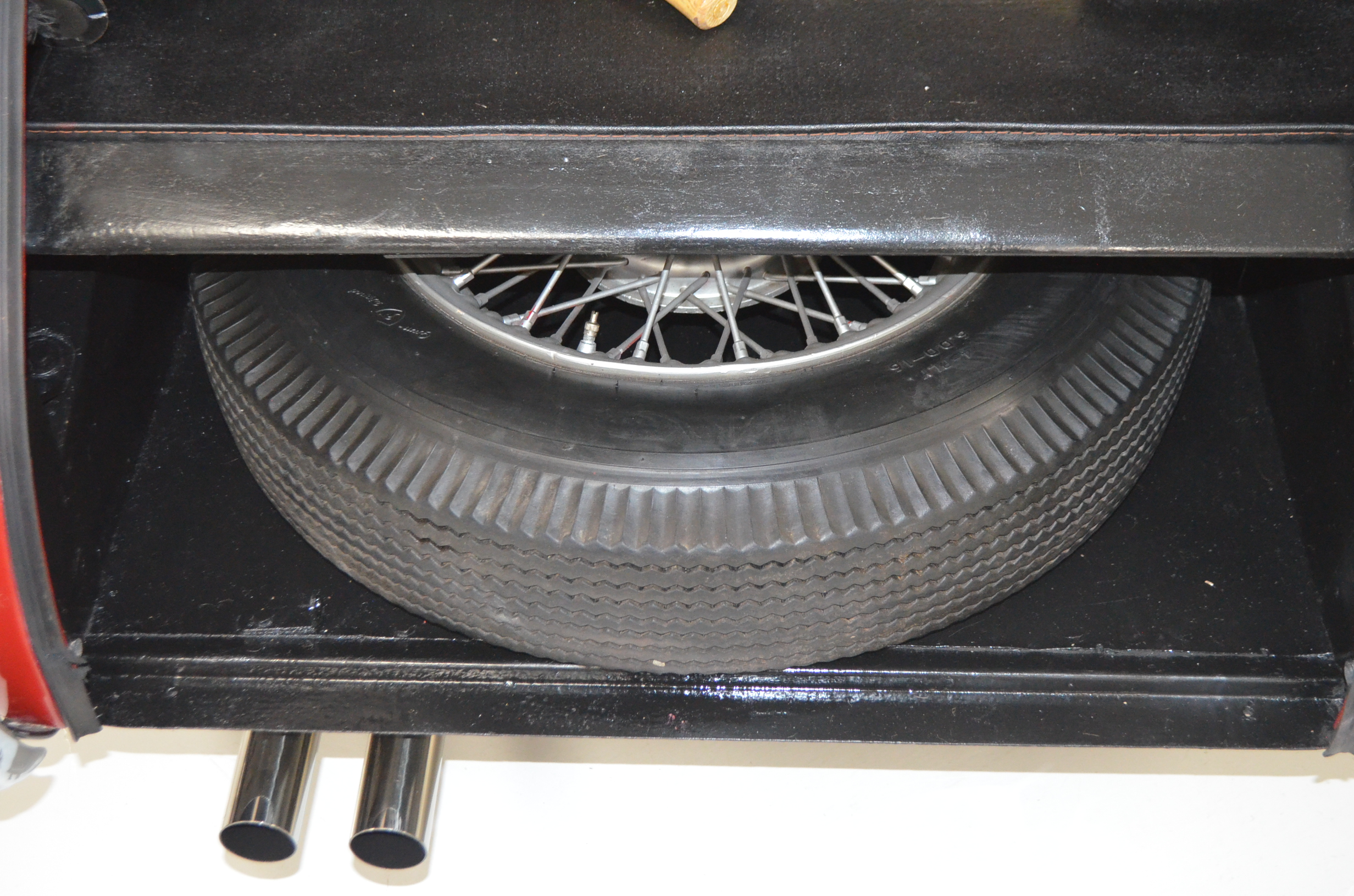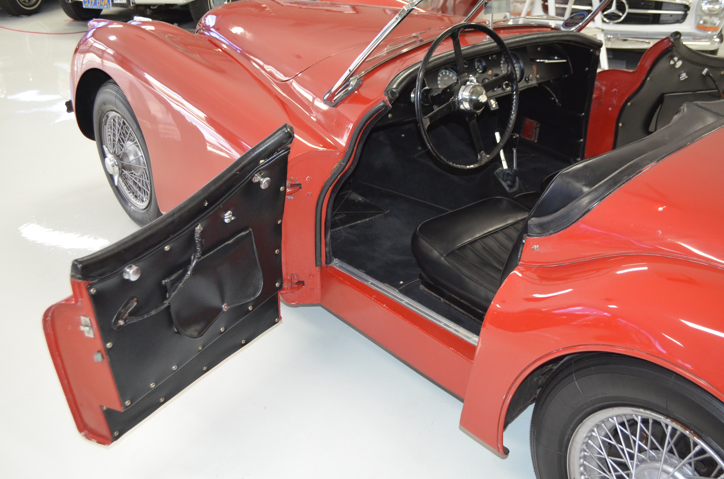 This car has been enjoyed in good weather most of its life, because it is free of rust. It had been repainted in the original red paint decades ago and remains in touring quality condition today. Since under our stewardship, we’ve rubbed out the paint and had many of the small dents removed, mainly from the aluminum. The doors, trunk (boot) and hood (bonnet) are all crafted from aluminum. The paint overall looks very nice for touring, but up close there are several areas where there is some cracking and other blemishes. But it looks sharp!