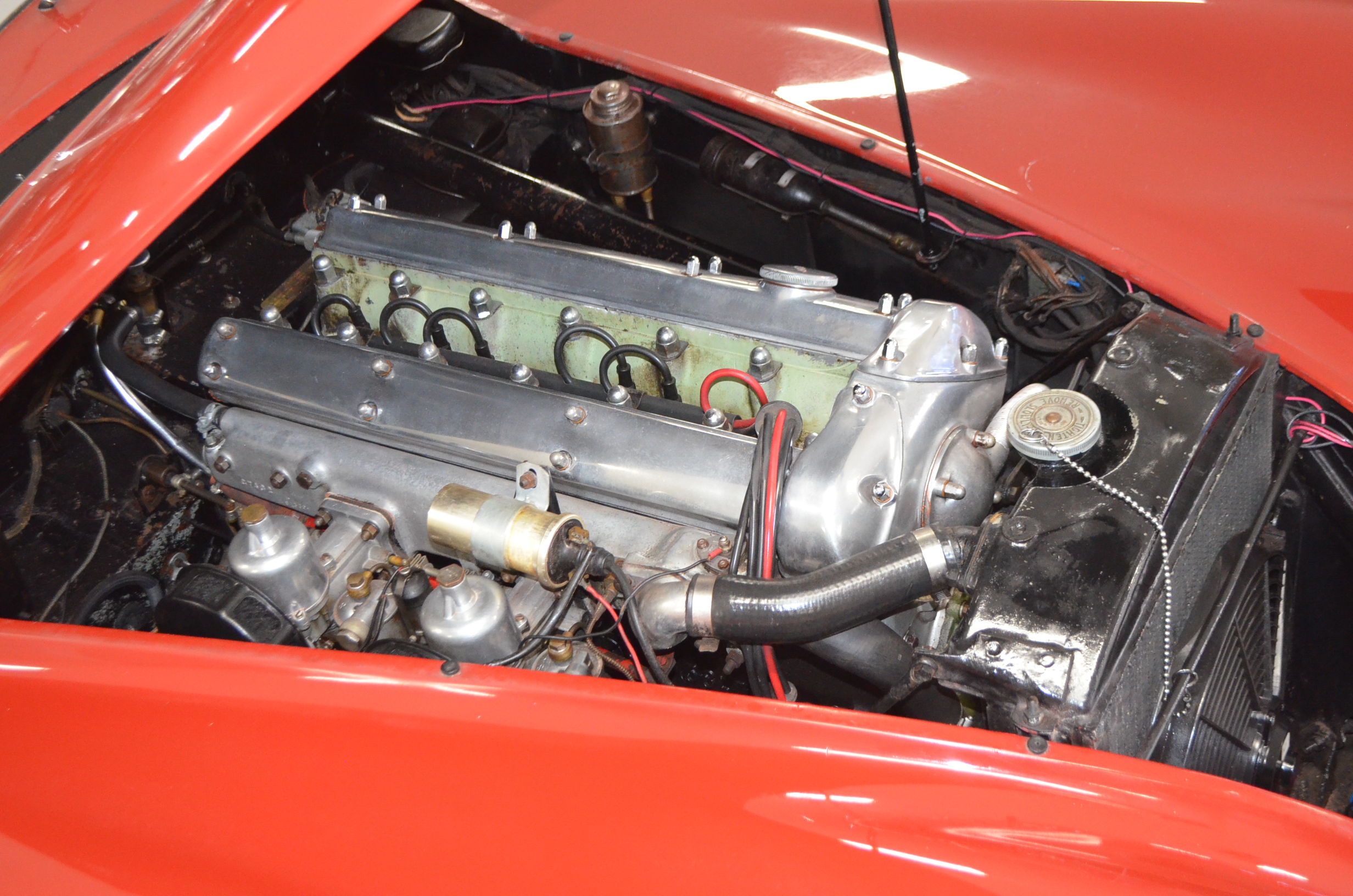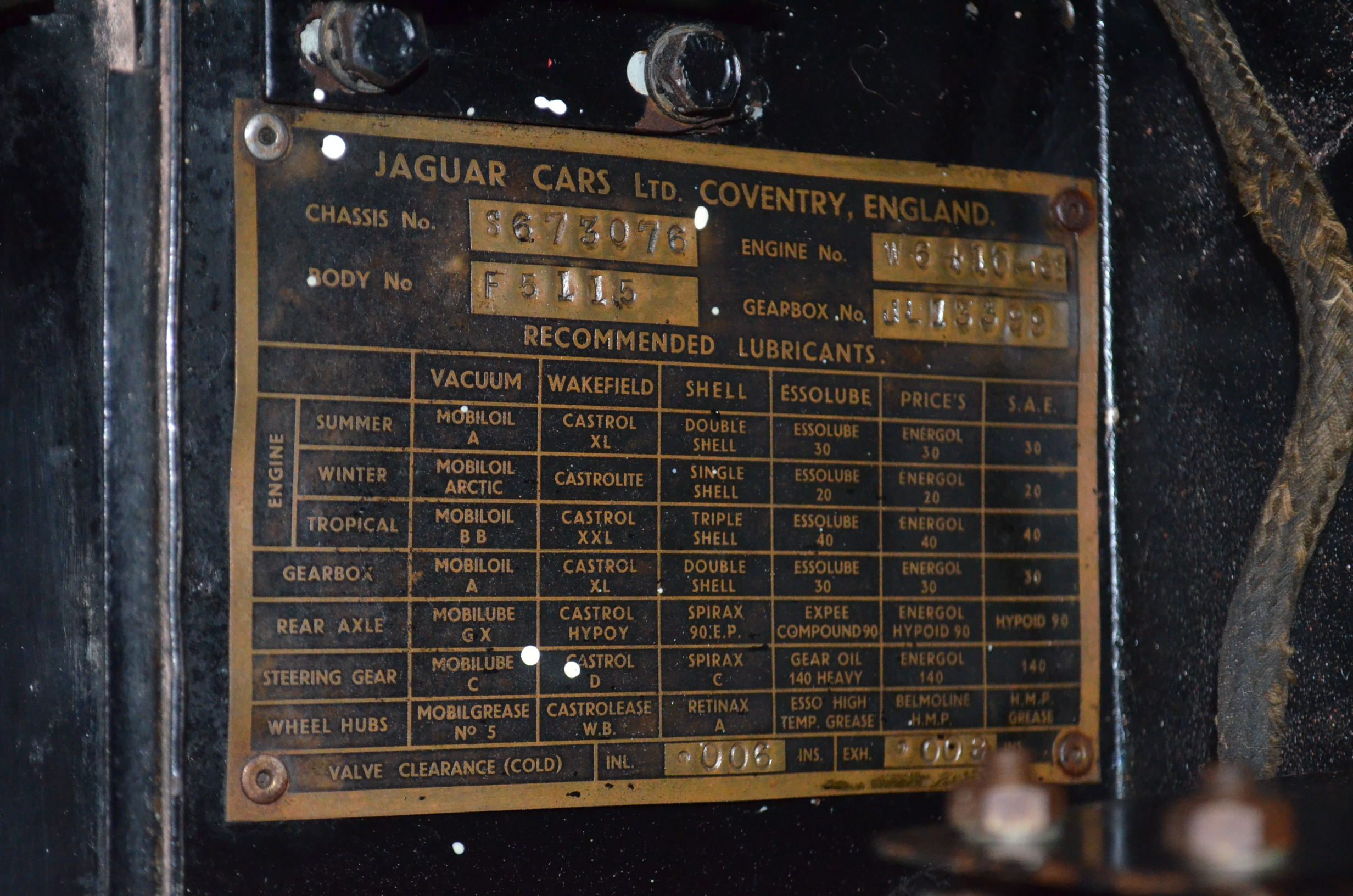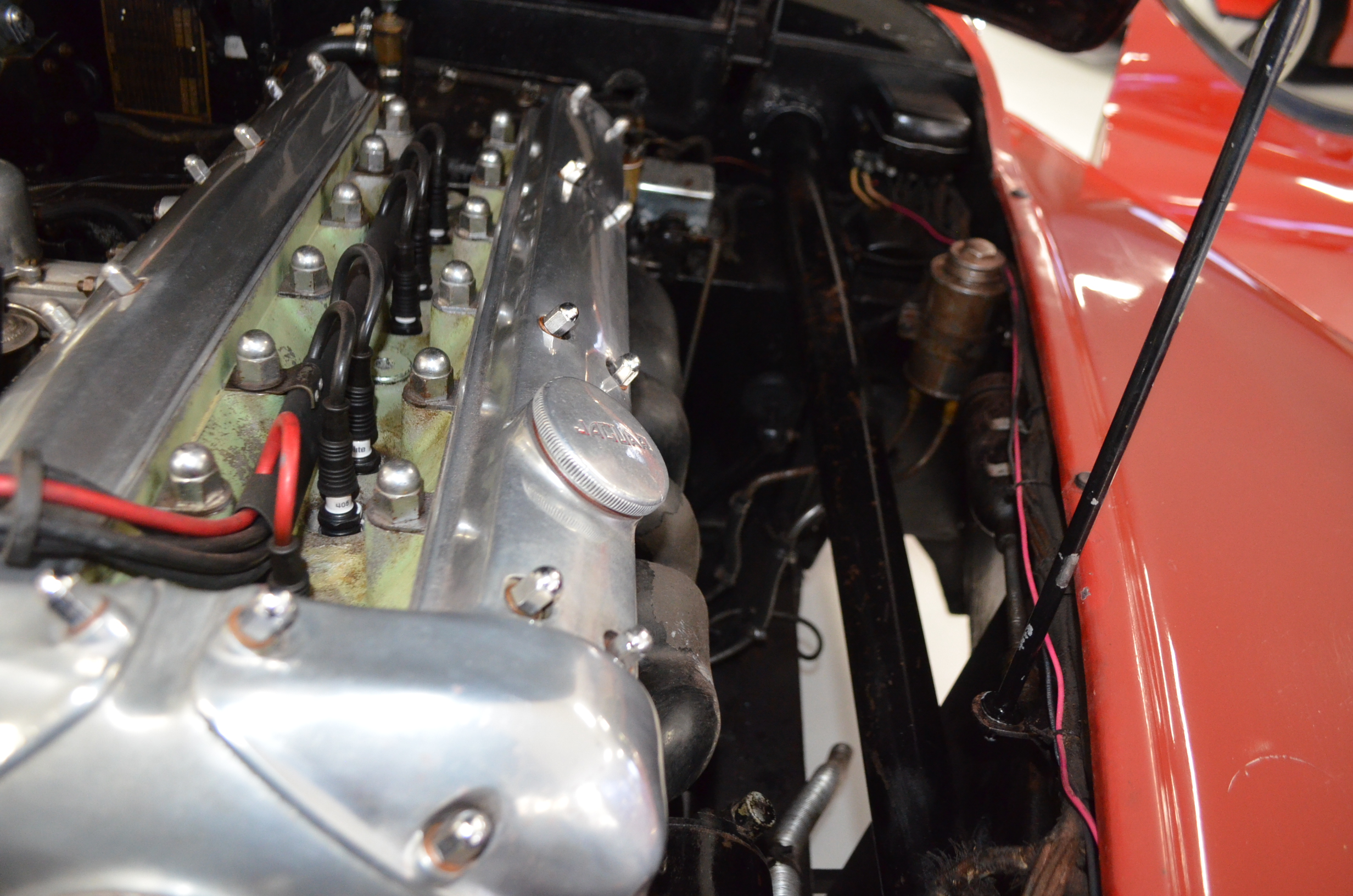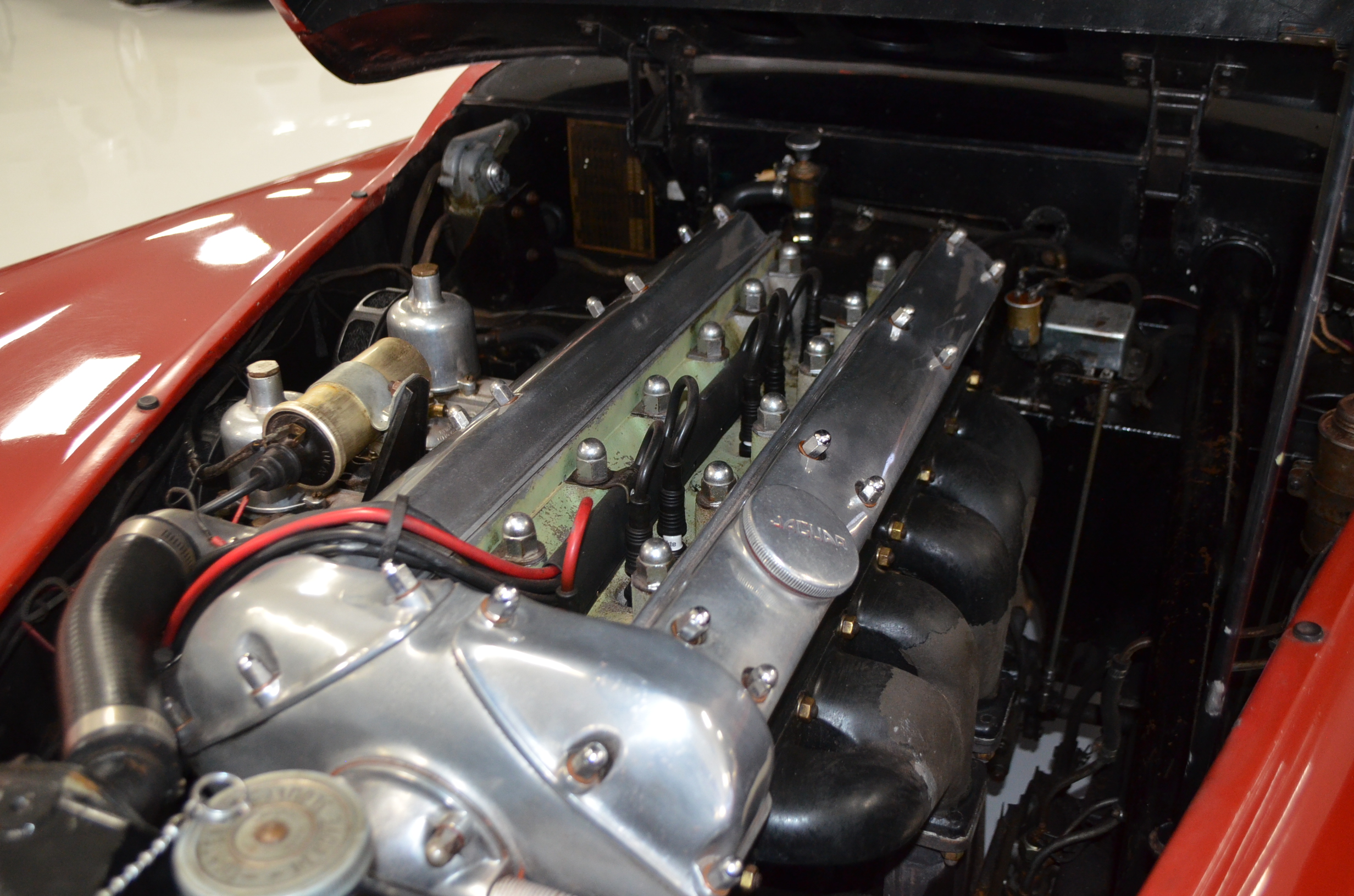 This XK120 has the “S” designation which according to all sources means a higher lift cam and special equipment, including the icon wire wheels. The S or SE stood for Special Equipment and in the US is sometimes referred to as M for modified. The higher lift cam is said to increase the output by 20 hp. This example has a later 3.8 liter engine installed, engine number LA 4129-9.