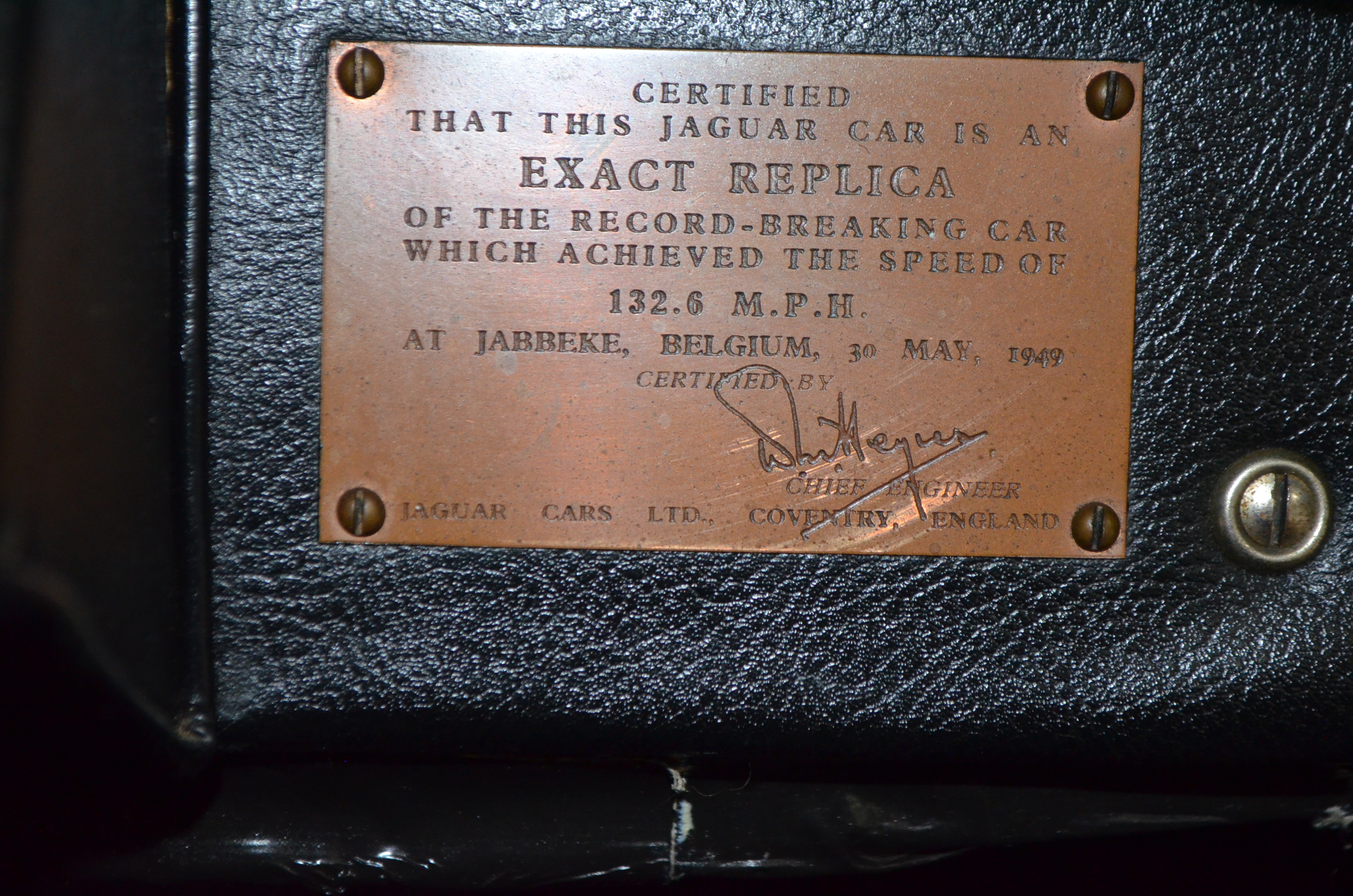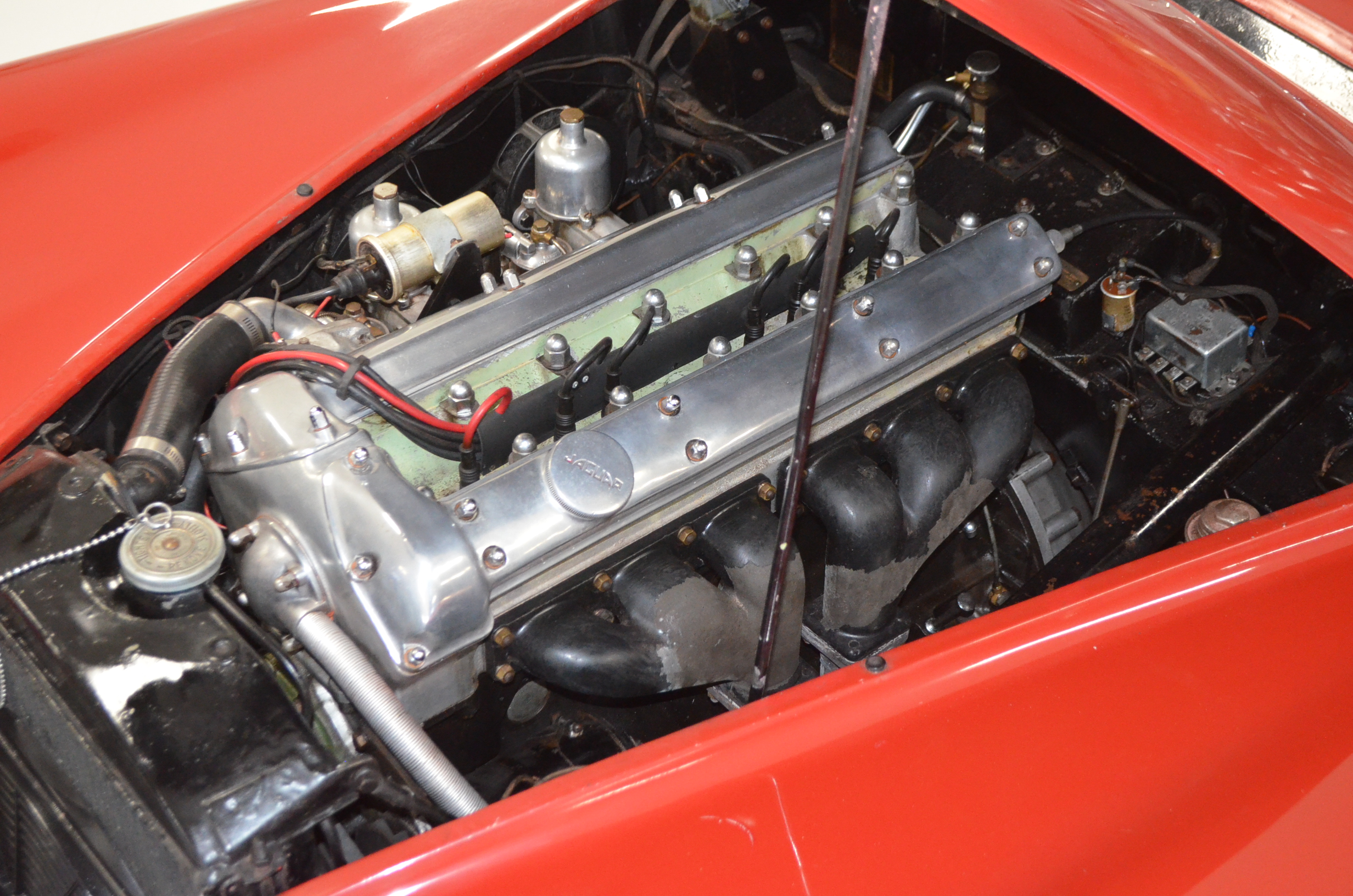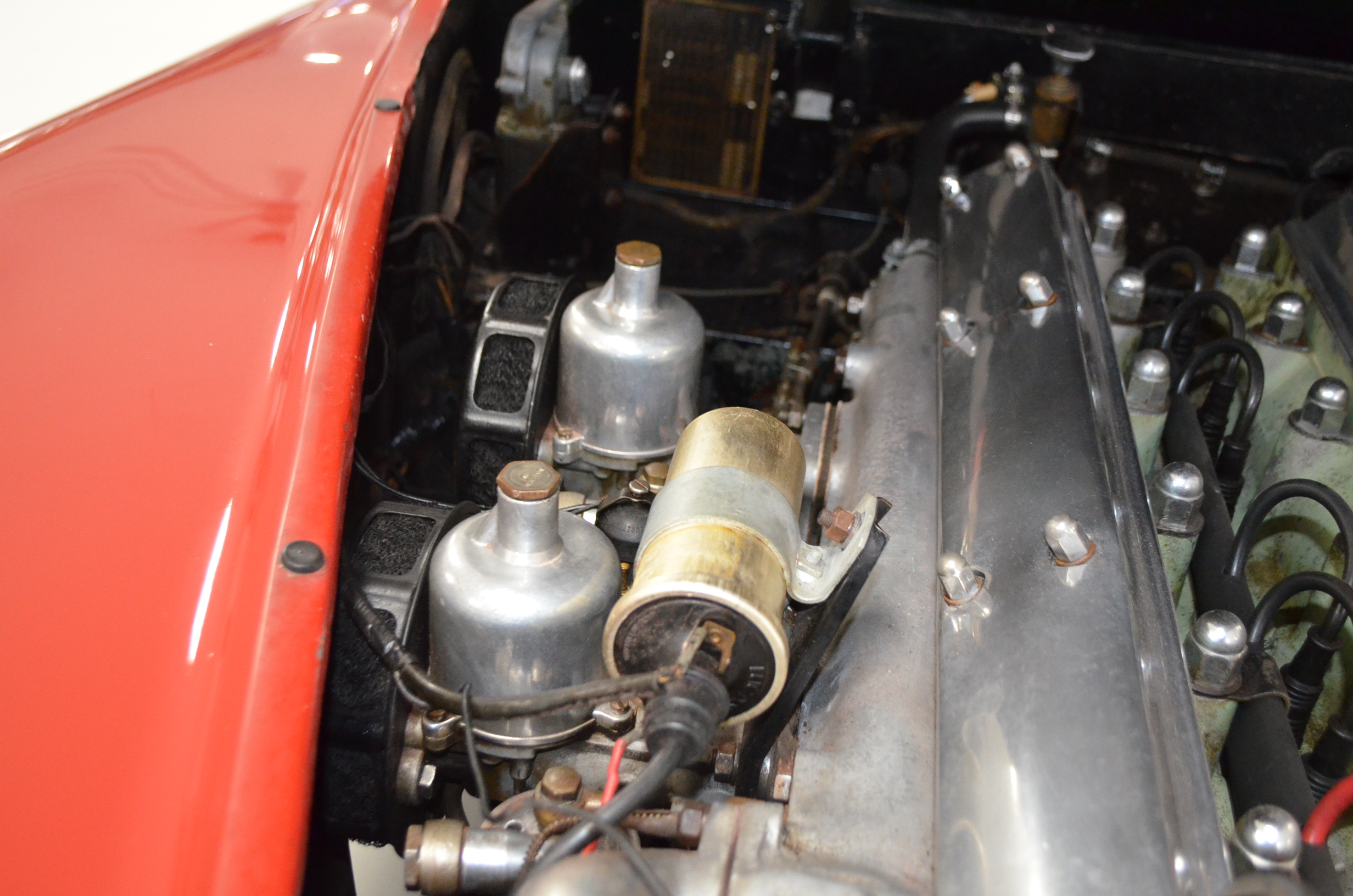This XK120 has the “S” designation which according to all sources means a higher lift cam and special equipment, including the icon wire wheels. The S or SE stood for Special Equipment and in the US is sometimes referred to as M for modified. The higher lift cam is said to increase the output by 20 hp. This example has a later 3.8 liter engine installed, engine number LA 4129-9.