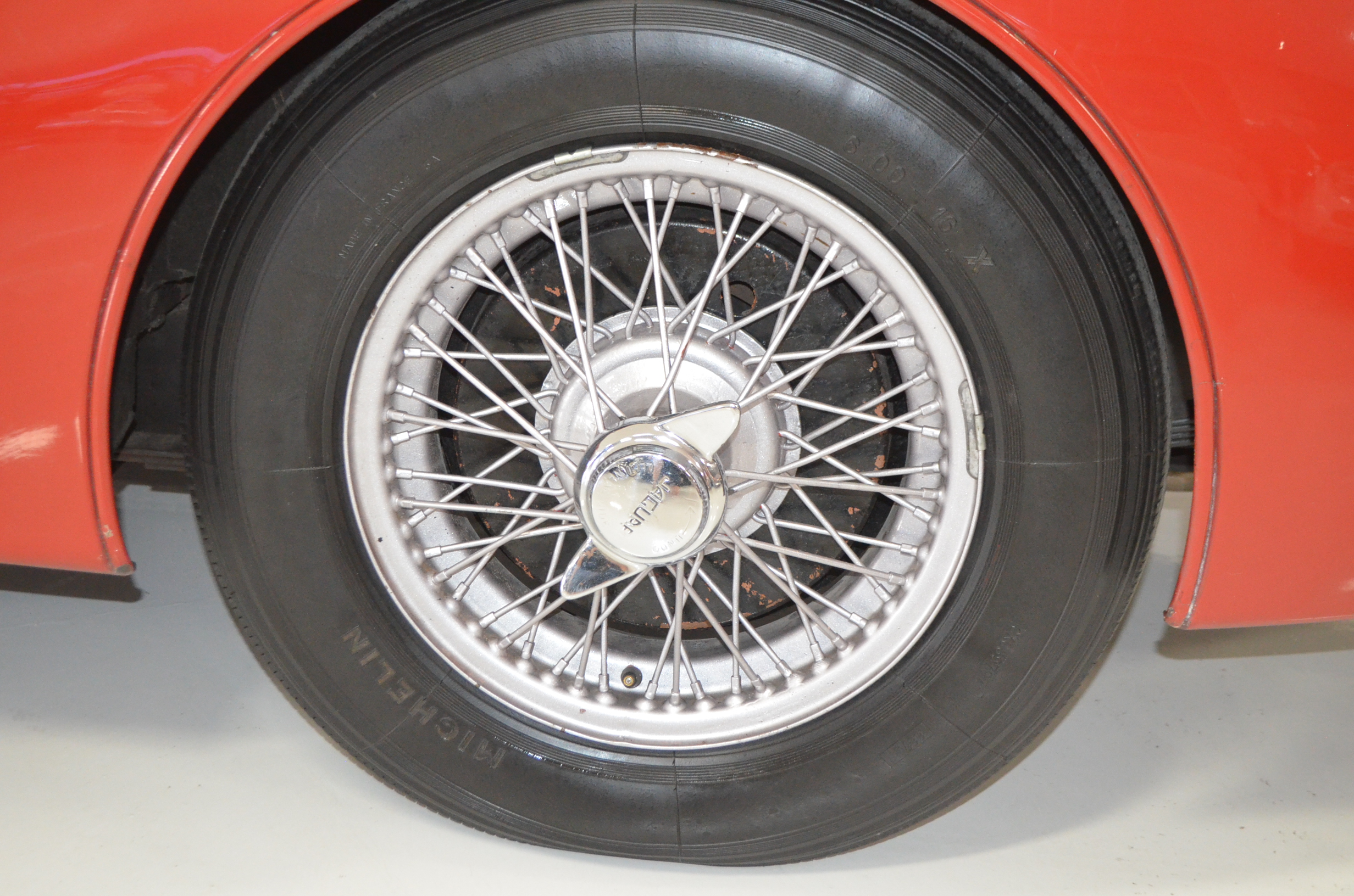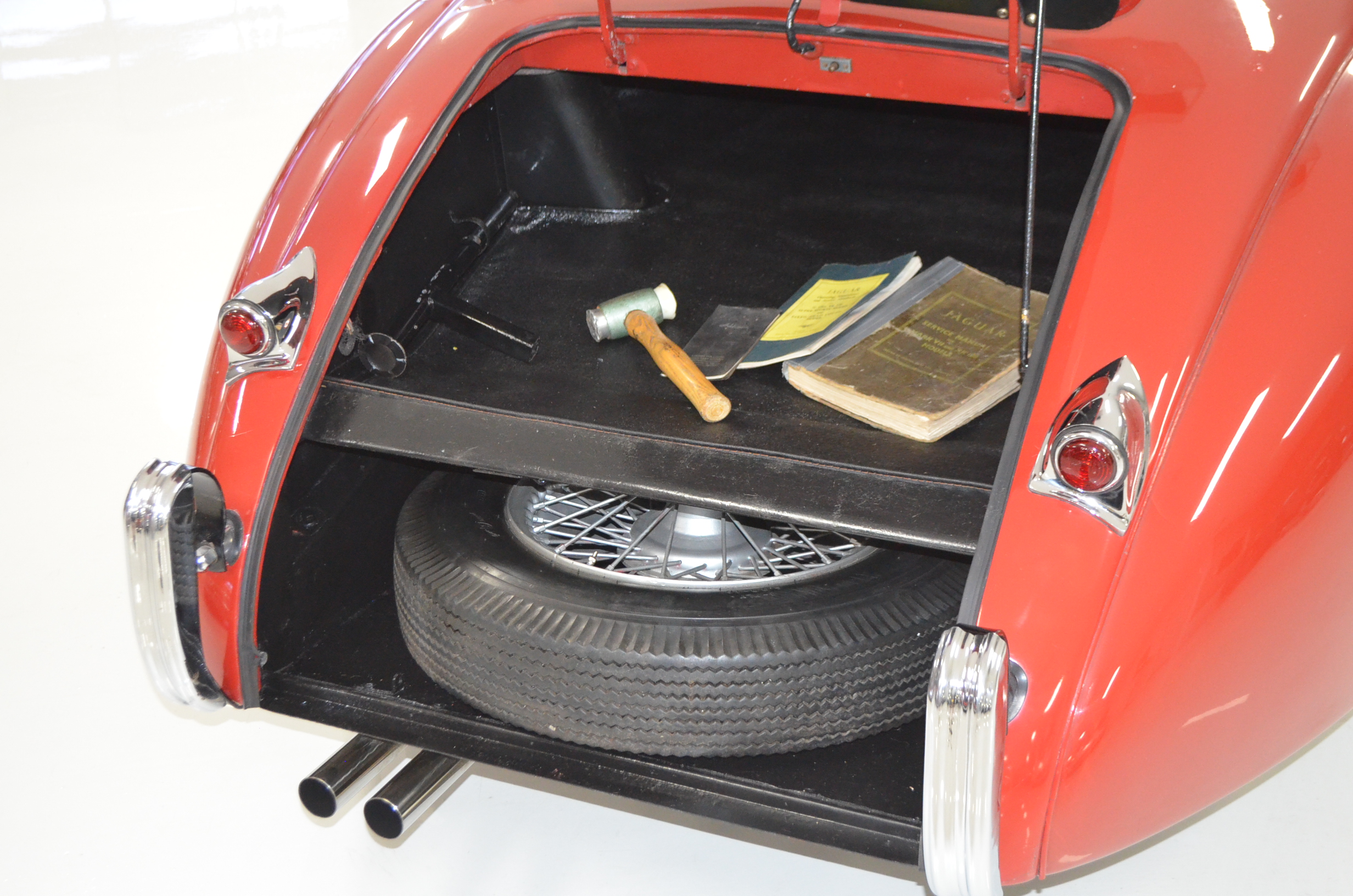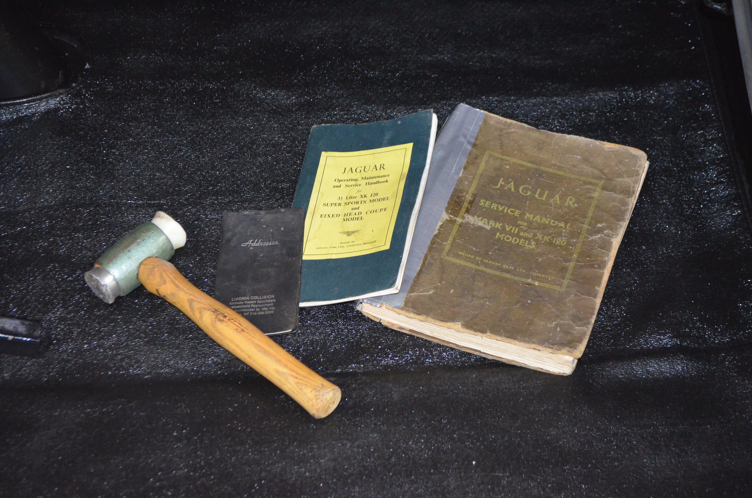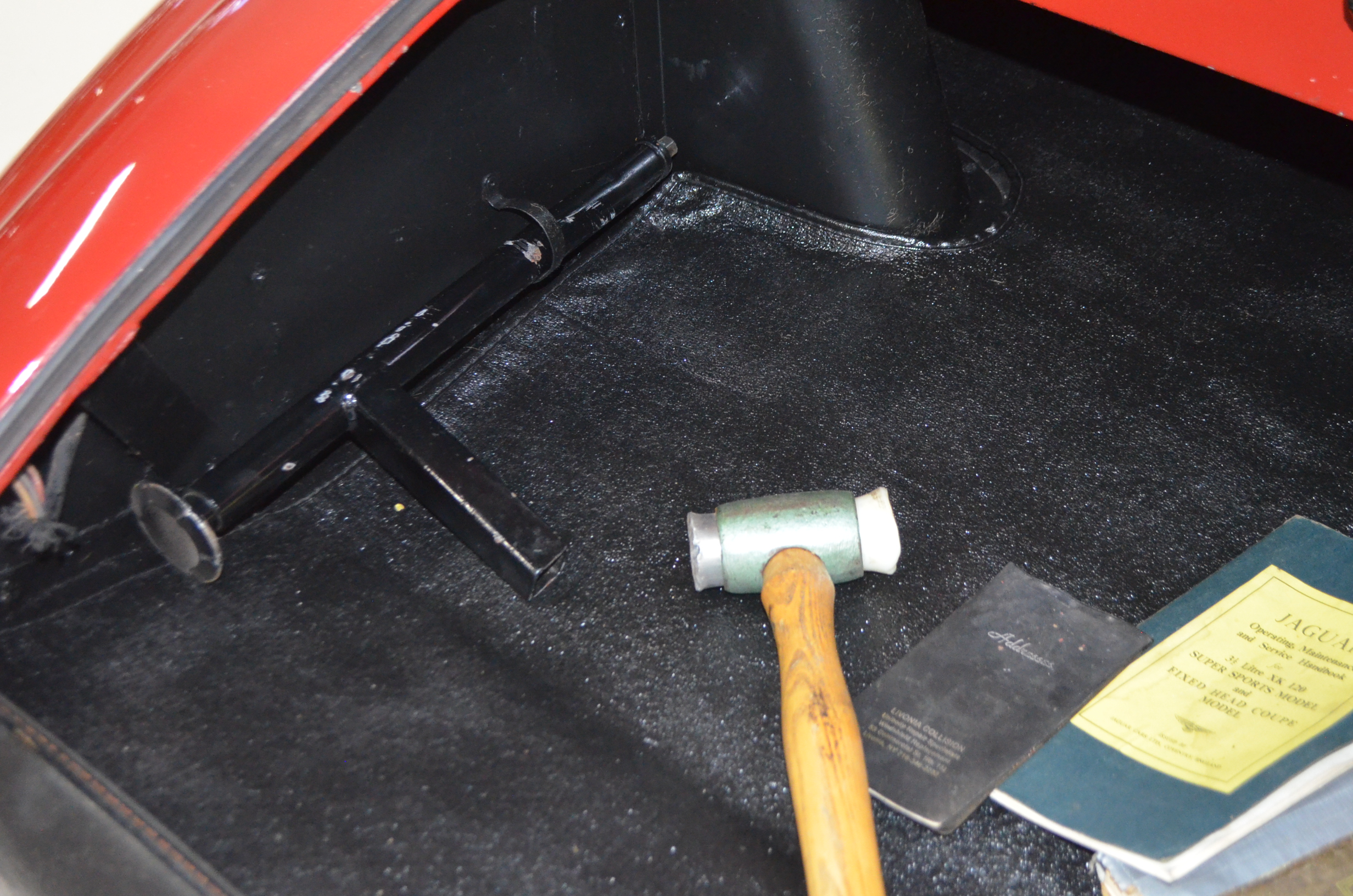 The wire wheels and tires are in excellent shape and run down the highway very well. The jack and hammer, along with the spare wheel and shop manuals, are in the truck. The trunk is also free of rust and looks great. The Jag comes with a car cover as well.