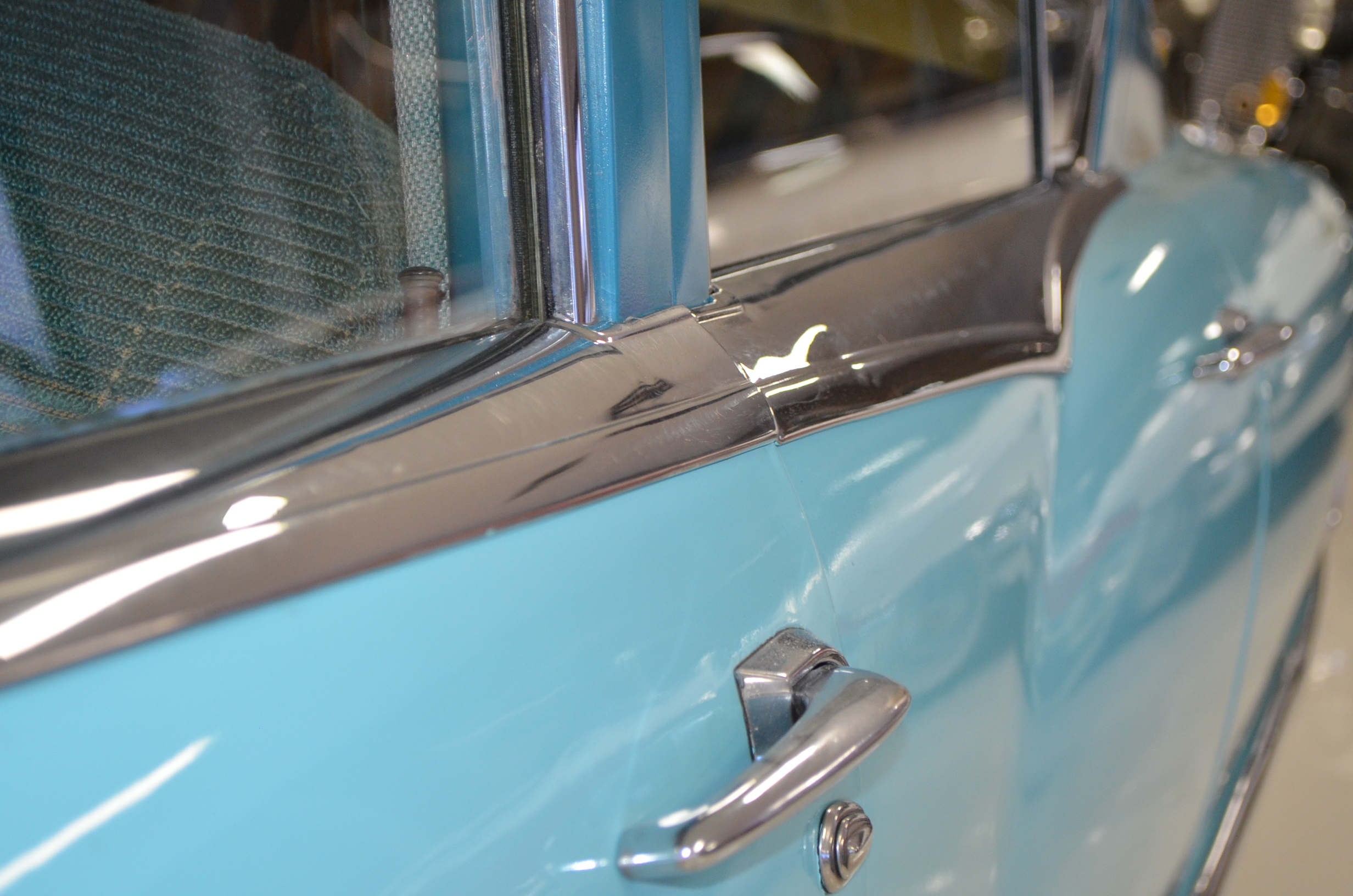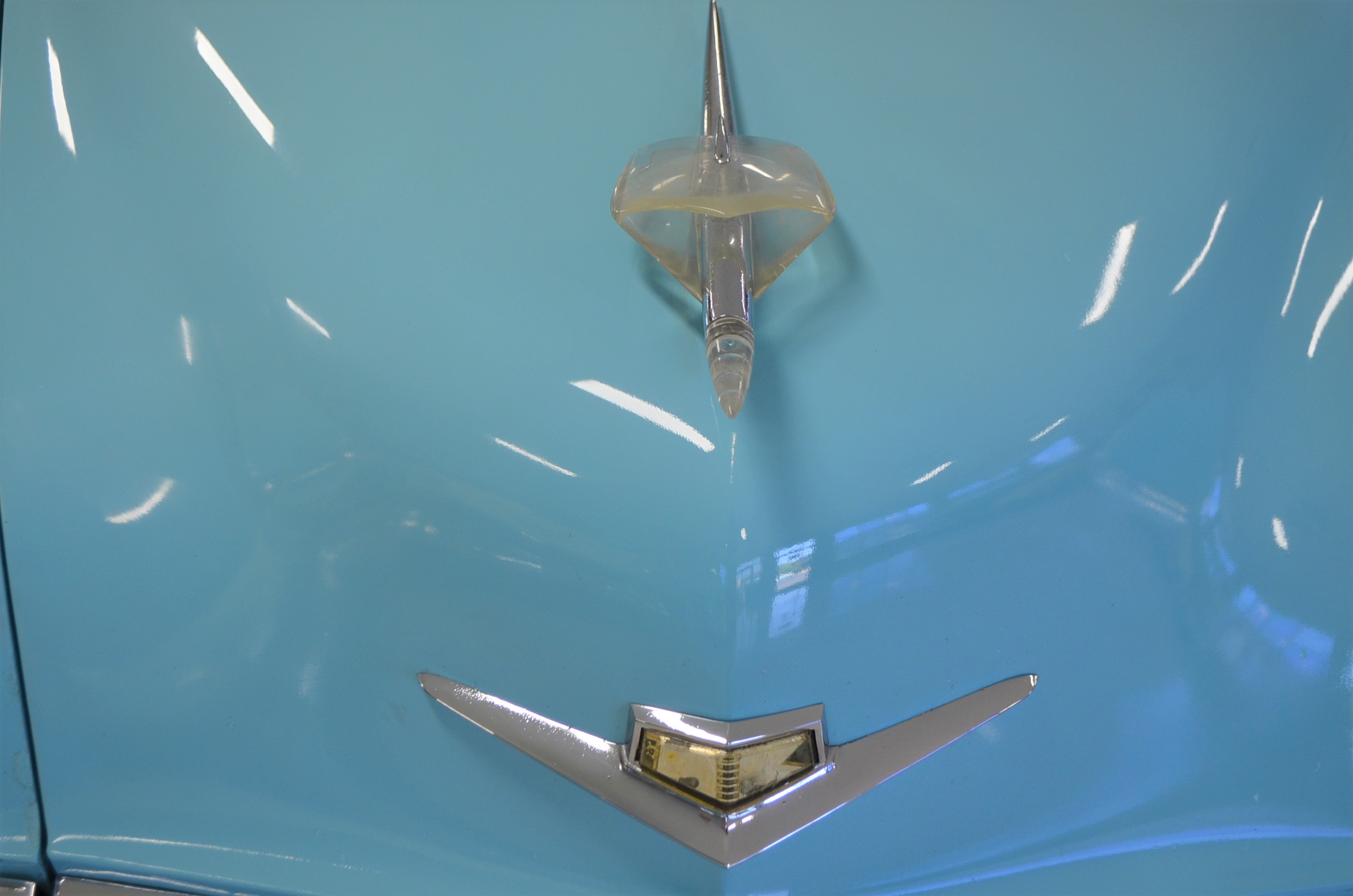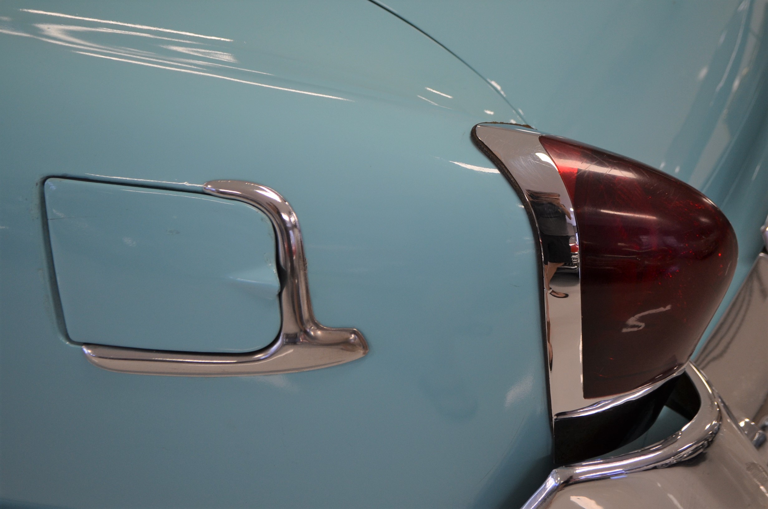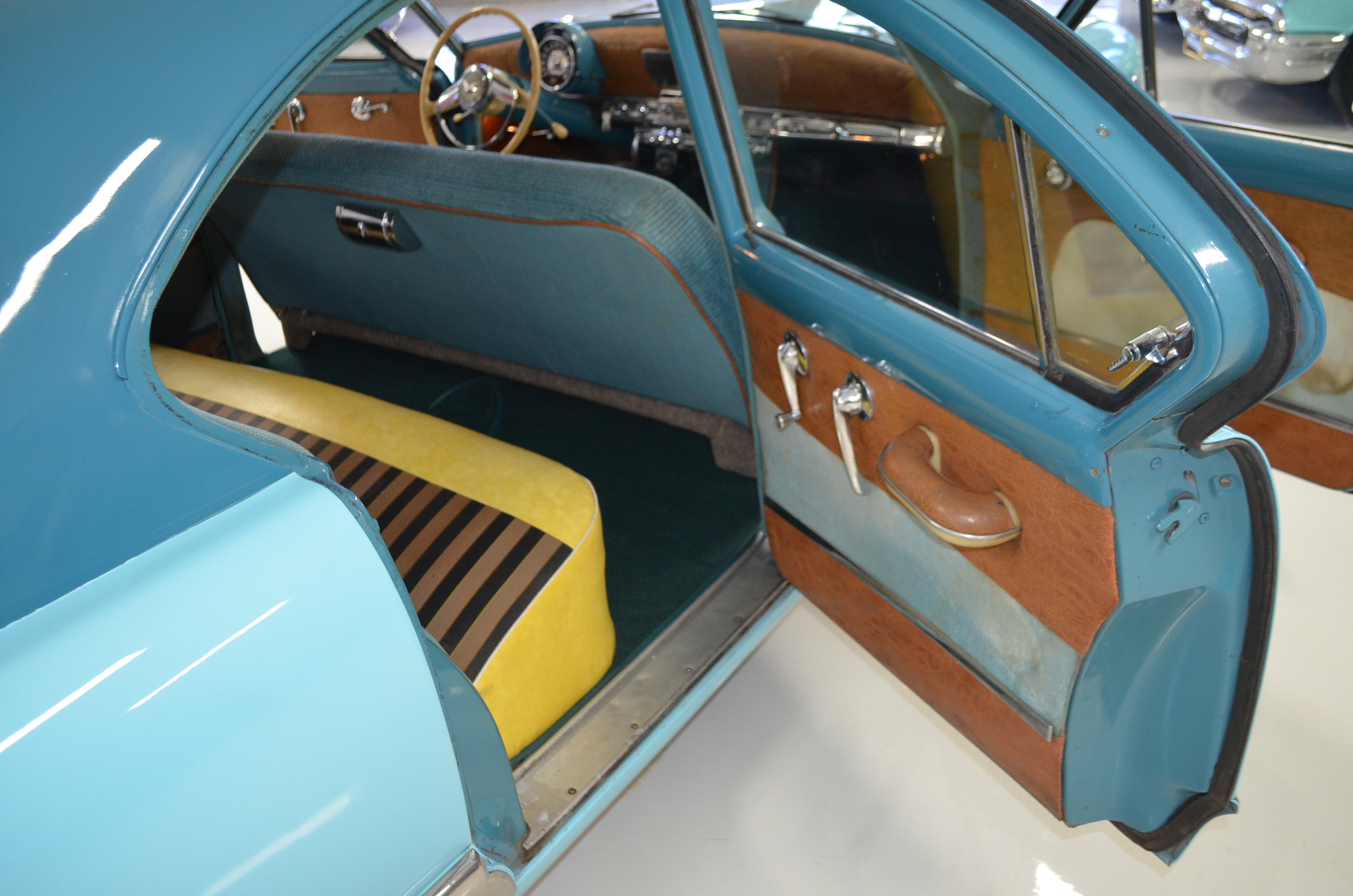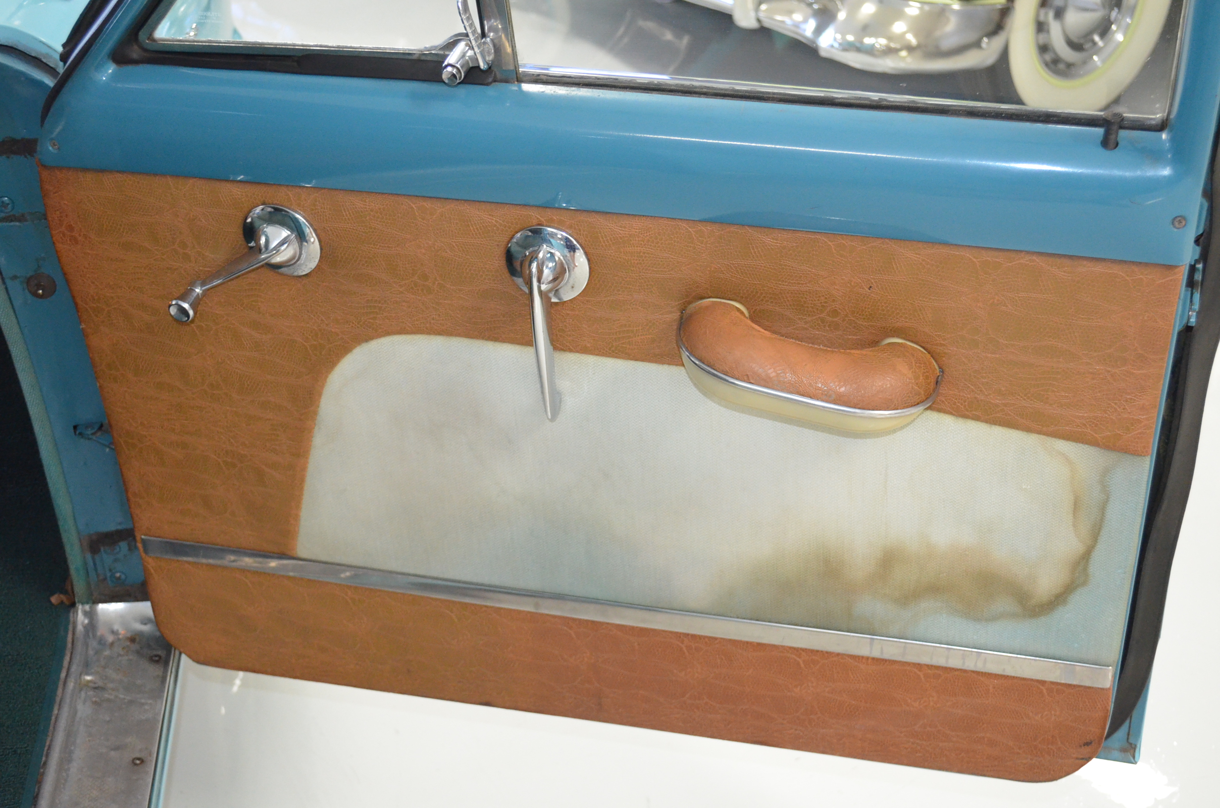 The exterior has an older repaint in the correct two tone colors of Turquoise and Cerulean Blue. Most of the original paint was removed before the repaint. The bodywork and paint prep were done well as there are no real issues evident. And there is very little filler evident from using our Filler Meter. The paint could benefit from a wet sanding and polish. The Kaiser is loaded with stainless trim (we think an entire Toyota could be made from the exterior stainless alone!). The stainless is in overall good condition with a few small dents and scratches. The chrome also displays well, but has fine scratches over much of it. Overall, the exterior is consistent with a No 3 car. It is a terrific tour car that because of its stunning design and rarity would be a delight at any car show. And from ten feet it looks perfect but up close shows that it is a nice original car with appropriate patina.
