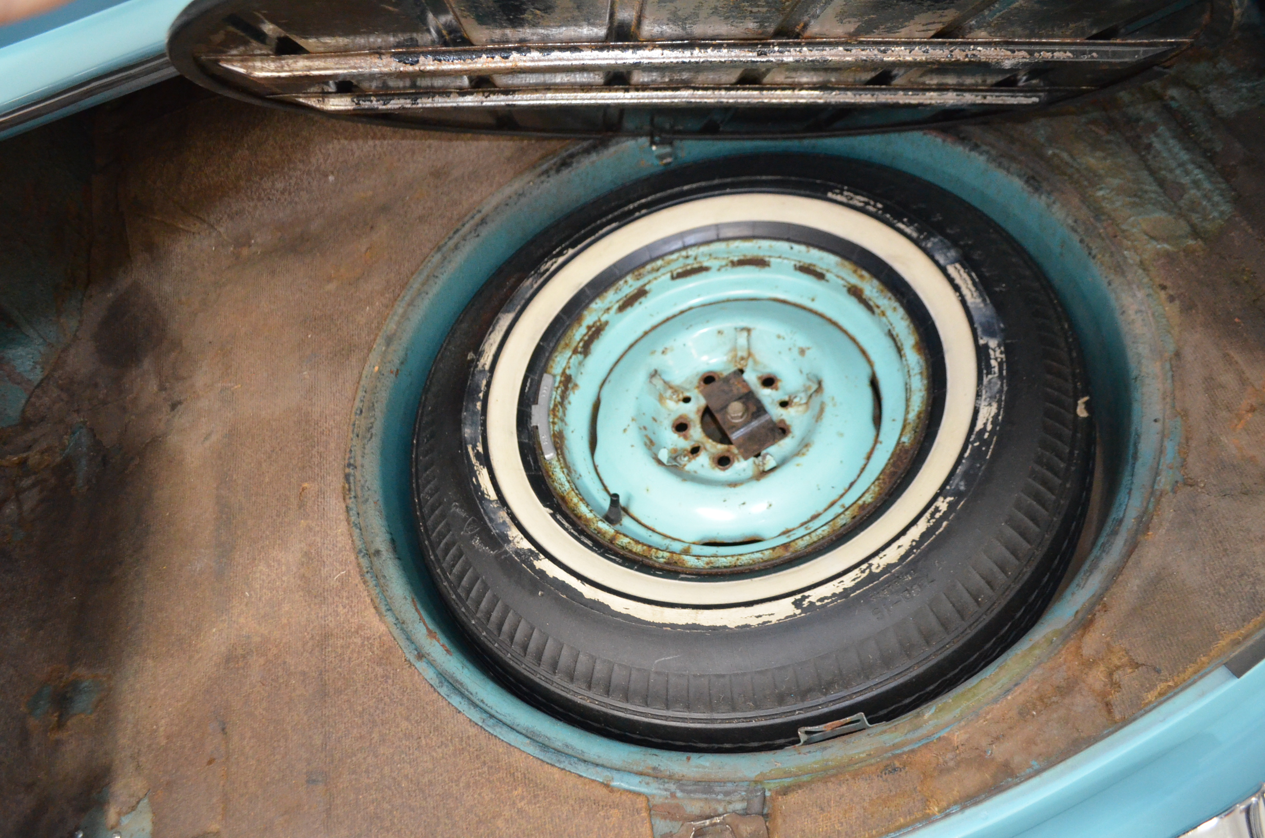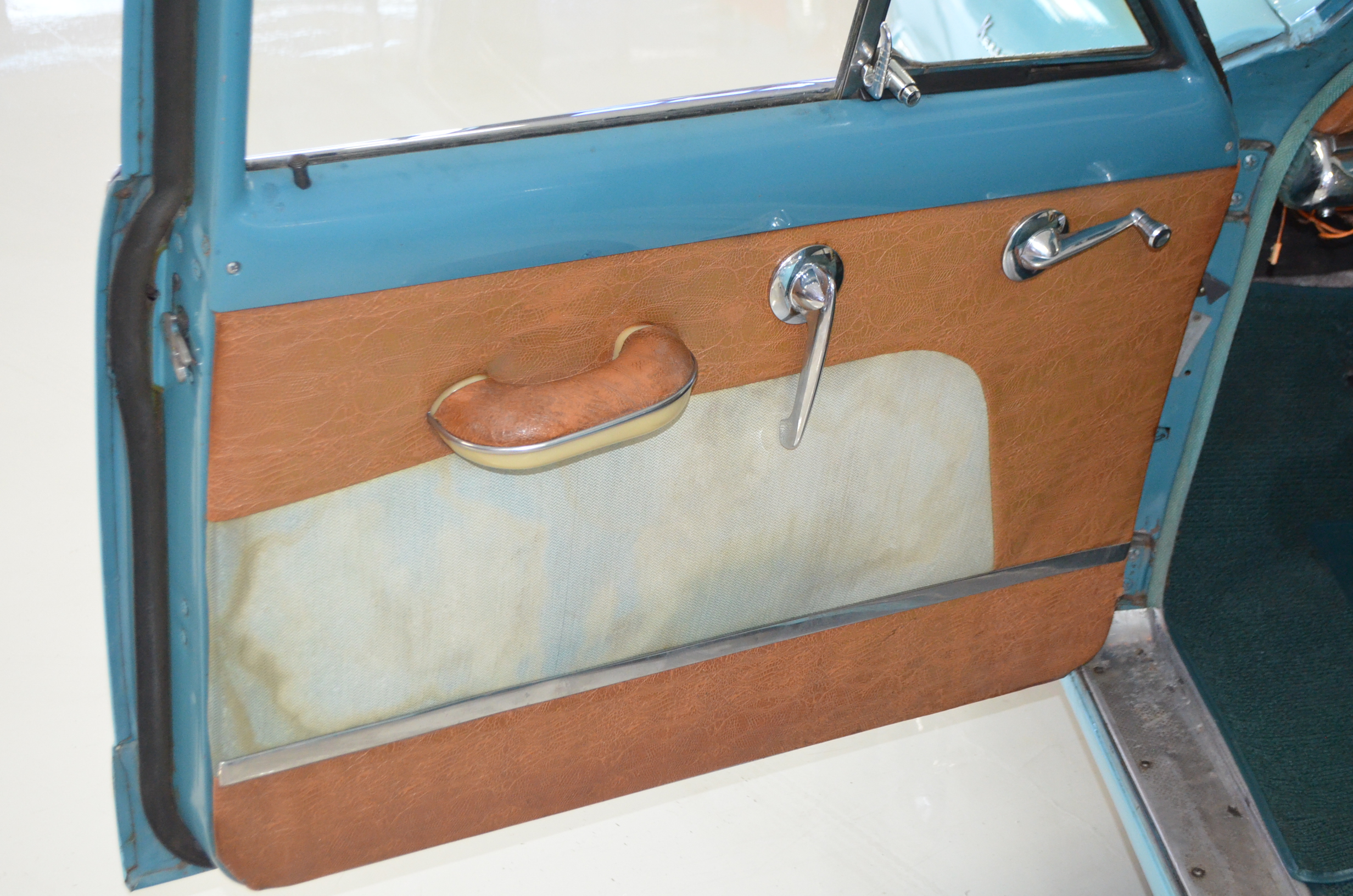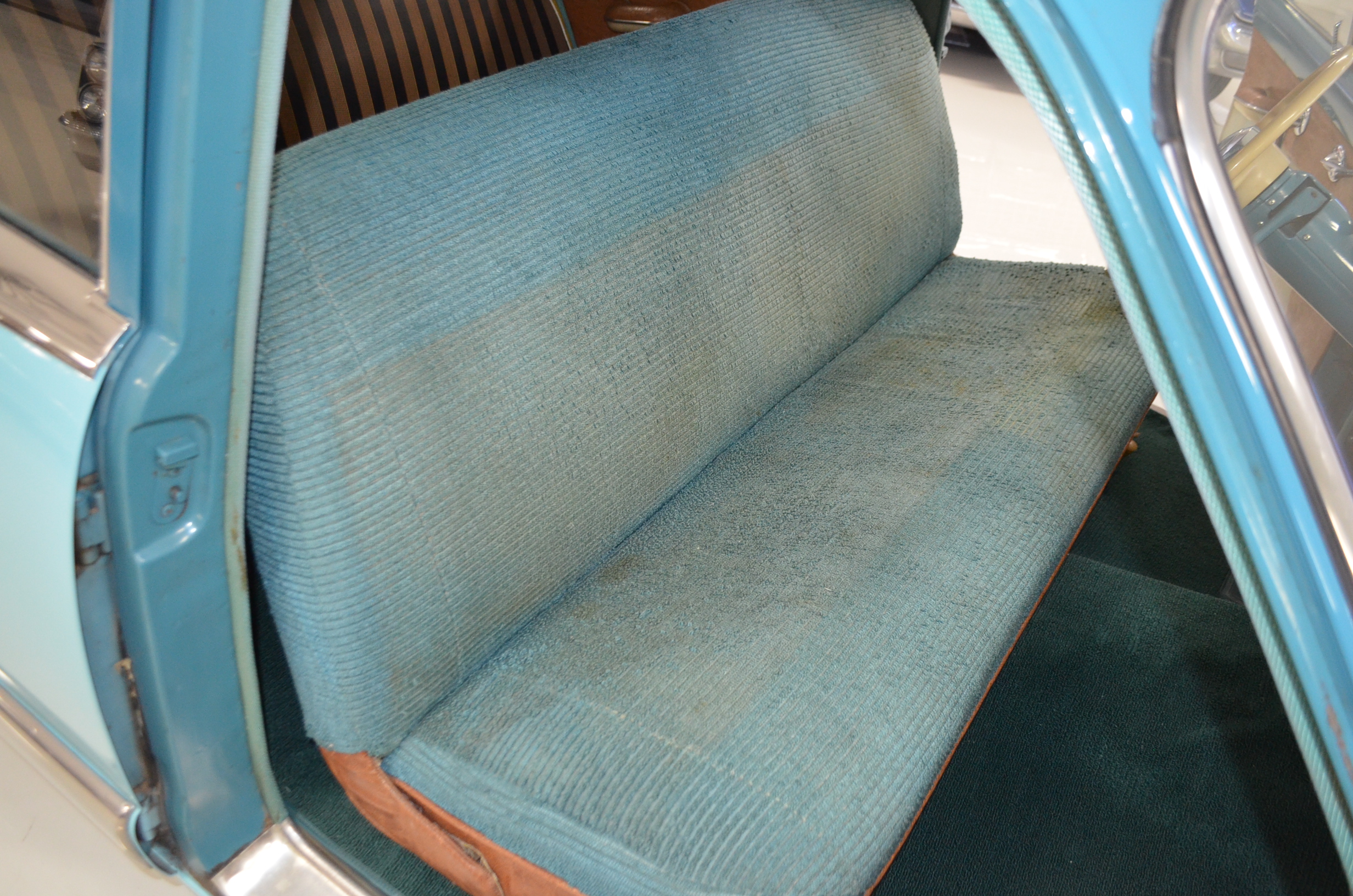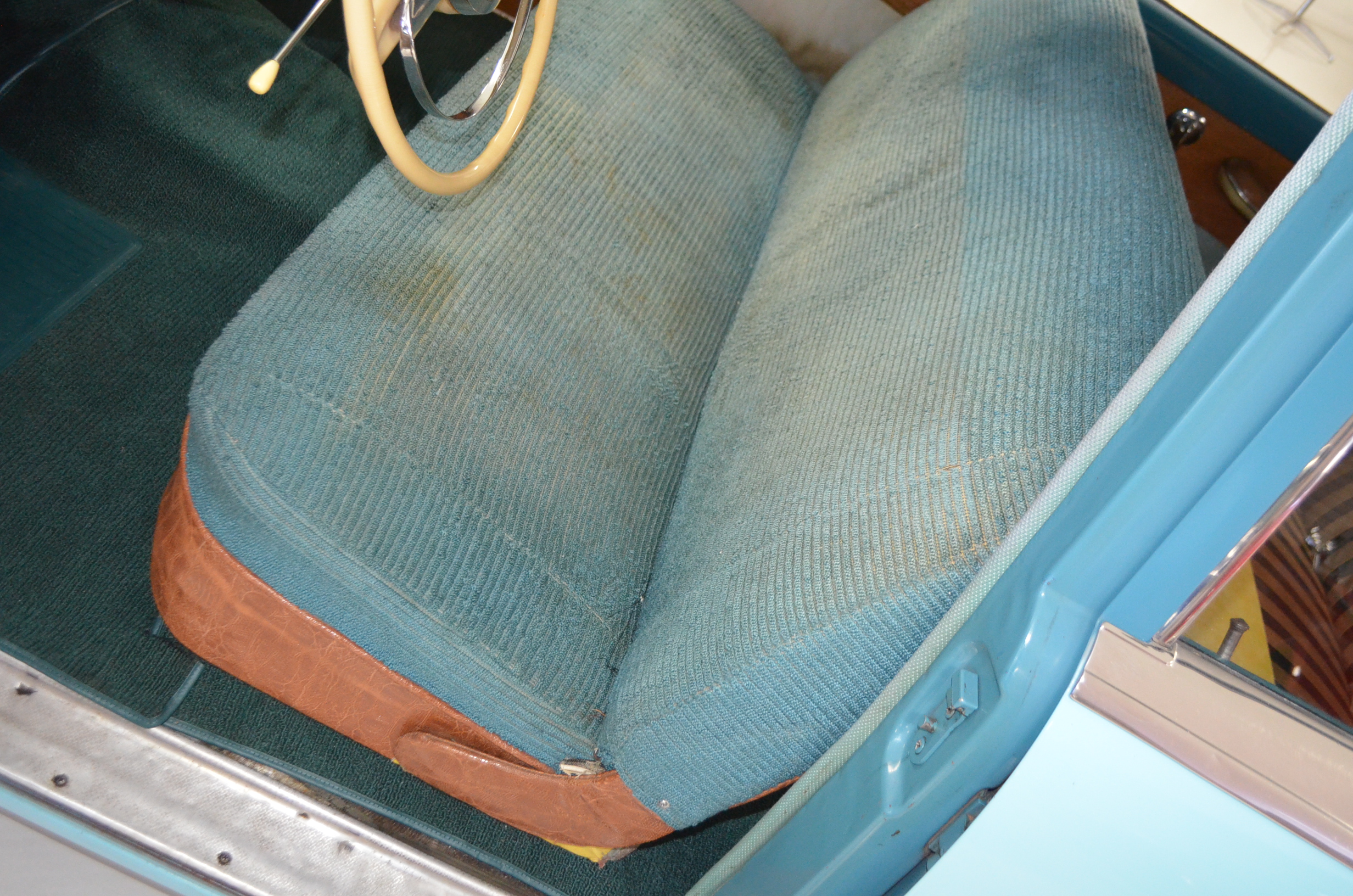 The interior is a true time capsule. The upholstery is all original, including what is sure to be a pristine rear seat under the dealer installed seat covers, installed over six decades ago. The door panels have water stains and the front seat with the original fabric has light soiling. The Turquoise Stockholm cloth would likely benefit from a Woolite cleaning treatment. The dinosaur reptilian trim is stunning. The carpet has been replaced, but matches the interior very well. The stainless used on the interior is in overall good condition with light scratching evident.