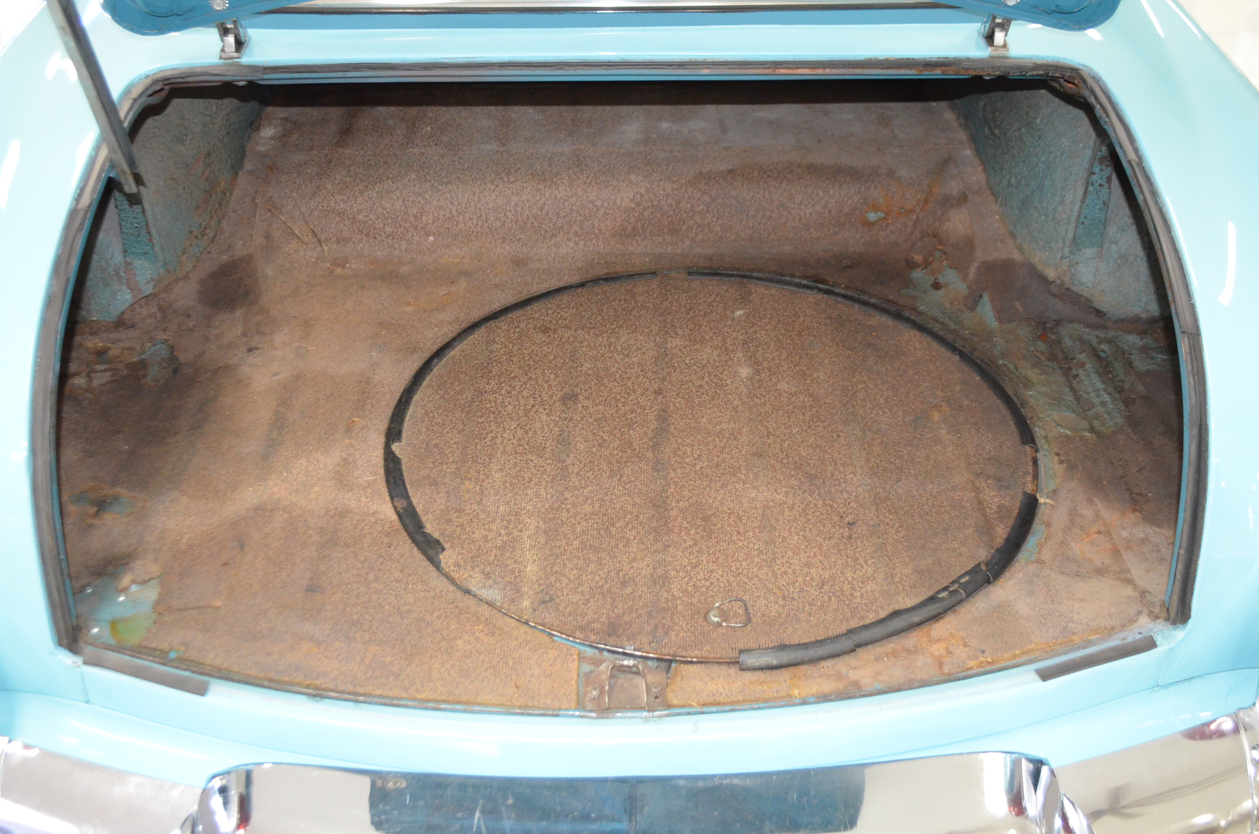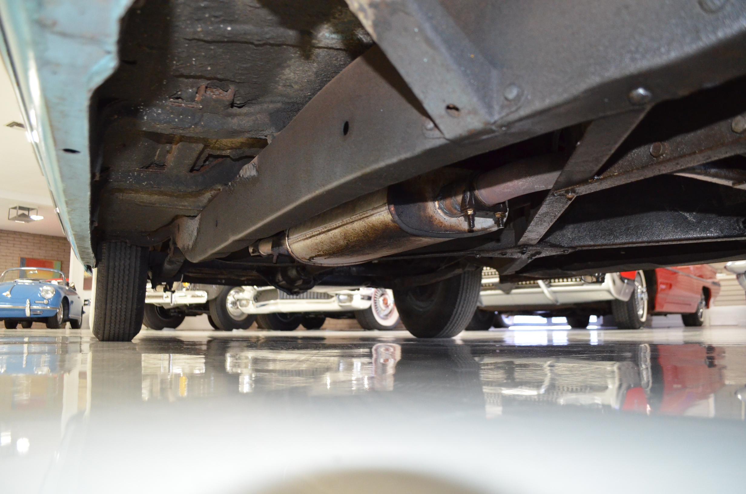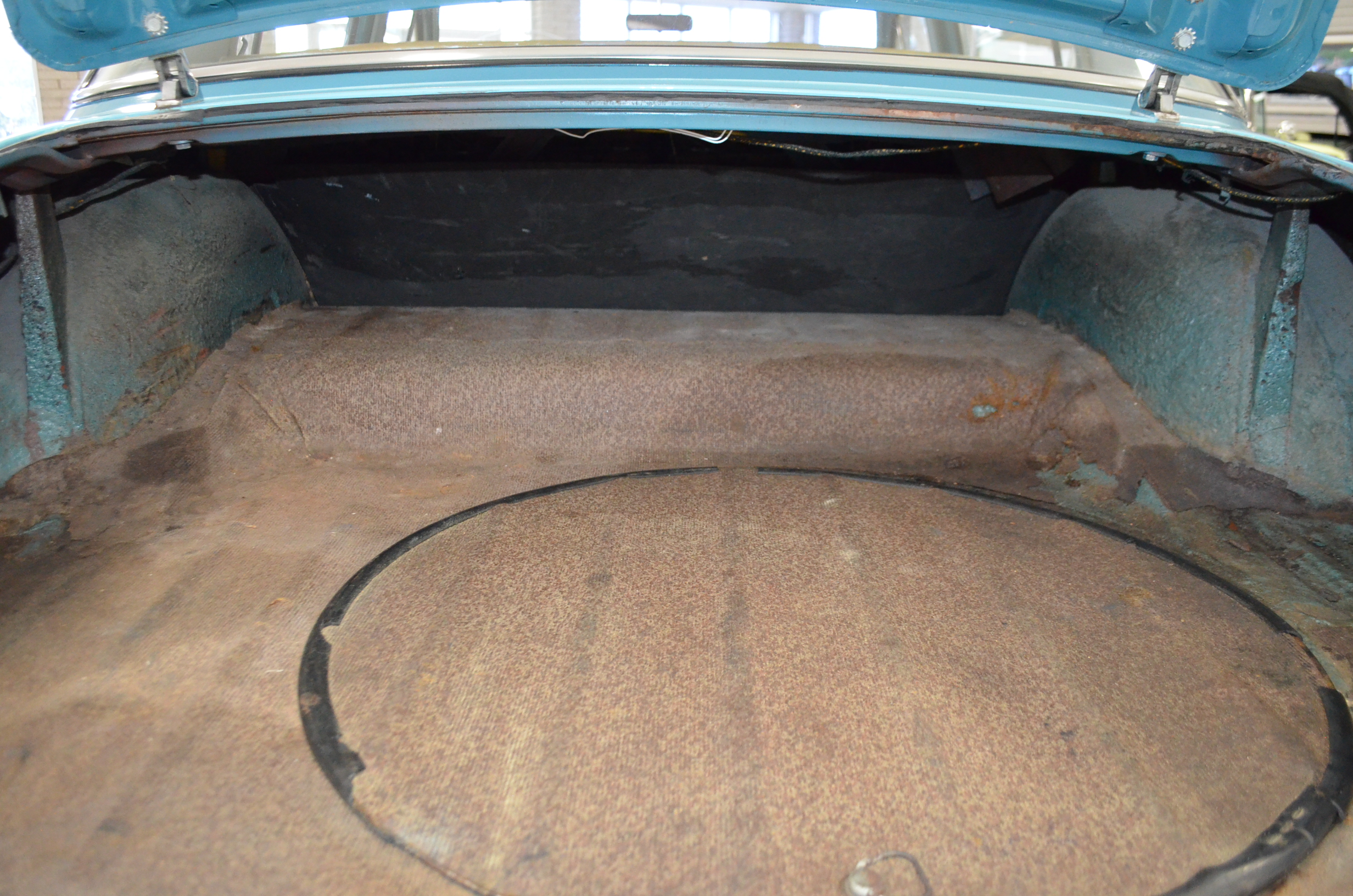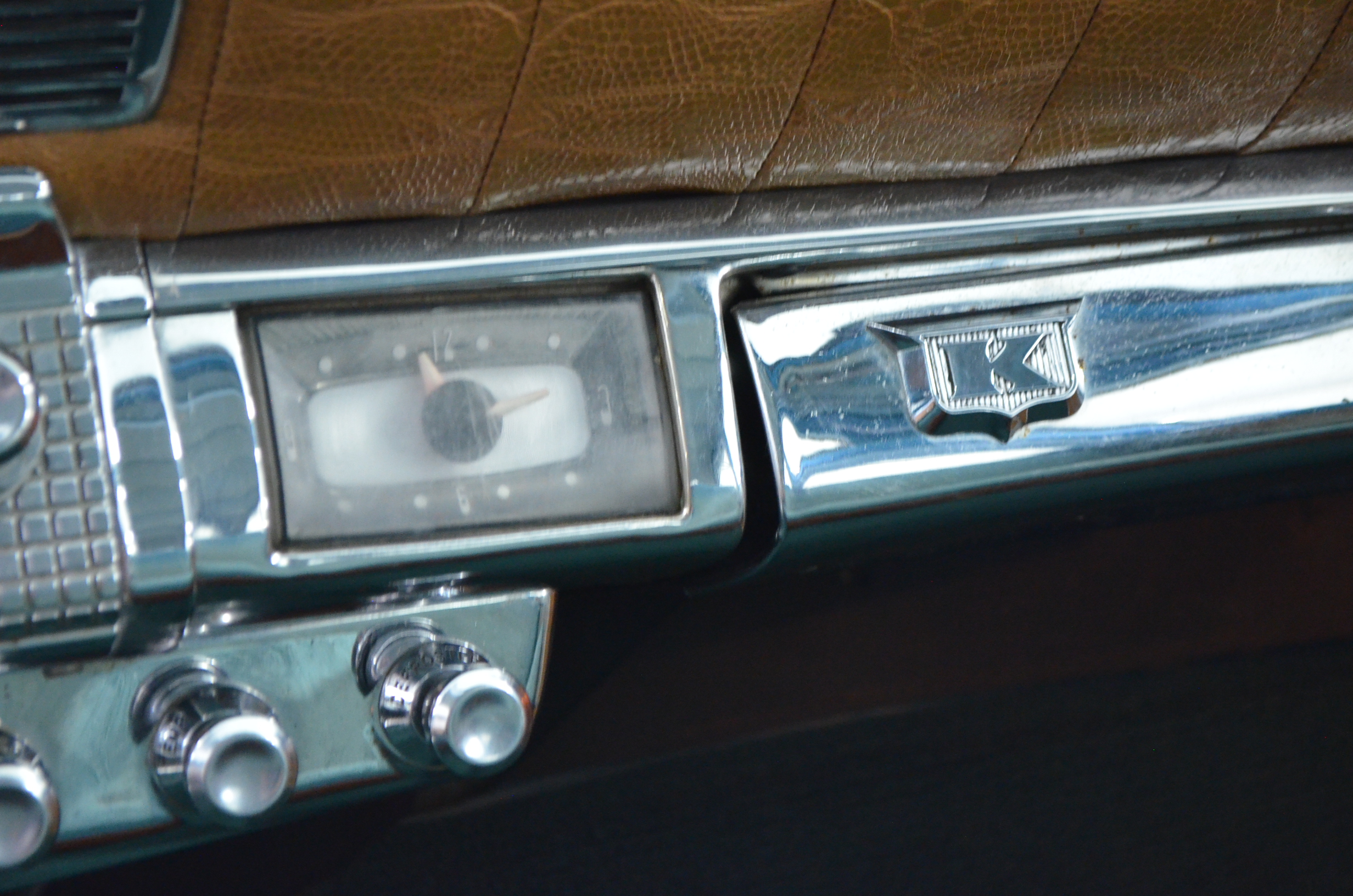 The interior is a true time capsule. The upholstery is all original, including what is sure to be a pristine rear seat under the dealer installed seat covers, installed over six decades ago. The door panels have water stains and the front seat with the original fabric has light soiling. The Turquoise Stockholm cloth would likely benefit from a Woolite cleaning treatment. The dinosaur reptilian trim is stunning. The carpet has been replaced, but matches the interior very well. The stainless used on the interior is in overall good condition with light scratching evident.