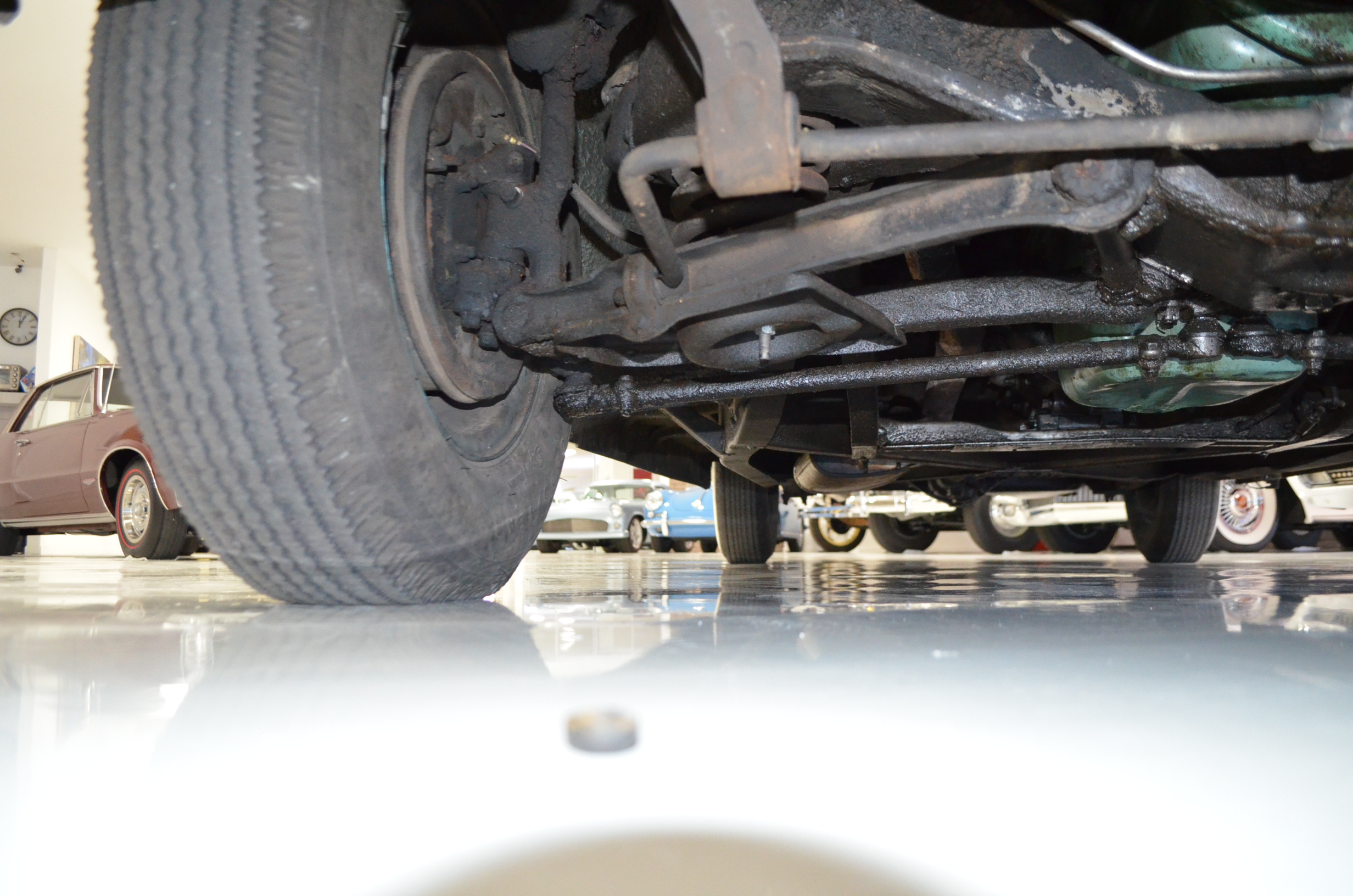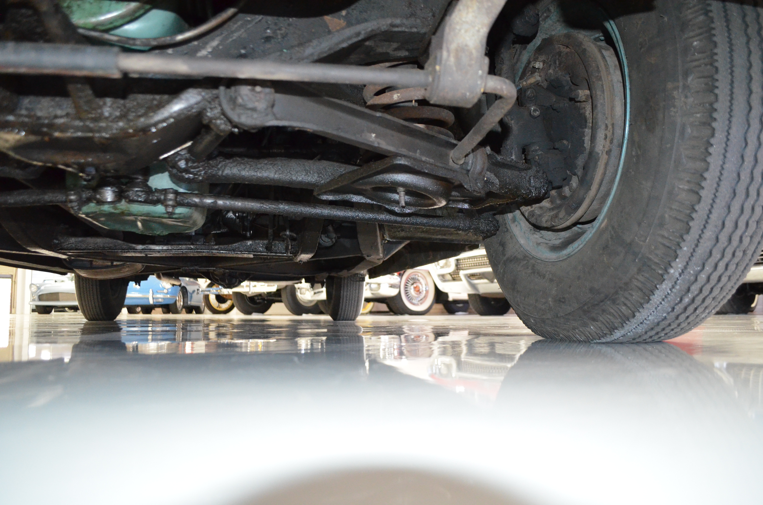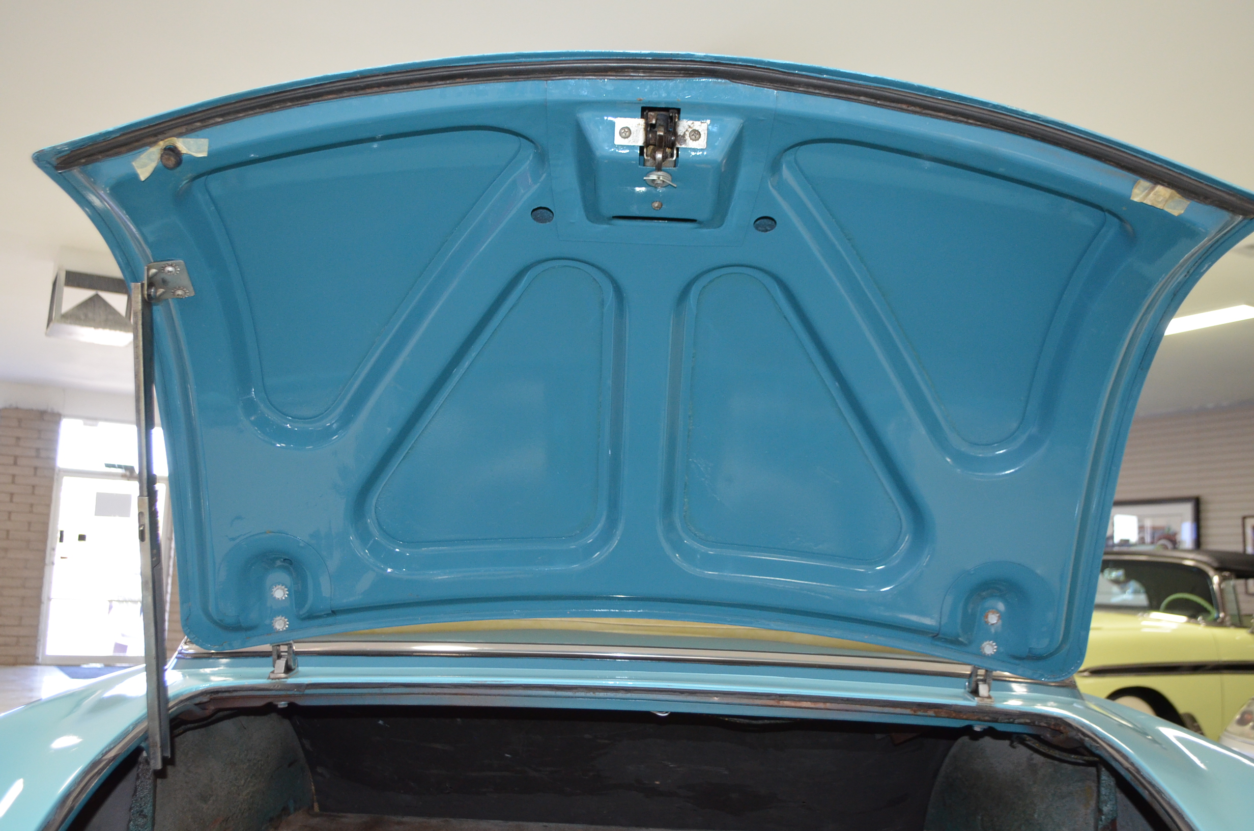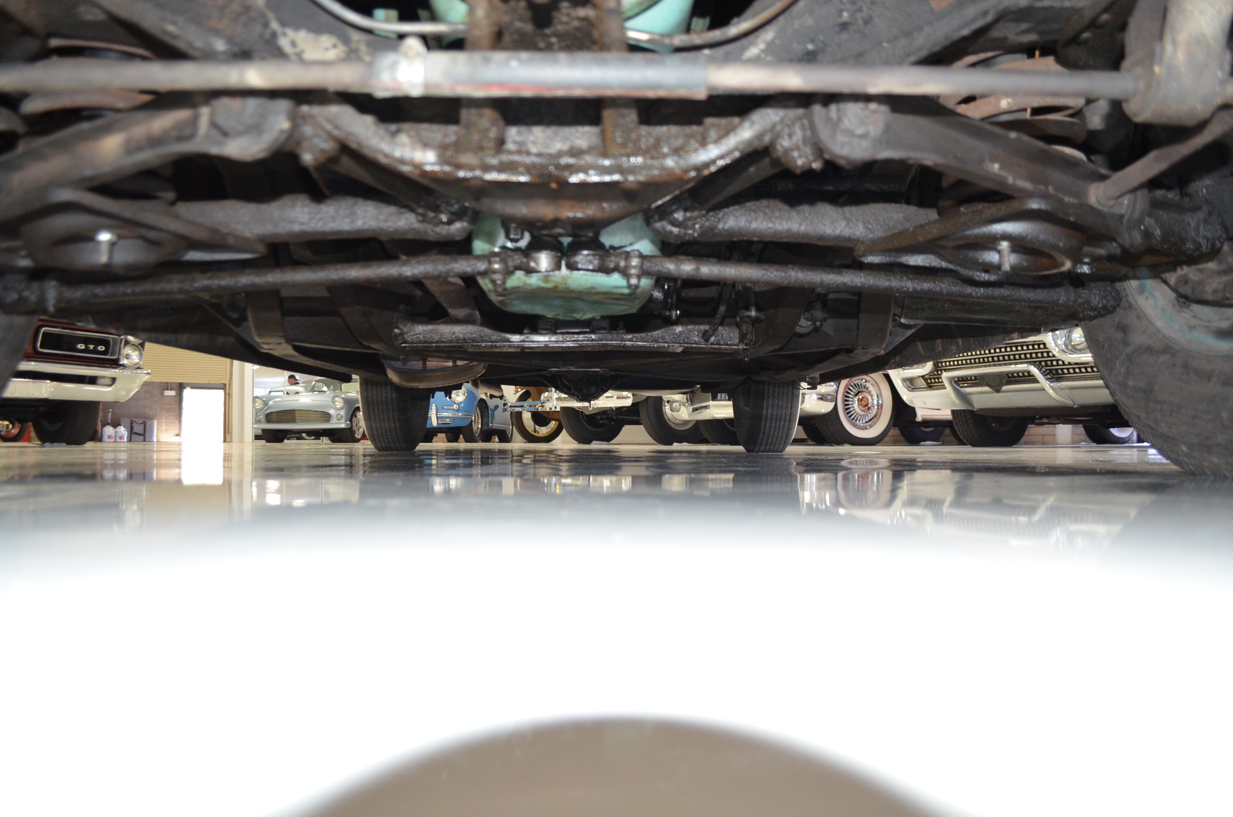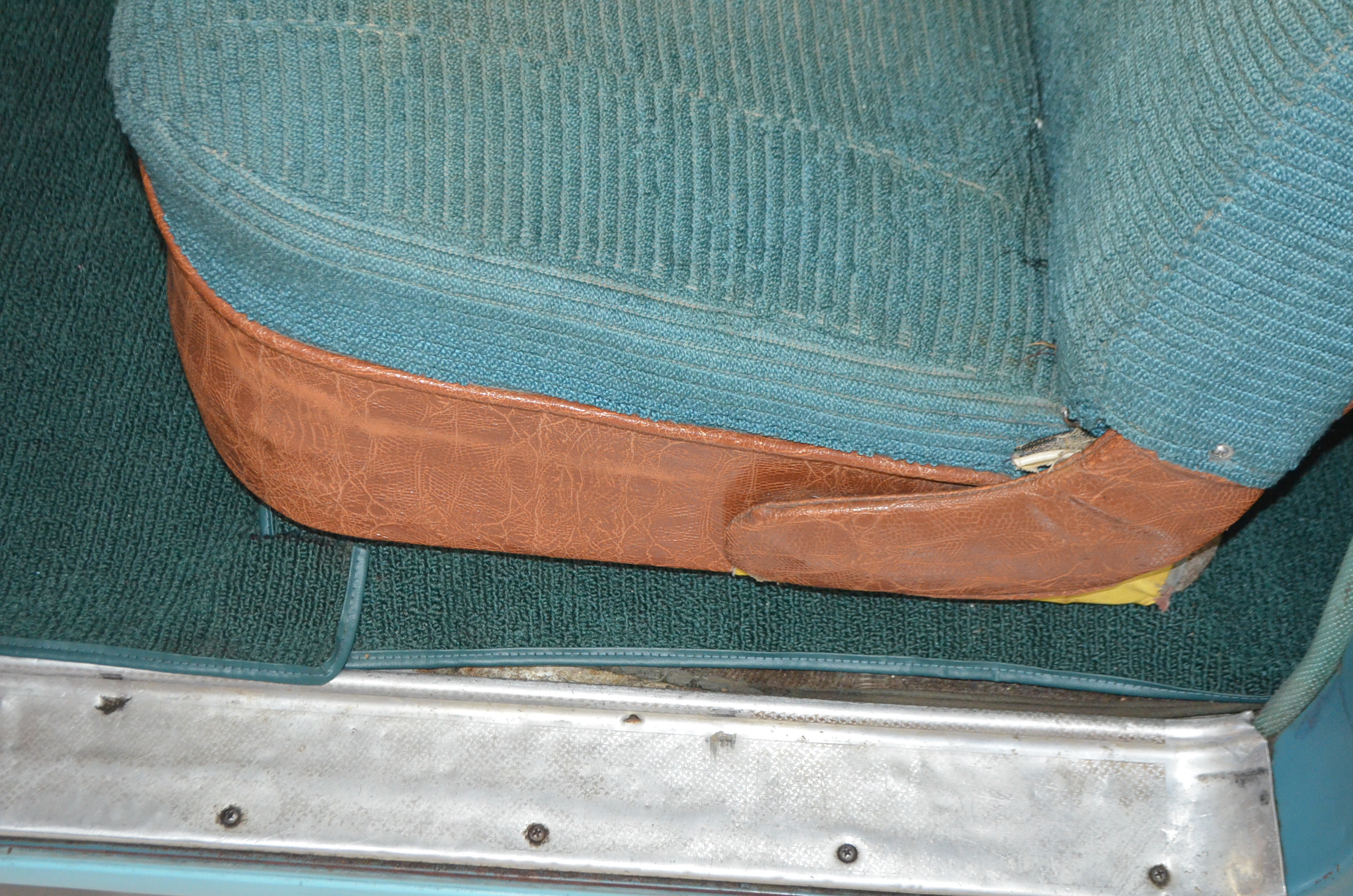 The interior is a true time capsule. The upholstery is all original, including what is sure to be a pristine rear seat under the dealer installed seat covers, installed over six decades ago. The door panels have water stains and the front seat with the original fabric has light soiling. The Turquoise Stockholm cloth would likely benefit from a Woolite cleaning treatment. The dinosaur reptilian trim is stunning. The carpet has been replaced, but matches the interior very well. The stainless used on the interior is in overall good condition with light scratching evident.