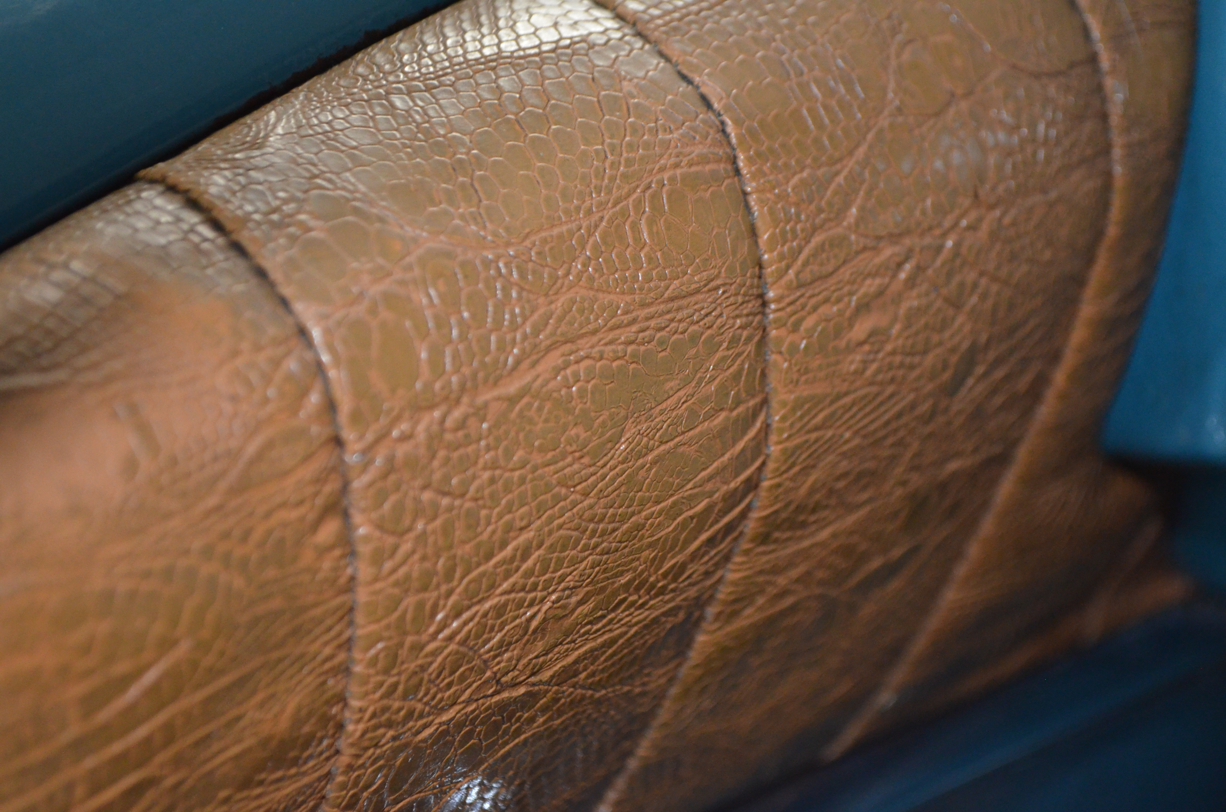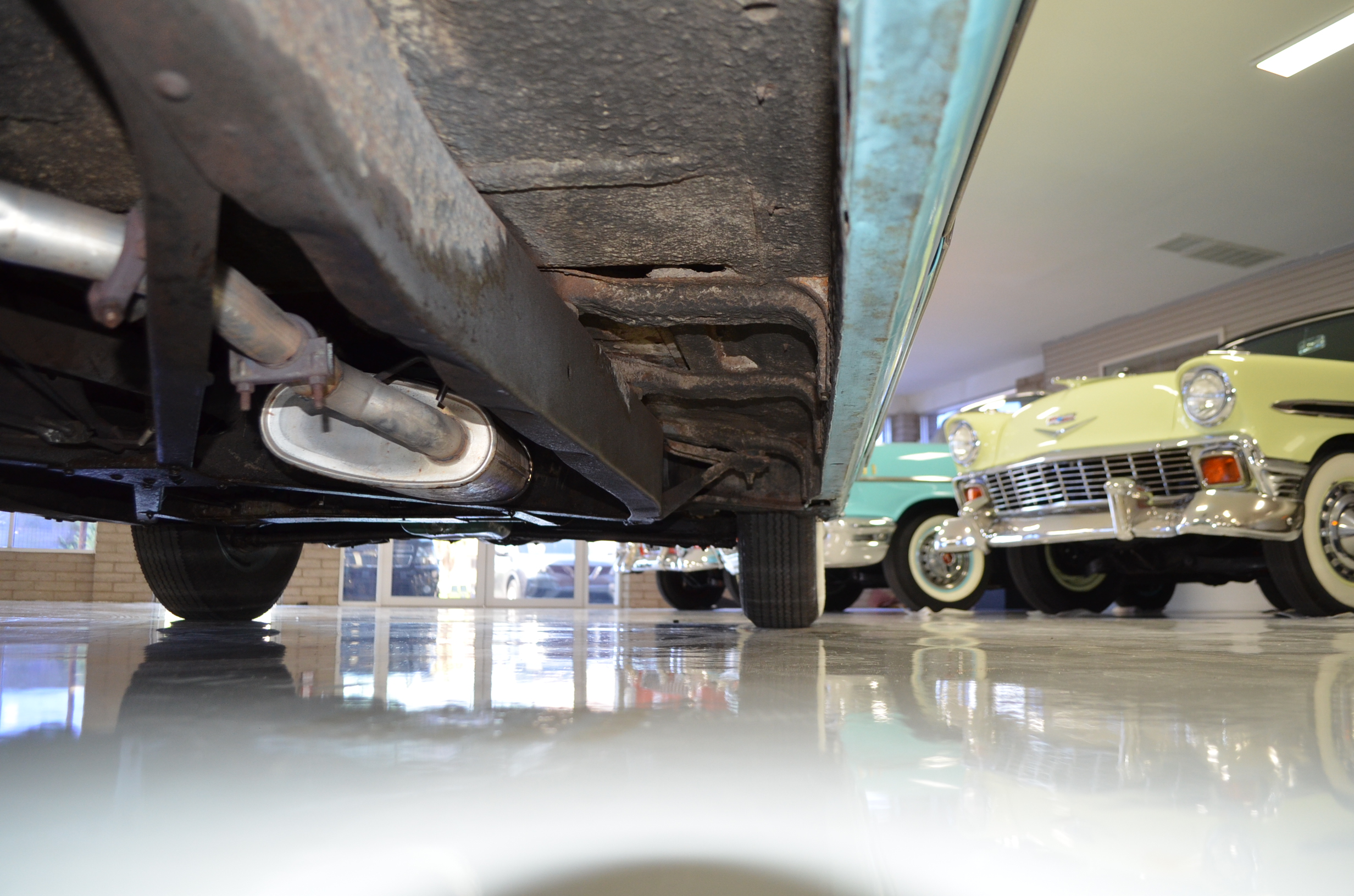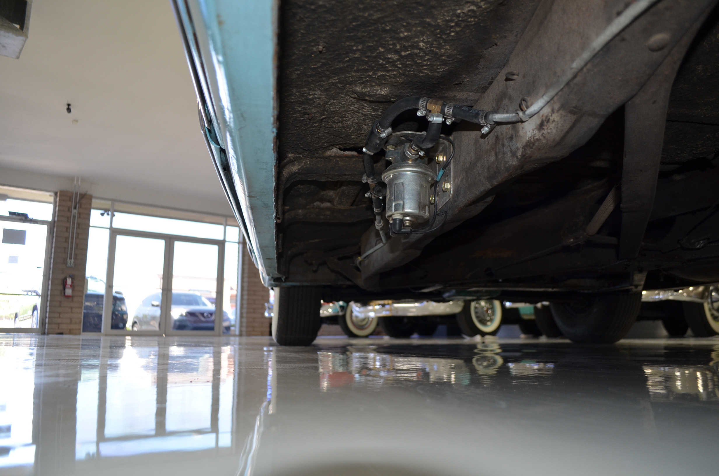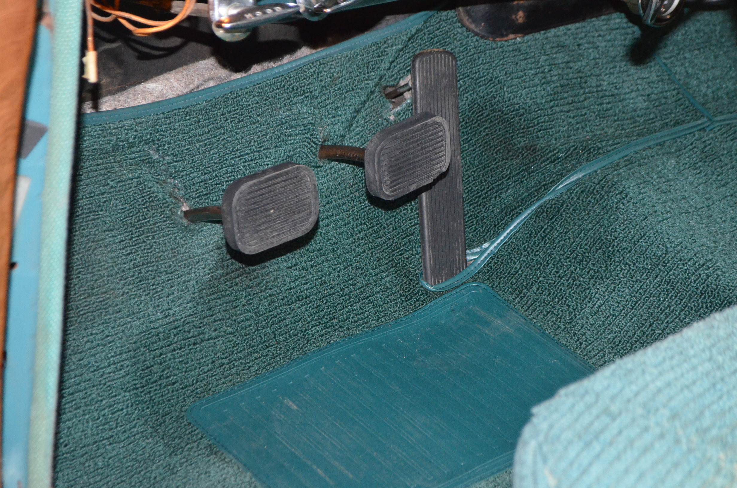 The interior is a true time capsule. The upholstery is all original, including what is sure to be a pristine rear seat under the dealer installed seat covers, installed over six decades ago. The door panels have water stains and the front seat with the original fabric has light soiling. The Turquoise Stockholm cloth would likely benefit from a Woolite cleaning treatment. The dinosaur reptilian trim is stunning. The carpet has been replaced, but matches the interior very well. The stainless used on the interior is in overall good condition with light scratching evident.
