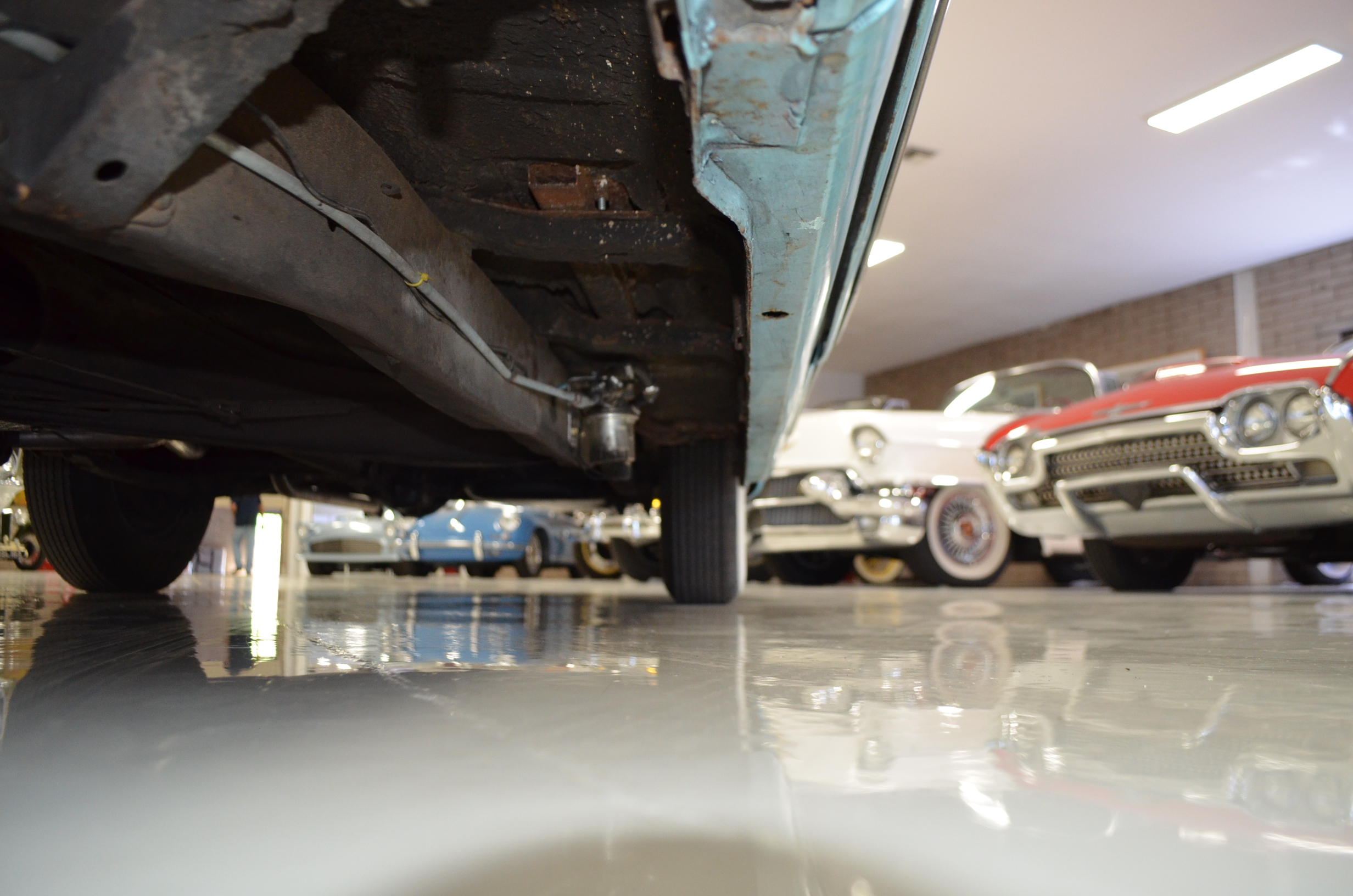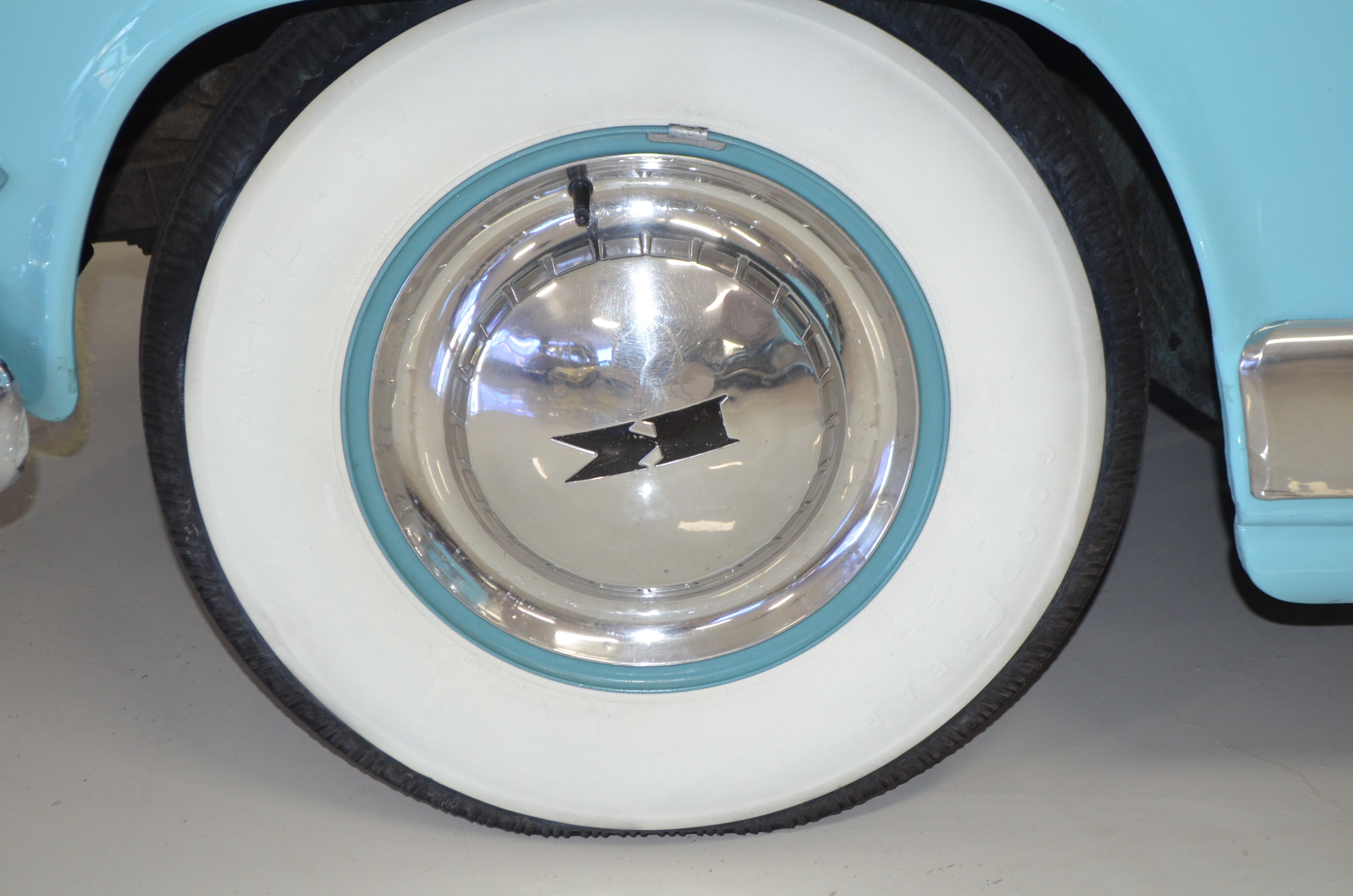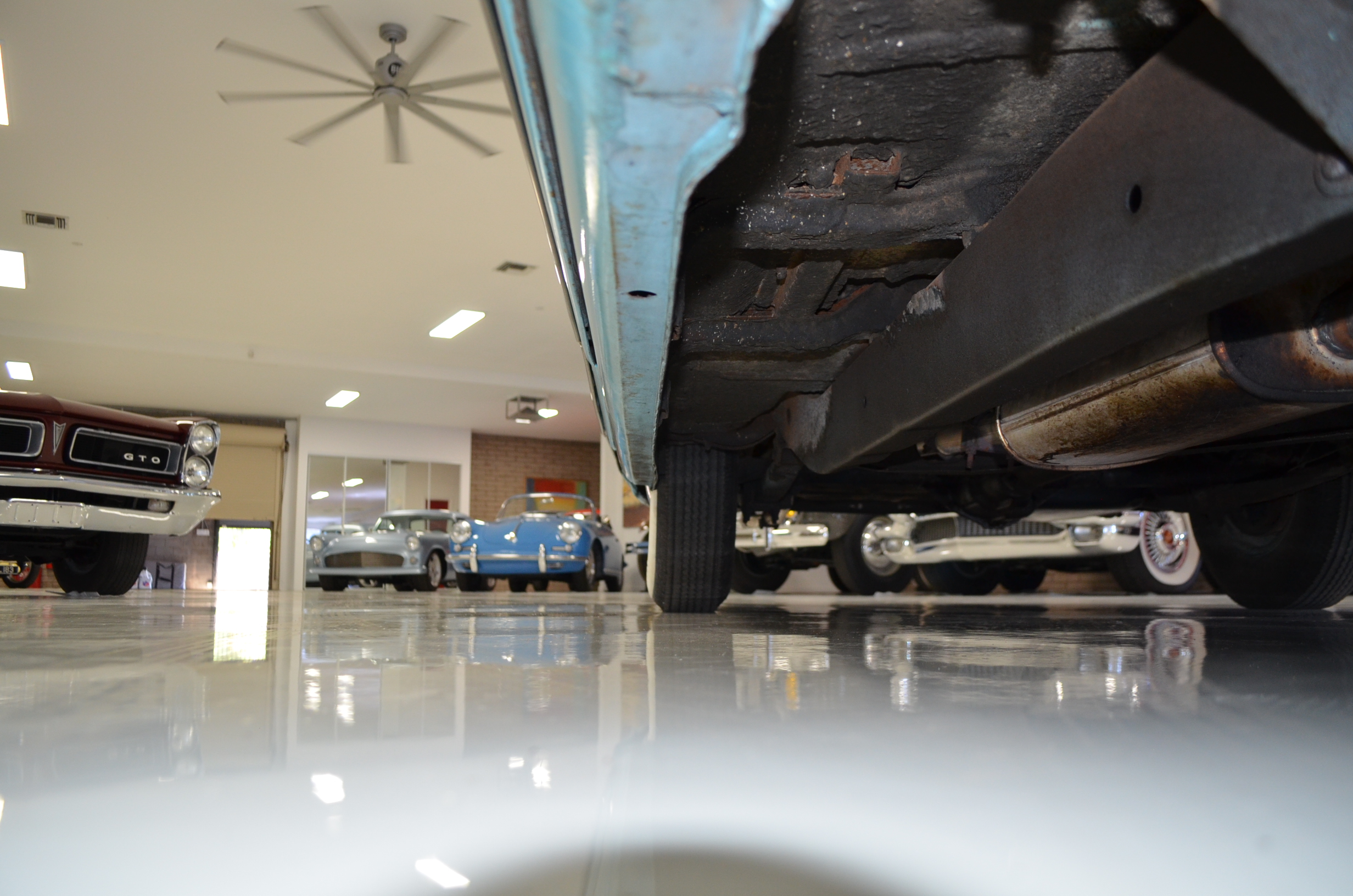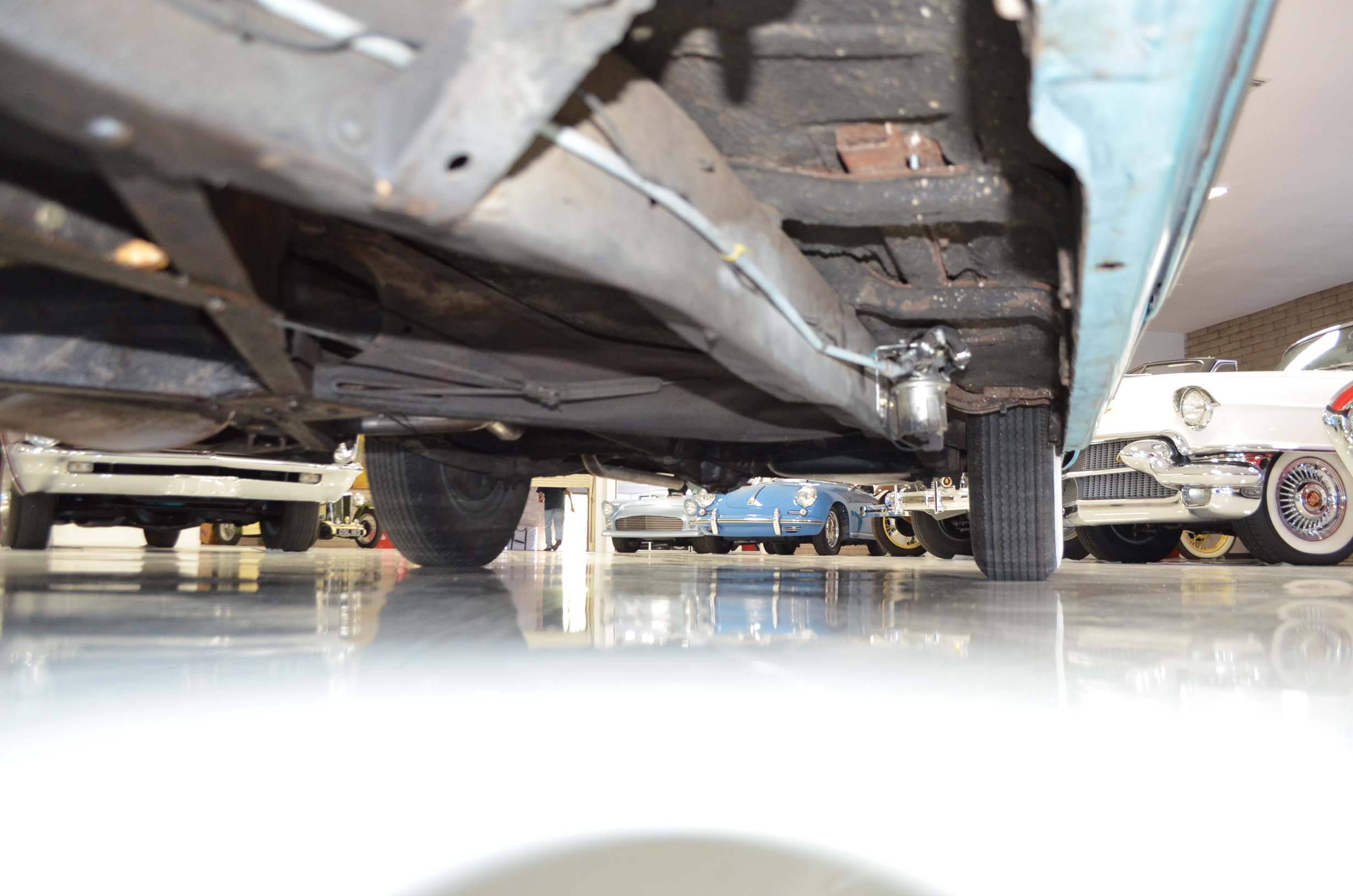 The interior is a true time capsule. The upholstery is all original, including what is sure to be a pristine rear seat under the dealer installed seat covers, installed over six decades ago. The door panels have water stains and the front seat with the original fabric has light soiling. The Turquoise Stockholm cloth would likely benefit from a Woolite cleaning treatment. The dinosaur reptilian trim is stunning. The carpet has been replaced, but matches the interior very well. The stainless used on the interior is in overall good condition with light scratching evident.