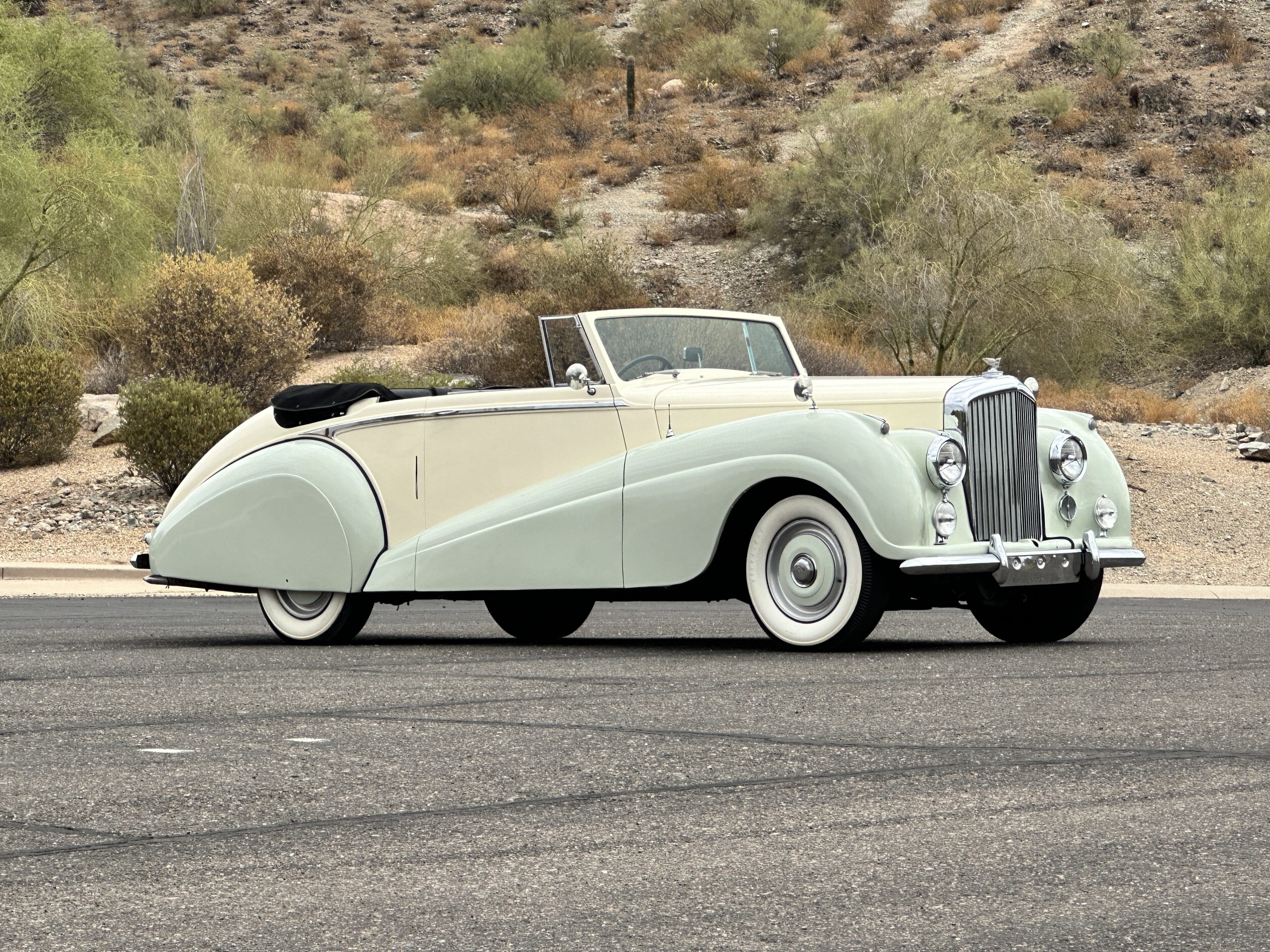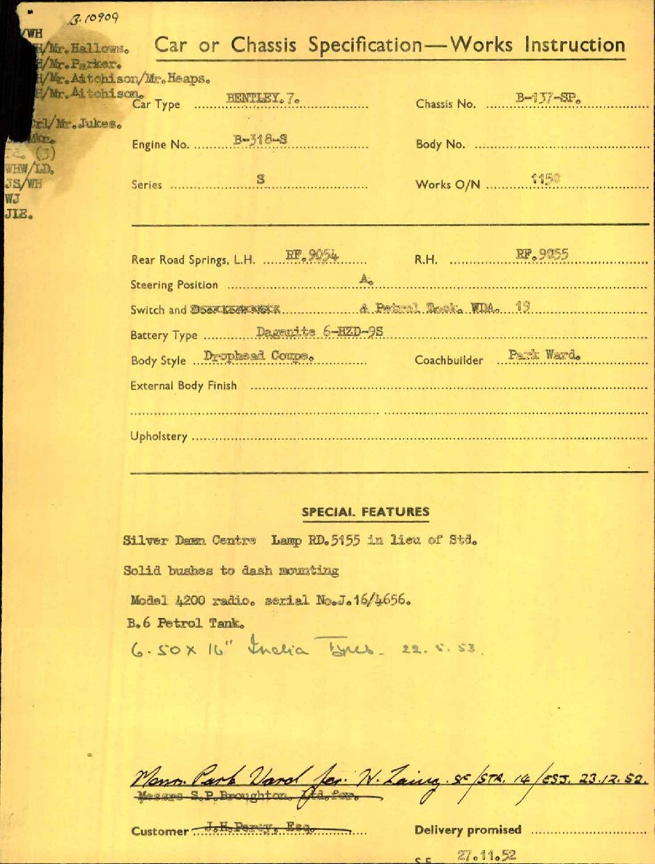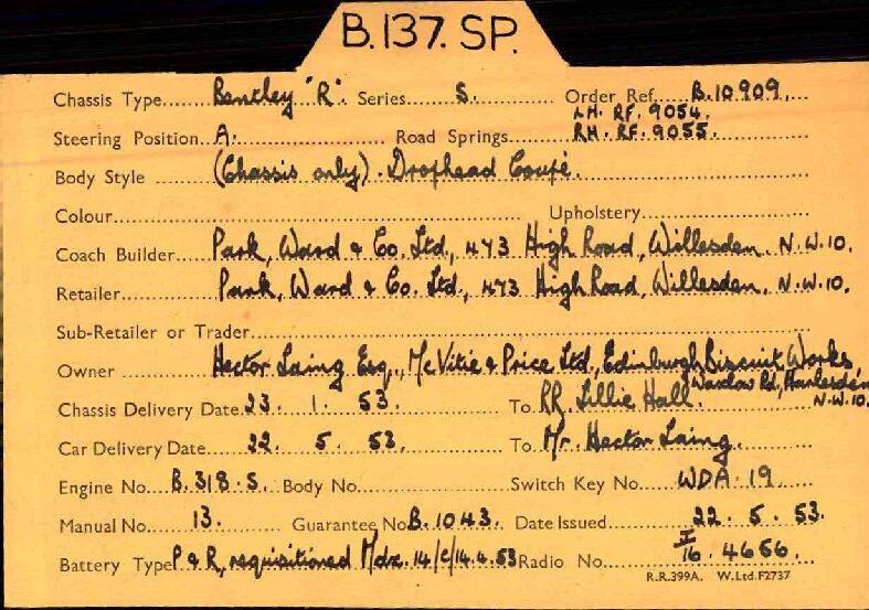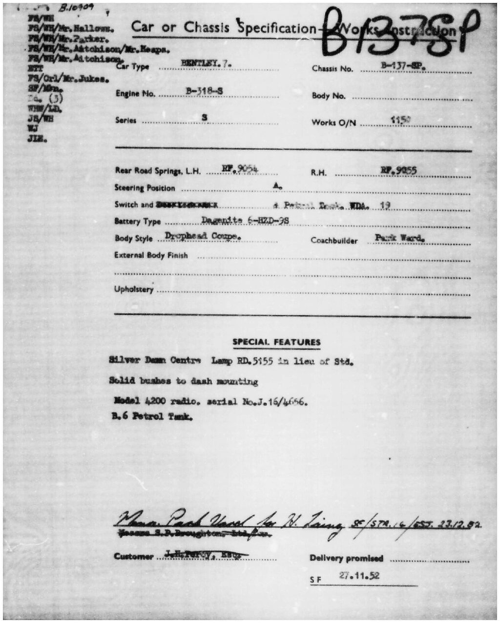 This Drophead Coupe is one of Park Ward’s Design 99 and the chassis was delivered to Park Ward on January 23, 1953. The craftsmen at Park Ward built B137SP for Mr. Hector Lang for the Edinburgh Biscuit Works and it was delivered new on May 22, 1953. The Bentley was enjoyed by Mr. Lang until it was acquired by Mr. D.D. Robinson of Wednesbury on June 30, 1961. Mr. Lang had ordered a Bentley S2 Hooper Saloon to replace the Drophead. By the 1970’s, the Bentley had made its way to Colorado and was owned by Dr. Hassan. Dr. Hassan was quite infamous for a period and desired a four-door saloon. Mr. Leslie Shapiro traded his 1956 Bentley S1 Saloon and some supplemental funds for this Drophead Coupe. Mr. Shapiro set out on a complete repaint and further restoration work and by about 2001 had gifted it to his son, Mr. Laurence Shapiro of Aspen and Vail, CO. The Bentley has been enjoyed on at least two cross country trips and has been regularly used and enjoyed.