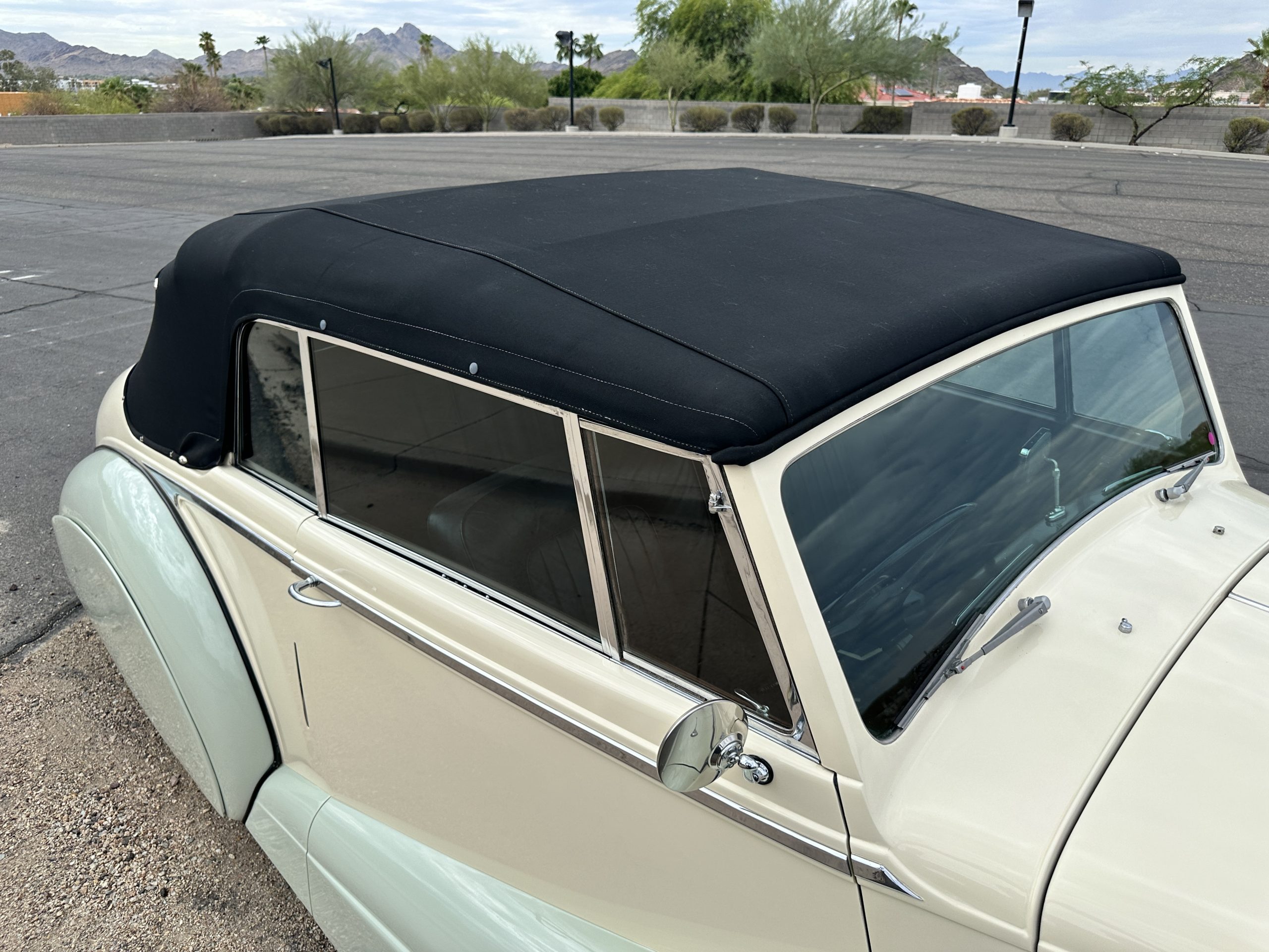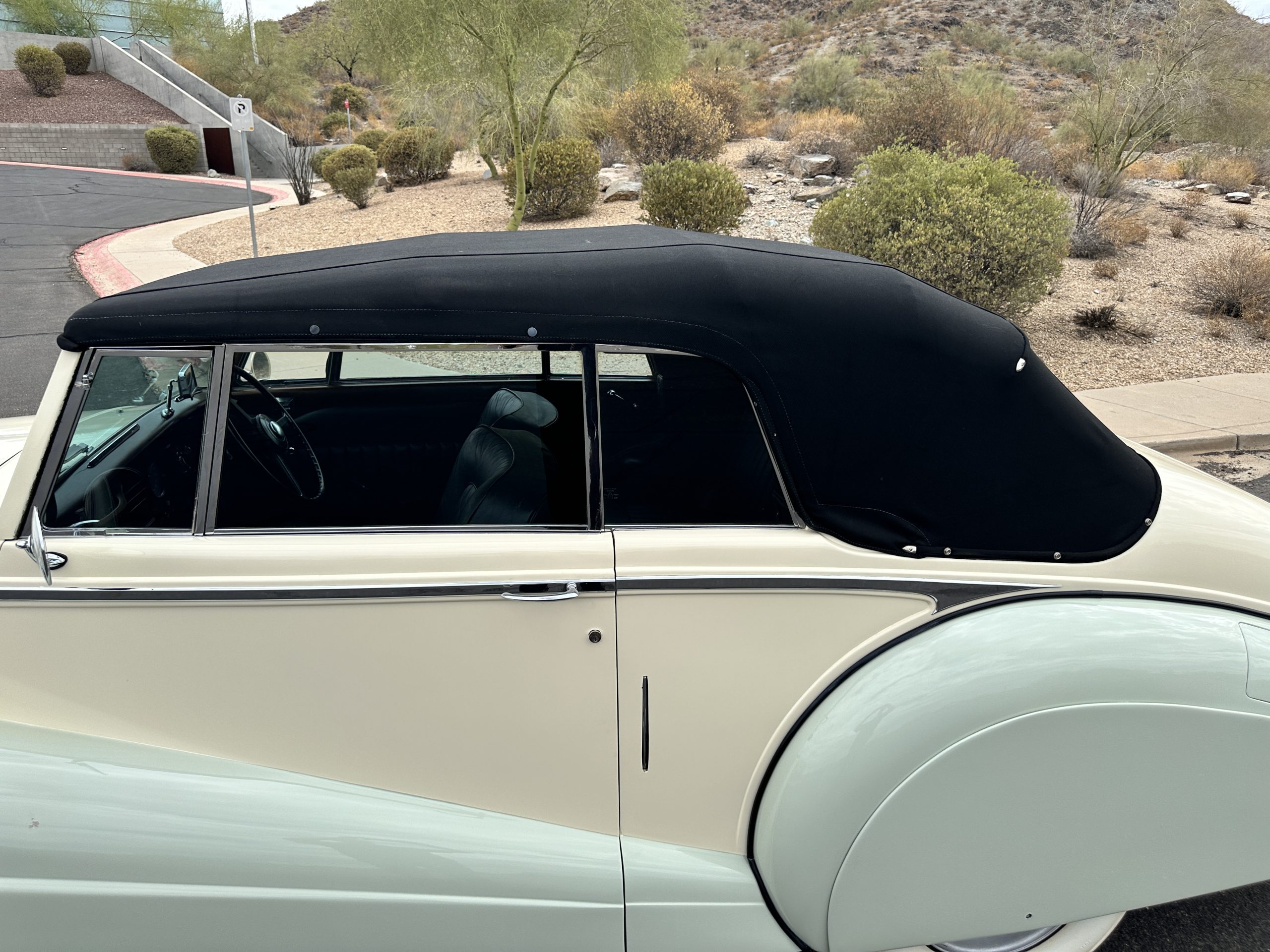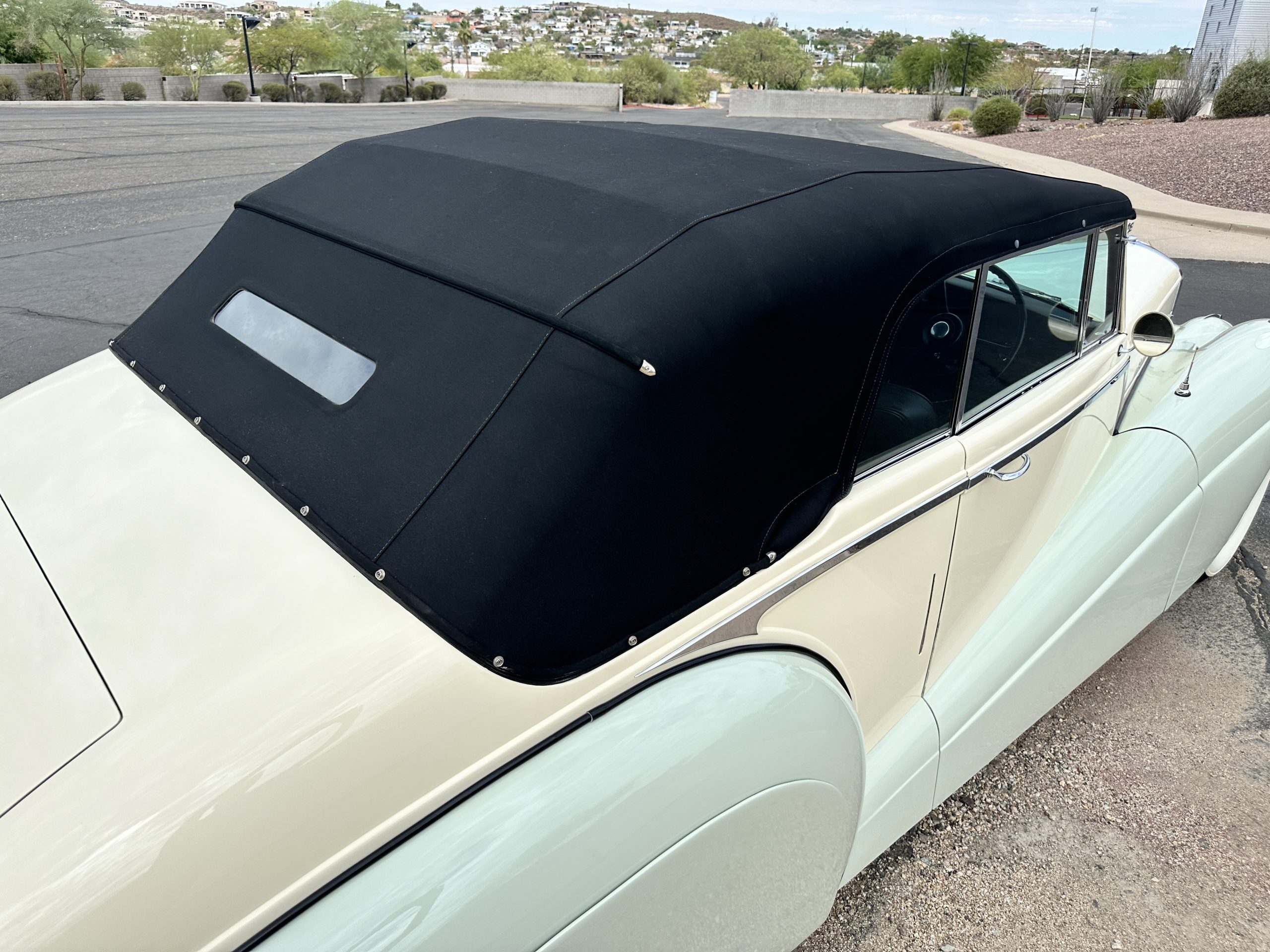 The livery was refinished in a lovely Ivory over a Pale Green two tone with beautiful original chrome and stainless-steel trim. The paint is in overall good condition considering its age and, really looks stunning outside while driving it. The black canvas Haartz cloth power convertible top looks as new and belies its age as it was installed in about 2001. The electric convertible top works very well.