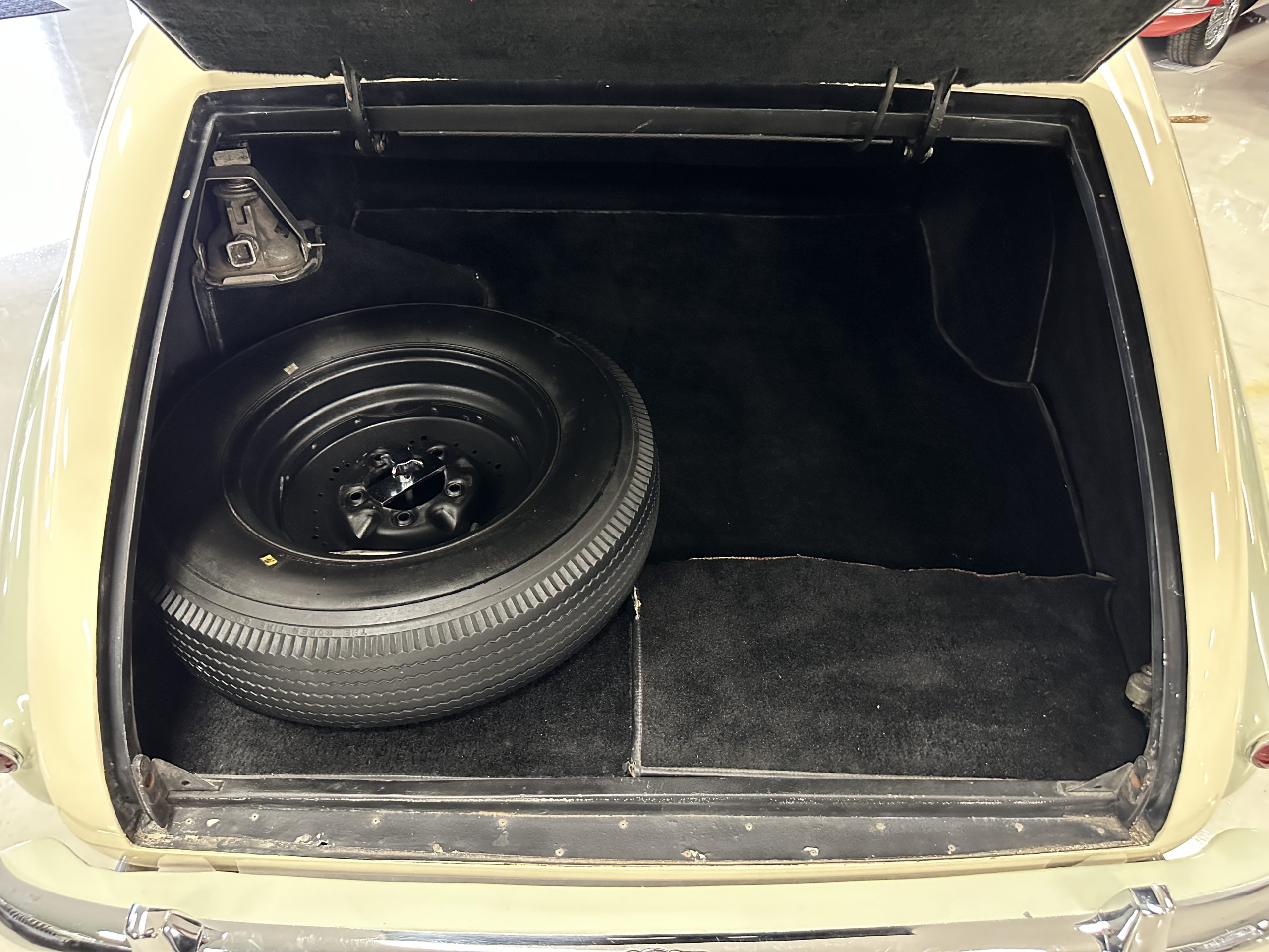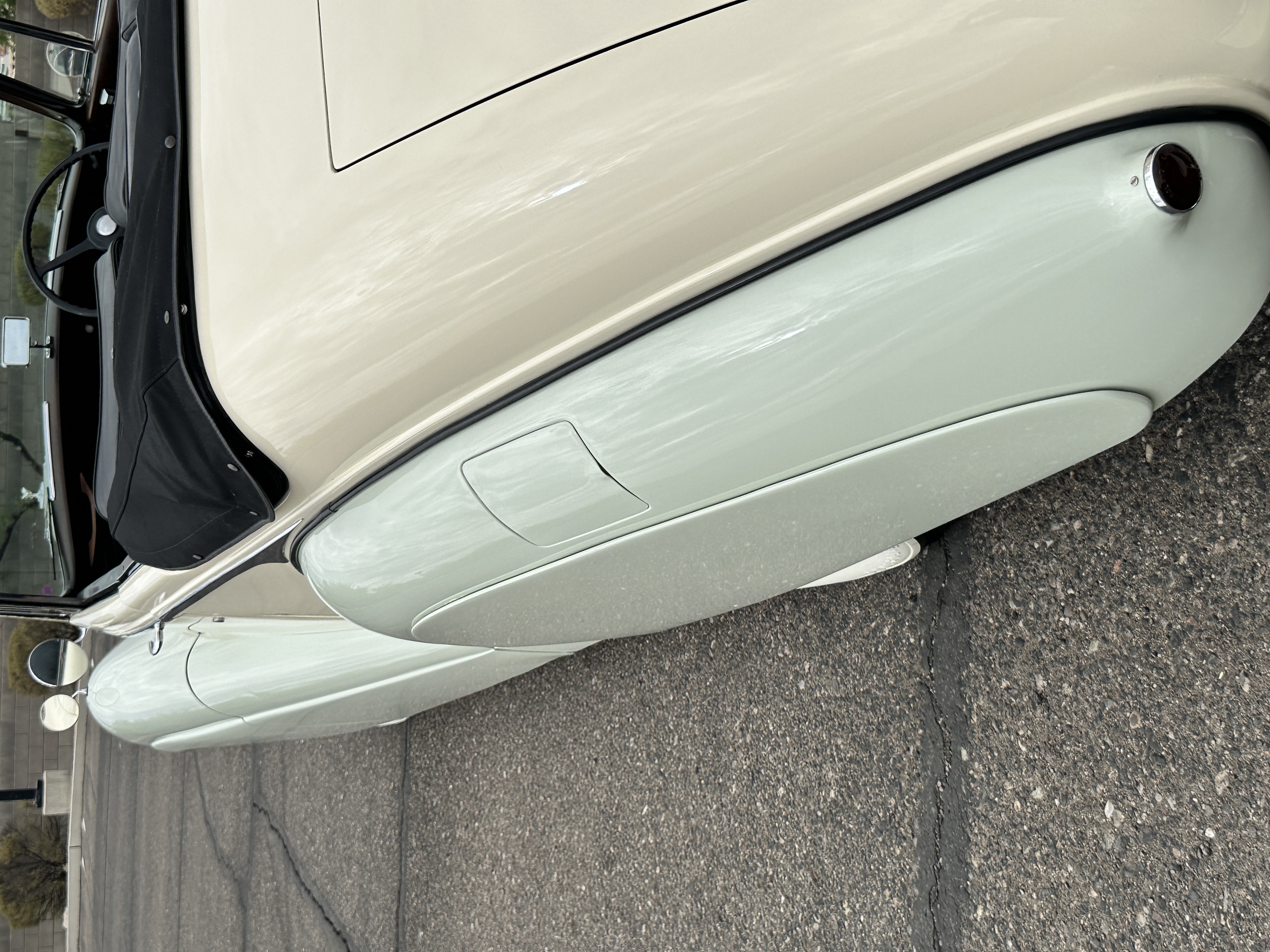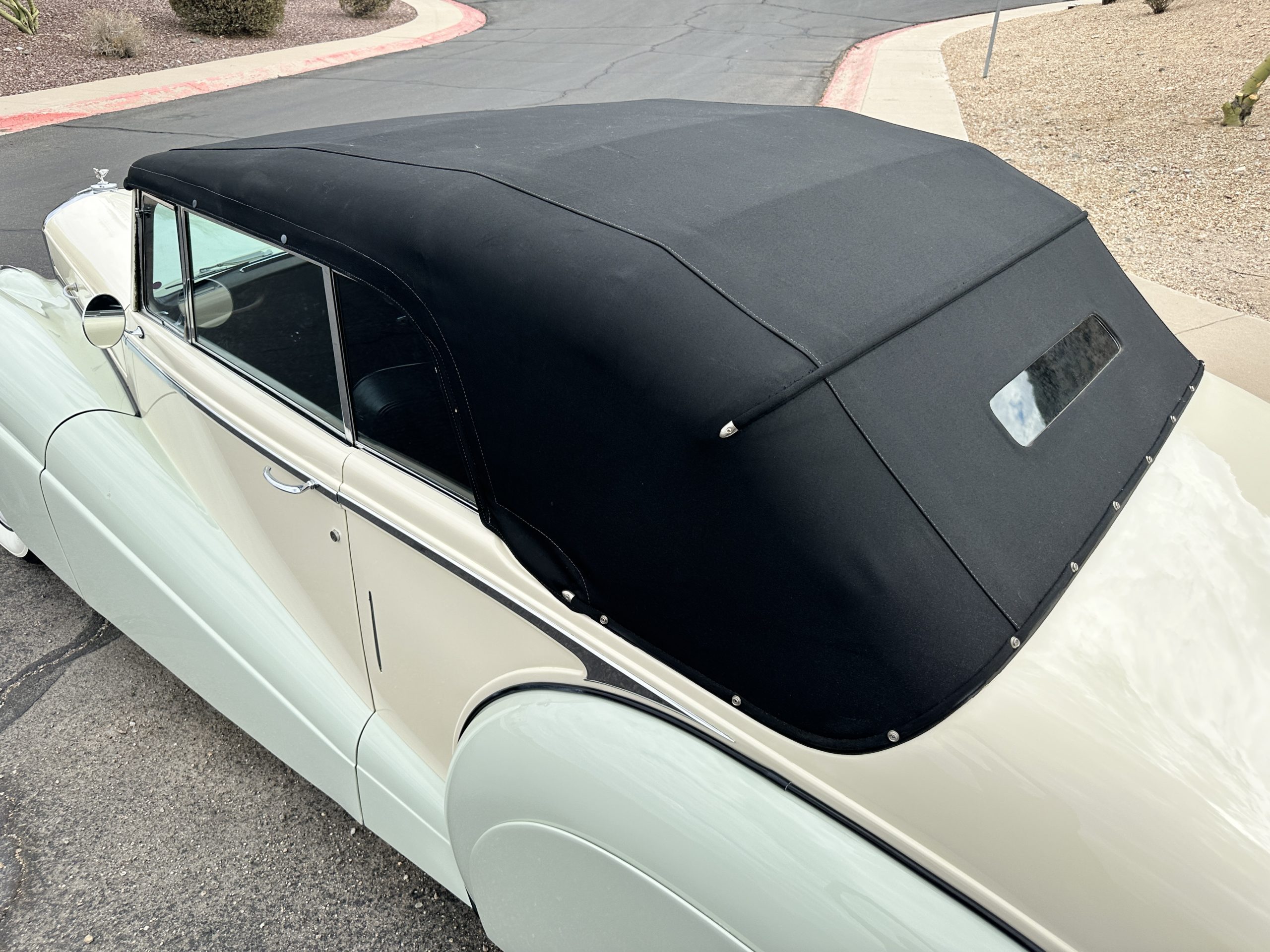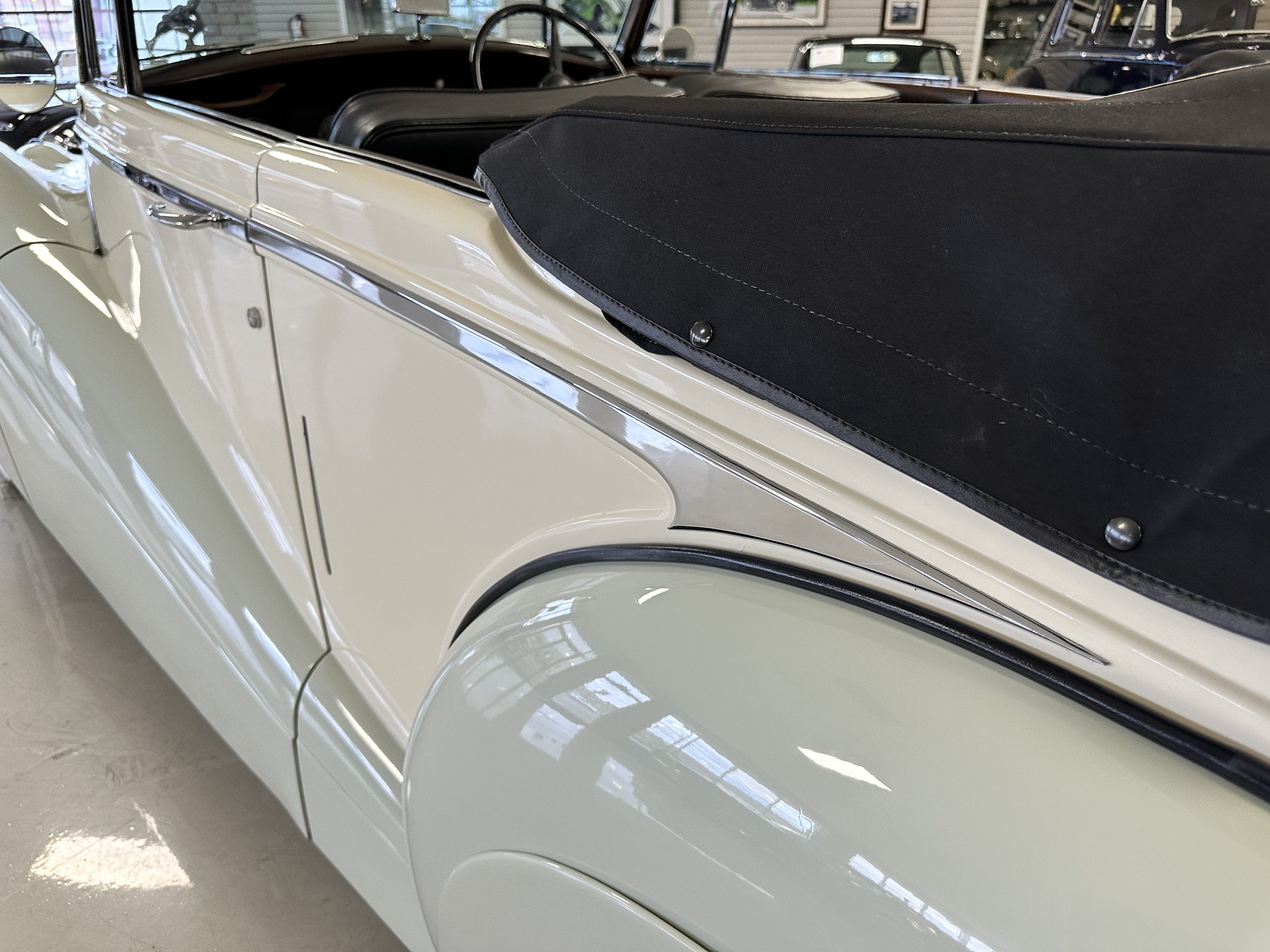 The livery was refinished in a lovely Ivory over a Pale Green two tone with beautiful original chrome and stainless-steel trim. The paint is in overall good condition considering its age and, really looks stunning outside while driving it. The black canvas Haartz cloth power convertible top looks as new and belies its age as it was installed in about 2001. The electric convertible top works very well.