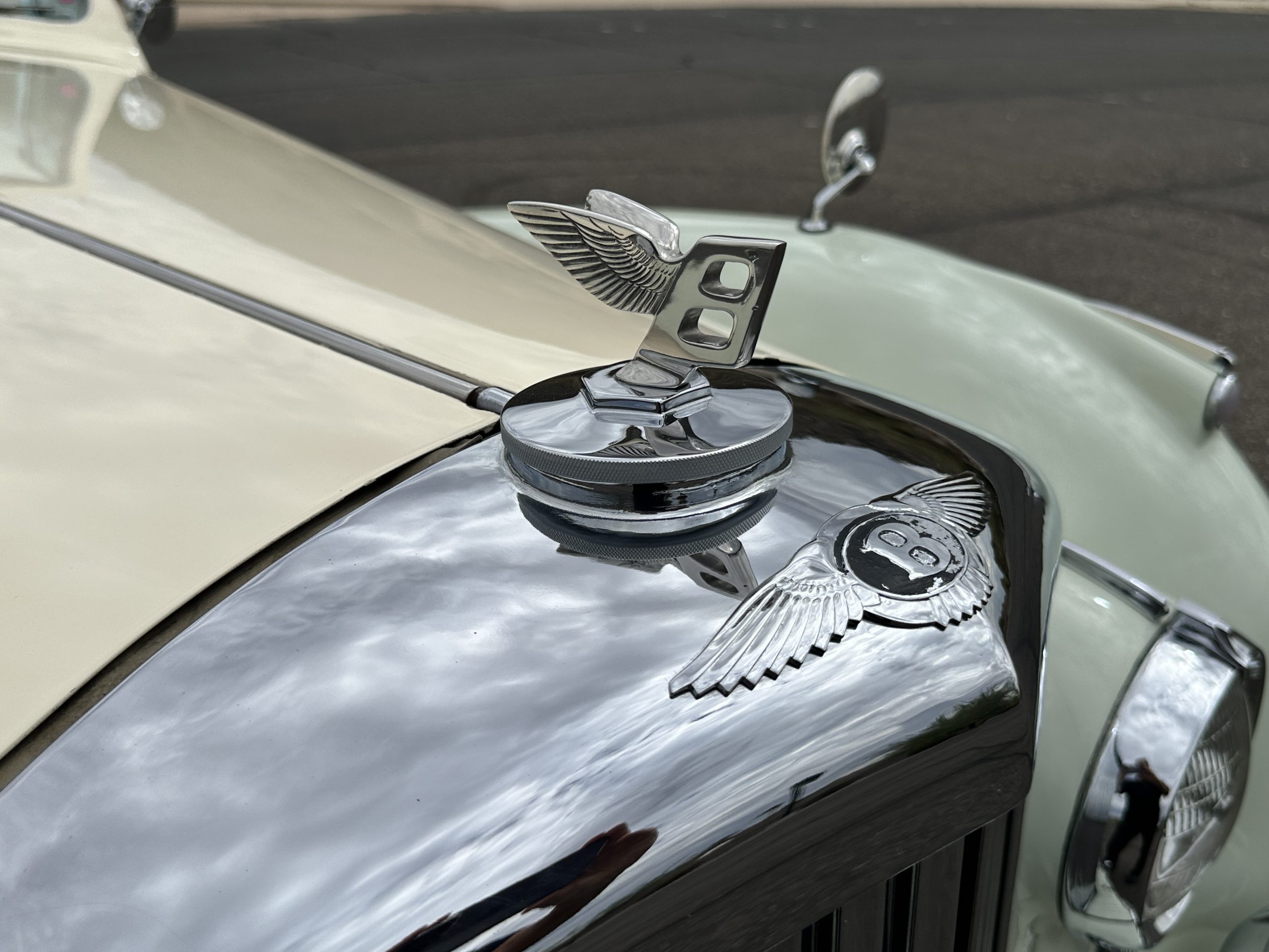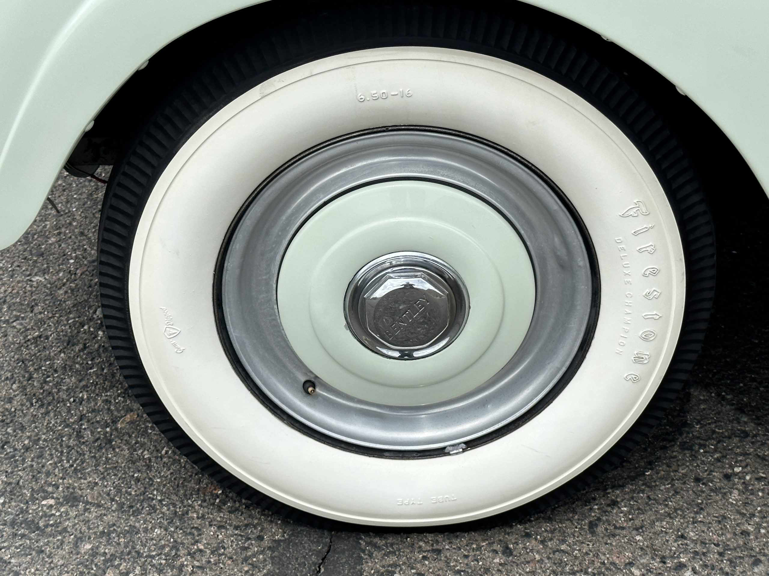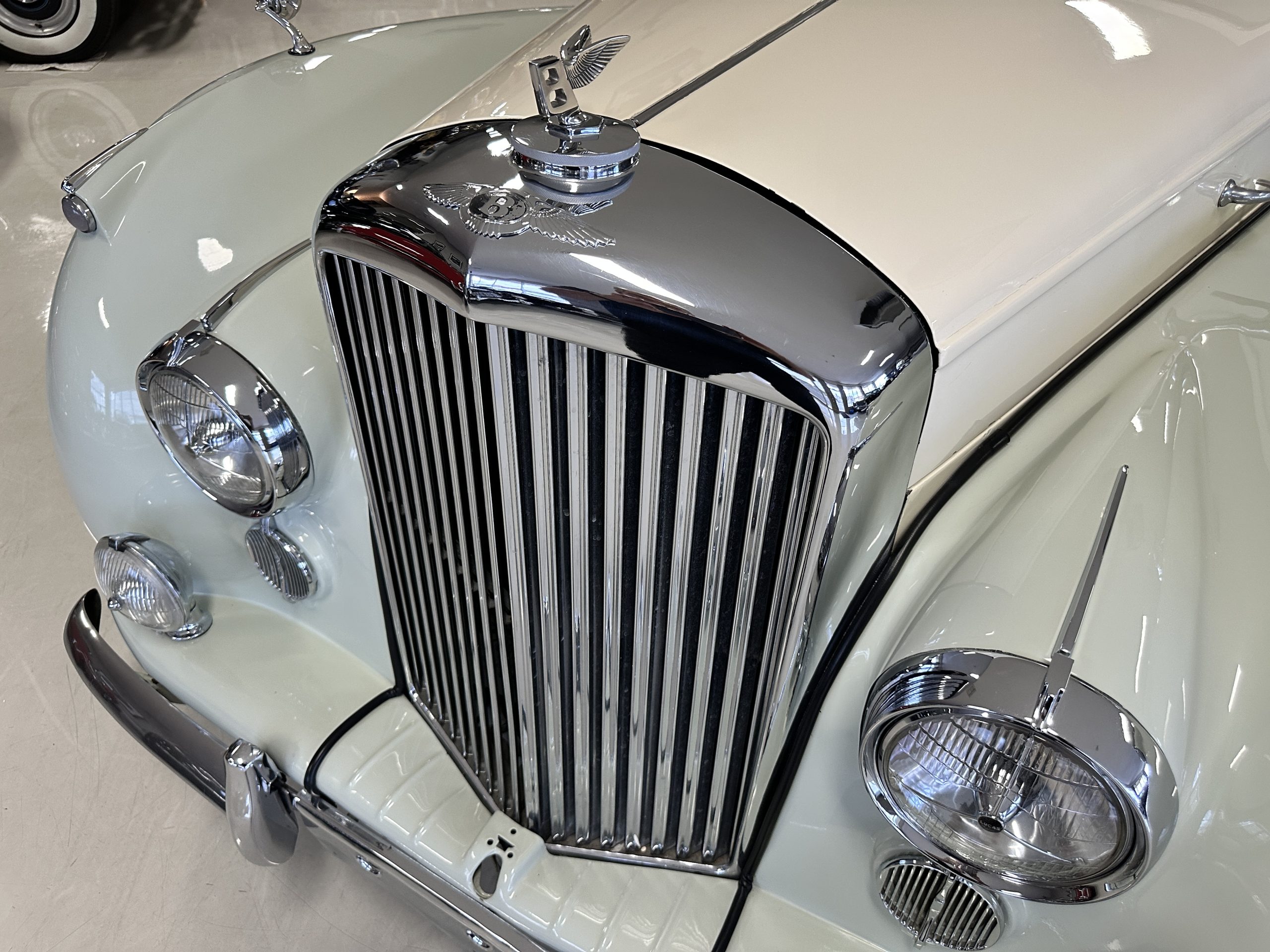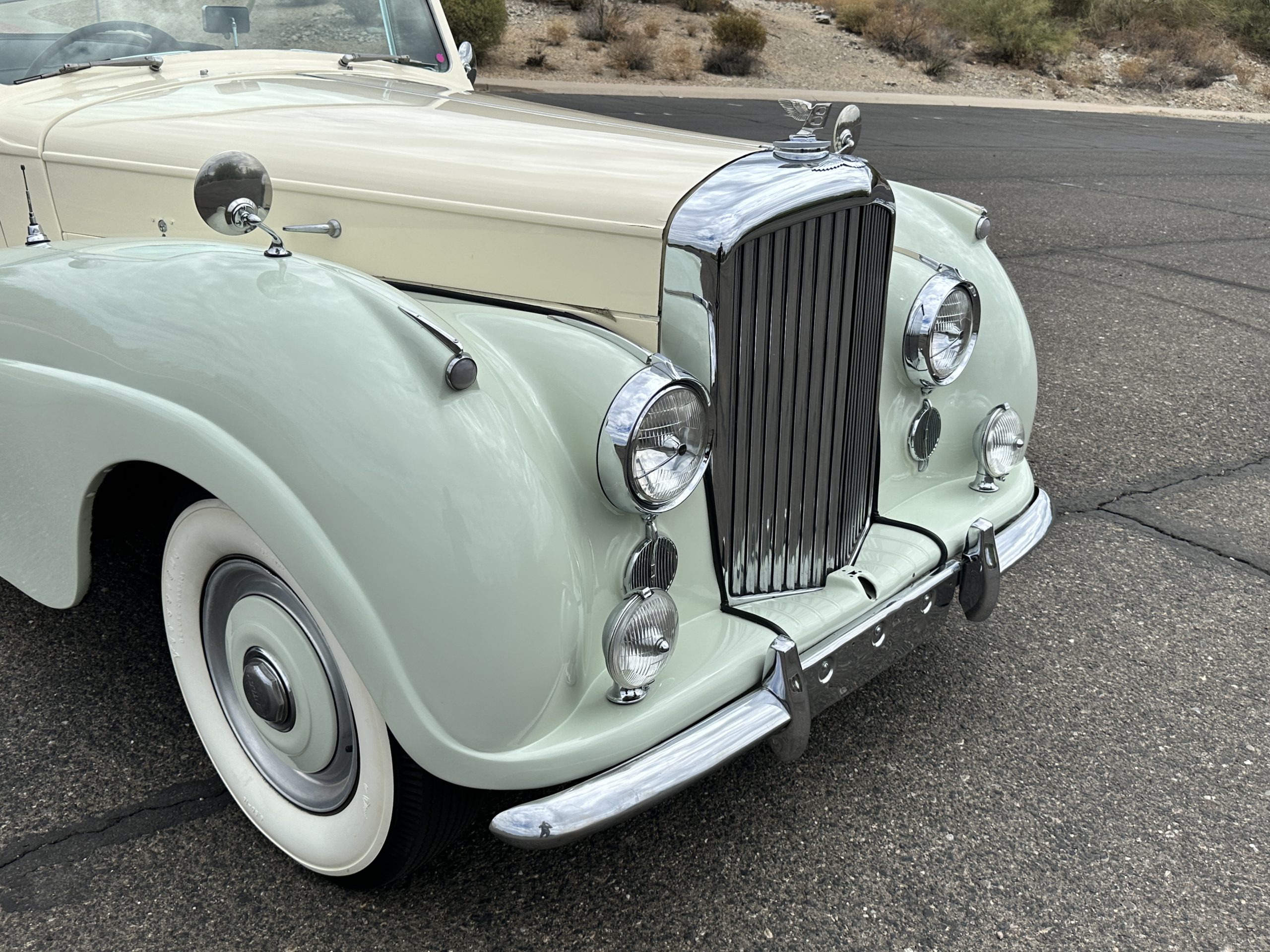 In our opinion, the white walled tires would be better off replaced with black walled radial tires. This is a quick and easy upgrade. The chrome and stainless-steel trim are in surprisingly great condition. There are no signs of pitting or dents, showing that this Bentley has been cared for and cherished. We love the enormous fender skirts that create the gorgeous sexy curves that starts at the front fenders and continues through the entire length of the car. This looks much more like French coachwork than English. Thank you, Park Ward.