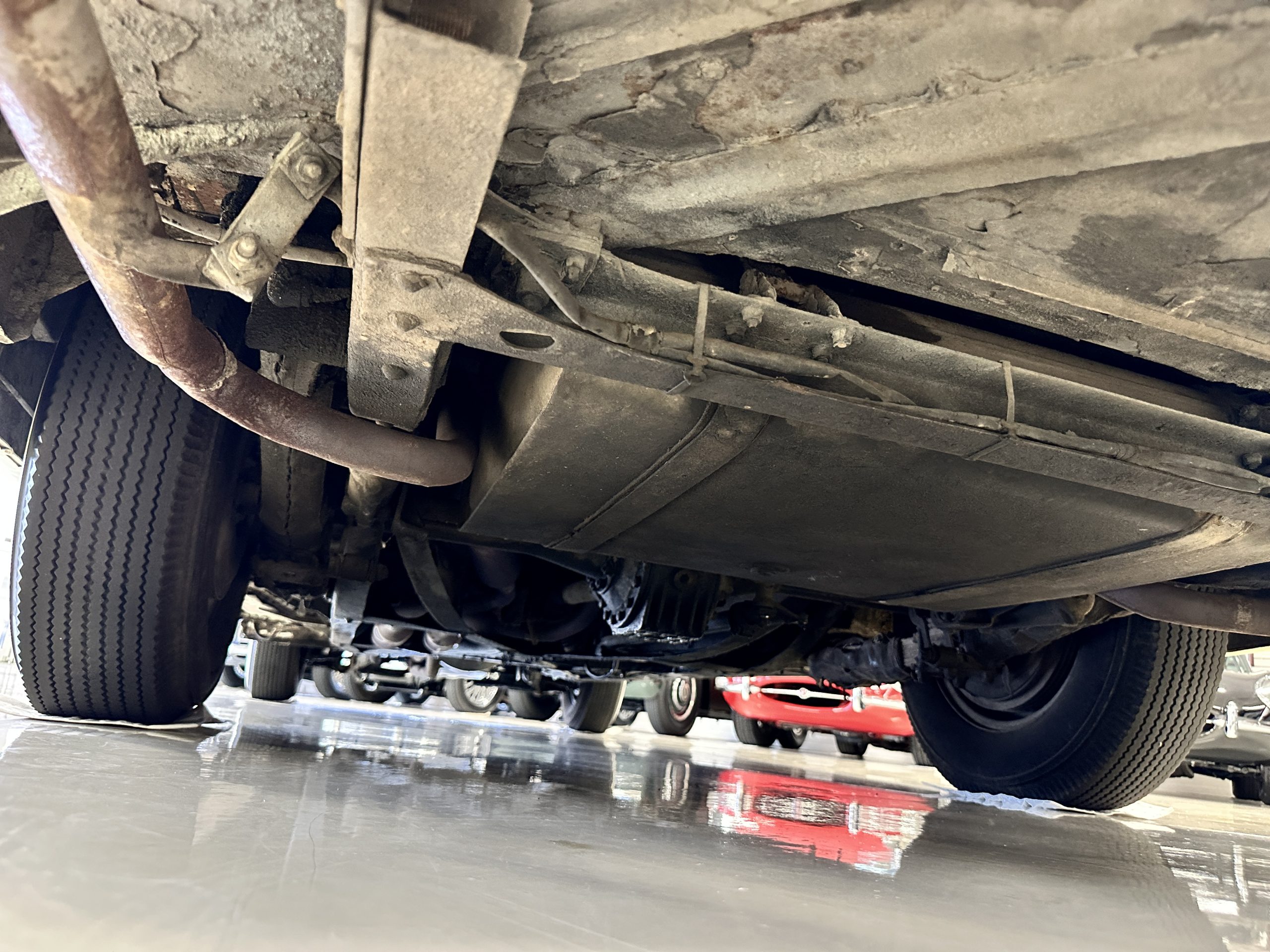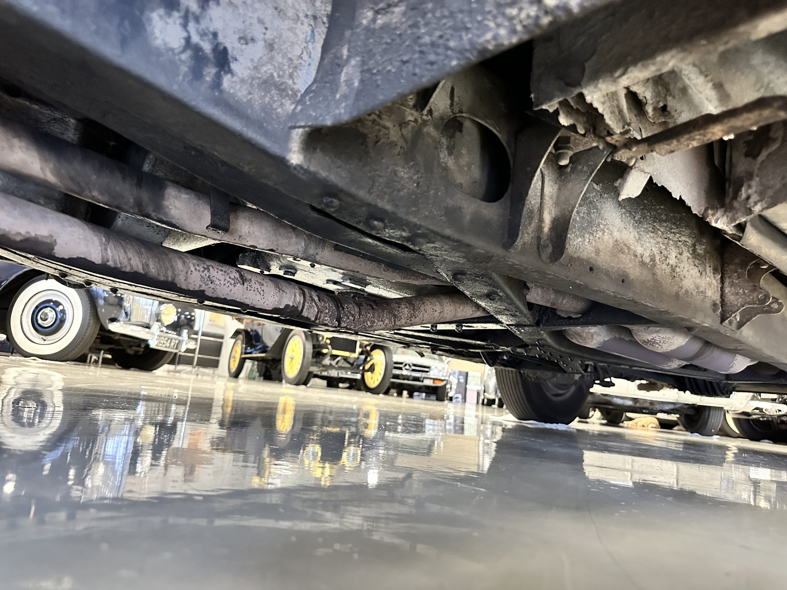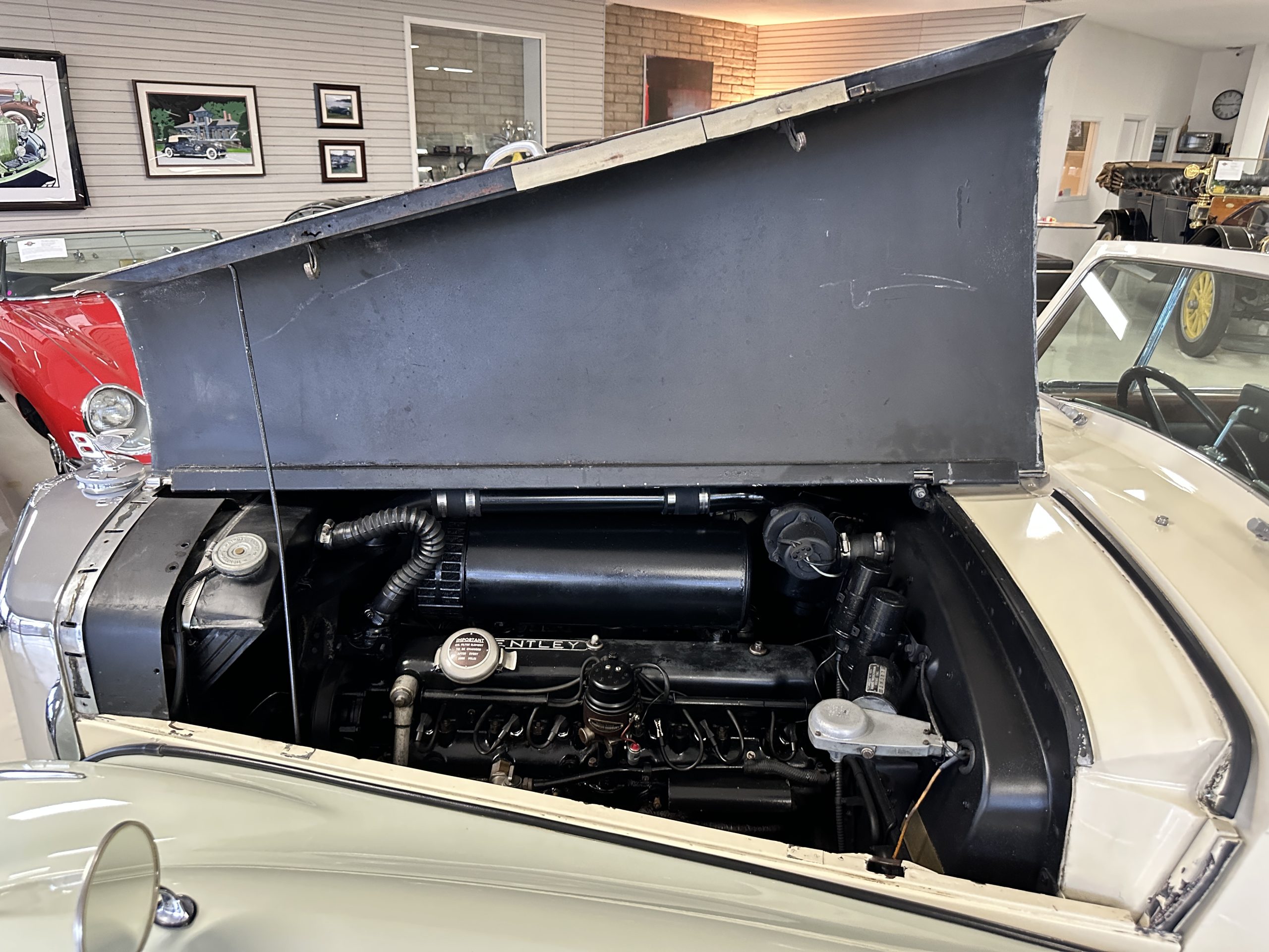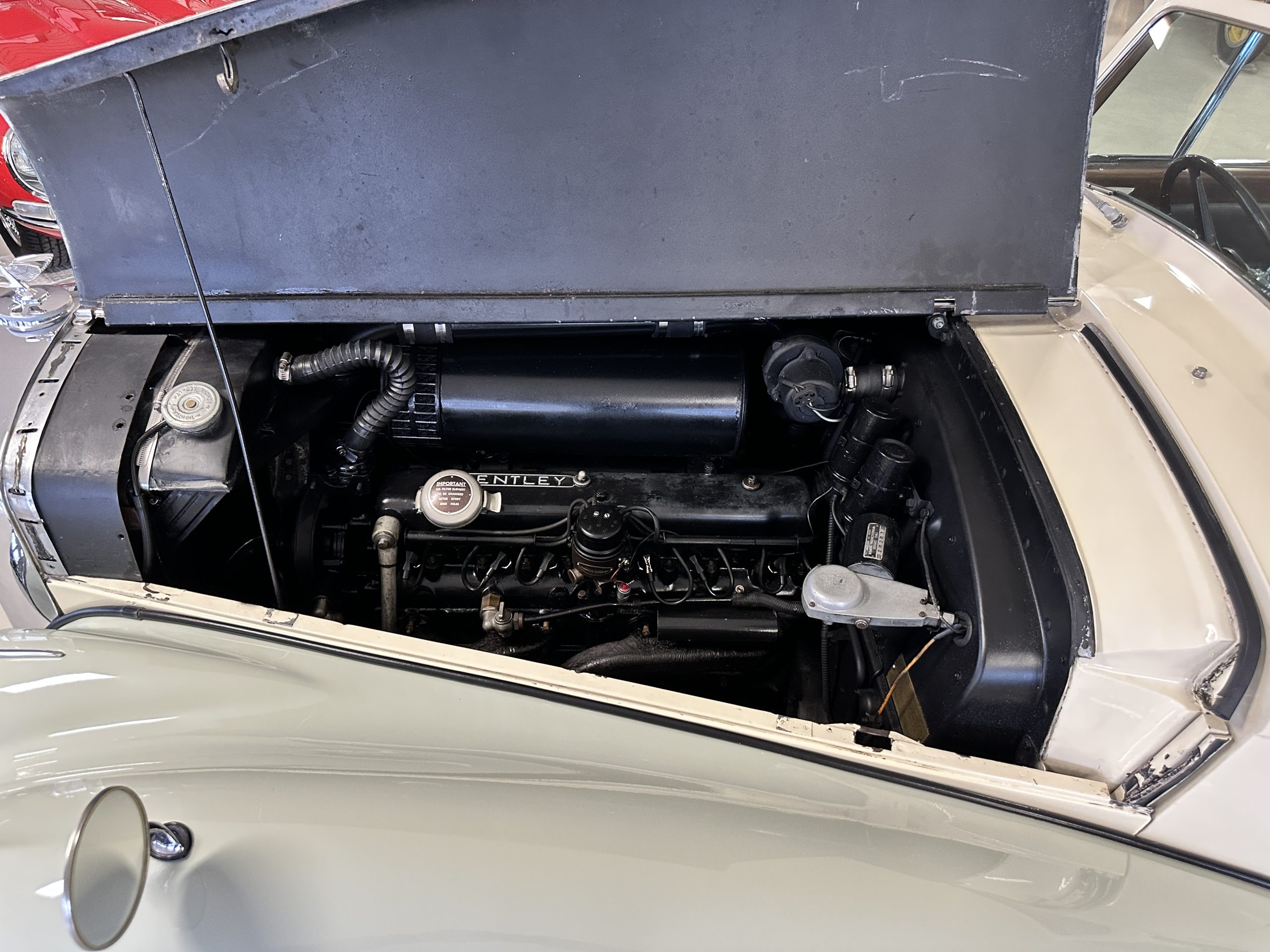 The engine compartment has been detailed but over the years has been painted with more black than original. It looks quite presentable but not appropriate for RROC judging, etc. The 4.6 liter straight six-cylinder engine produces 130 hp and with its four-speed manual transmission is a blast to drive. The engine sounds great and even in 105-degree F temperatures runs very cool. Its 120-inch wheelbase makes it easy to maneuver and a delight to drive. This Bentley has a wonderful road feel. The RHD steering is very stable and has little play. The transmission linkage is a little loose and it tends to pop out of reverse in short order. The chassis is all original and has never really been cleaned or detailed. There is the normal rust in the inner rocker panels and under the car from its early life in the UK. These are non-structural and easily repaired, if so desired.