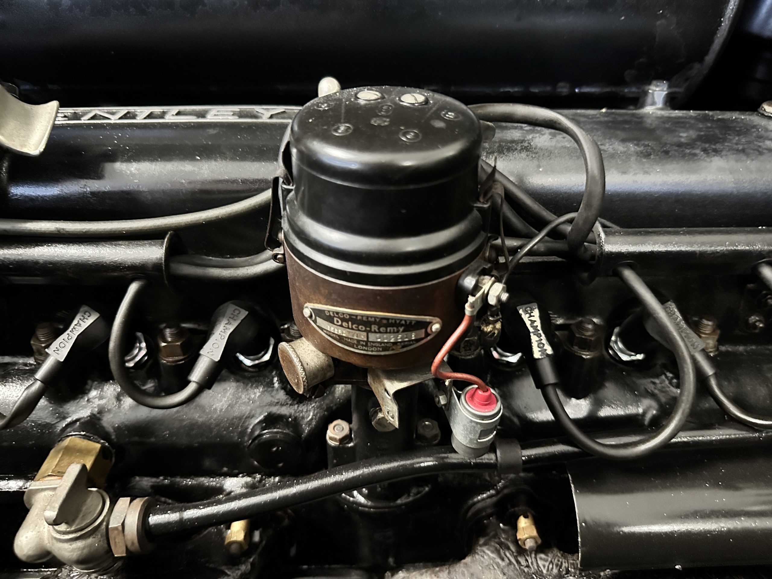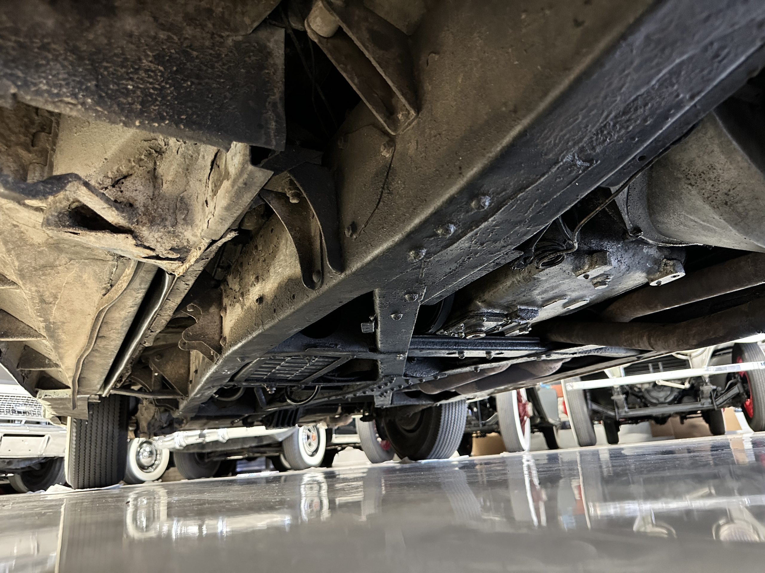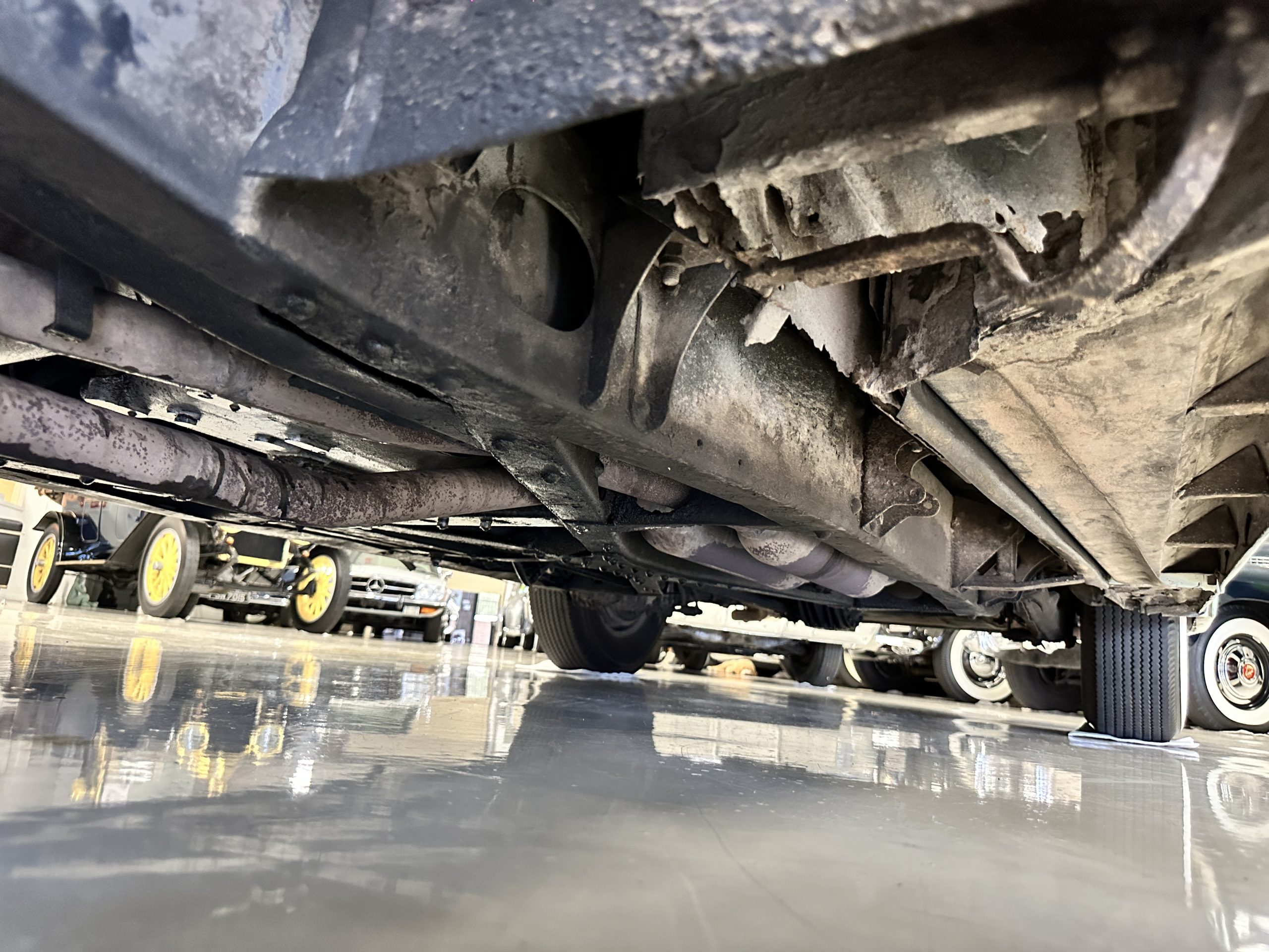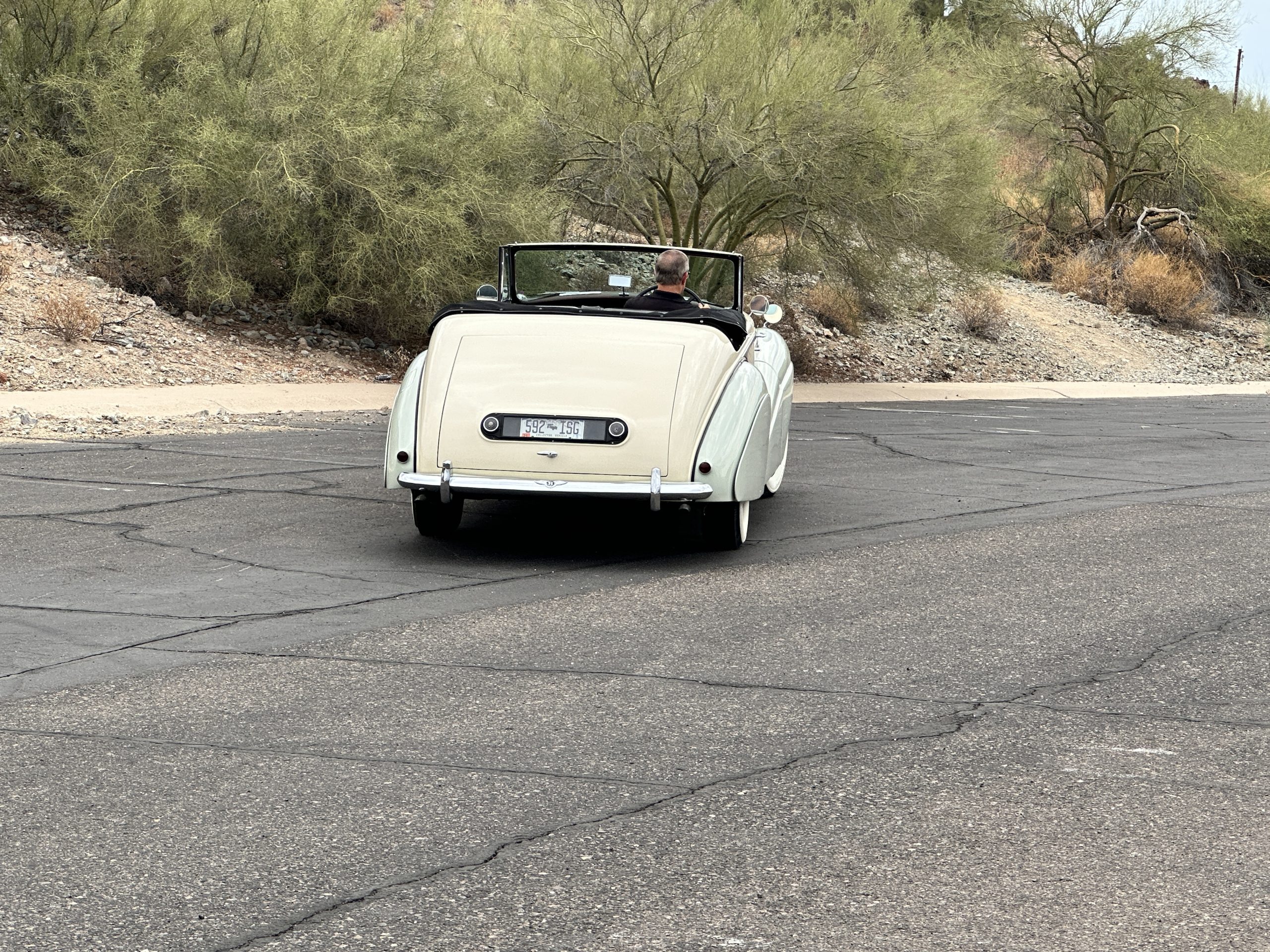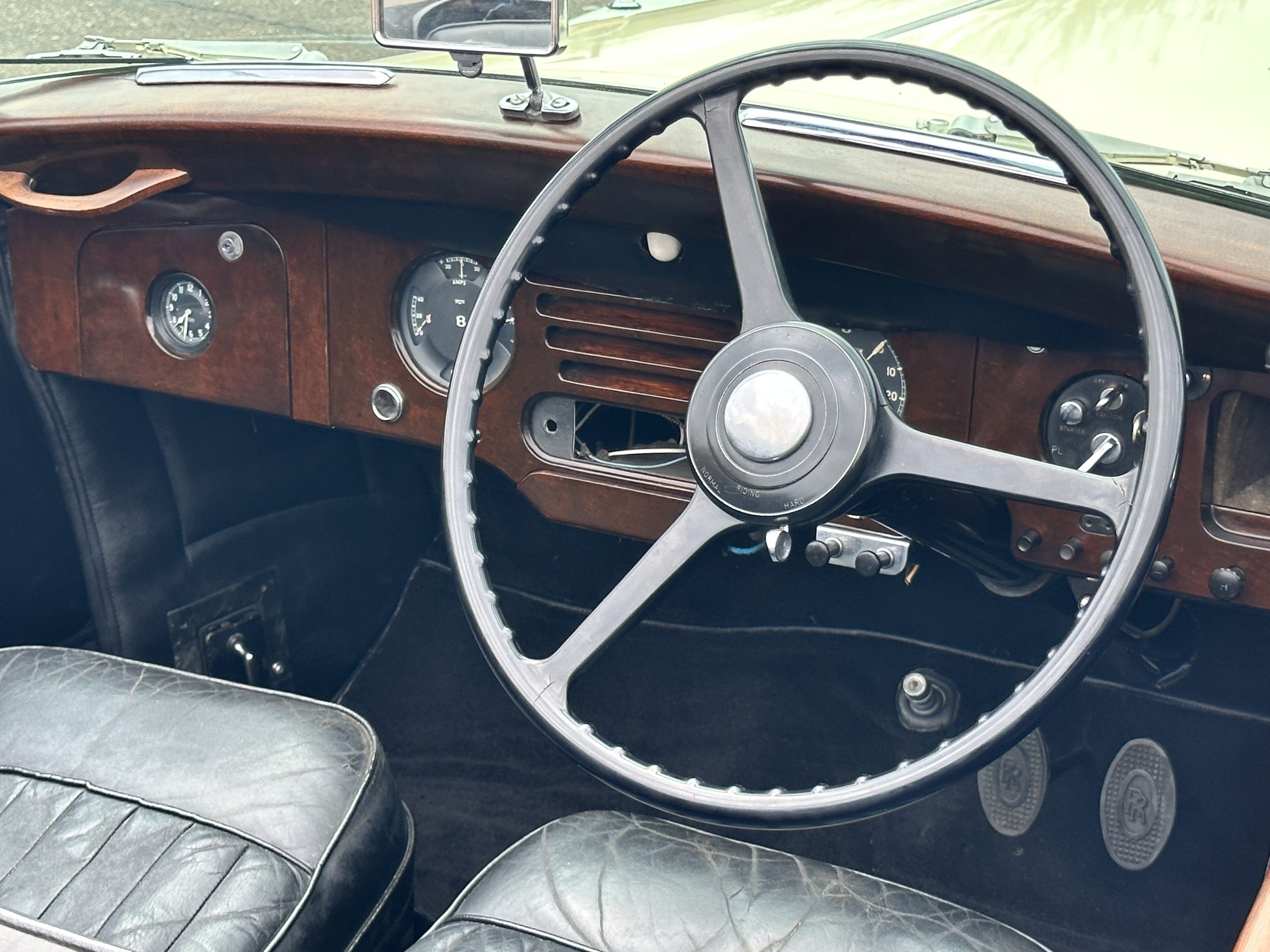 The engine compartment has been detailed but over the years has been painted with more black than original. It looks quite presentable but not appropriate for RROC judging, etc. The 4.6 liter straight six-cylinder engine produces 130 hp and with its four-speed manual transmission is a blast to drive. The engine sounds great and even in 105-degree F temperatures runs very cool. Its 120-inch wheelbase makes it easy to maneuver and a delight to drive. This Bentley has a wonderful road feel. The RHD steering is very stable and has little play. The transmission linkage is a little loose and it tends to pop out of reverse in short order. The chassis is all original and has never really been cleaned or detailed. There is the normal rust in the inner rocker panels and under the car from its early life in the UK. These are non-structural and easily repaired, if so desired.