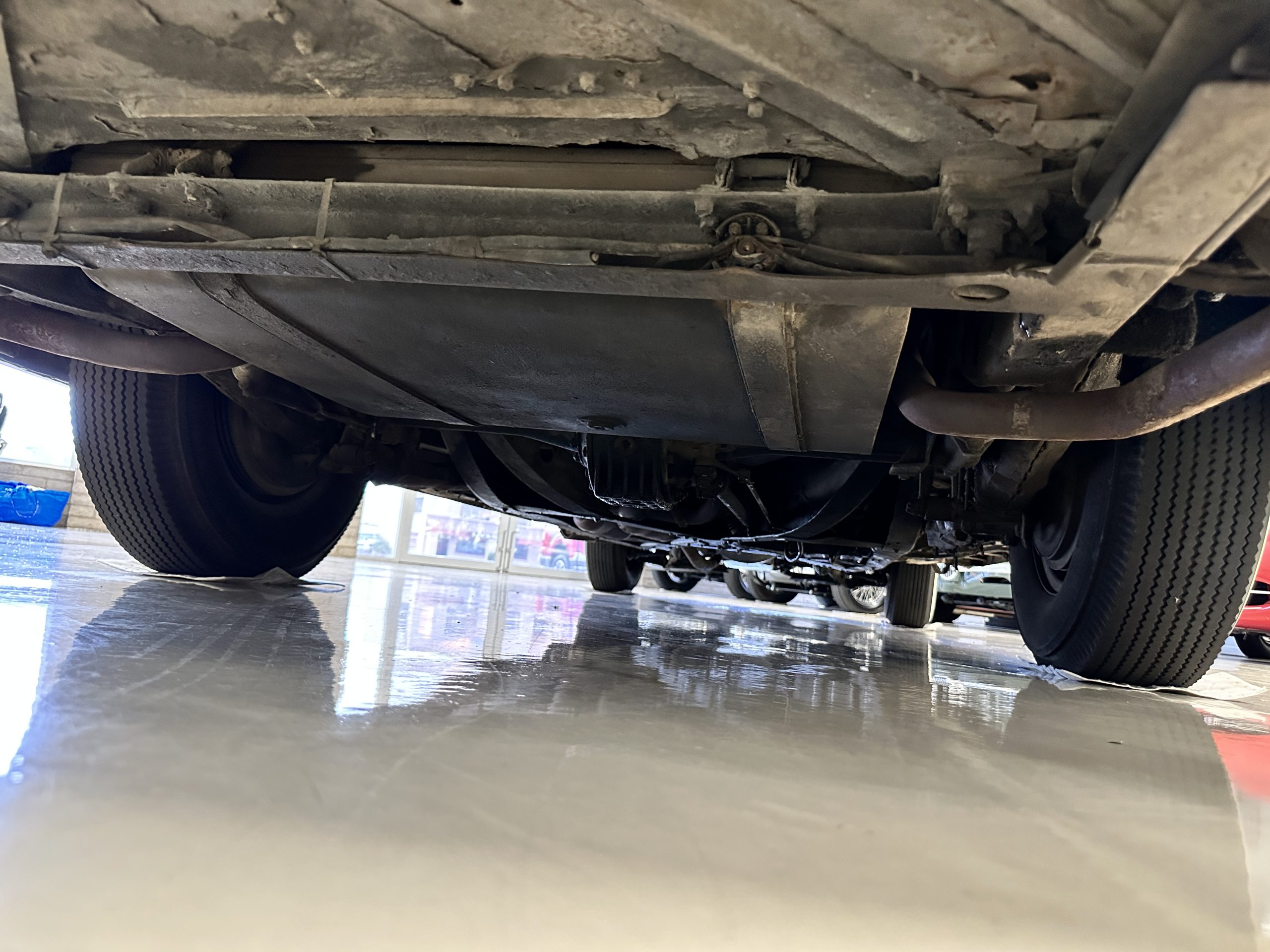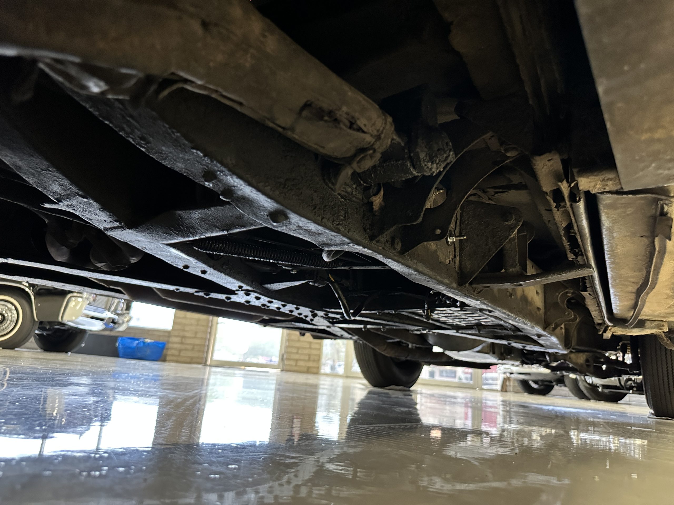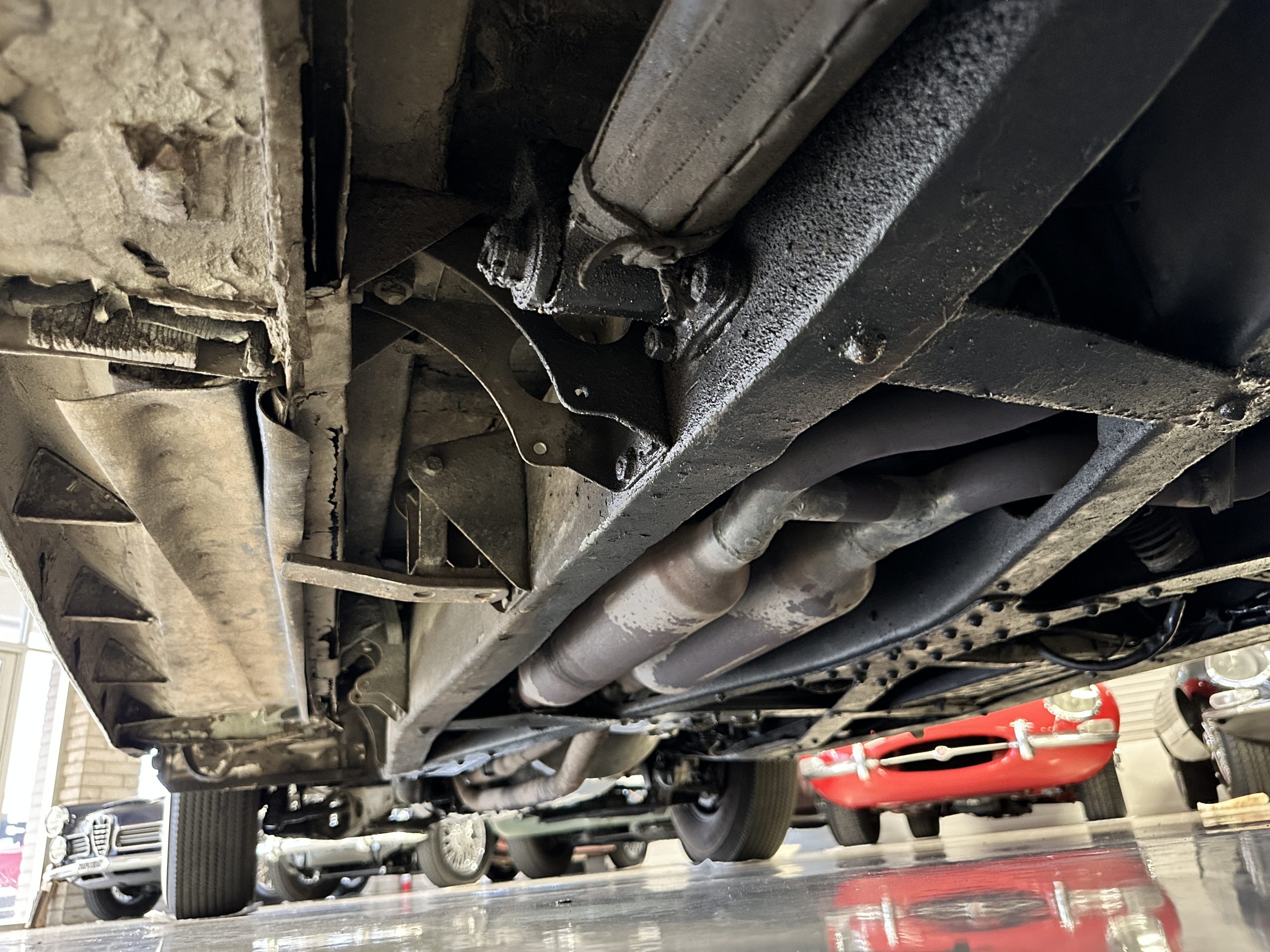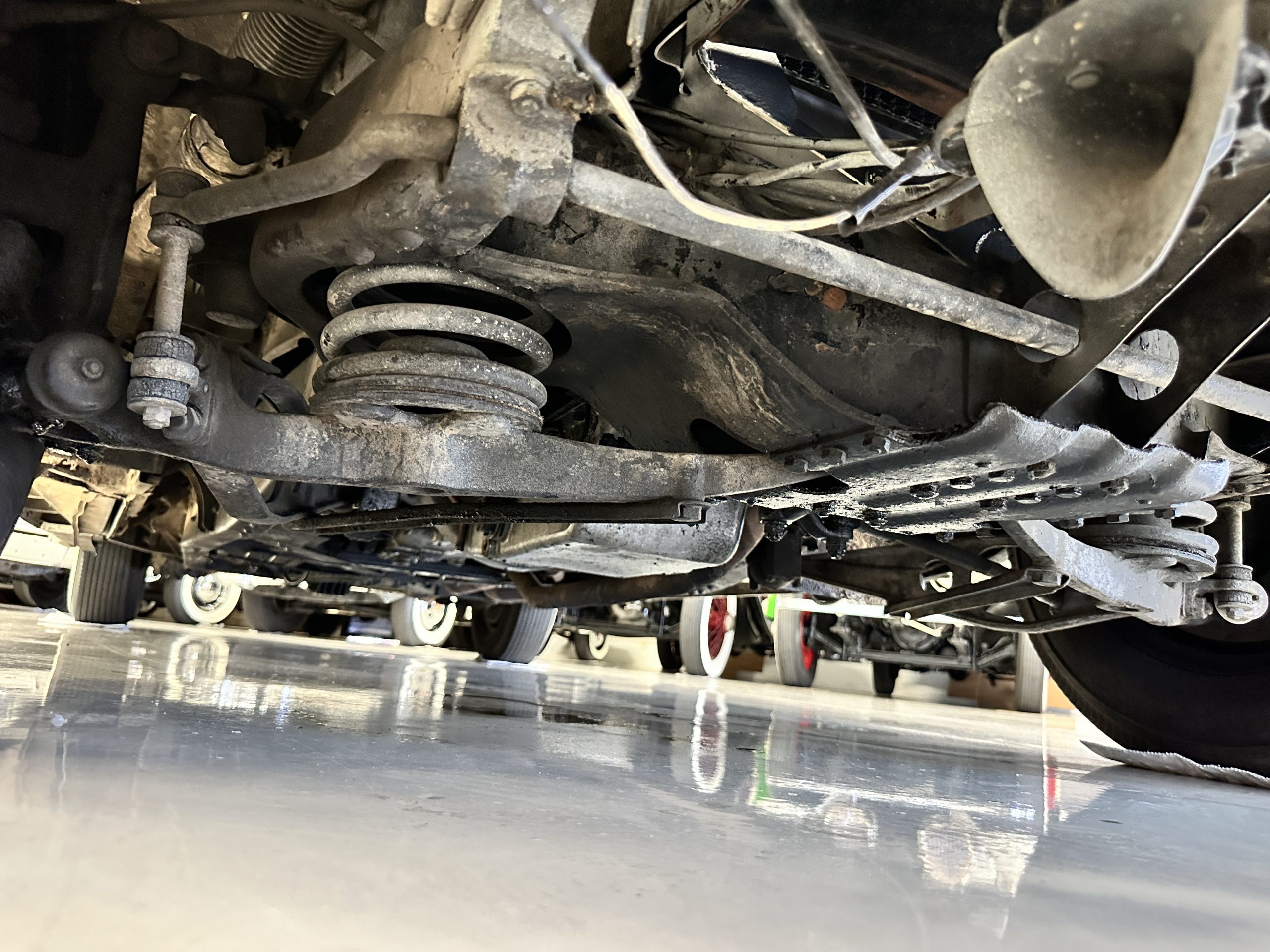 The engine compartment has been detailed but over the years has been painted with more black than original. It looks quite presentable but not appropriate for RROC judging, etc. The 4.6 liter straight six-cylinder engine produces 130 hp and with its four-speed manual transmission is a blast to drive. The engine sounds great and even in 105-degree F temperatures runs very cool. Its 120-inch wheelbase makes it easy to maneuver and a delight to drive. This Bentley has a wonderful road feel. The RHD steering is very stable and has little play. The transmission linkage is a little loose and it tends to pop out of reverse in short order. The chassis is all original and has never really been cleaned or detailed. There is the normal rust in the inner rocker panels and under the car from its early life in the UK. These are non-structural and easily repaired, if so desired.