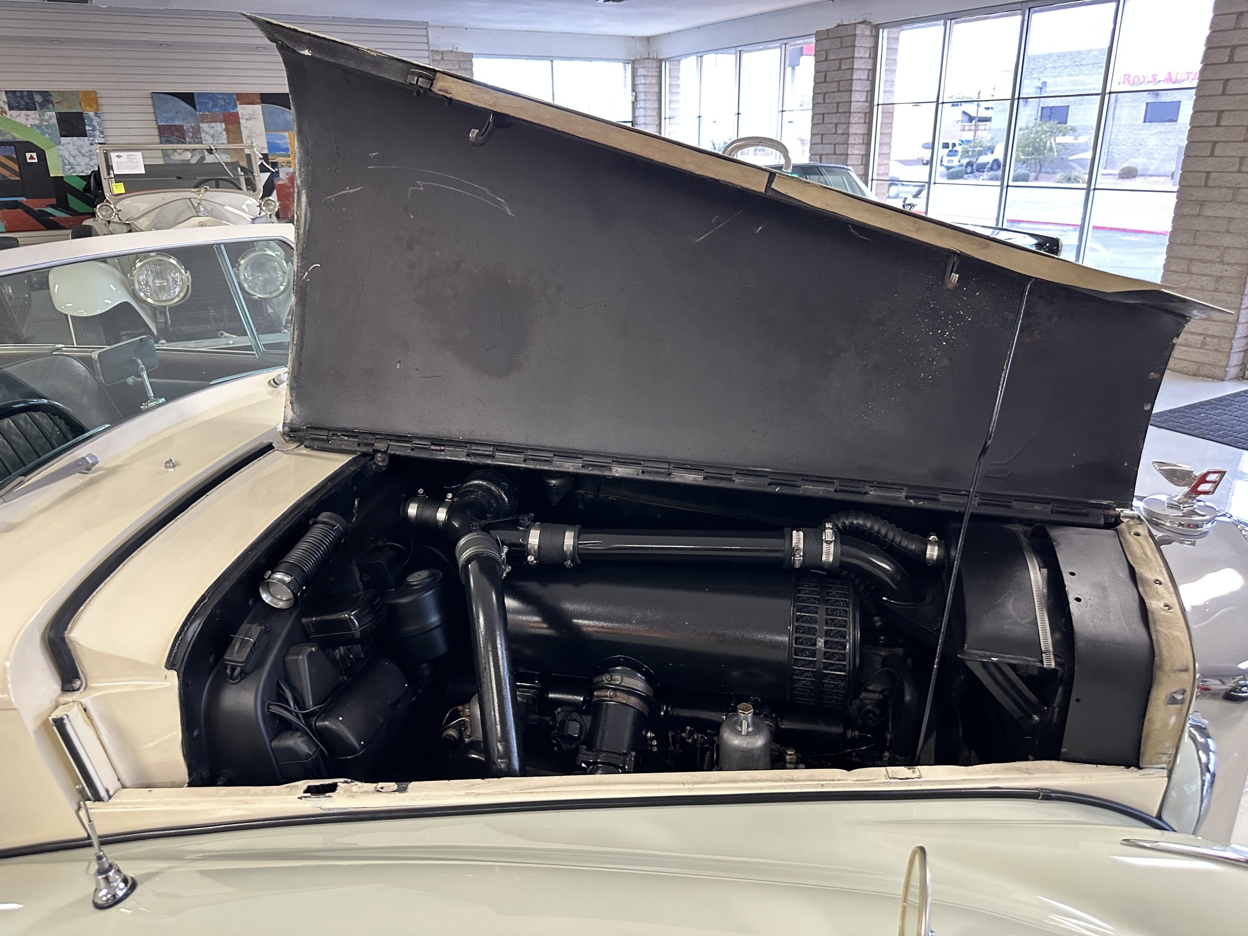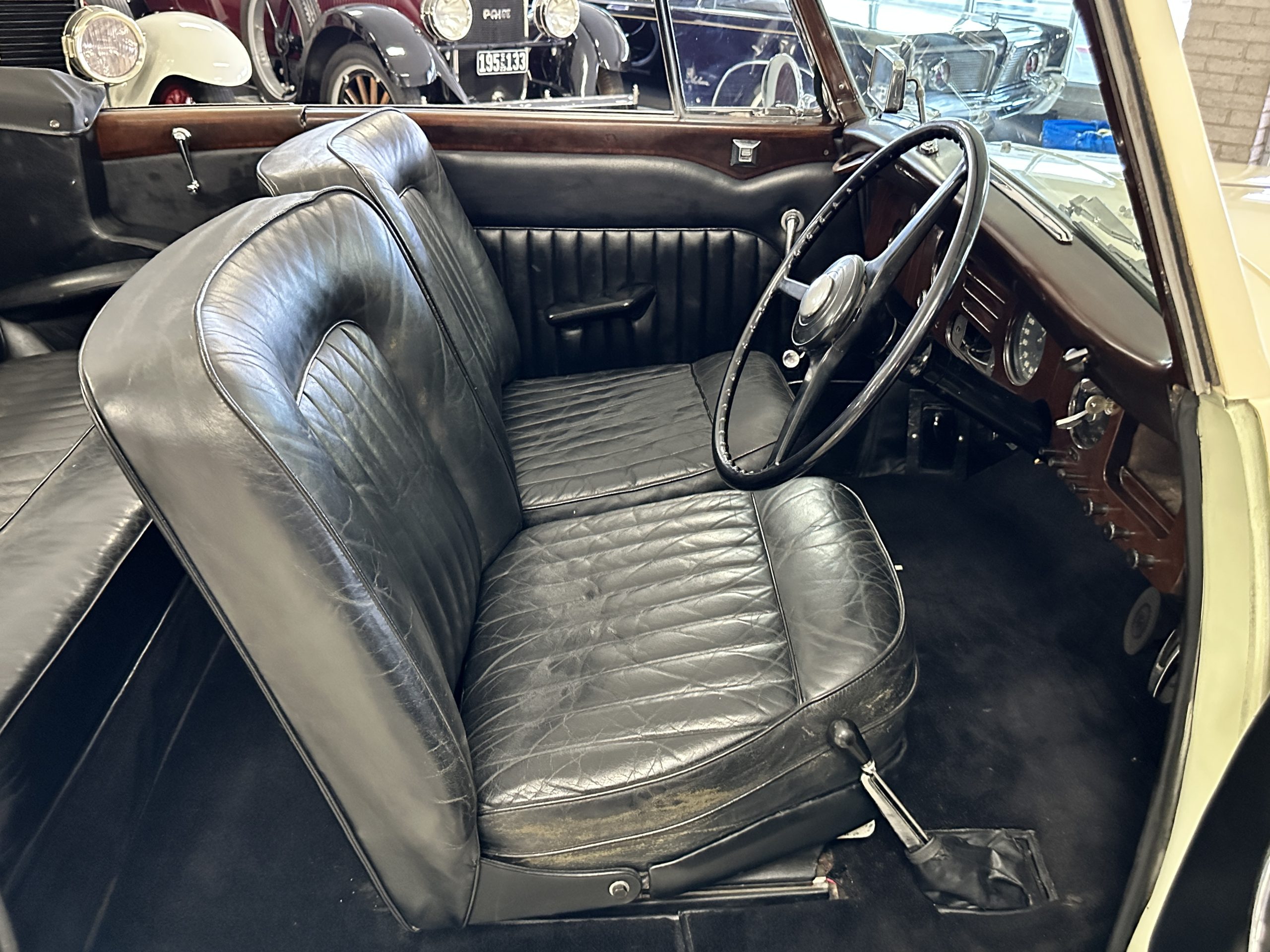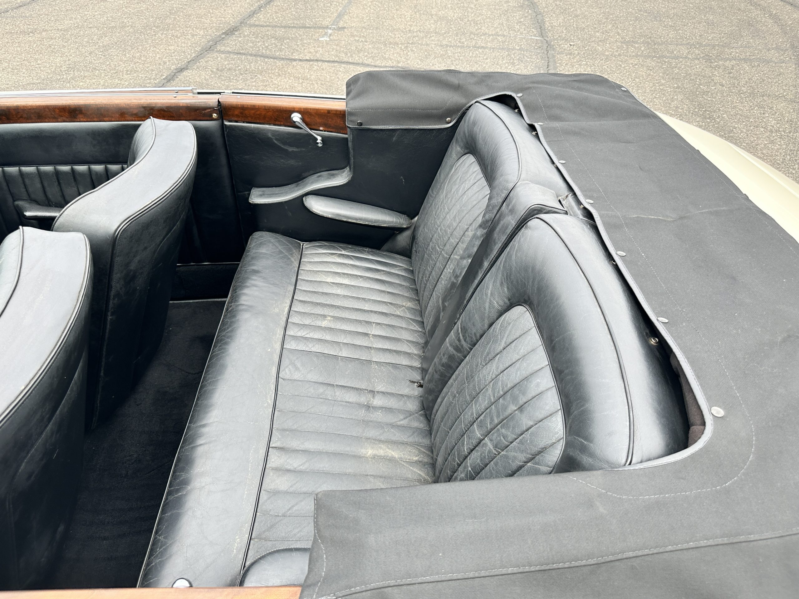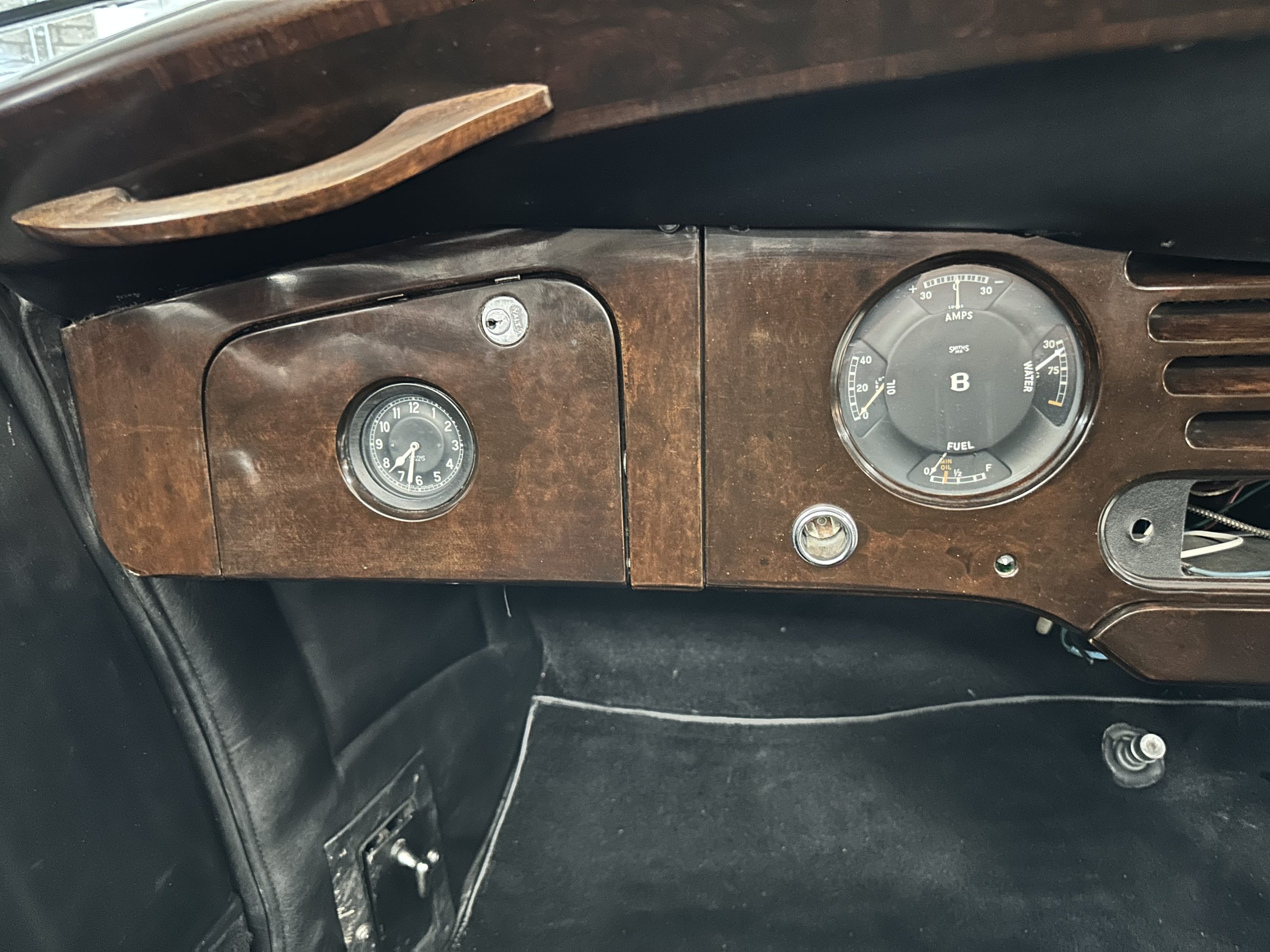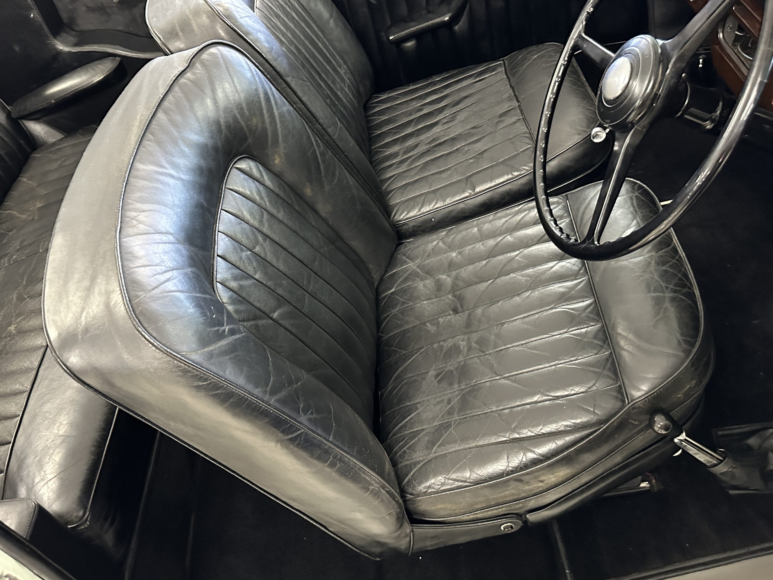 The interior is largely original in its Black Leather which is in very nice condition. The leather is without cracks and has a lovely patina. The luscious dark wood is also original and in excellent condition. The black carpet is also in very nice condition. It is difficult to discern exactly which portions of the interior are original versus an older restored example. But overall, the interior has a nice consistent patina and presents very well. The instruments work well, and its radio has been removed from the dashboard.