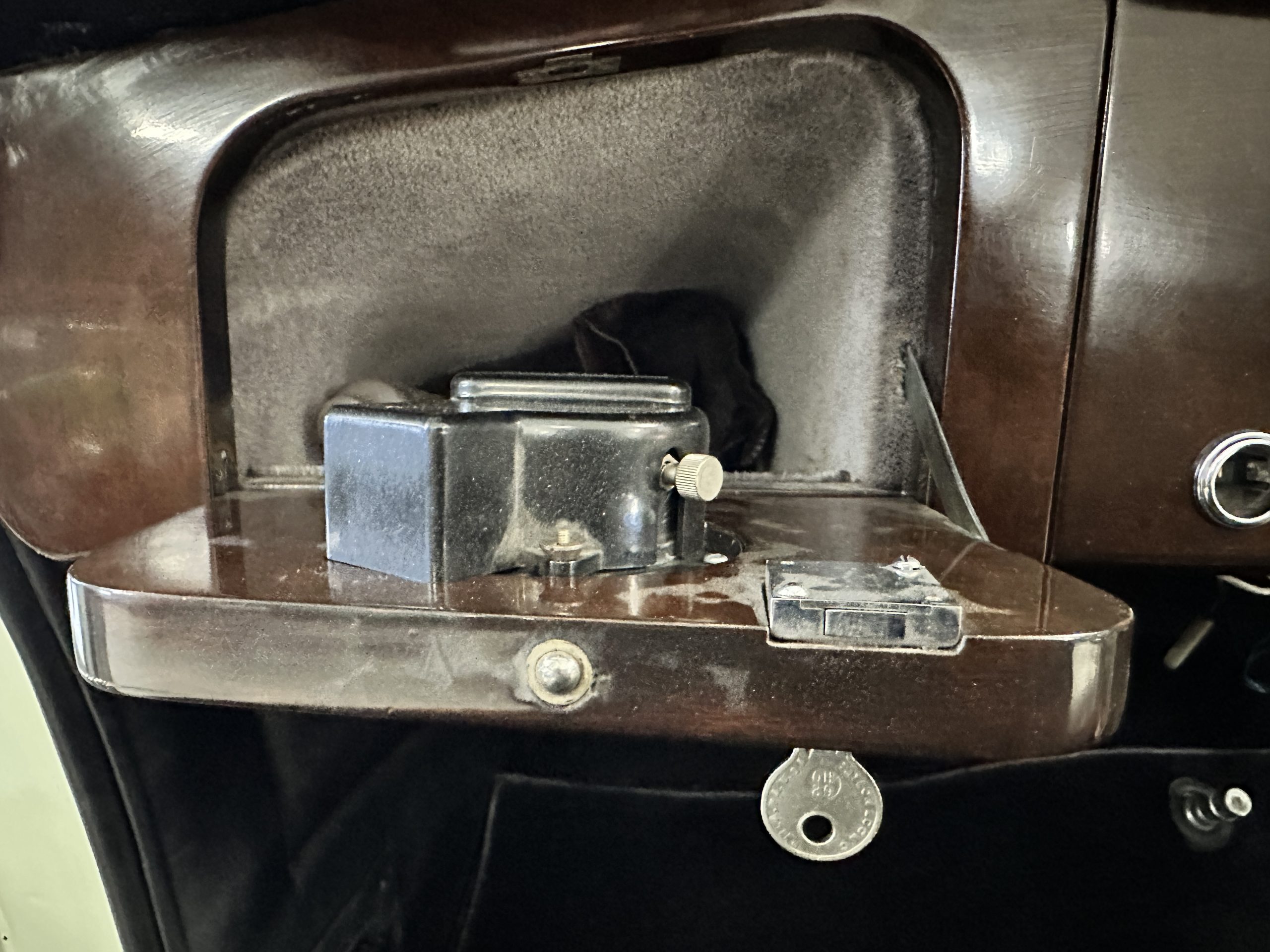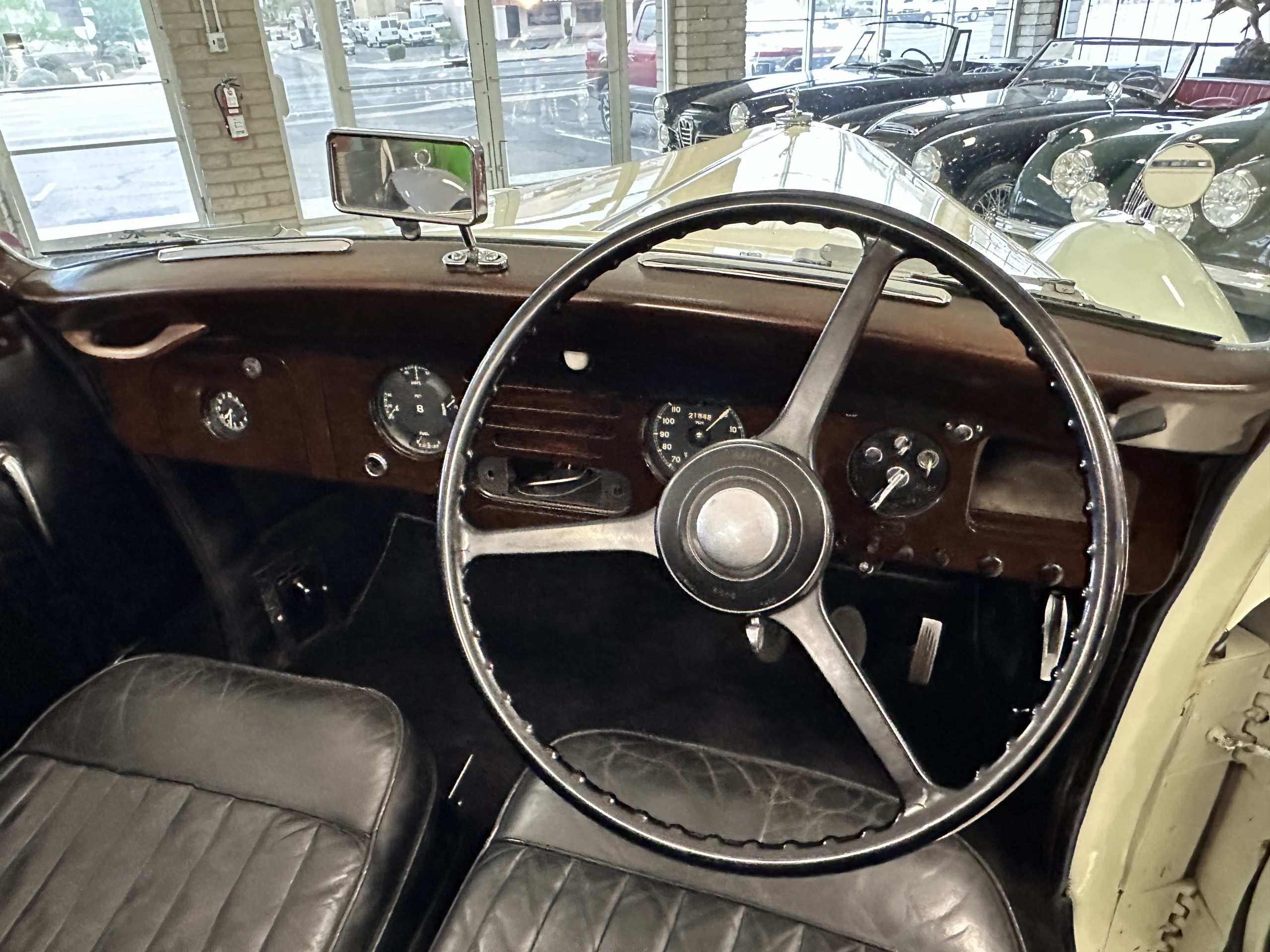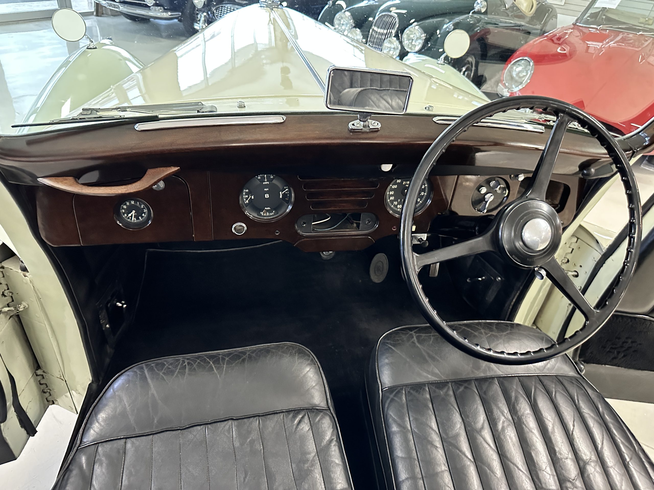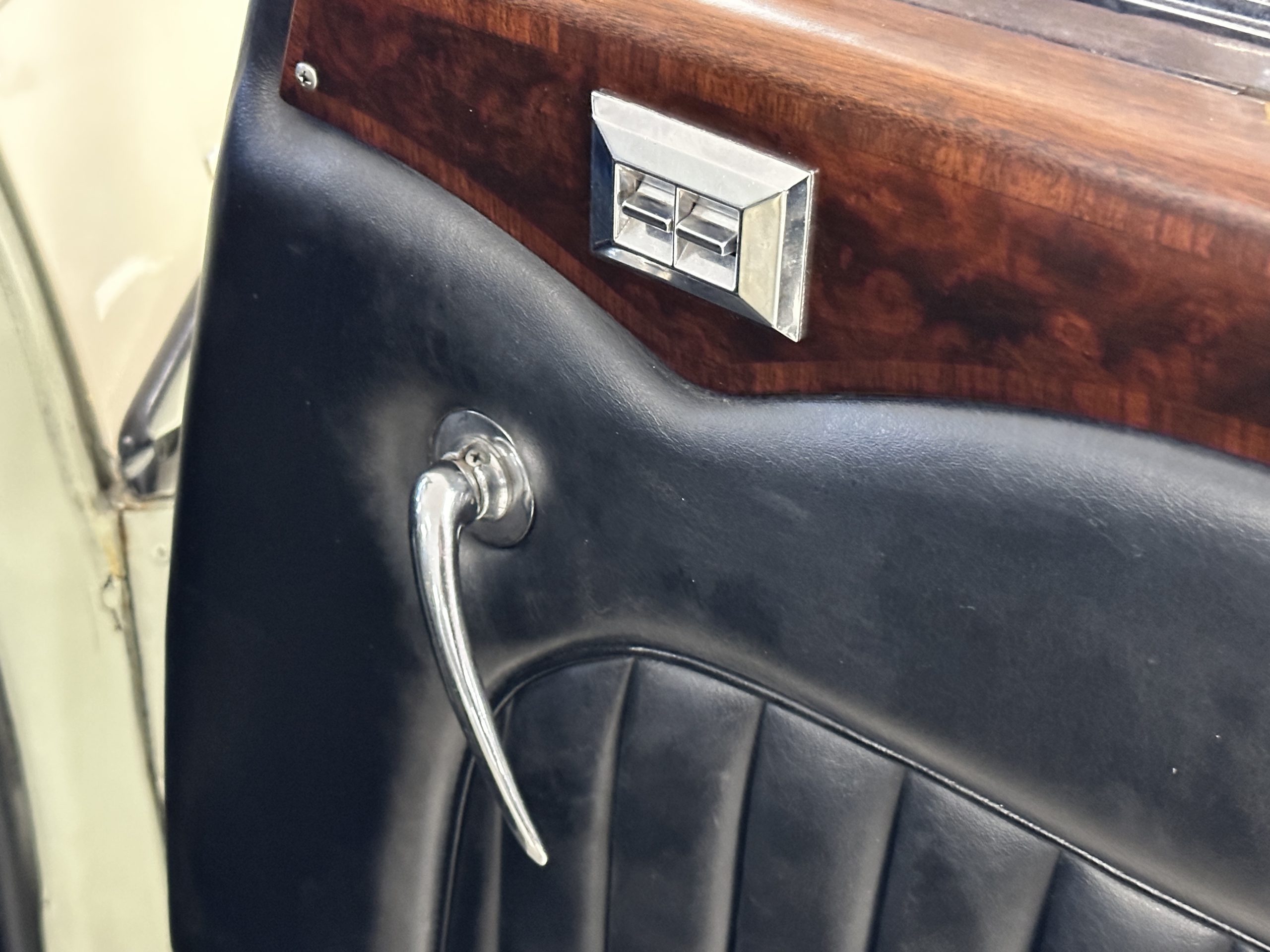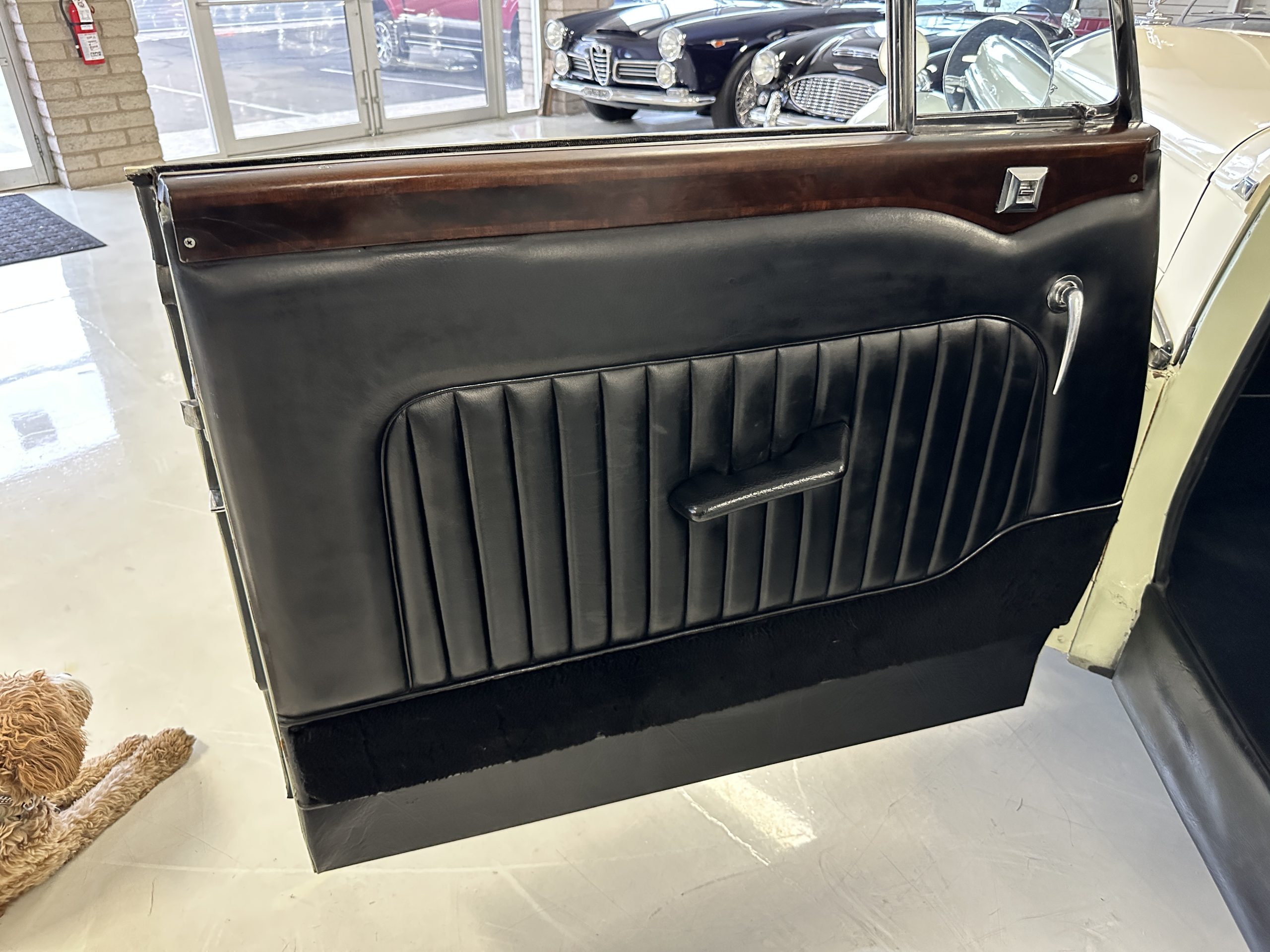 The interior is largely original in its Black Leather which is in very nice condition. The leather is without cracks and has a lovely patina. The luscious dark wood is also original and in excellent condition. The black carpet is also in very nice condition. It is difficult to discern exactly which portions of the interior are original versus an older restored example. But overall, the interior has a nice consistent patina and presents very well. The instruments work well, and its radio has been removed from the dashboard.