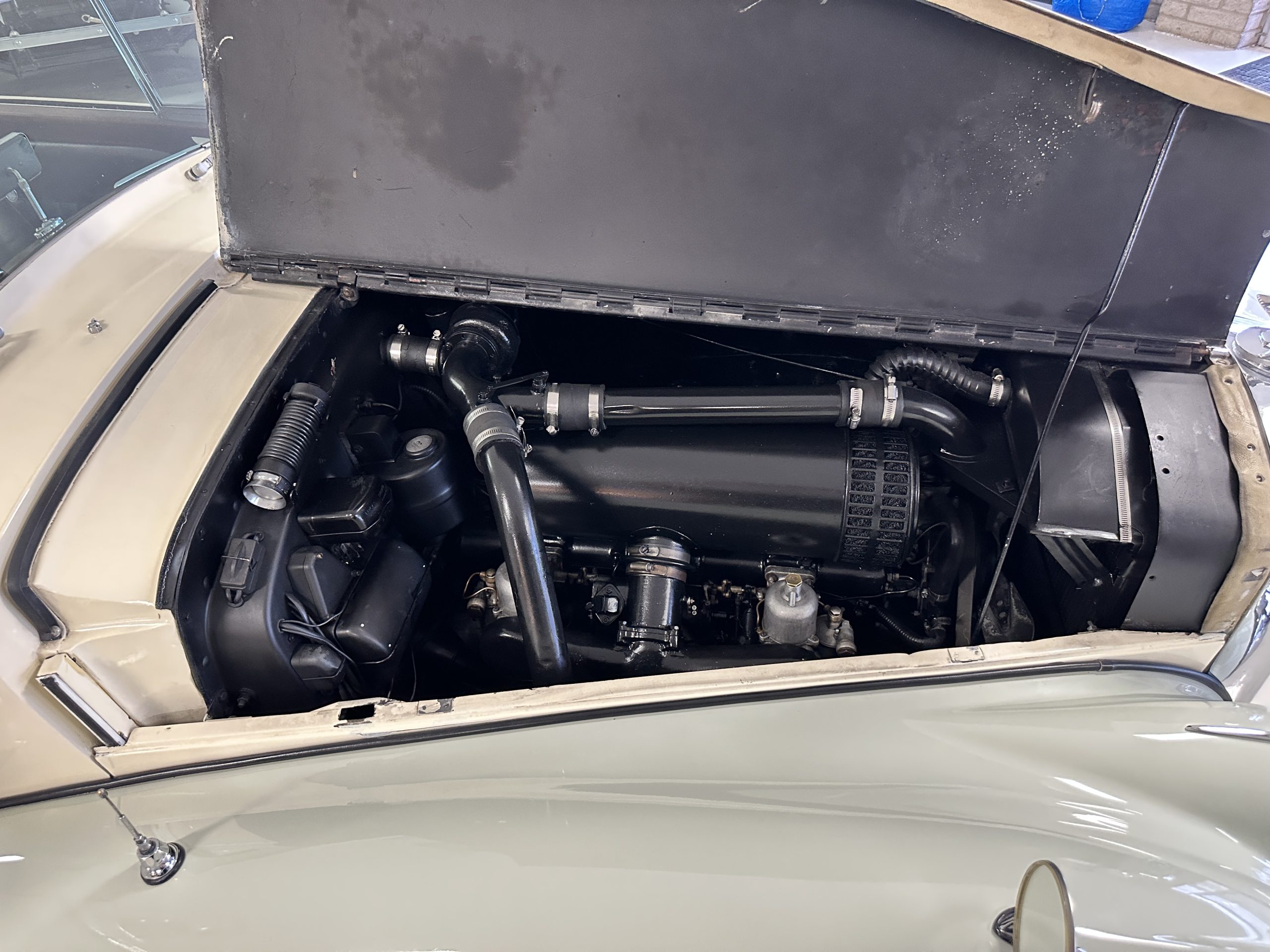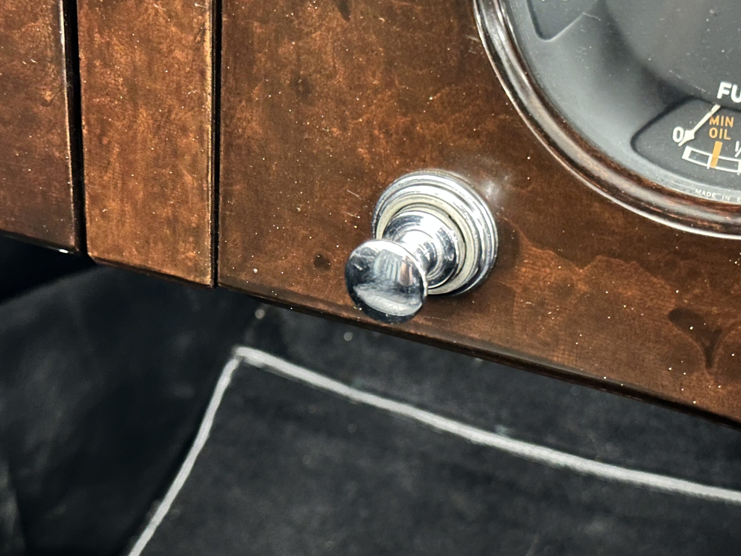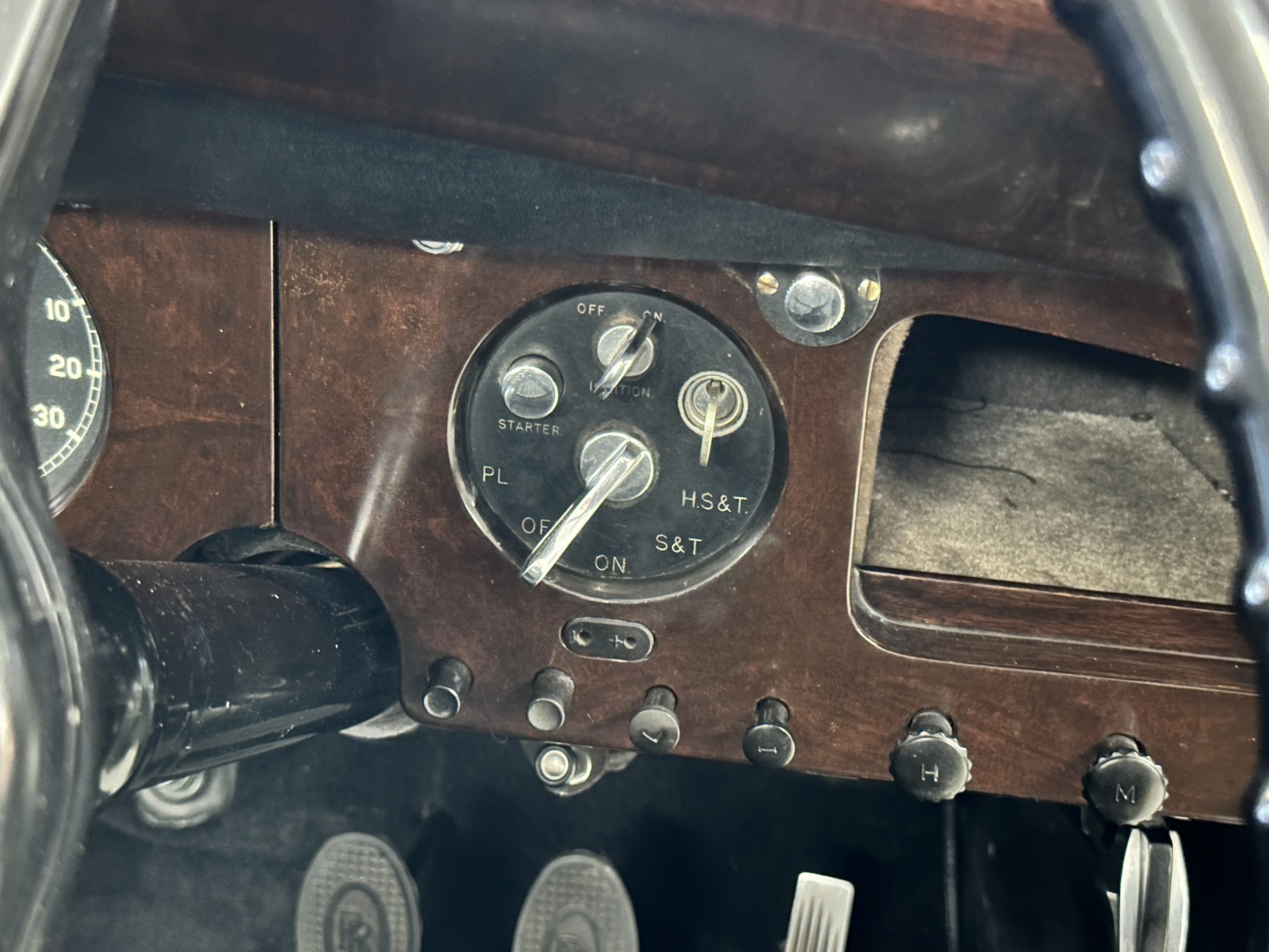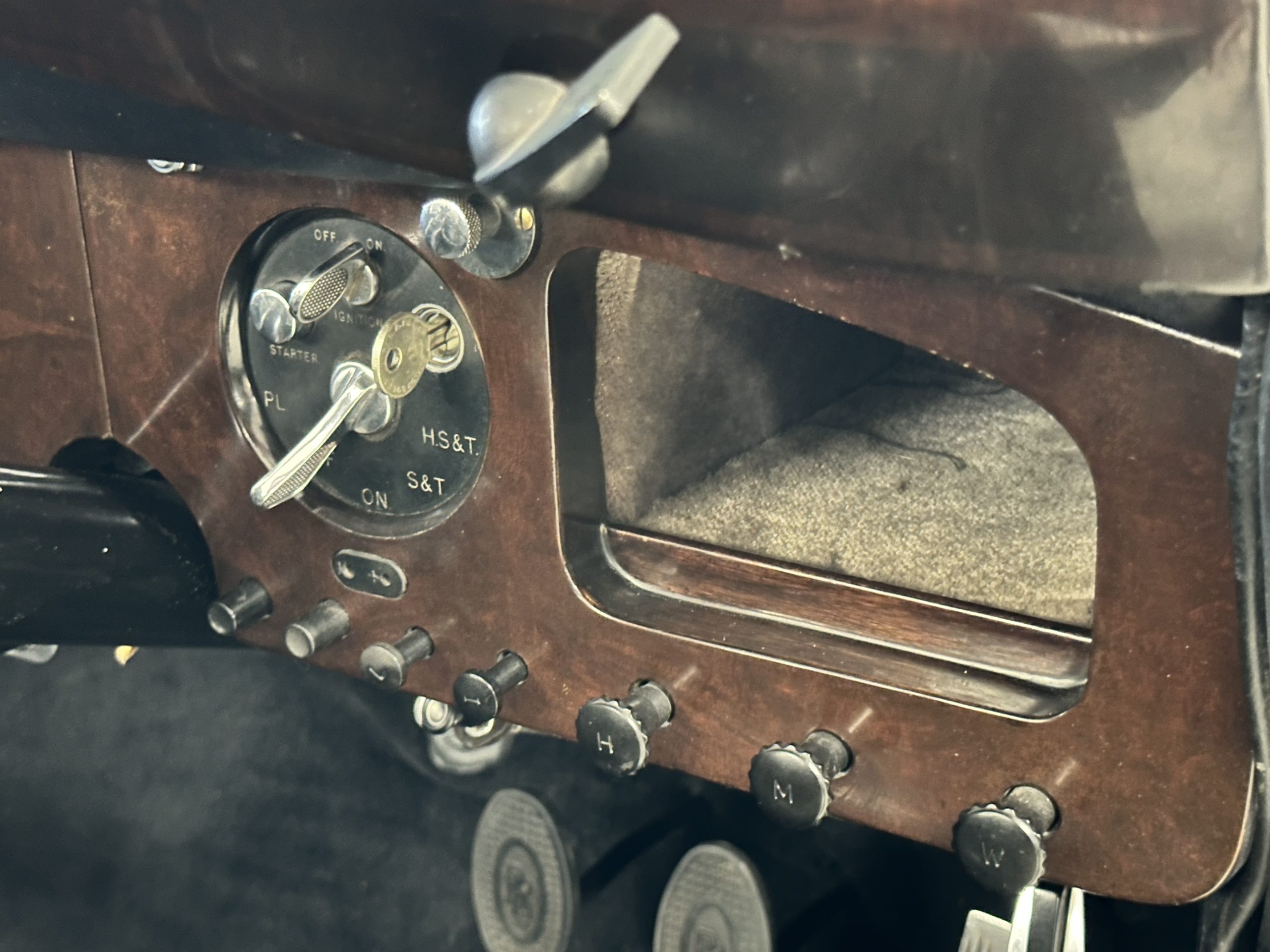 The interior is largely original in its Black Leather which is in very nice condition. The leather is without cracks and has a lovely patina. The luscious dark wood is also original and in excellent condition. The black carpet is also in very nice condition. It is difficult to discern exactly which portions of the interior are original versus an older restored example. But overall, the interior has a nice consistent patina and presents very well. The instruments work well, and its radio has been removed from the dashboard.