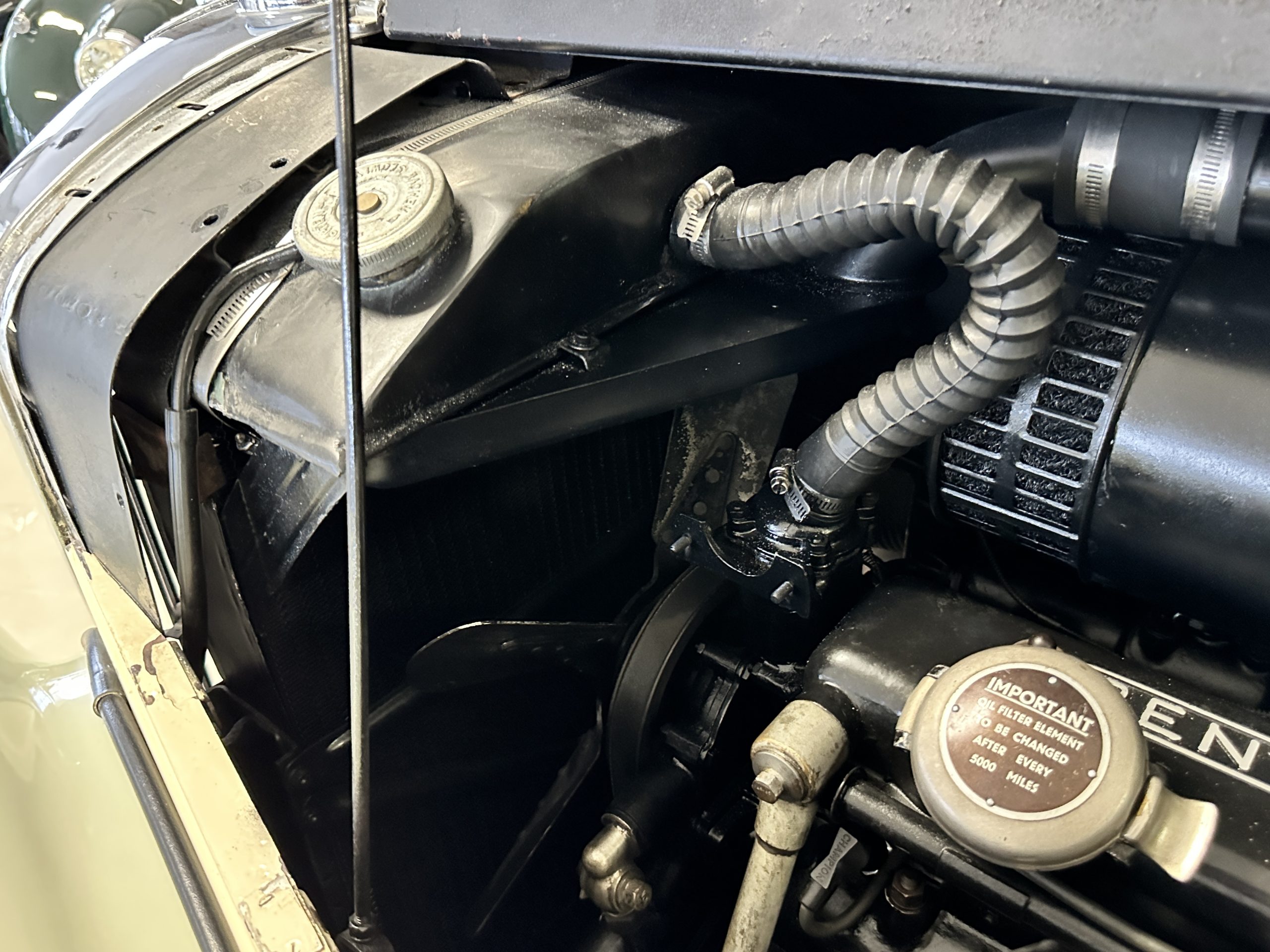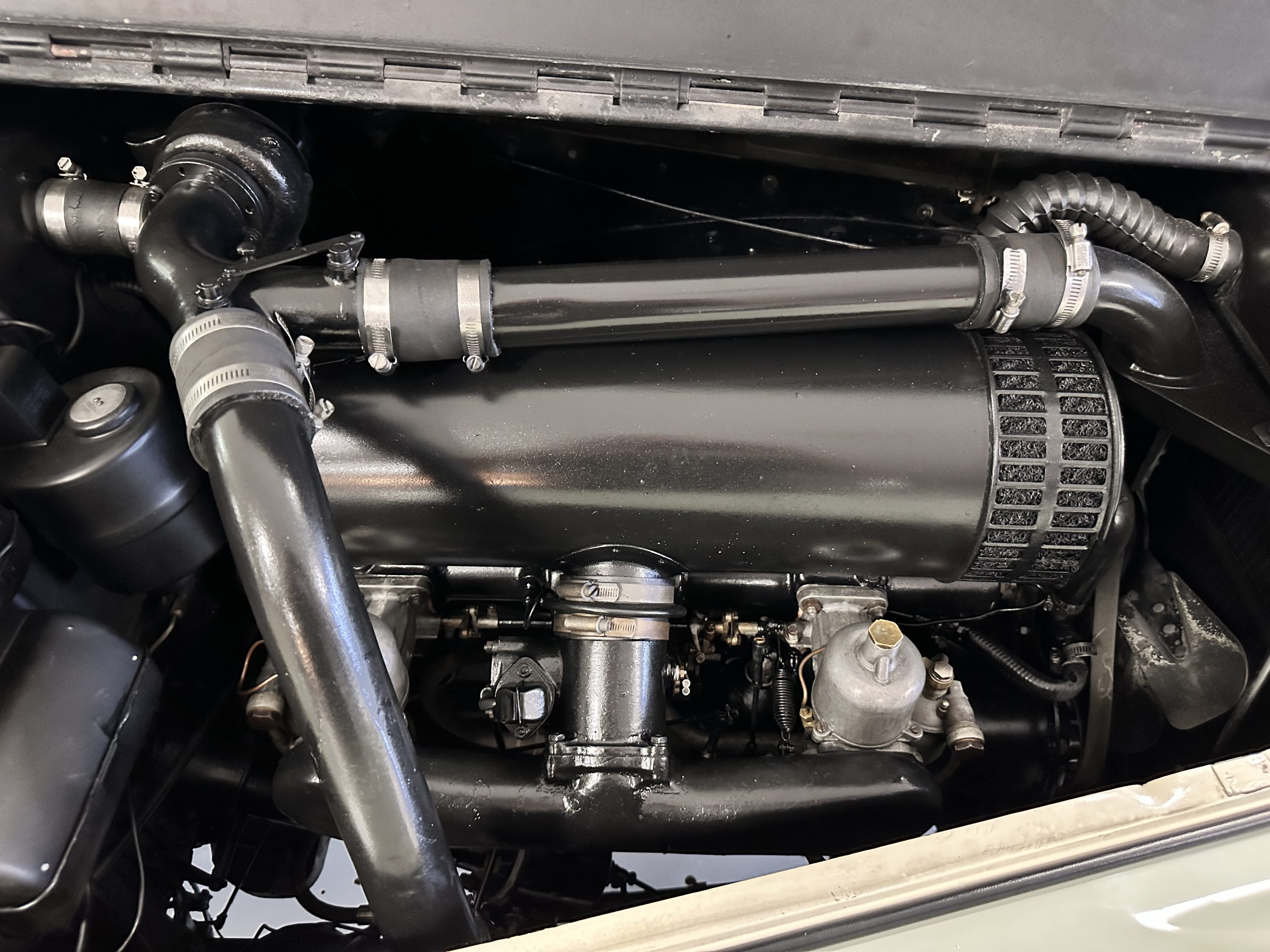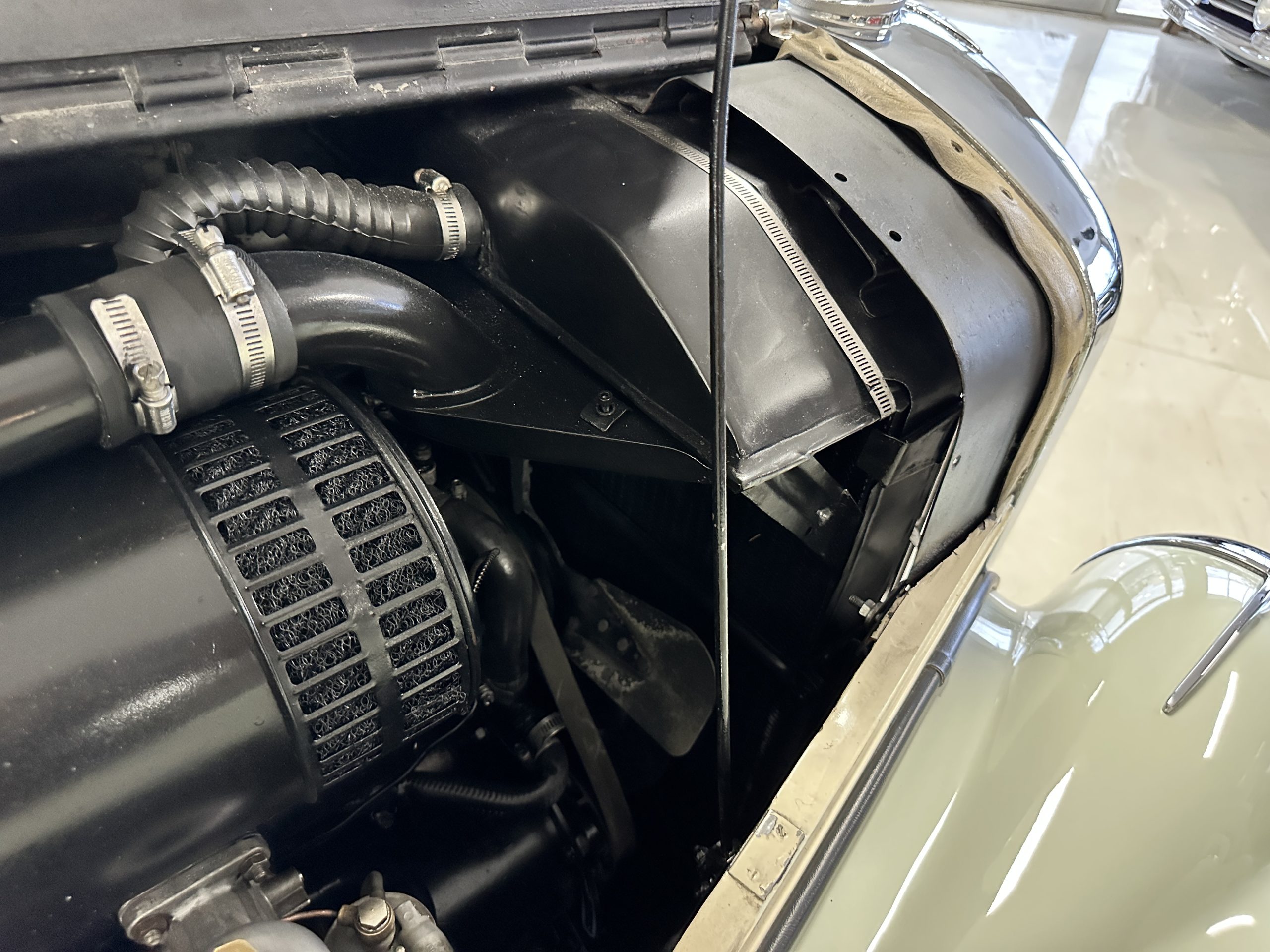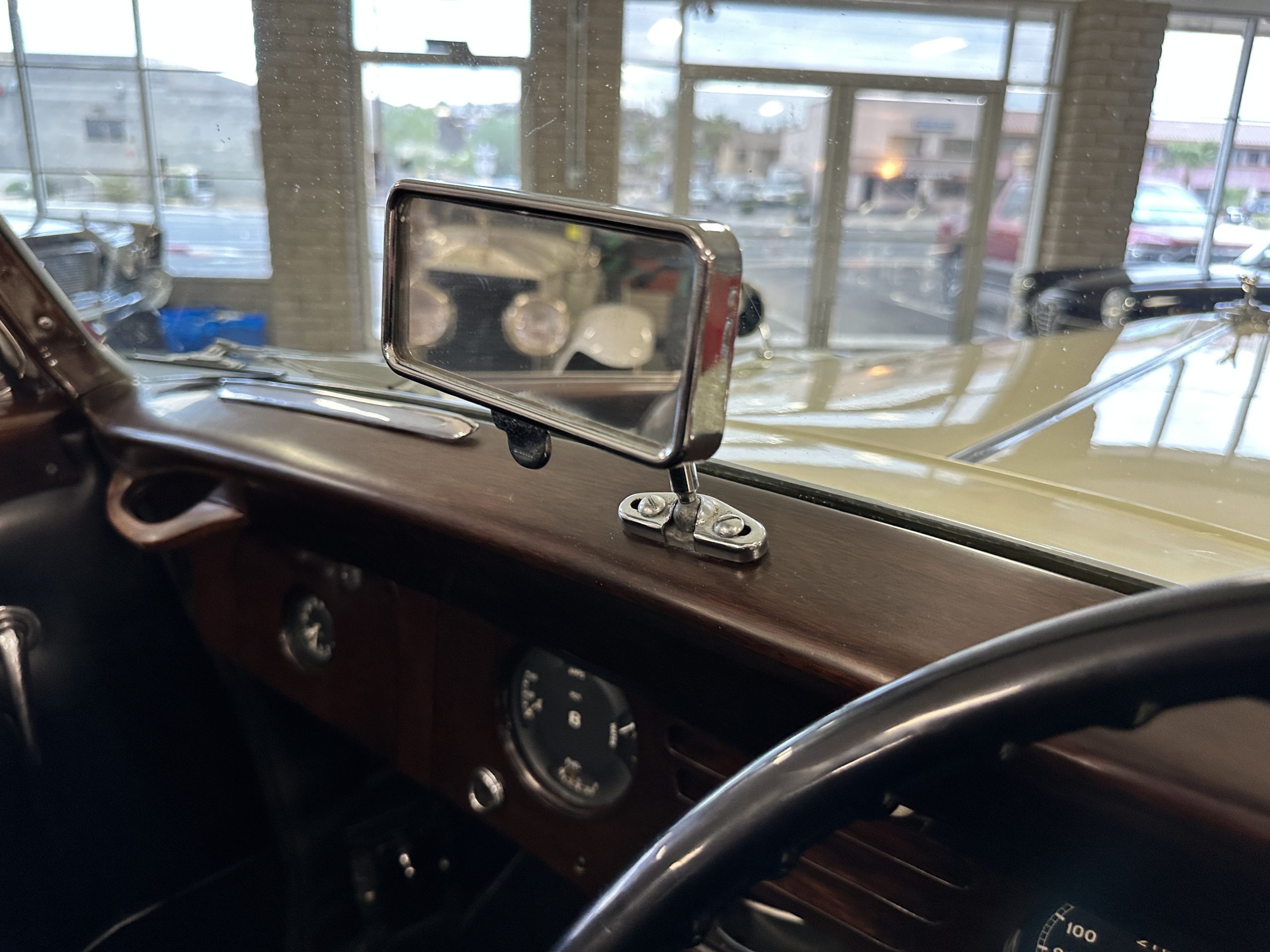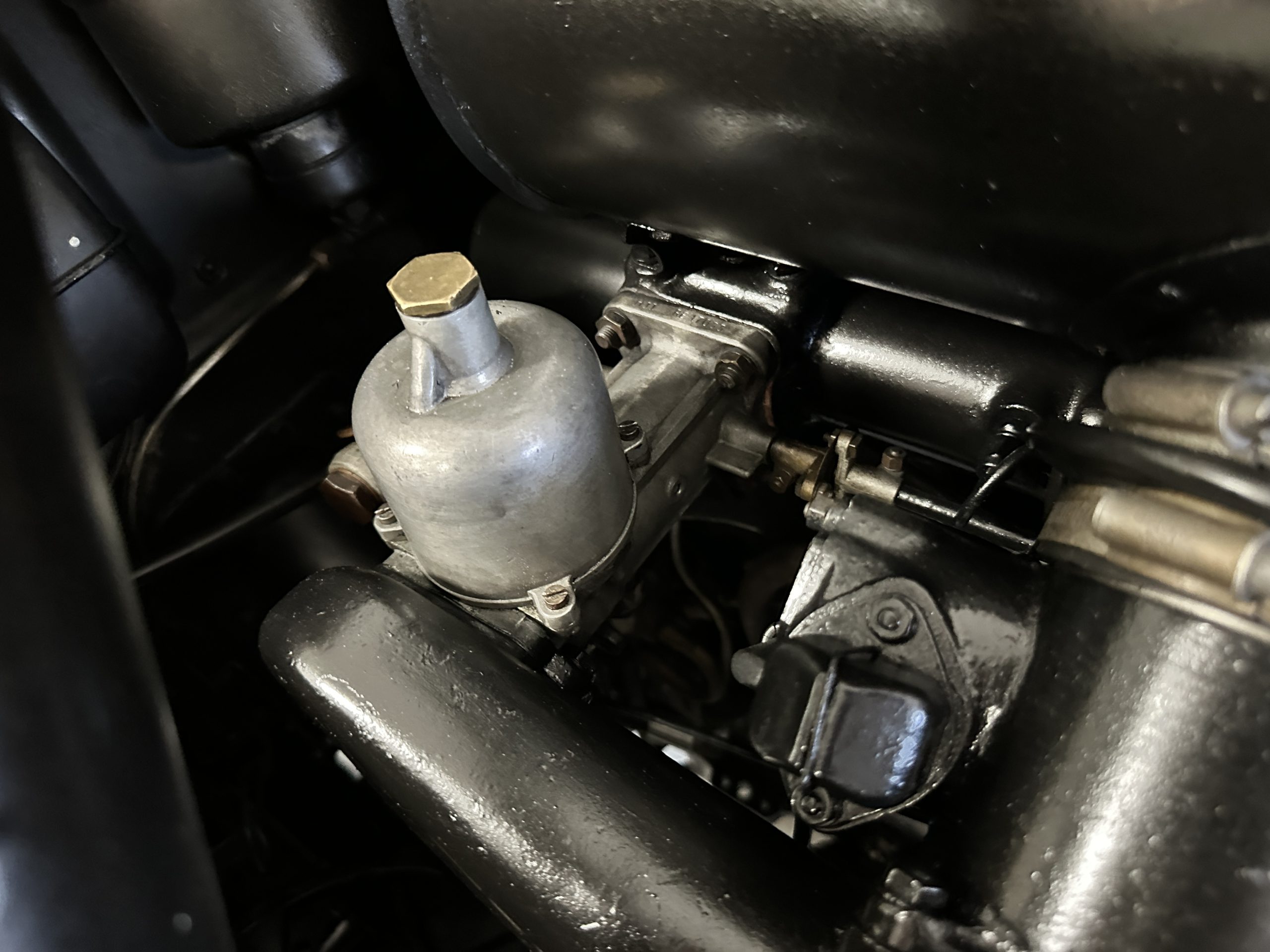 The interior is largely original in its Black Leather which is in very nice condition. The leather is without cracks and has a lovely patina. The luscious dark wood is also original and in excellent condition. The black carpet is also in very nice condition. It is difficult to discern exactly which portions of the interior are original versus an older restored example. But overall, the interior has a nice consistent patina and presents very well. The instruments work well, and its radio has been removed from the dashboard.