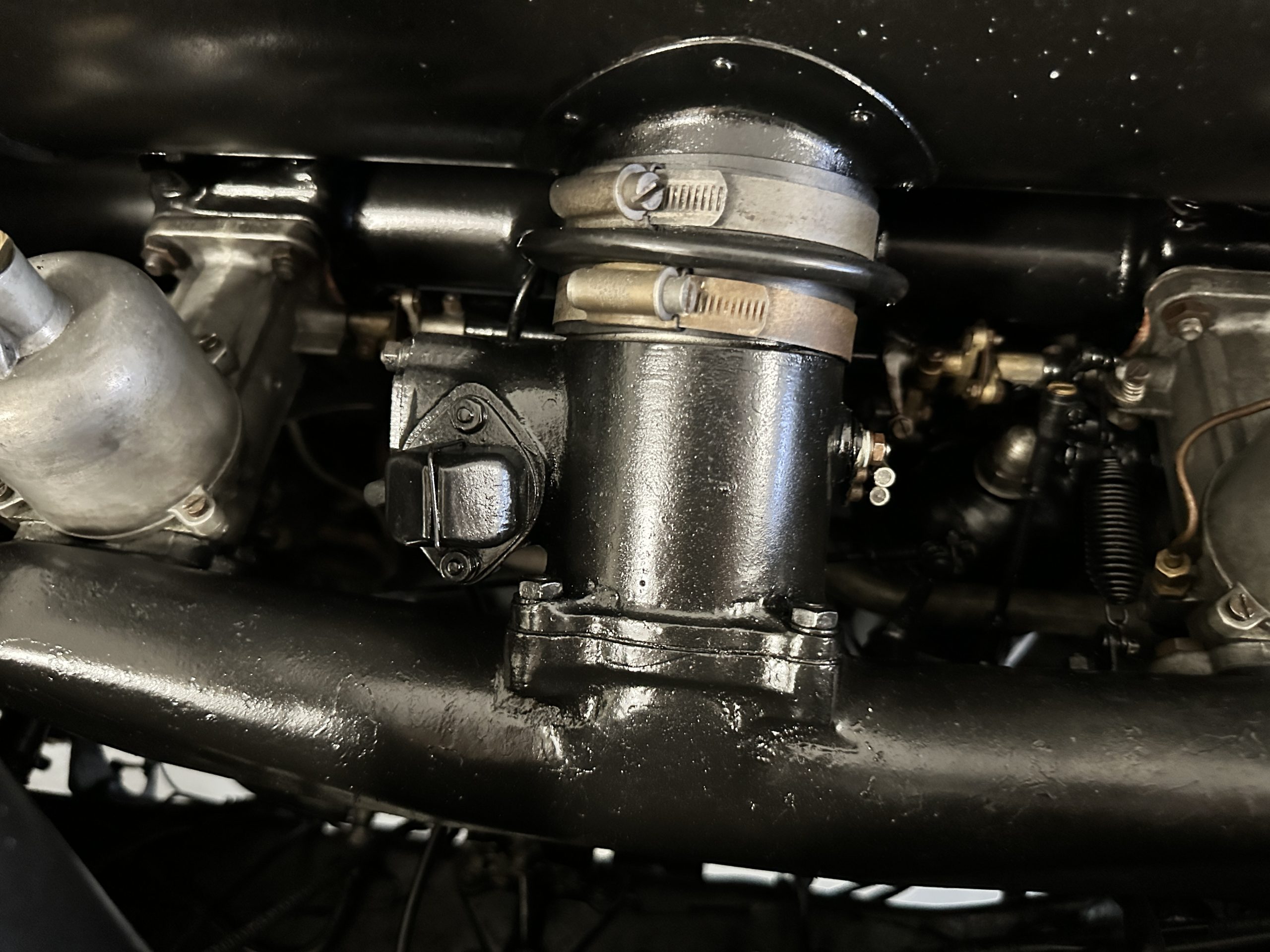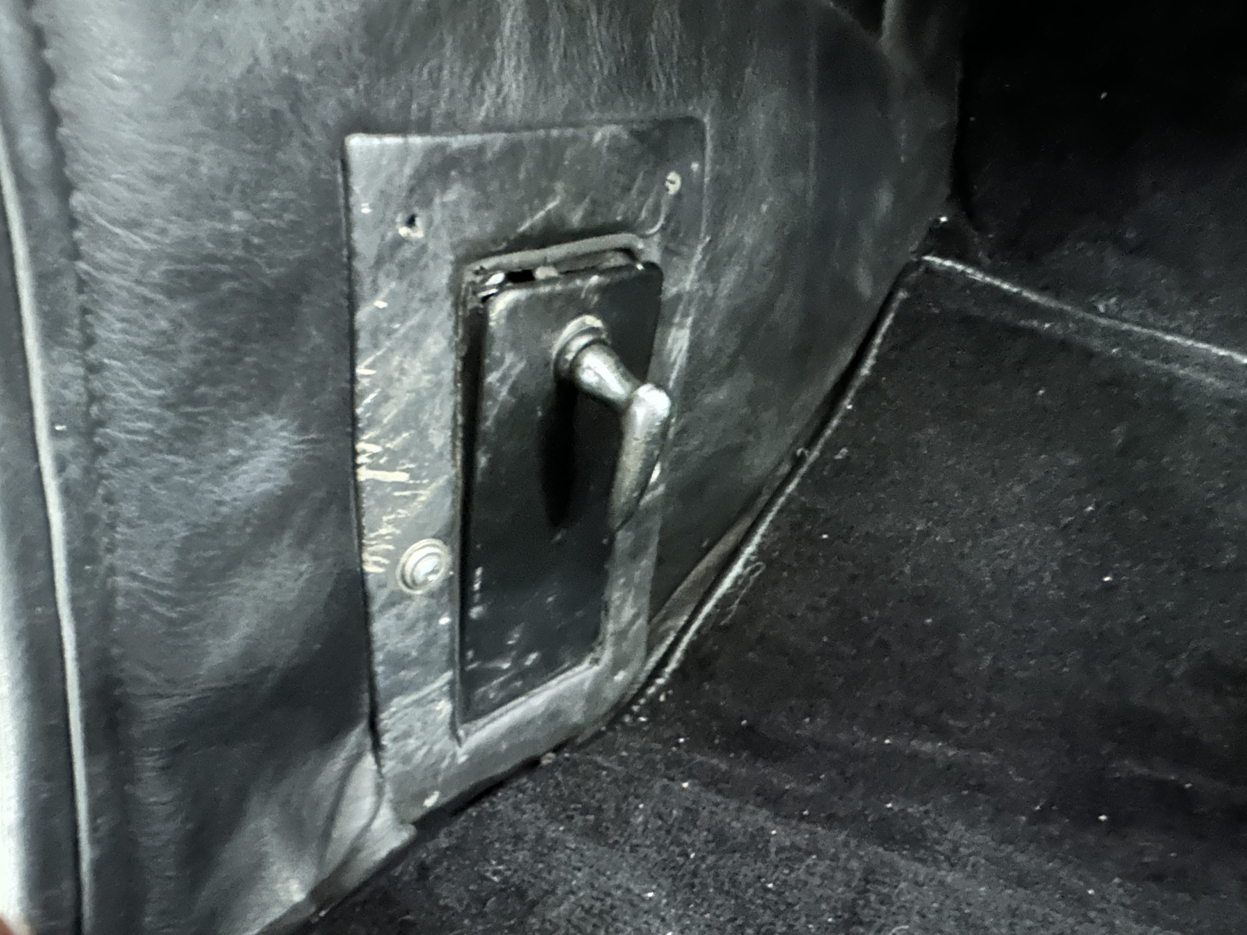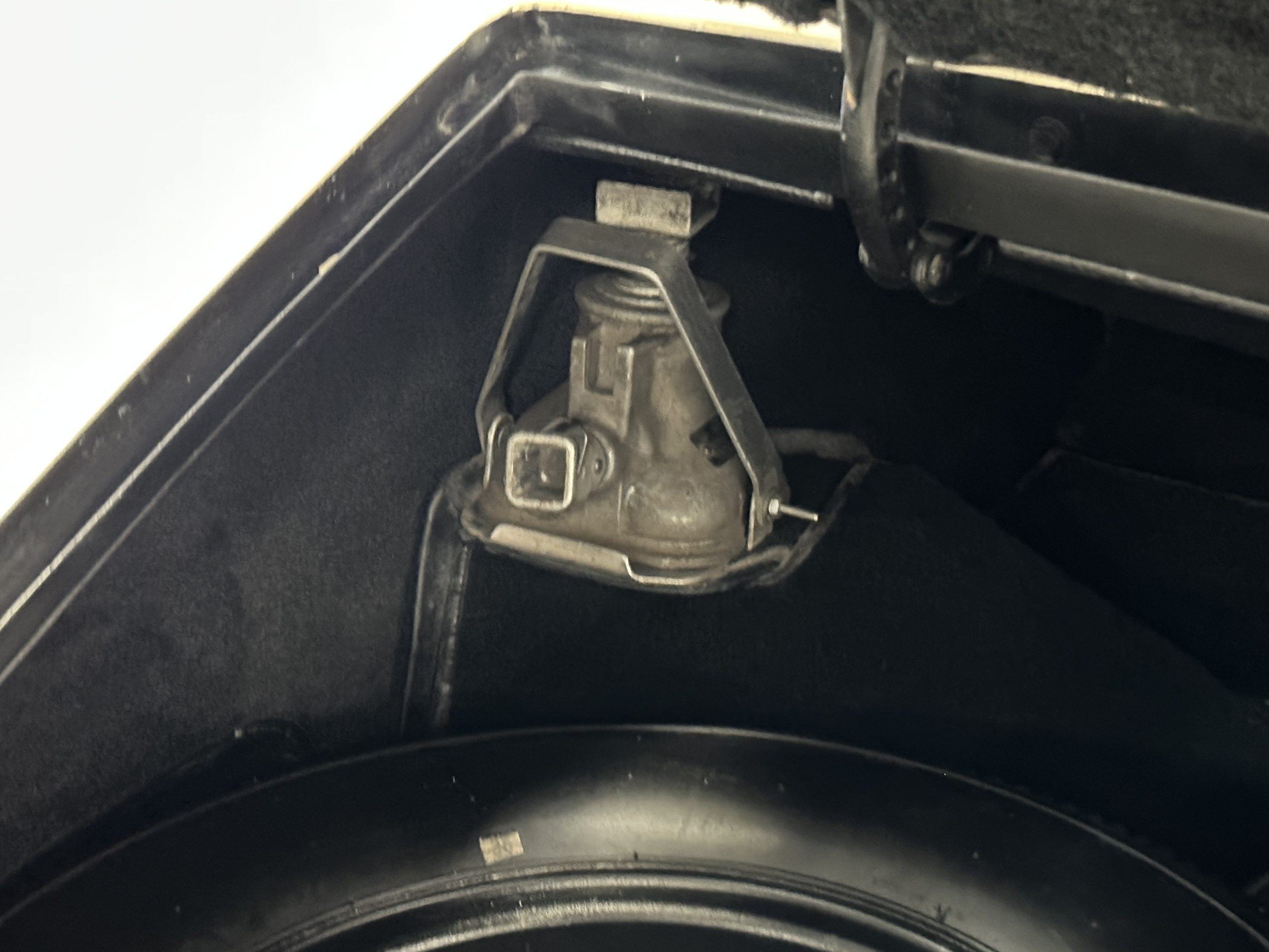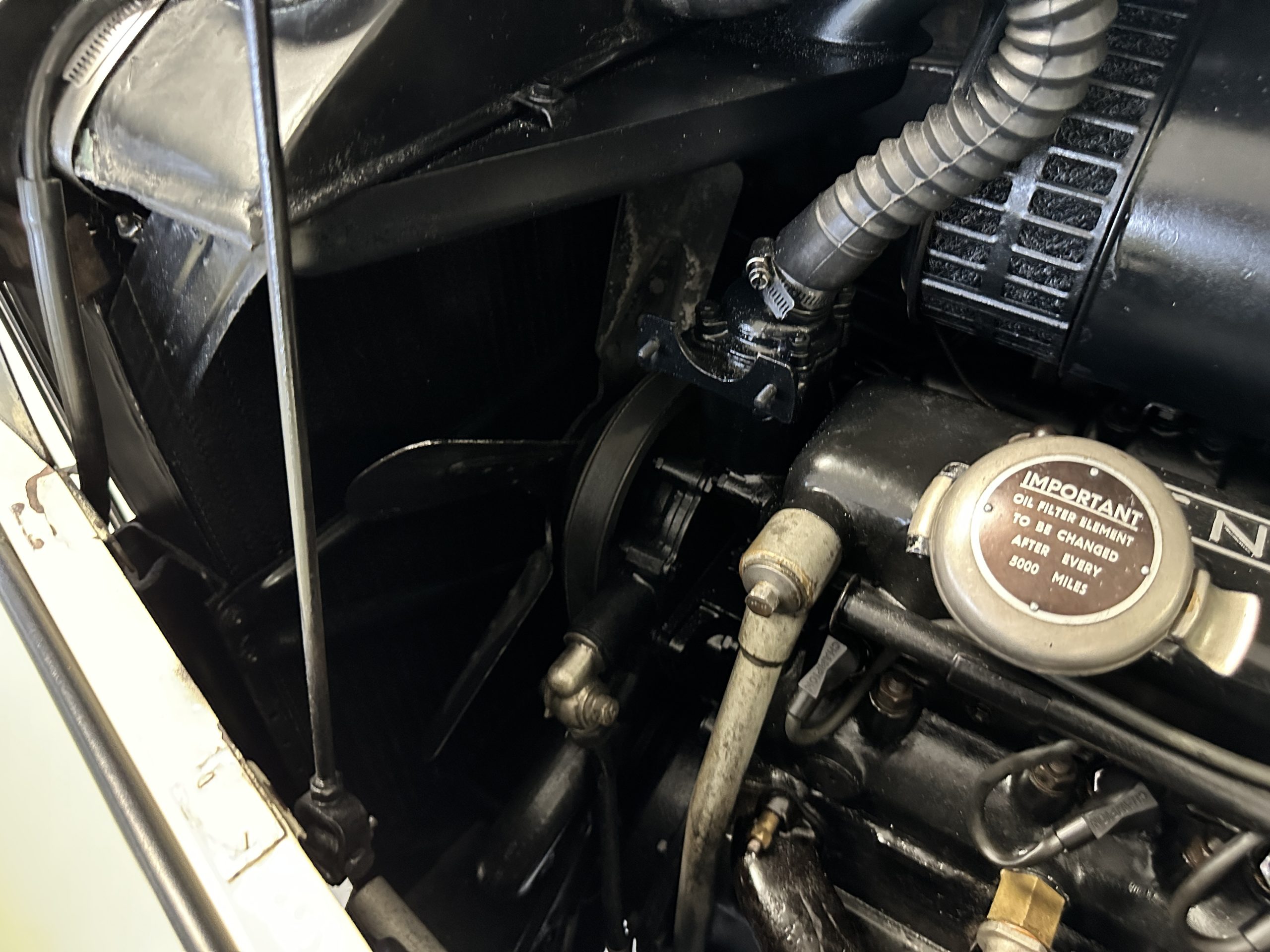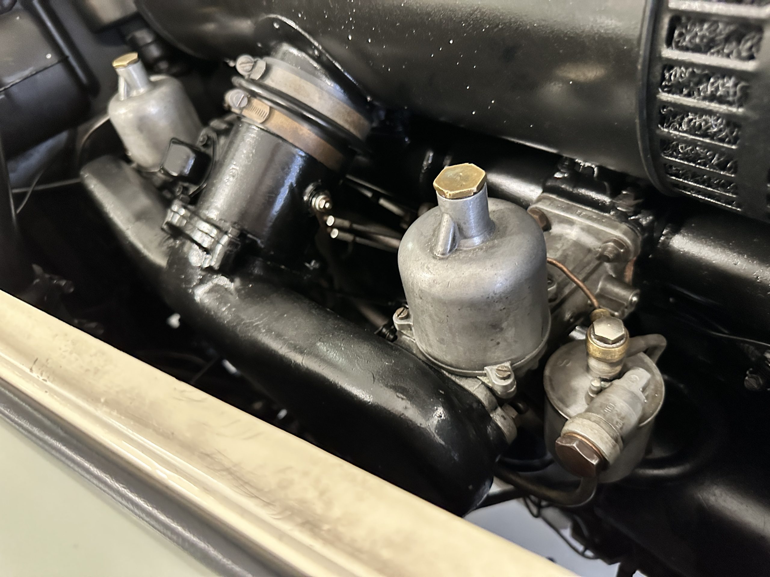 The interior is largely original in its Black Leather which is in very nice condition. The leather is without cracks and has a lovely patina. The luscious dark wood is also original and in excellent condition. The black carpet is also in very nice condition. It is difficult to discern exactly which portions of the interior are original versus an older restored example. But overall, the interior has a nice consistent patina and presents very well. The instruments work well, and its radio has been removed from the dashboard.